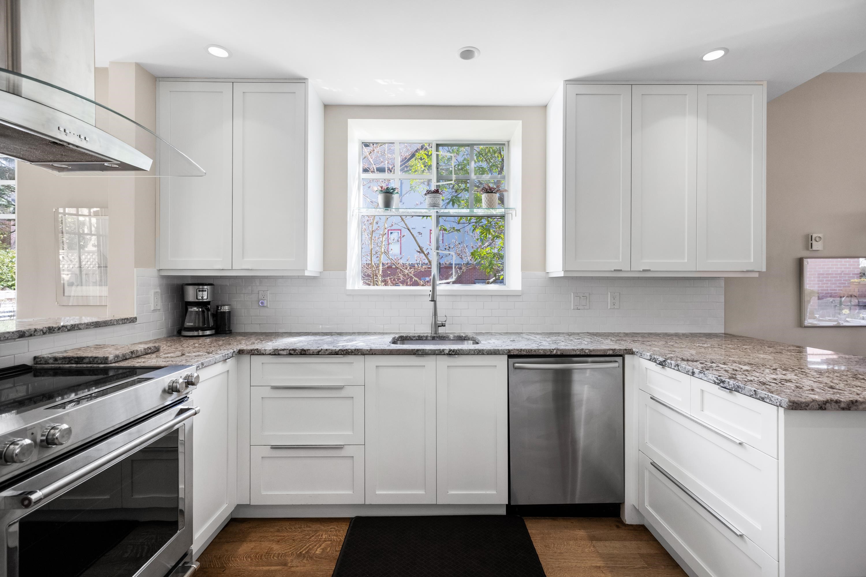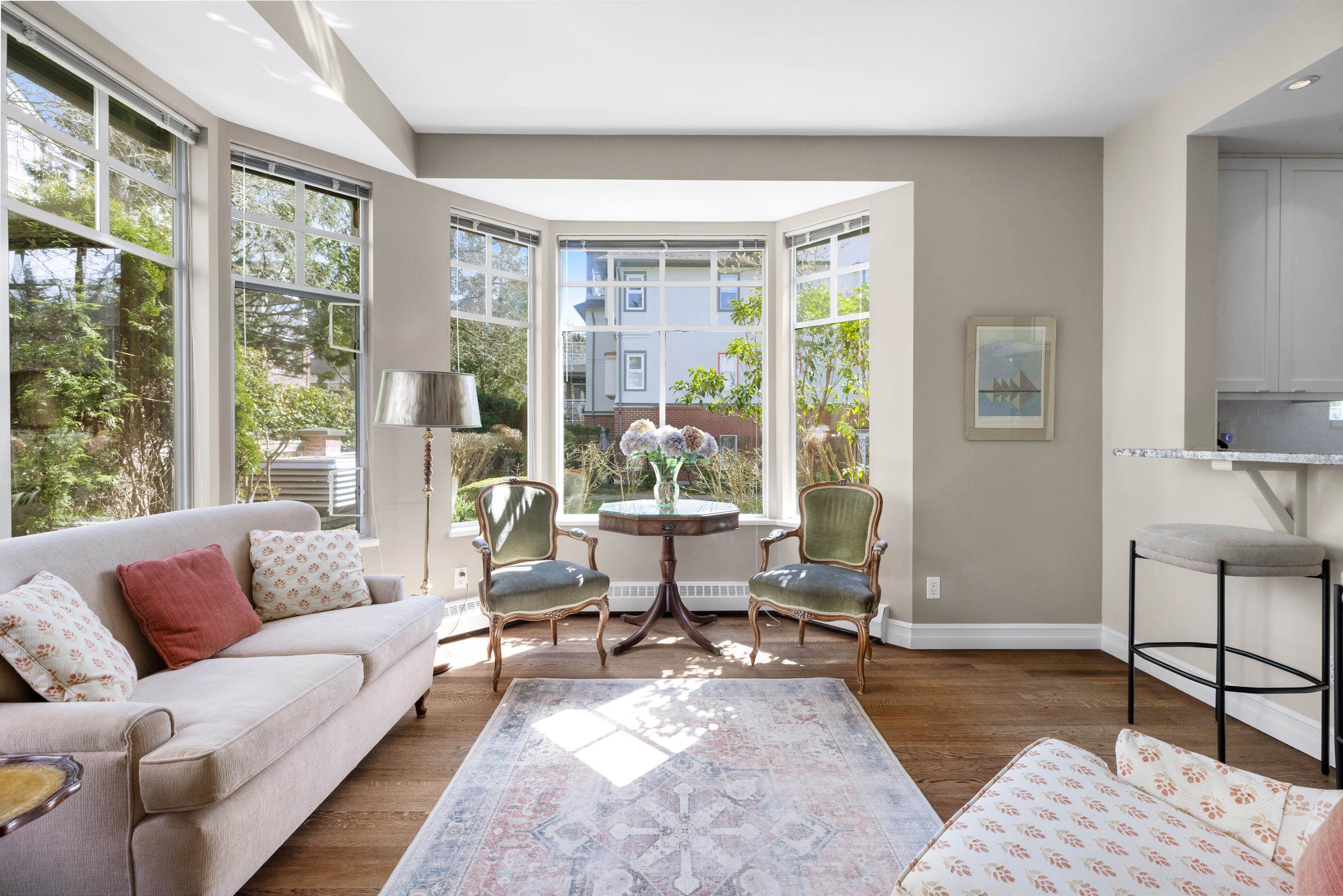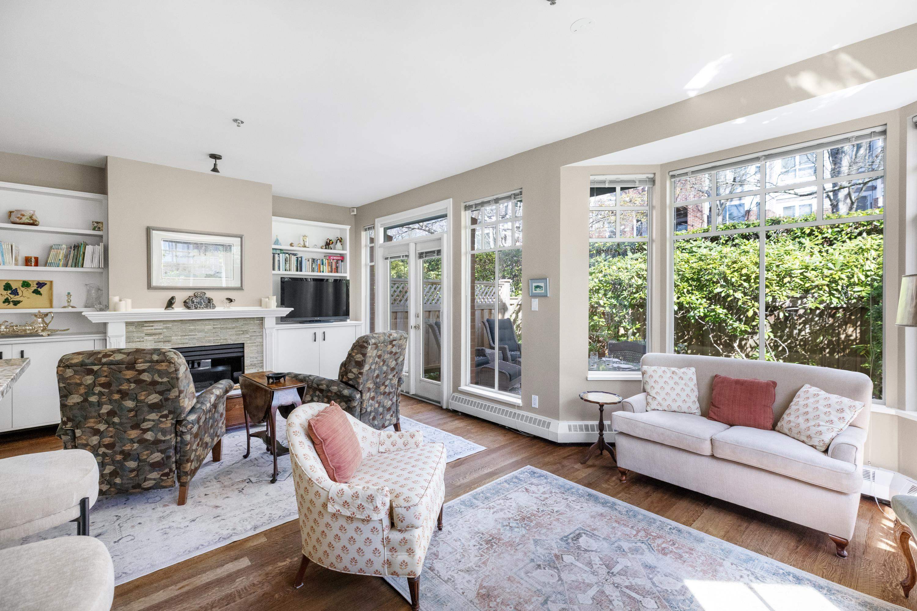 Rarely available end unit in Thames Court at Hampton Place! One of the largest units in the complex, this 3 bed, 2 bath up home is perfect for a young family or downsizers. The updated, light filled kitchen sits in the heart of the open concept living space with patios on either end, perfect for entertaining and enjoying the morning & evening sun. The primary bedroom with walk through closet and ensuite easily fits a King sized bed. The lower level features a huge rec room with 10 foot ceilings that offers ...