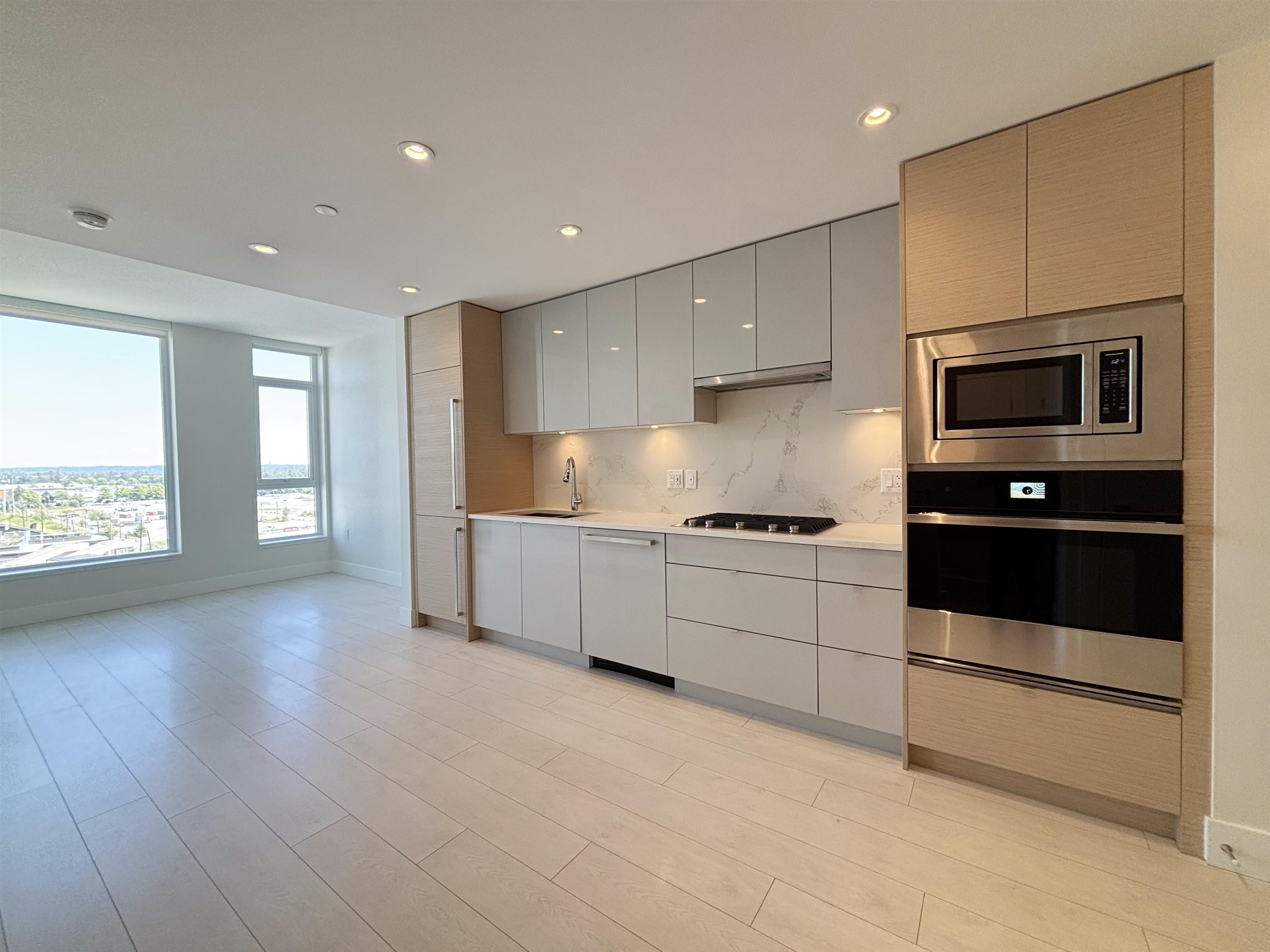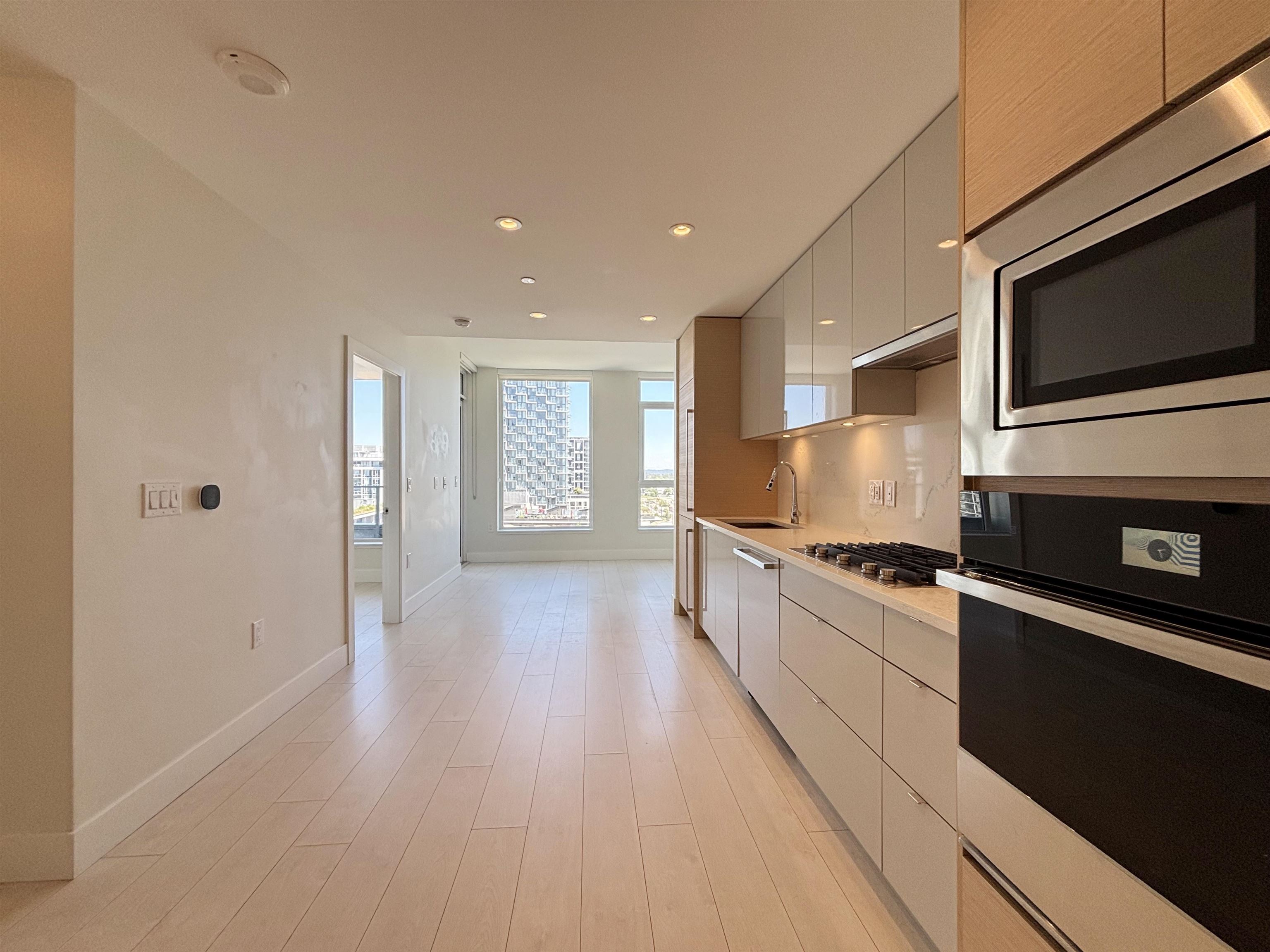 Modern 1 Bed + Flex, 1 Bath East-facing home at MODE in the River District. Enjoy river and mountain views, 9' ceilings, and a high-efficiency heating/cooling system in this thoughtfully designed condo. The gourmet kitchen features premium appliances including a gas range, wall oven, built-in microwave, integrated fridge and dishwasher, plus quartz countertops and backsplash. Highlights include a walk-in closet with built-ins, 1 EV parking stall, and 1 storage locker. Exceptional building amenities: screeni...