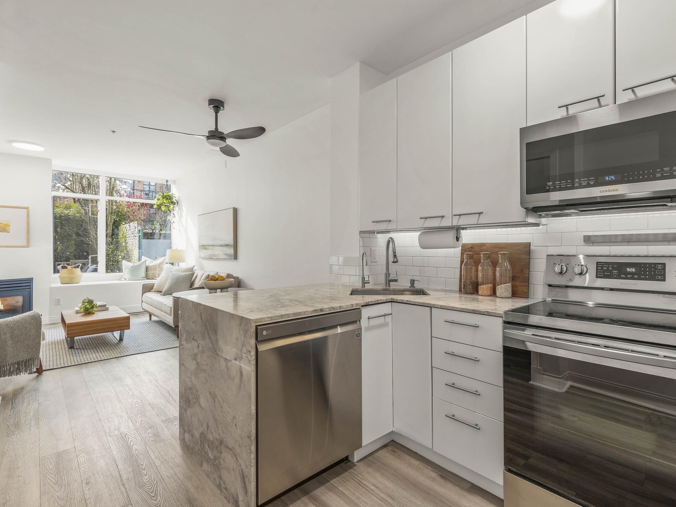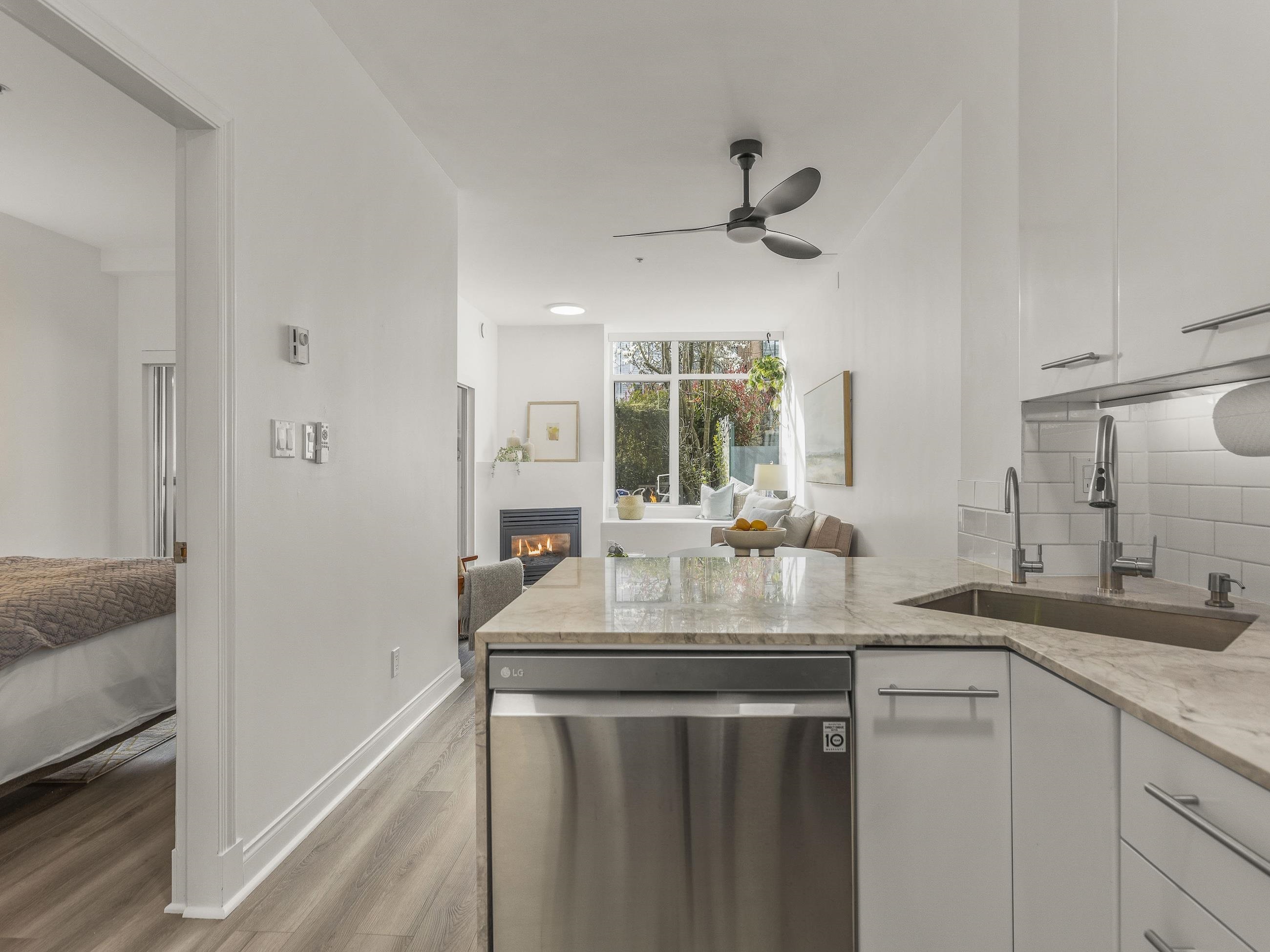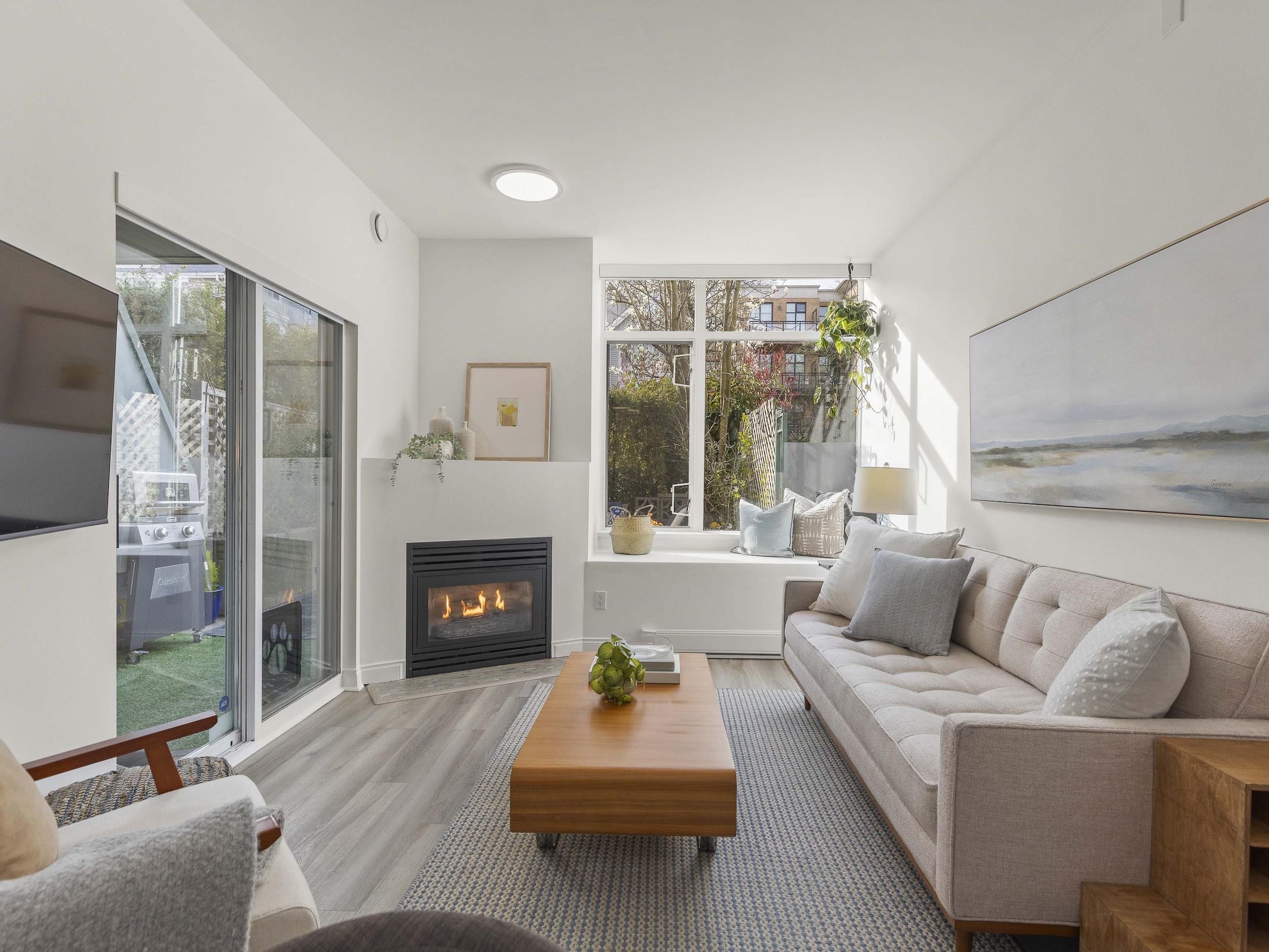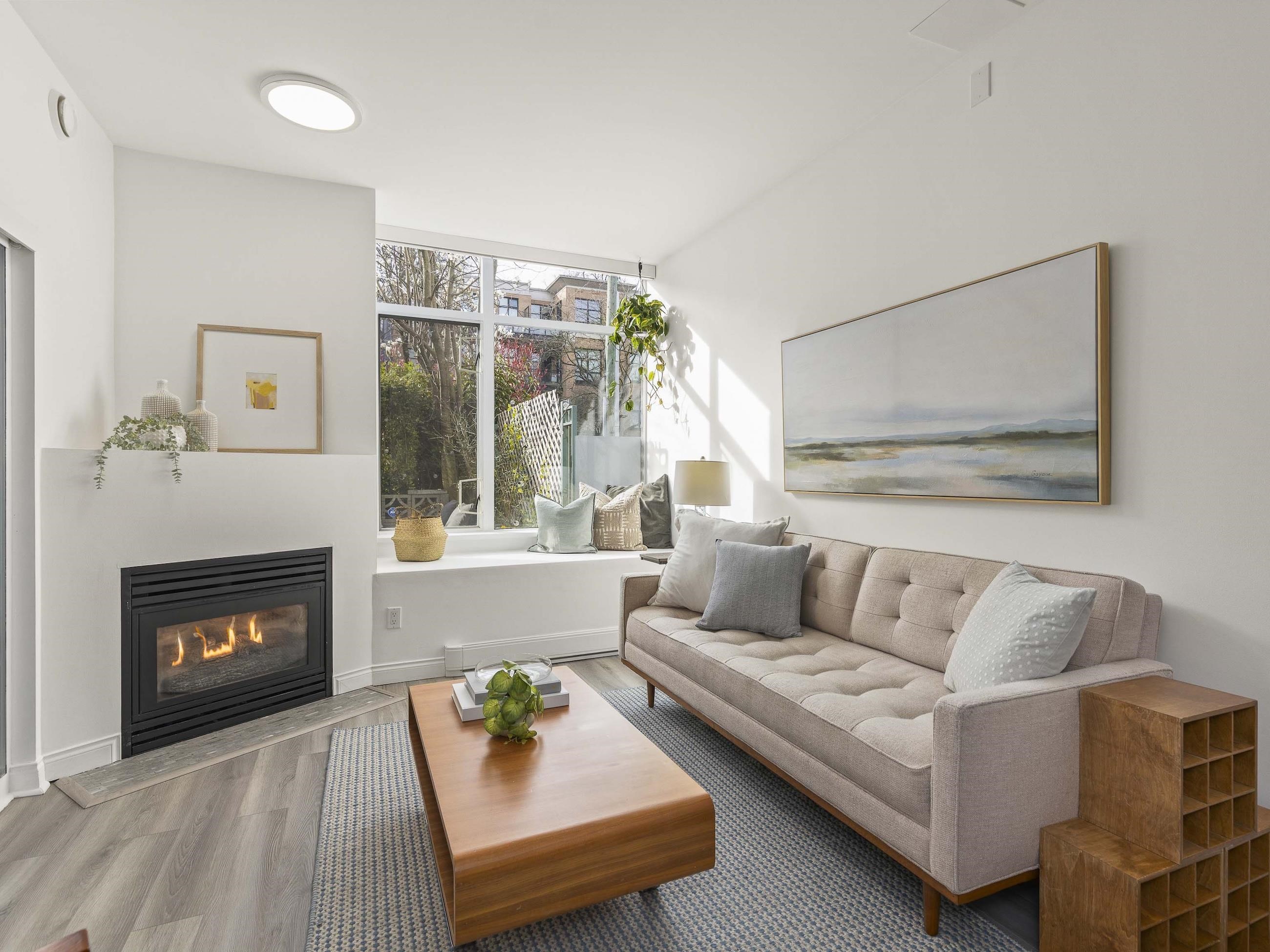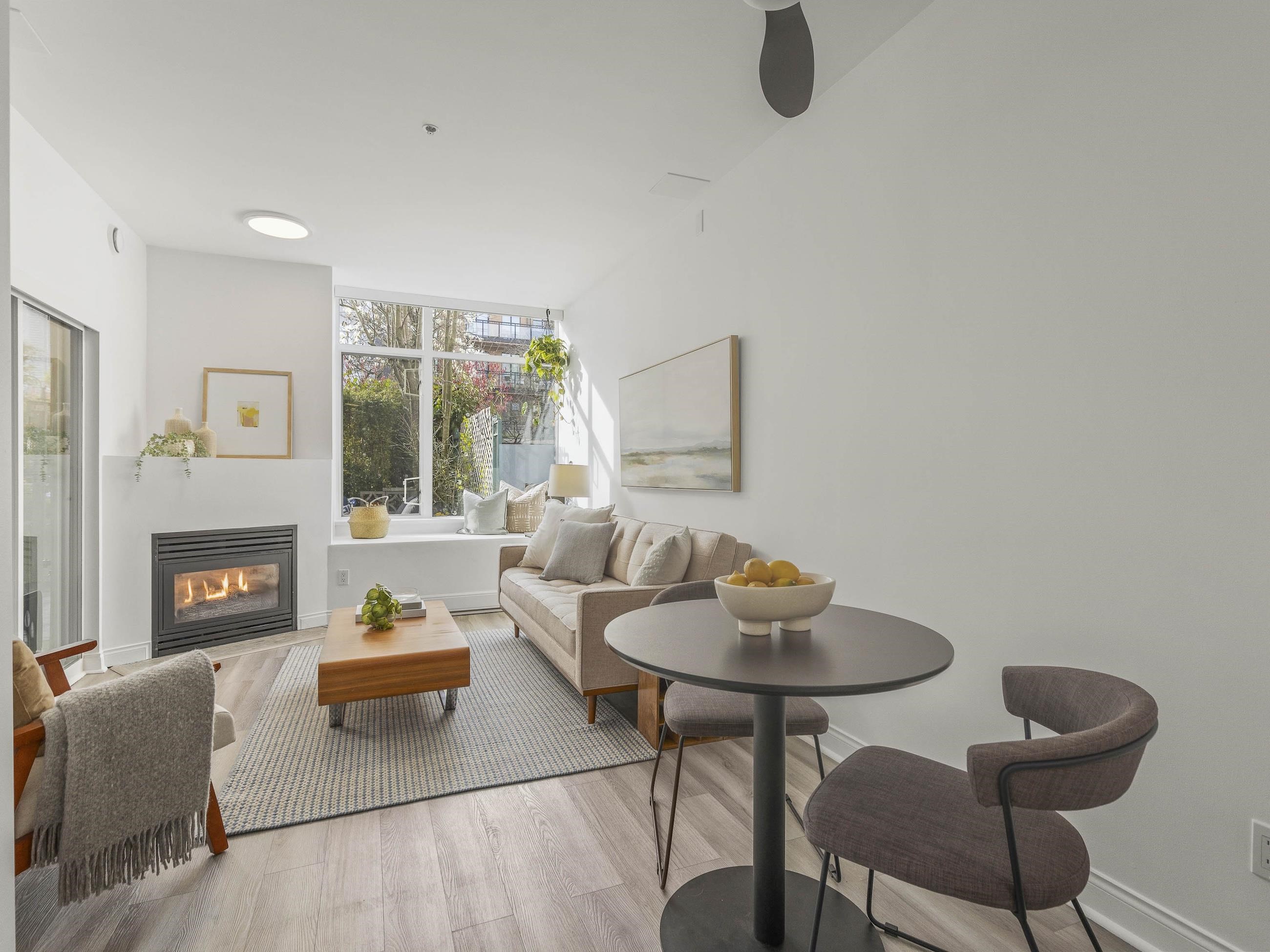 This one stands out (just like you). A rare find: a patio, south-facing and sun-soaked, but secluded - tucked behind hedges, across a green courtyard, protected by a fobbed gate - pet-perfect! Gas fireplace and soaring ceilings make for a cozy & bright 575sf home in concrete "Maples", steps to Arbutus Walk and Arbutus Skytrain (2027); Settle onto natural light on the window seat or the office nook. Marble counters and vinyl-plank flooring bring a clean, modern finish. Move-in ready, with walk-through closet...