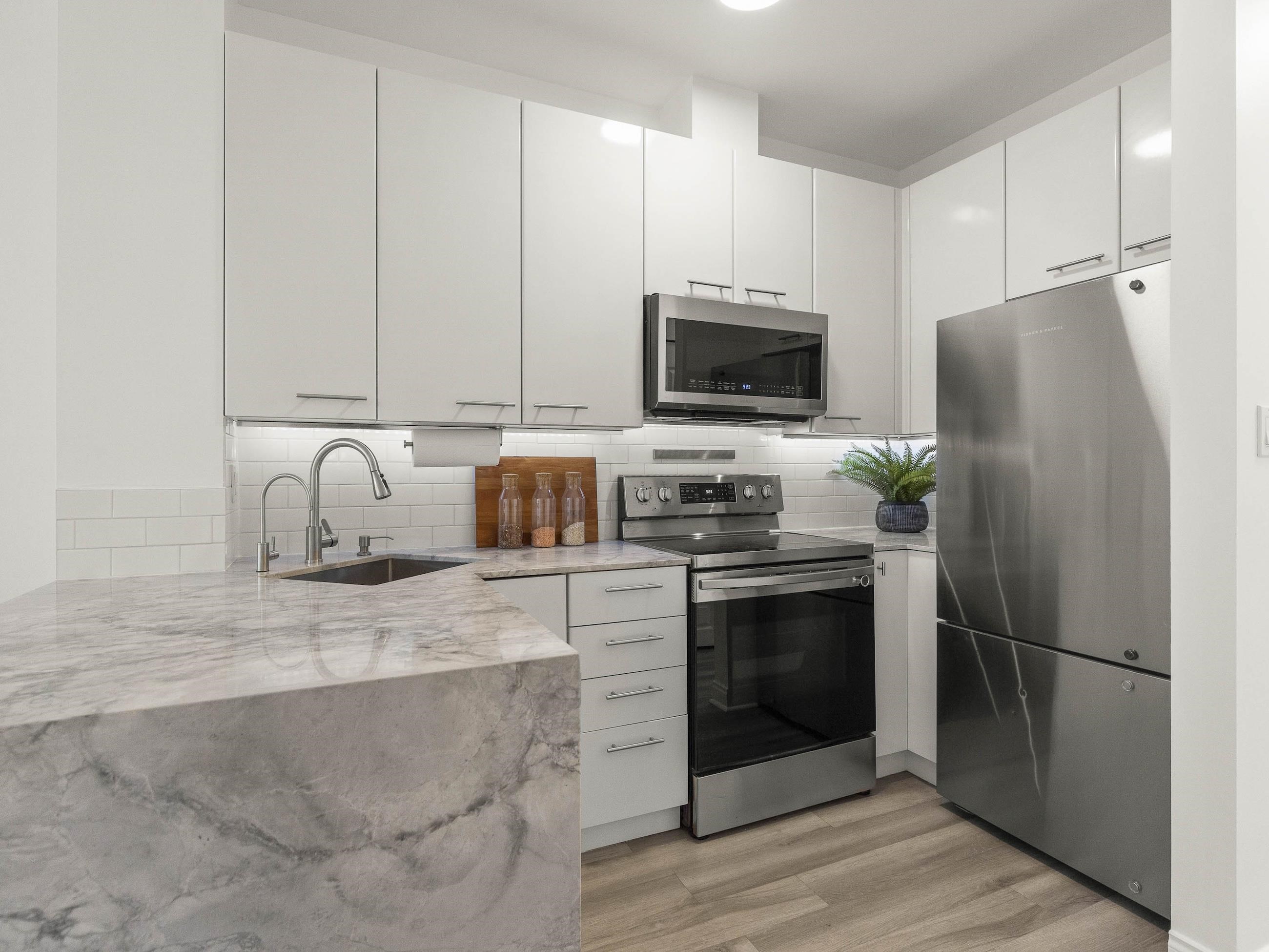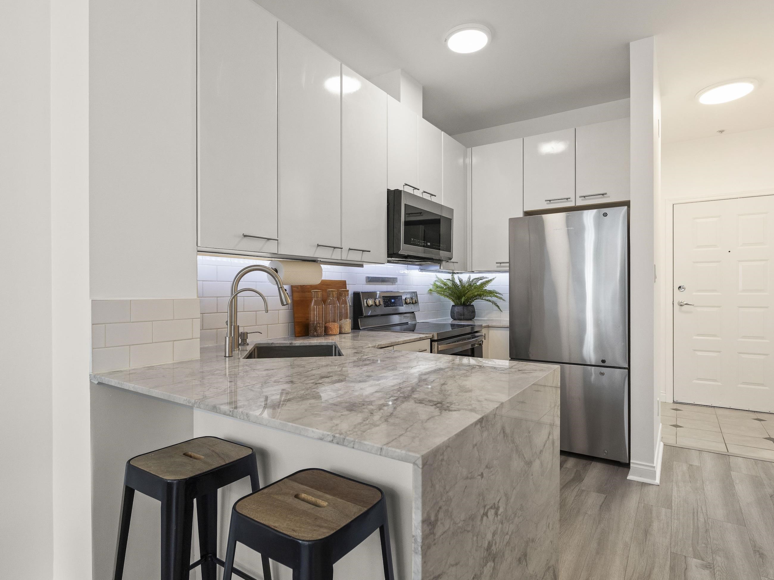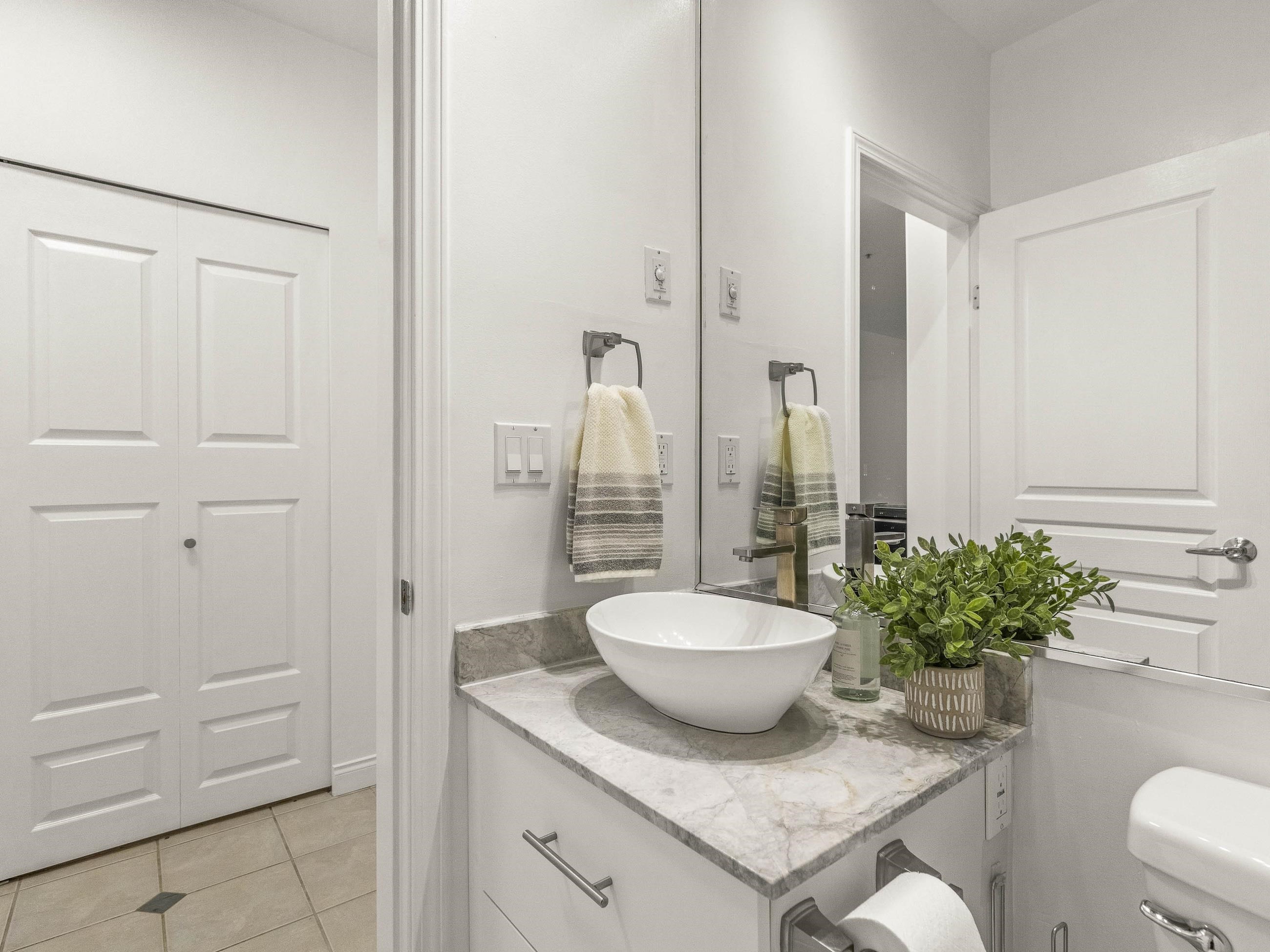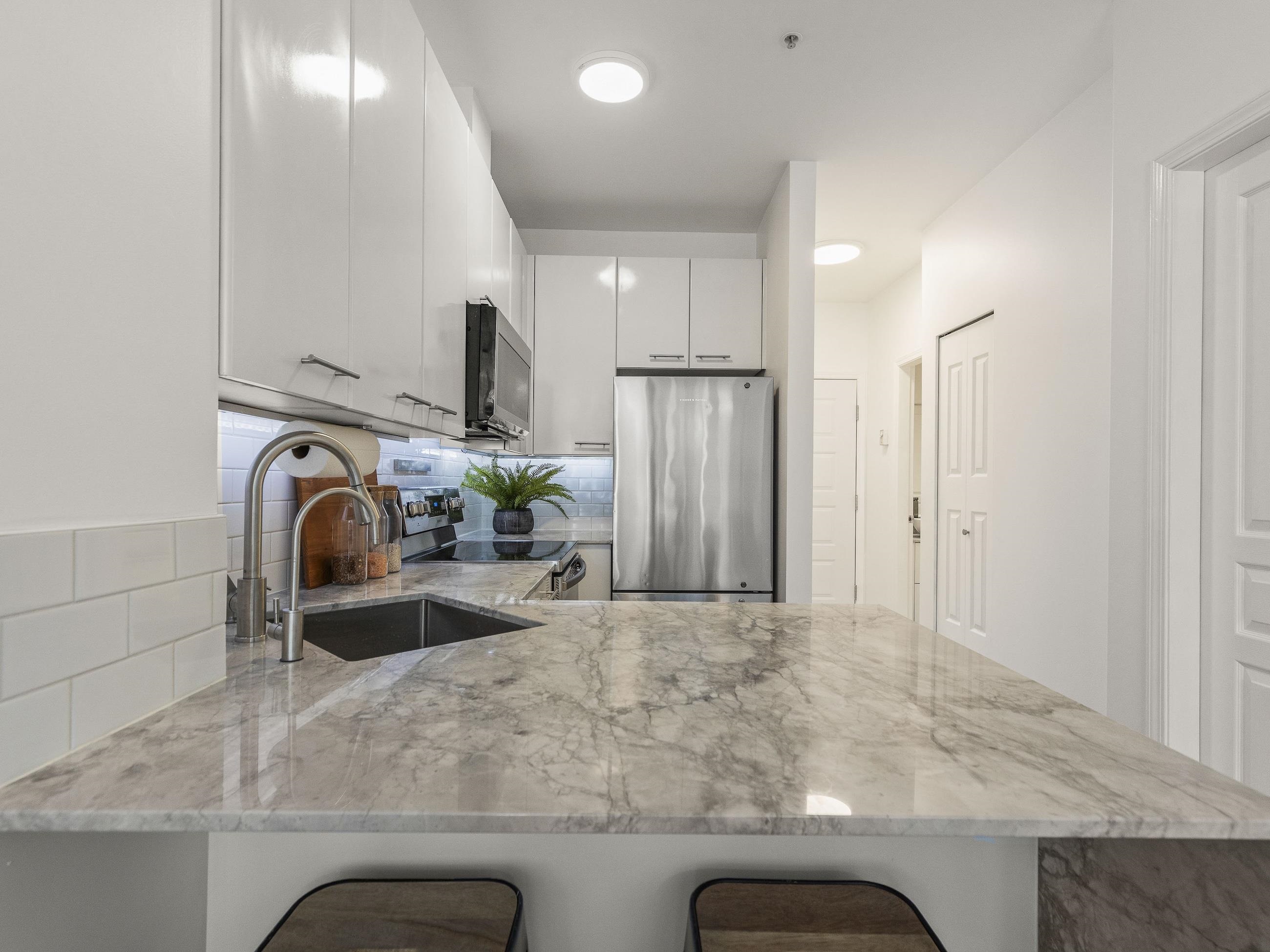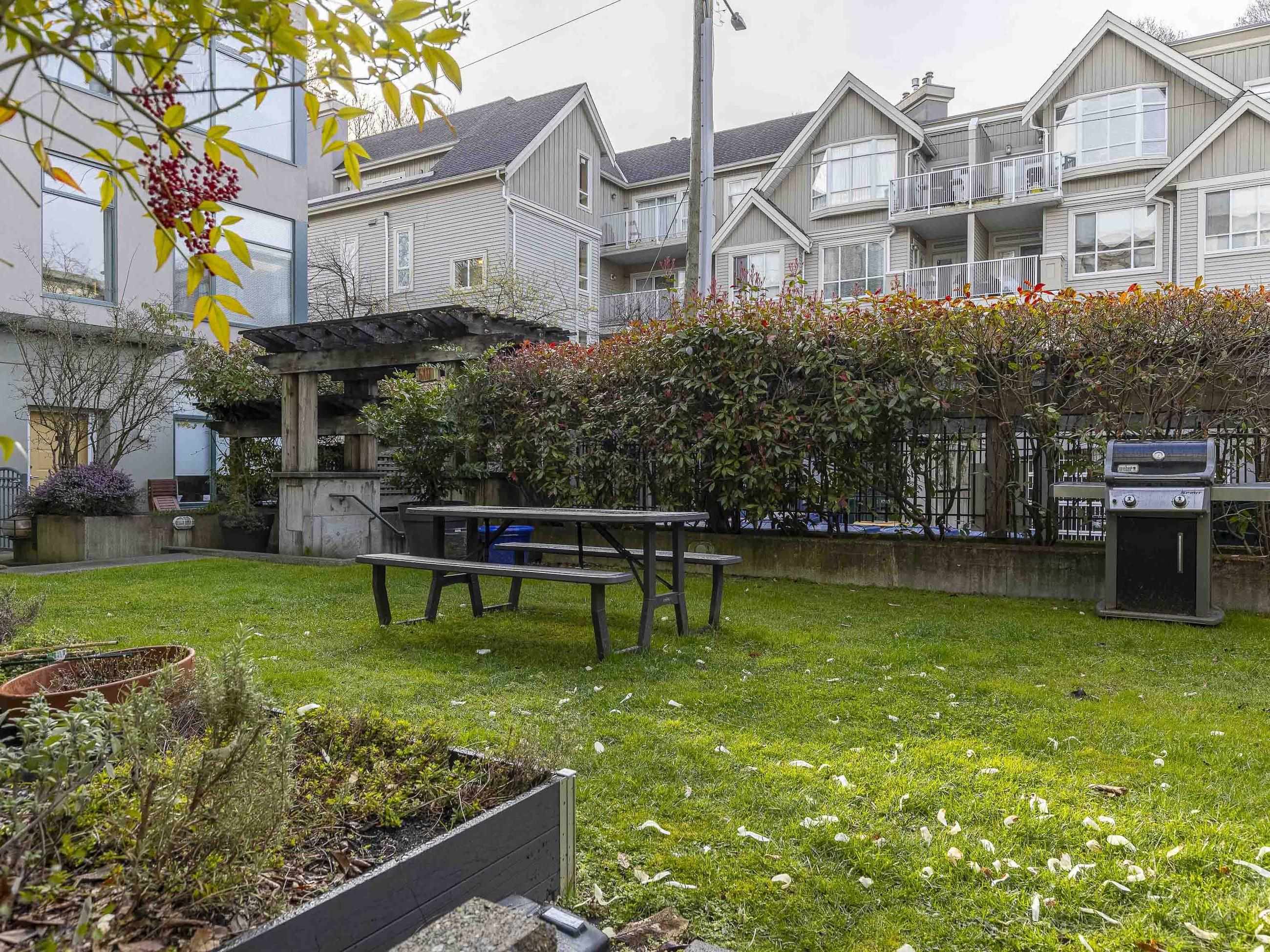 This one stands out (just like you). A rare find: a patio, south-facing and sun-soaked, but secluded - tucked behind hedges, across a green courtyard, protected by a fobbed gate - pet-perfect! Gas fireplace and soaring ceilings make for a cozy & bright 575sf home in concrete "Maples", steps to Arbutus Walk and Arbutus Skytrain (2027); Settle onto natural light on the window seat or the office nook. Marble counters and vinyl-plank flooring bring a clean, modern finish. Move-in ready, with walk-through closet...