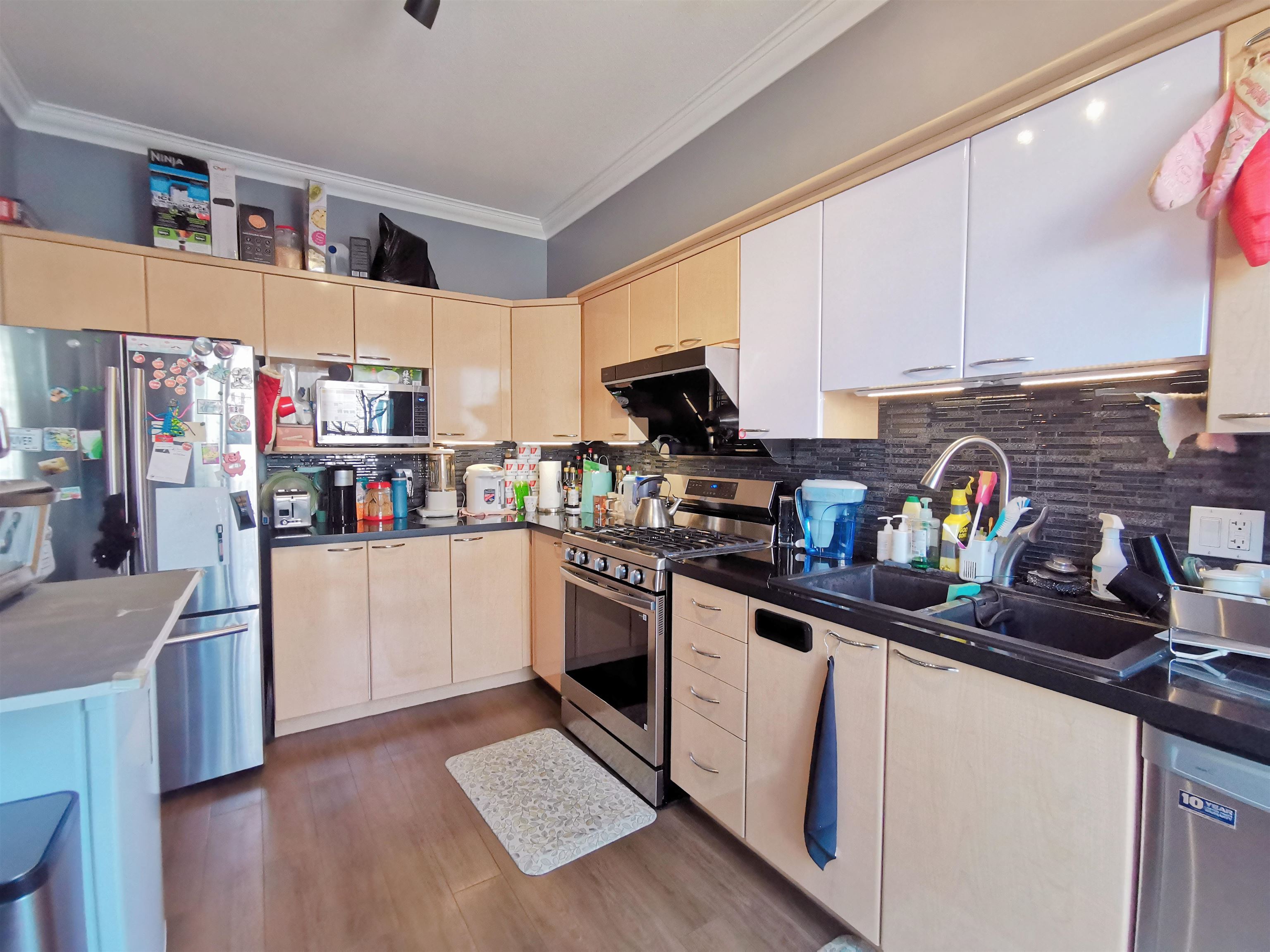 Welcome to Mayflower in Terra Nova by Polygon Homes. This quiet, well-maintained inside-unit townhome offers a rare layout with 4 spacious bedrooms (all with ensuites) plus a powder room on the main level. Beautifully updated with hardwood flooring, crown mouldings, designer paint, and an enclosed wok kitchen. Enjoy two balconies on the main floor - perfect for BBQs and entertaining. The lower level features a large rec room that can function as a 4th bedroom. Double garage plus driveway parking. Walk to sh...