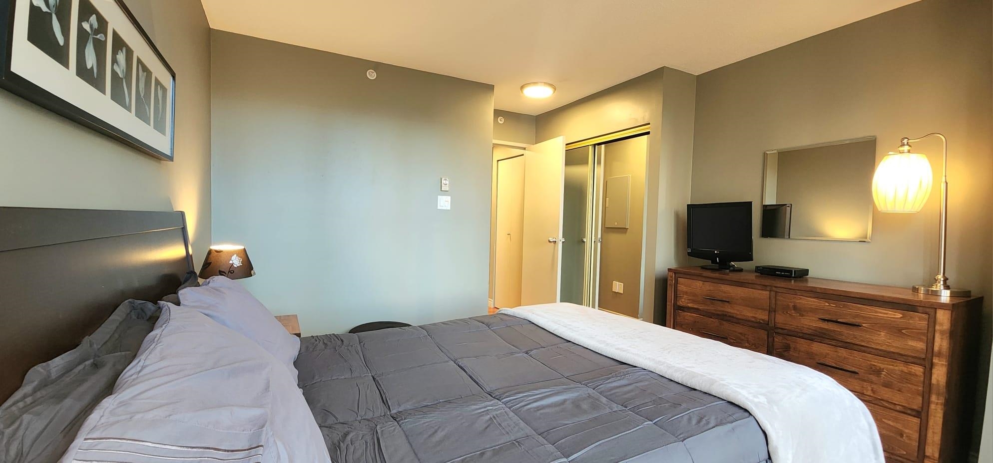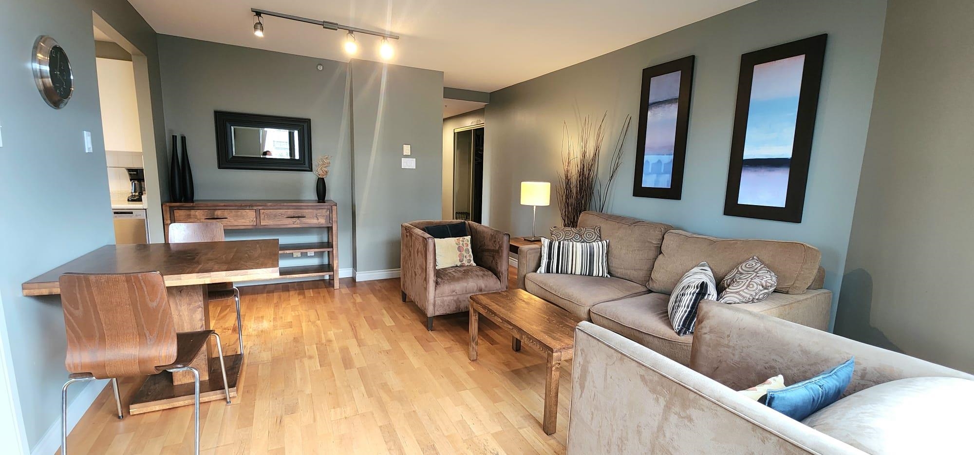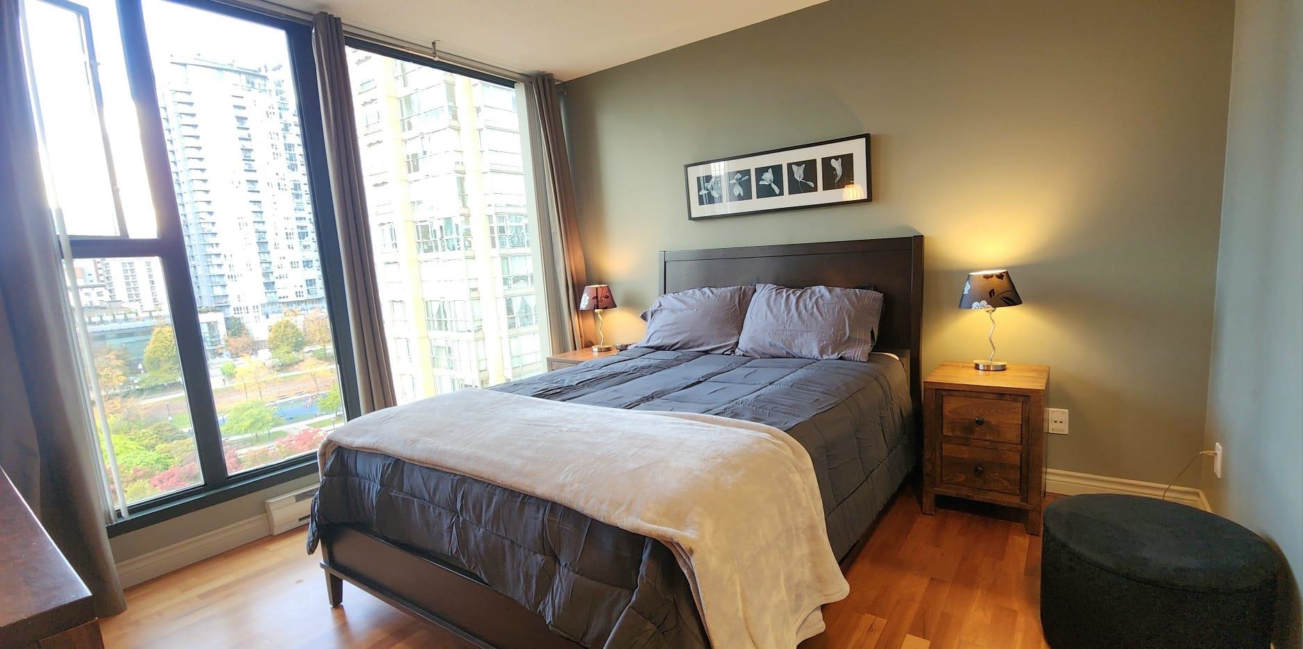 Located at Citycrest in the heart of Yaletown at 1155 Homer and Davie St, just 1 block to the Skytrain station and all the great restaurants and shops in the area. Beautiful 1 bdrm and den(Office) 670 sqft unit, with hardwood floors throughout and floor to ceiling windows for lots of natural light. A quality sofabed as well for guests, in the livingroom and a queen size bed in the bedroom, and quality wood furnishings in all rooms. The Citycrest bldg at the corner of Homer and Davie, that has an excellen...