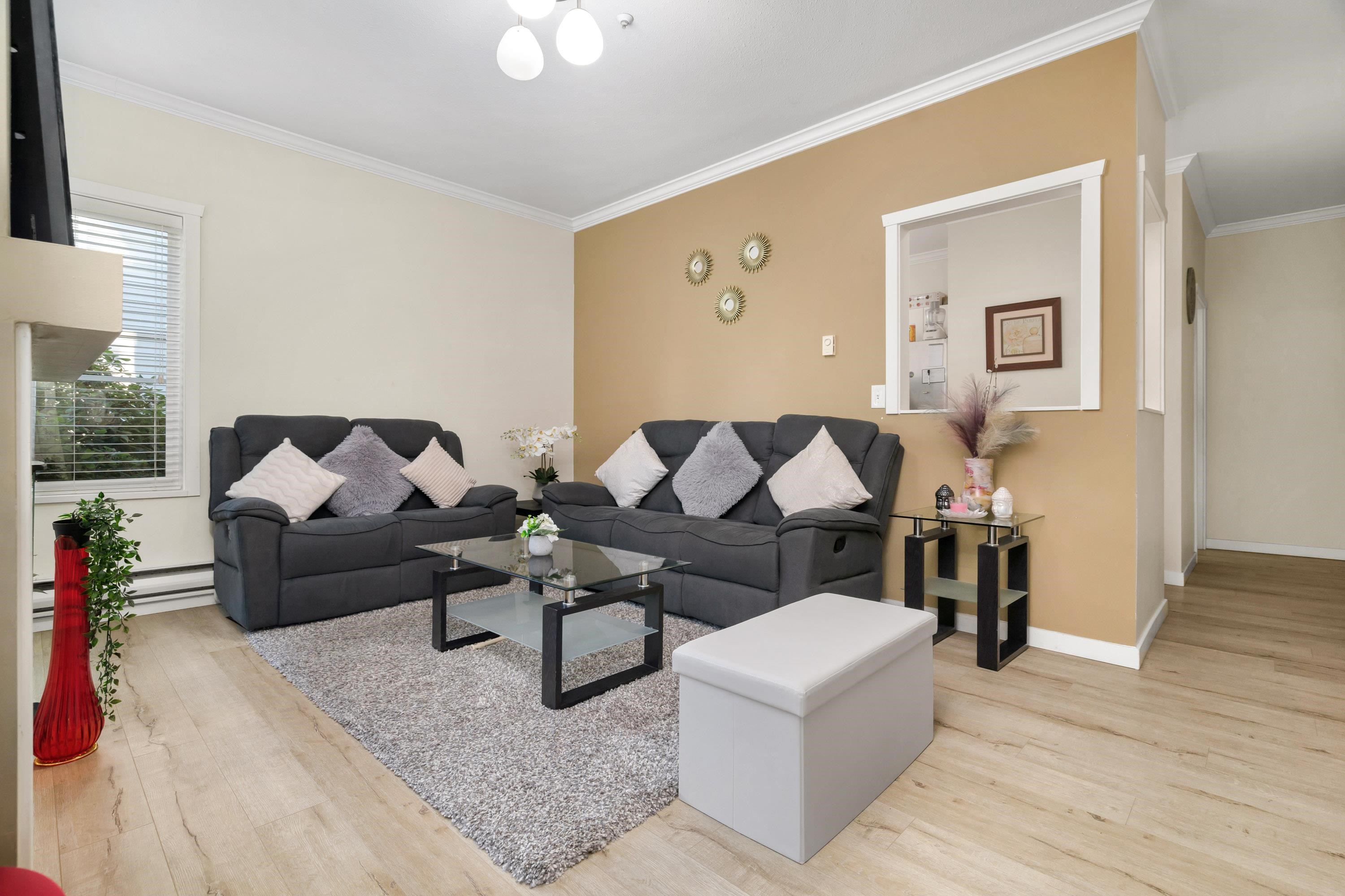 Welcome to Crestview Gardens. This freshly painted, move-in ready 2 bed, 2 full bath corner ground-level home offers nearly 1100 sq ft of bright open living space. Features include laminate flooring, quartz counters, updated cabinetry, and newer stainless steel appliances. The main bath boasts a spa-inspired walk-in shower. Enjoy excellent natural light, added privacy, and a spacious patio ideal for relaxing or entertaining. Storage is conveniently located just steps from the unit. Includes 2 parking stalls...