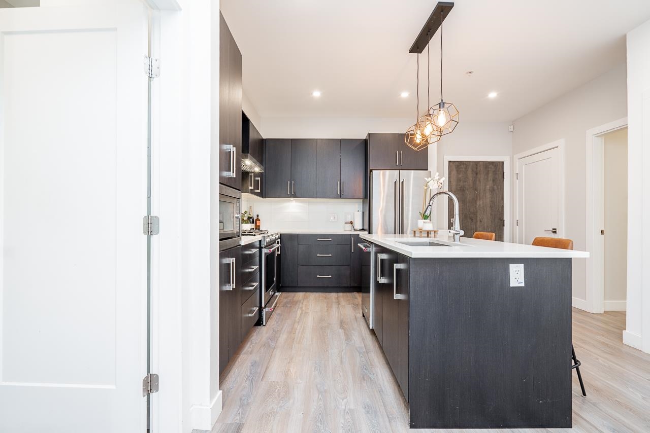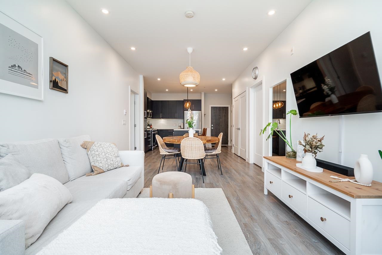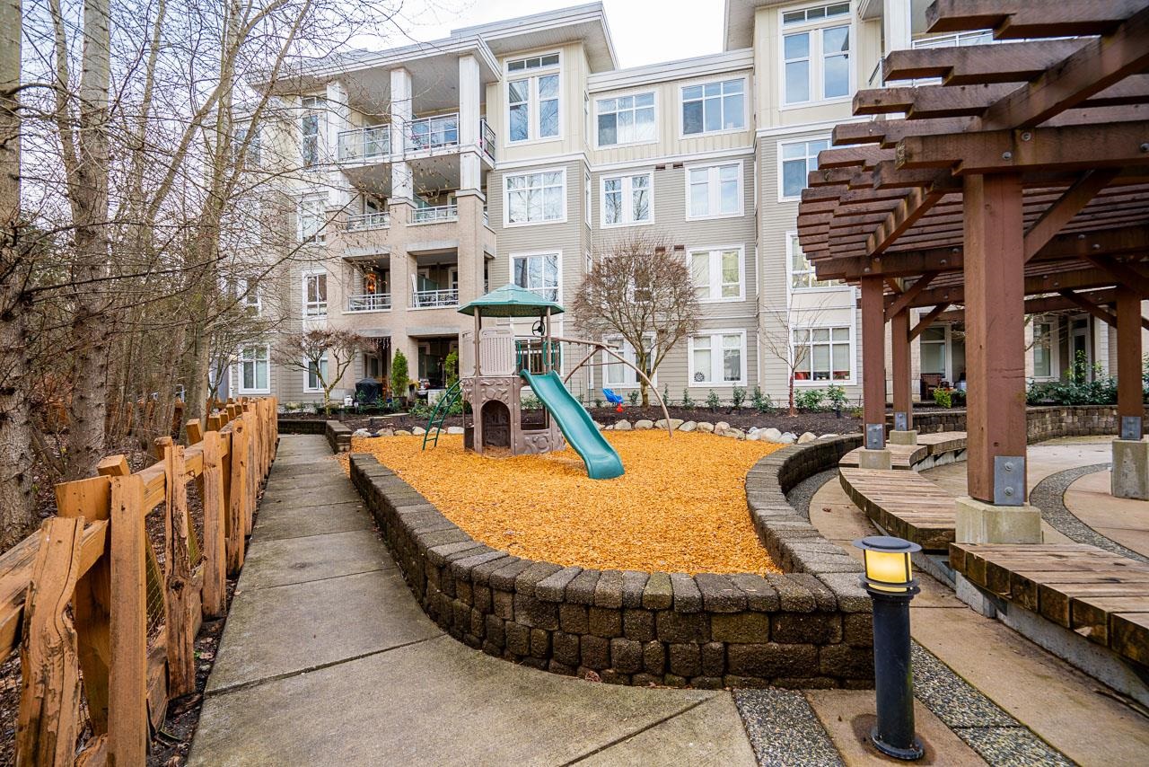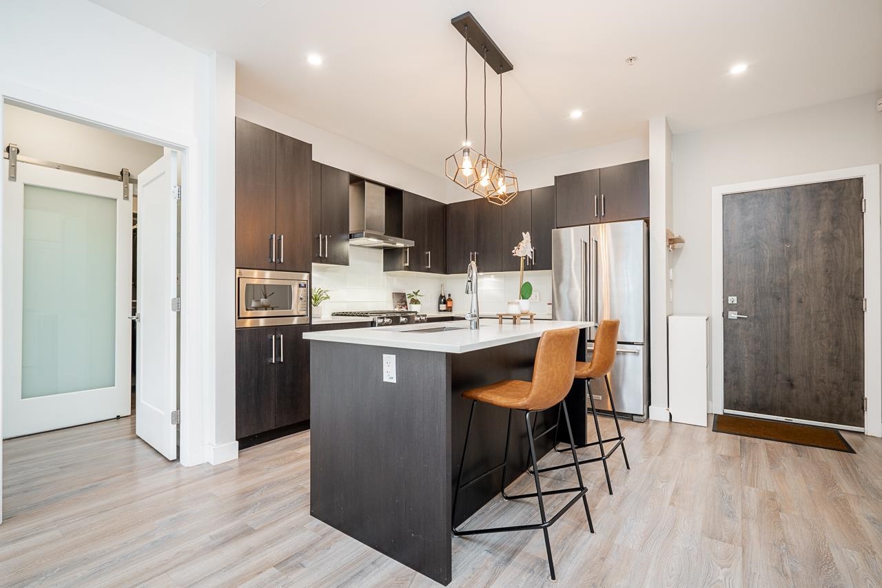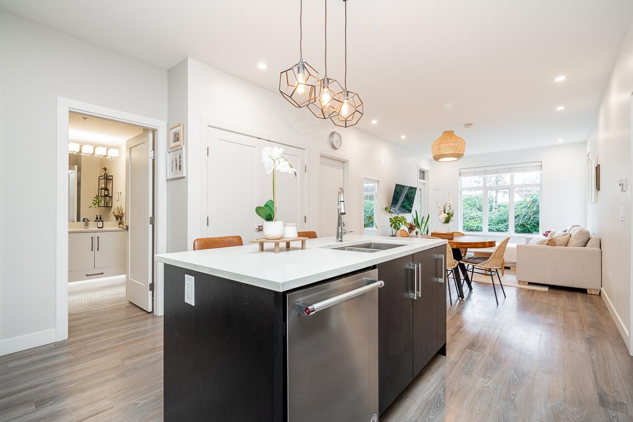 Ground-level 2-bedroom home at the sought-after Head Waters Club, offering a functional, well-designed layout and two private patios overlooking serene gardens. The modern kitchen features a spacious island and additional eating area—perfect for everyday living and entertaining. The primary bedroom boasts direct access to the second patio, a walk-in closet, and an ensuite with NuFloor heating and double sinks. Nestled in a tranquil setting with a peaceful trail to Morgan Creek. Includes 1 parking stall and ...
