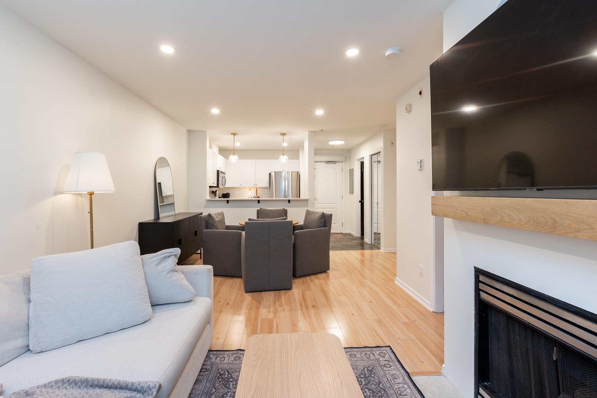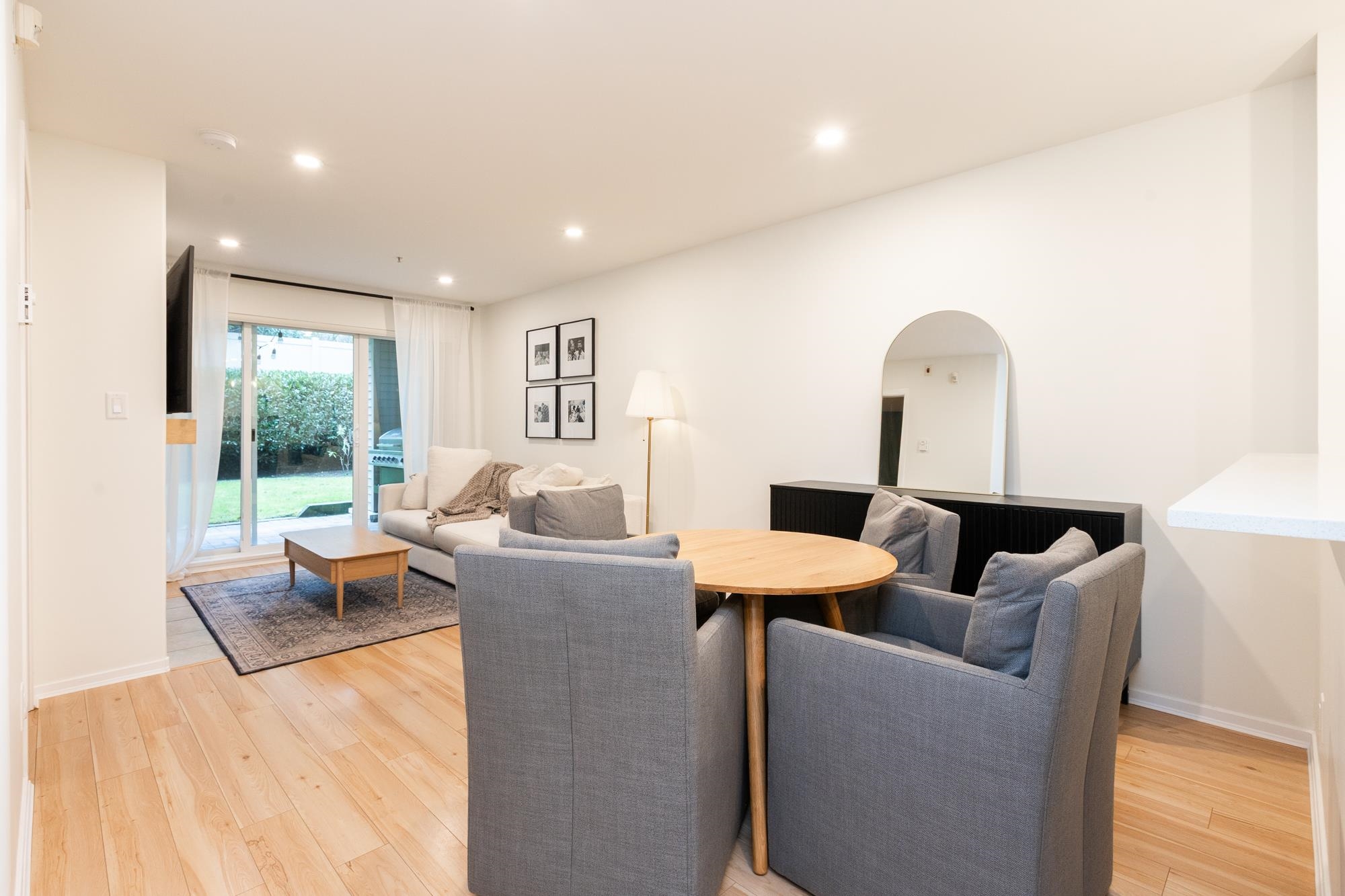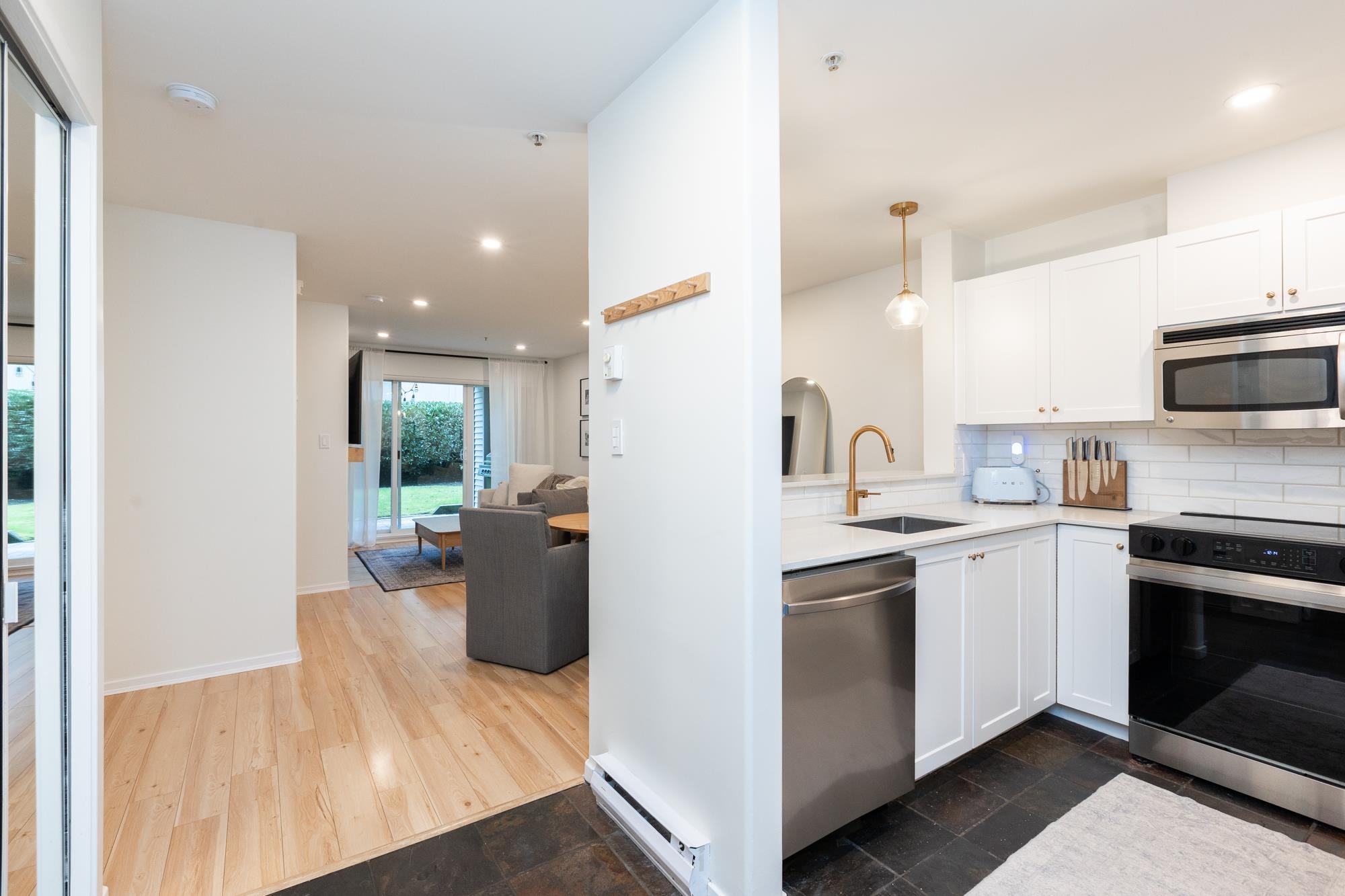 Huge private backyard with covered brick patio at this beautifully updated, wheelchair-friendly, 2-bed, 1-bath condo at Murray Green! New paint, laminate flooring, baseboards, trim, and hardware throughout! Updated open kitchen enjoys shaker-style cabinetry, quartz counters, an under-mount sink, and brand new SS appliances. Cozy family room with a large sliding glass door leading out to the back patio. Jack and Jill-style en-suite off the primary bedroom with a new sink, countertops, and cabinet refresh. Re...