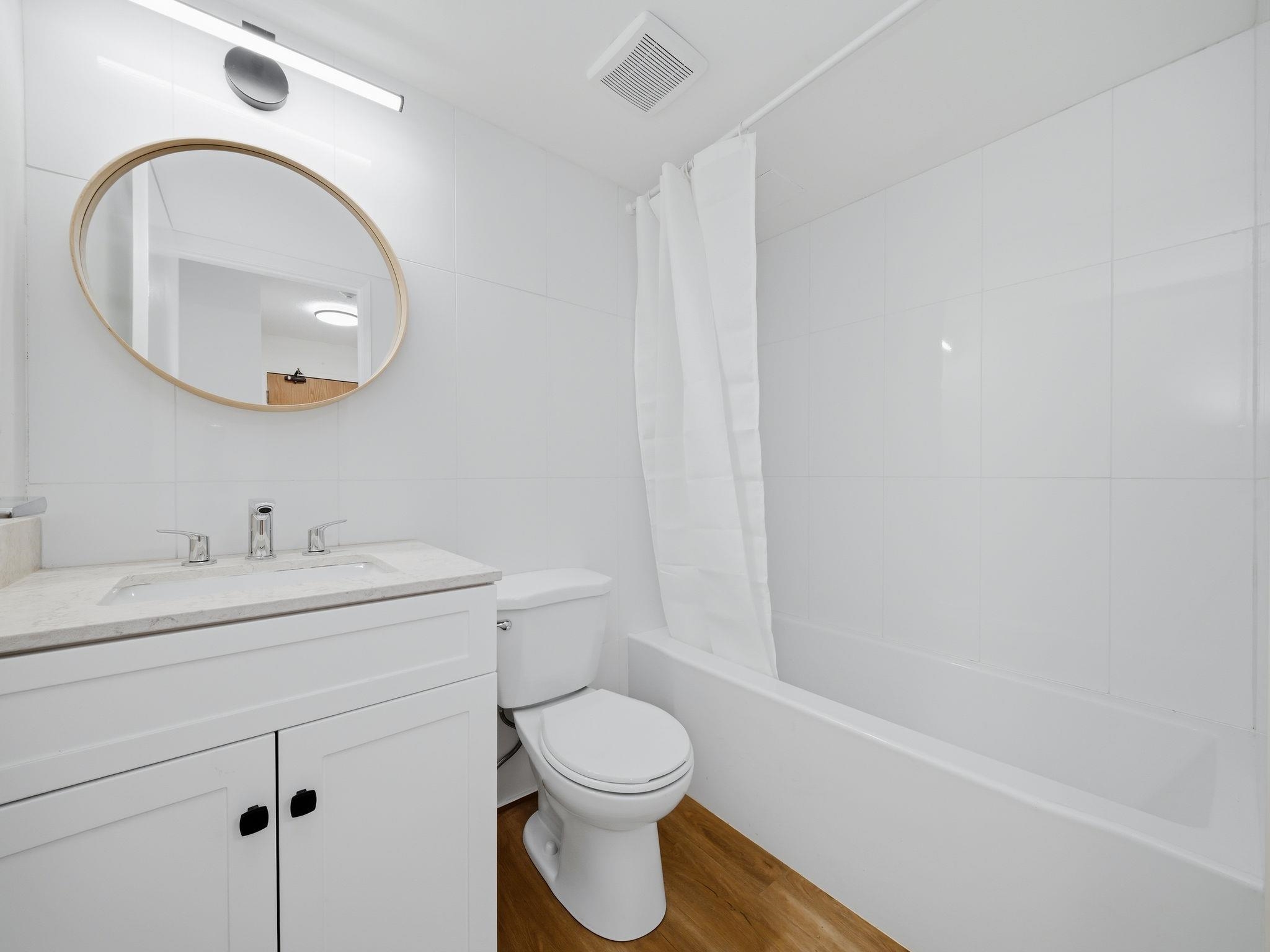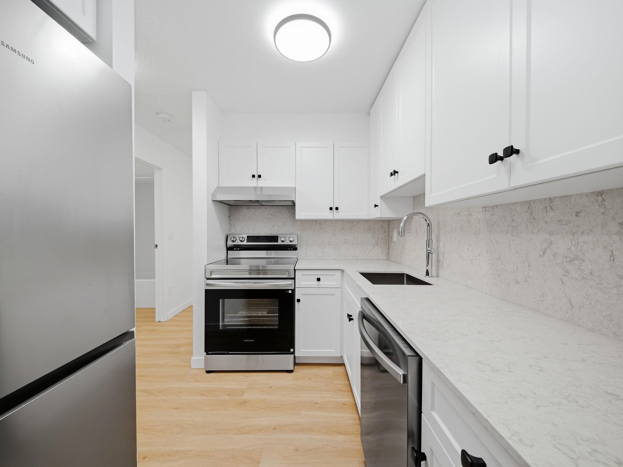 Completely renovated garden unit w/patio that looks out to huge green area on the private & quiet backside of the building! $40K of renovations! Custom kitchen cabinets, quartz counters w/full matching backsplash, new S/S appliances, deep sink & chrome faucet w/wand. New tile fireplace surround & linen drapes in living room. Bedroom features new blinds & closet doors on high end rollers. All new vanity, sink, faucets, mirror, towel rack, toilet, bathtub & bathroom tiles on vanity wall & tub surround. Luxury...