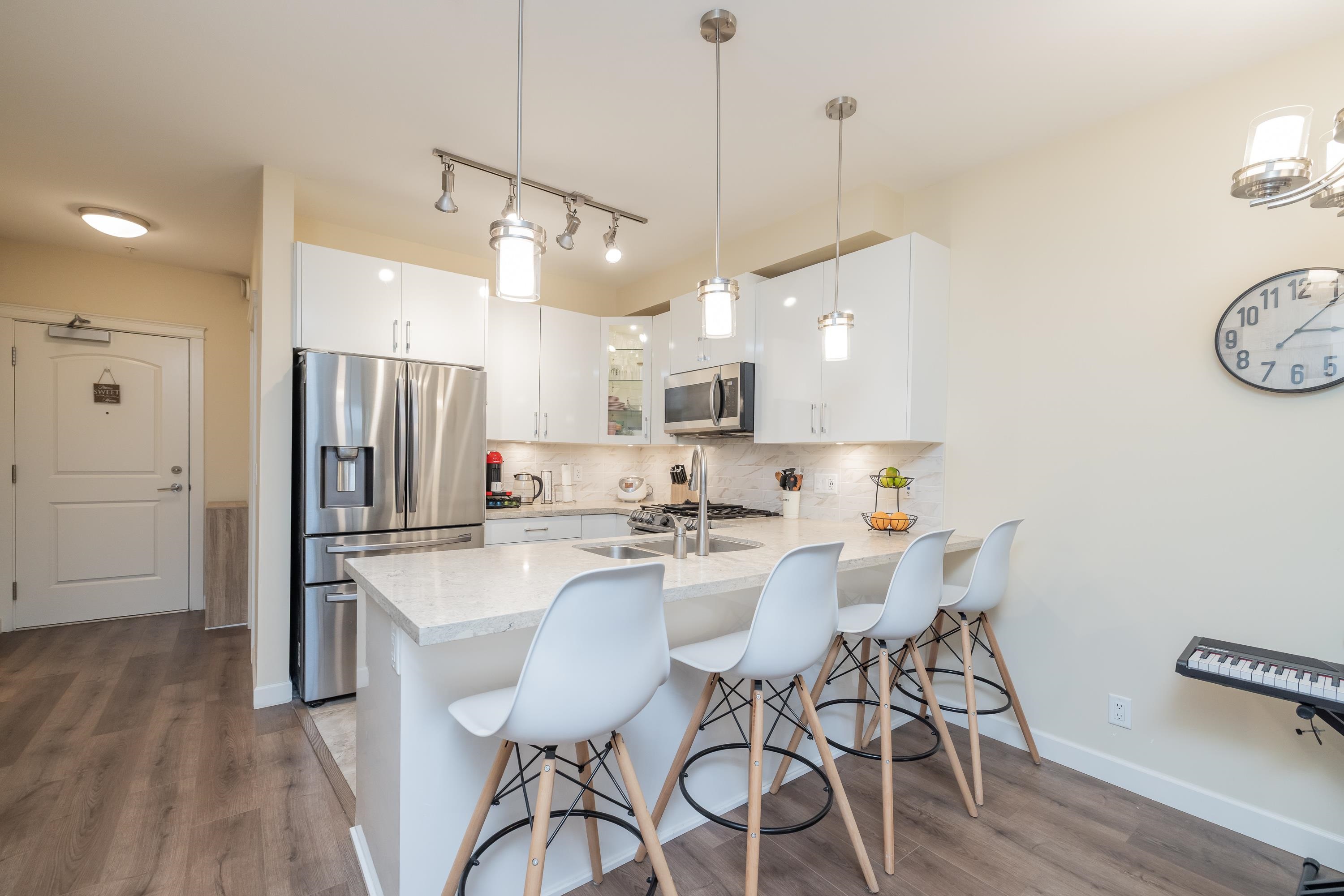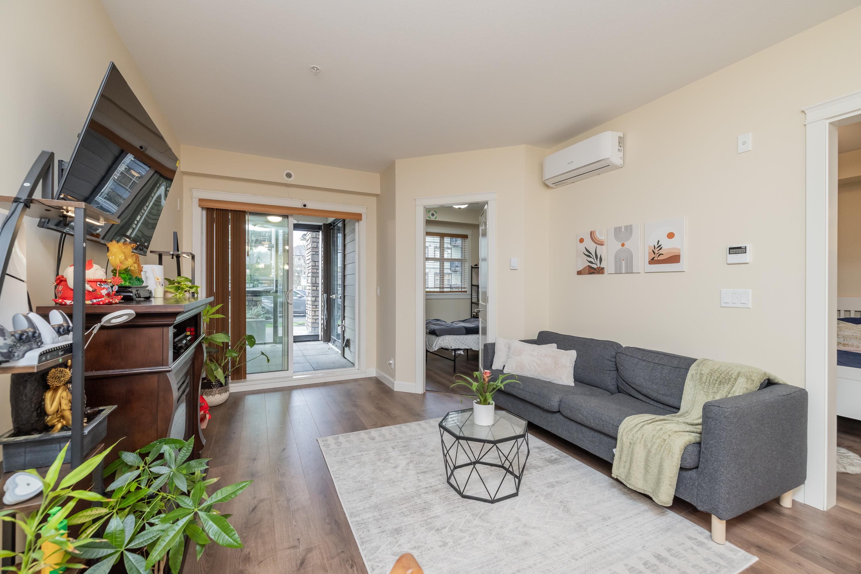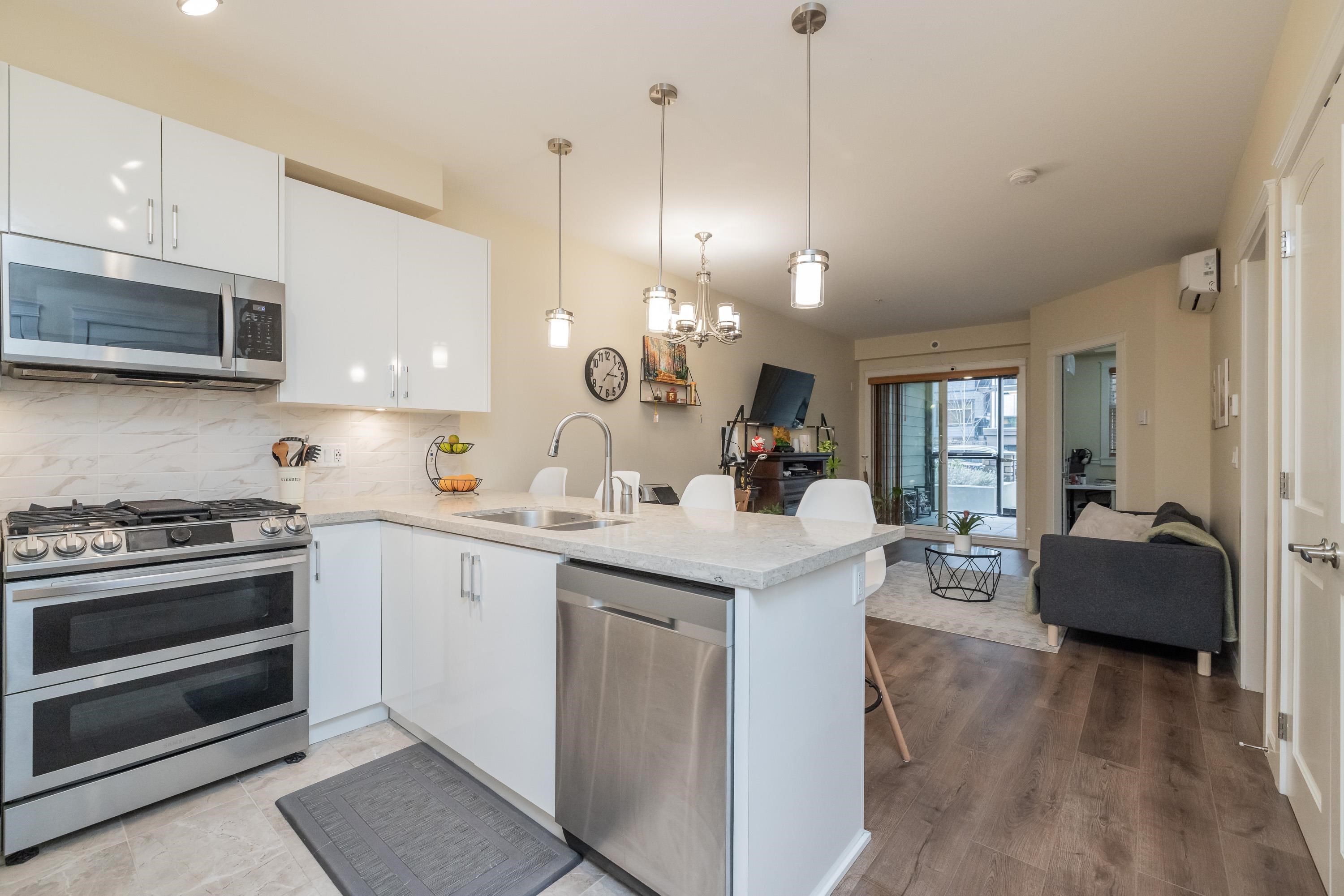 Welcome to Yorkson Park! This 2 bed + flex home offers modern style and smart function in a quality-built, only 4-year-old building. The gourmet kitchen features quartz counters, stainless appliances, and a gas range. Enjoy year-round comfort with A/C, an electric fireplace, and heated bathroom floors. The flex space is ideal for a home office or extra storage. An enclosed solarium expands your living area and overlooks the quiet courtyard. Bonus: 2 parking stalls + secure storage. Steps to shops, restauran...