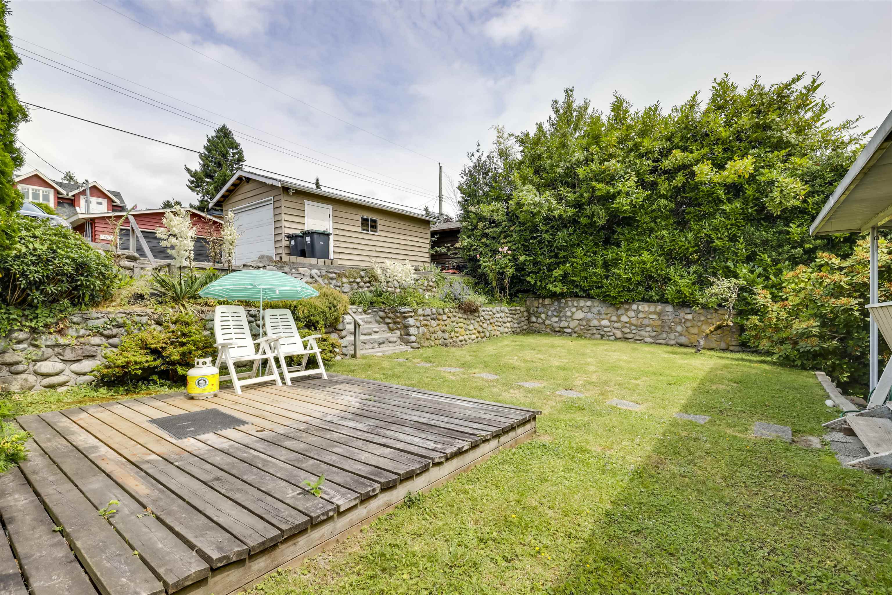 Family friendly Calverhall. 1950's bungalow. 2 bedrooms up and 1 down. 2 full bathrooms 1 up 1 down. Beautiful inlaid hardwood floors on main. Gas f/p up and wood burning down. Basement has suite potential. Lovely 50x140 lot with a terraced backyard, lane access to single car garage with power, plus open parking for 2 more vehicles. Good bones, needs some reno/updating or hold and build. Close to schools, parks, shopping, dining and 2nd Narrows bridge. peek a boo view. Perfect starter home.
