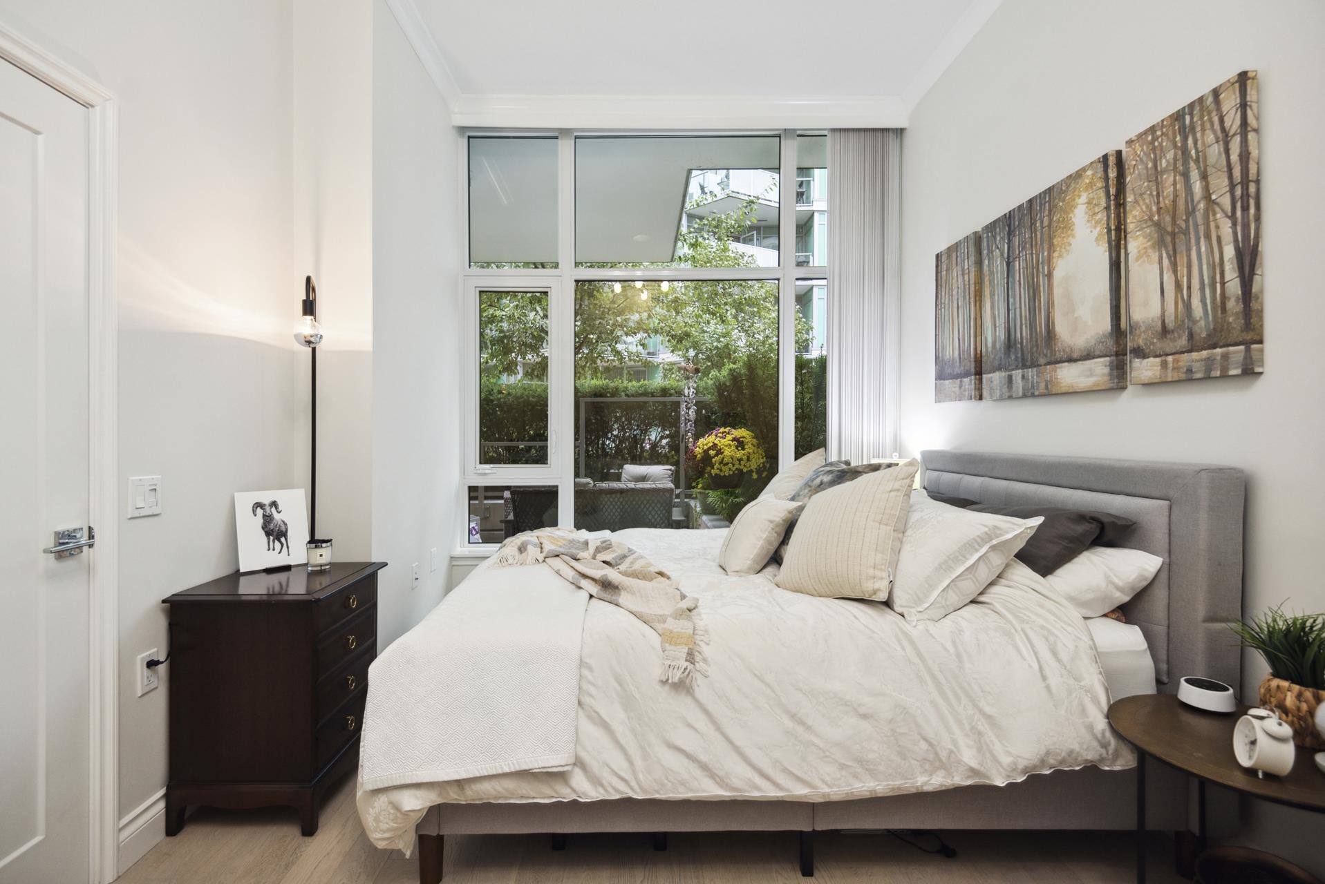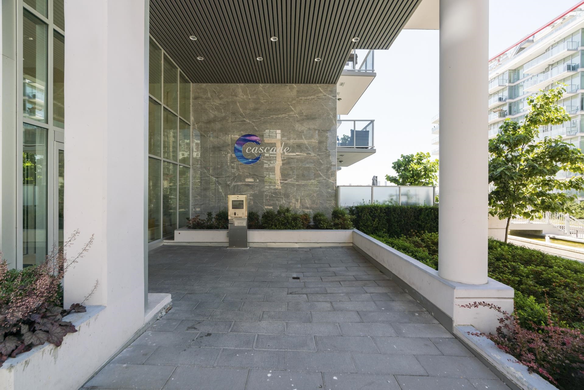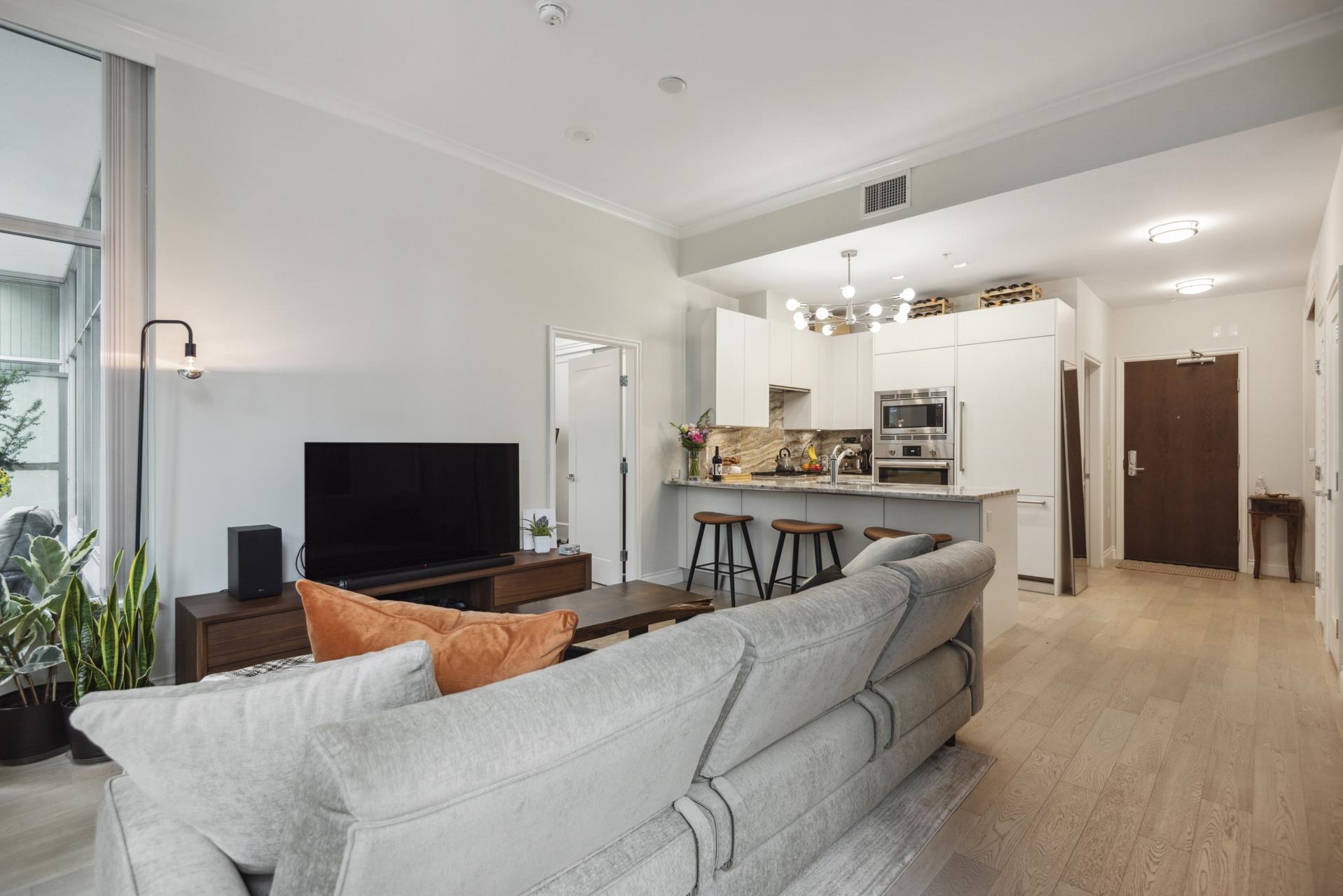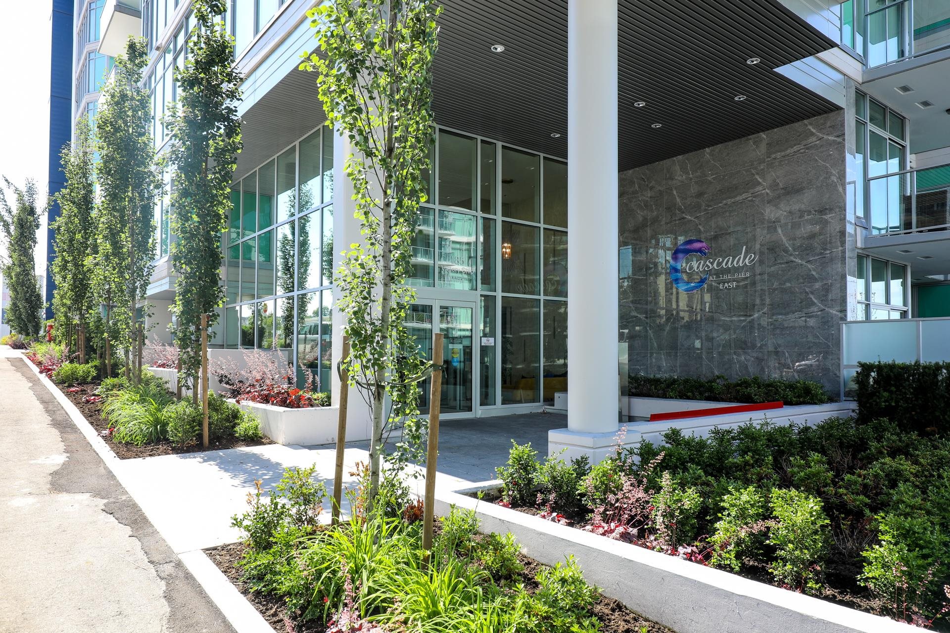 Stunning contemporary 2-bedroom townhome-style suite at Cascade East in the vibrant Shipyards District. Offering 929 sq ft of open-concept living with 2 bedrooms, 2 bathrooms, and a 215 sq ft private patio—and no GST. Convenient main-floor location with direct patio access to the Spirit Trail creates a true townhome feel. High-end finishes include 10-ft ceilings, Scavolini cabinetry, Bosch appliances, engineered hardwood, and A/C. Spacious living/dining opens to the large patio with BBQ hookup. Primary bedr...