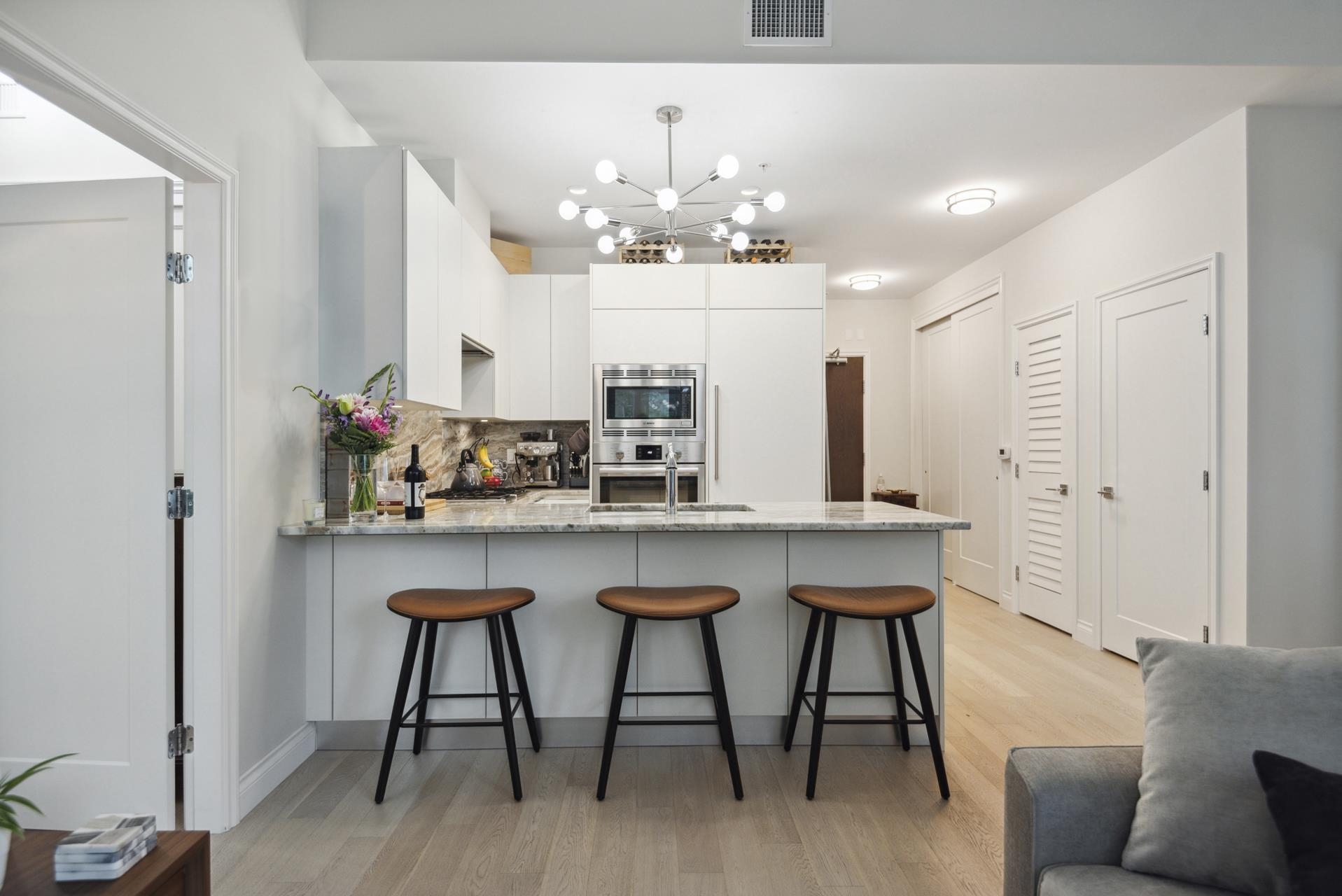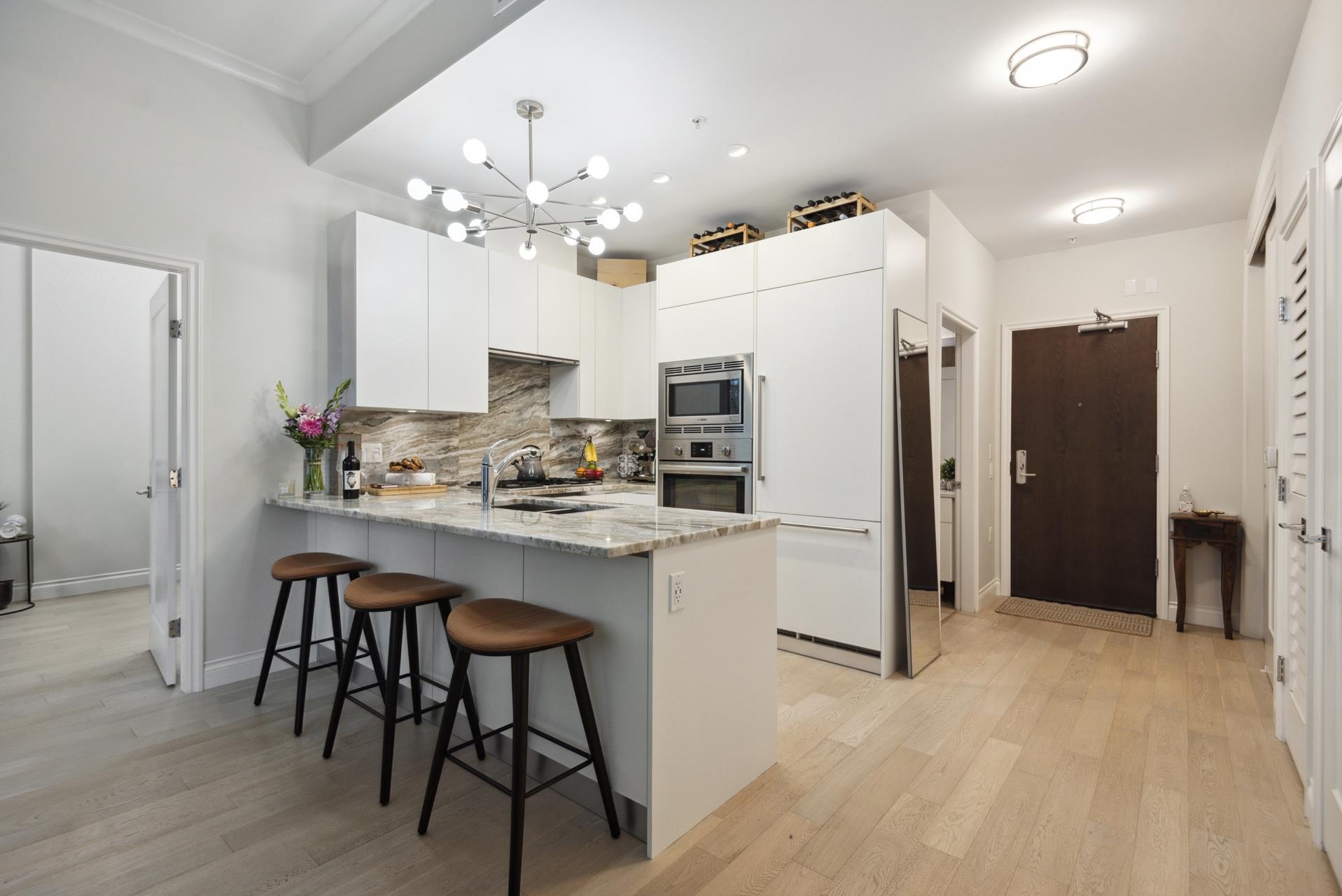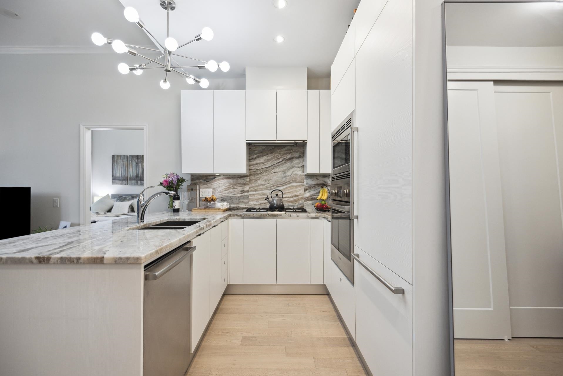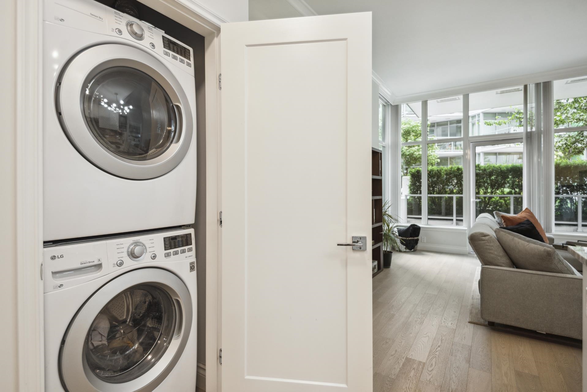 Stunning contemporary 2-bedroom townhome-style suite at Cascade East in the vibrant Shipyards District. Offering 929 sq ft of open-concept living with 2 bedrooms, 2 bathrooms, and a 215 sq ft private patio—and no GST. Convenient main-floor location with direct patio access to the Spirit Trail creates a true townhome feel. High-end finishes include 10-ft ceilings, Scavolini cabinetry, Bosch appliances, engineered hardwood, and A/C. Spacious living/dining opens to the large patio with BBQ hookup. Primary bedr...