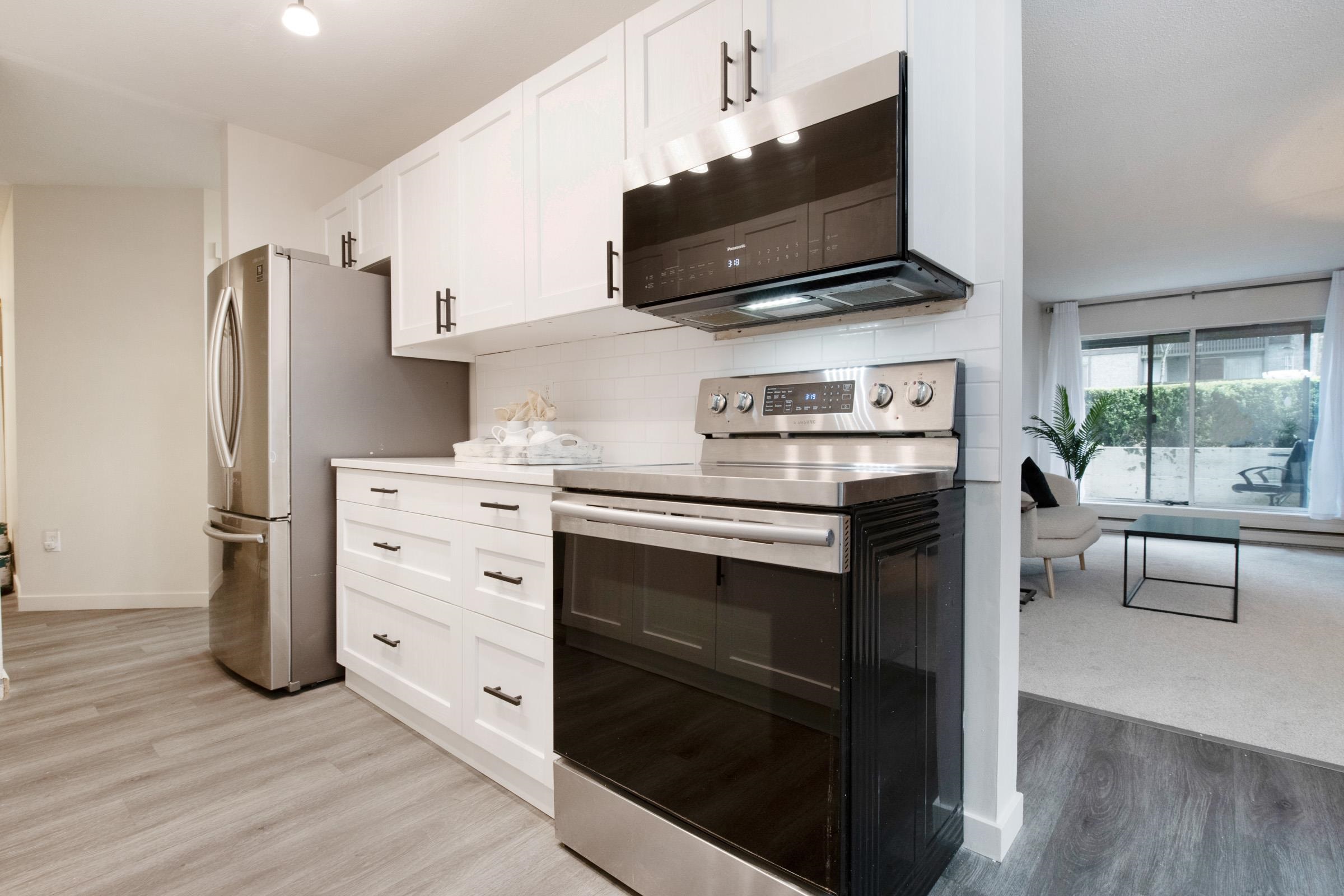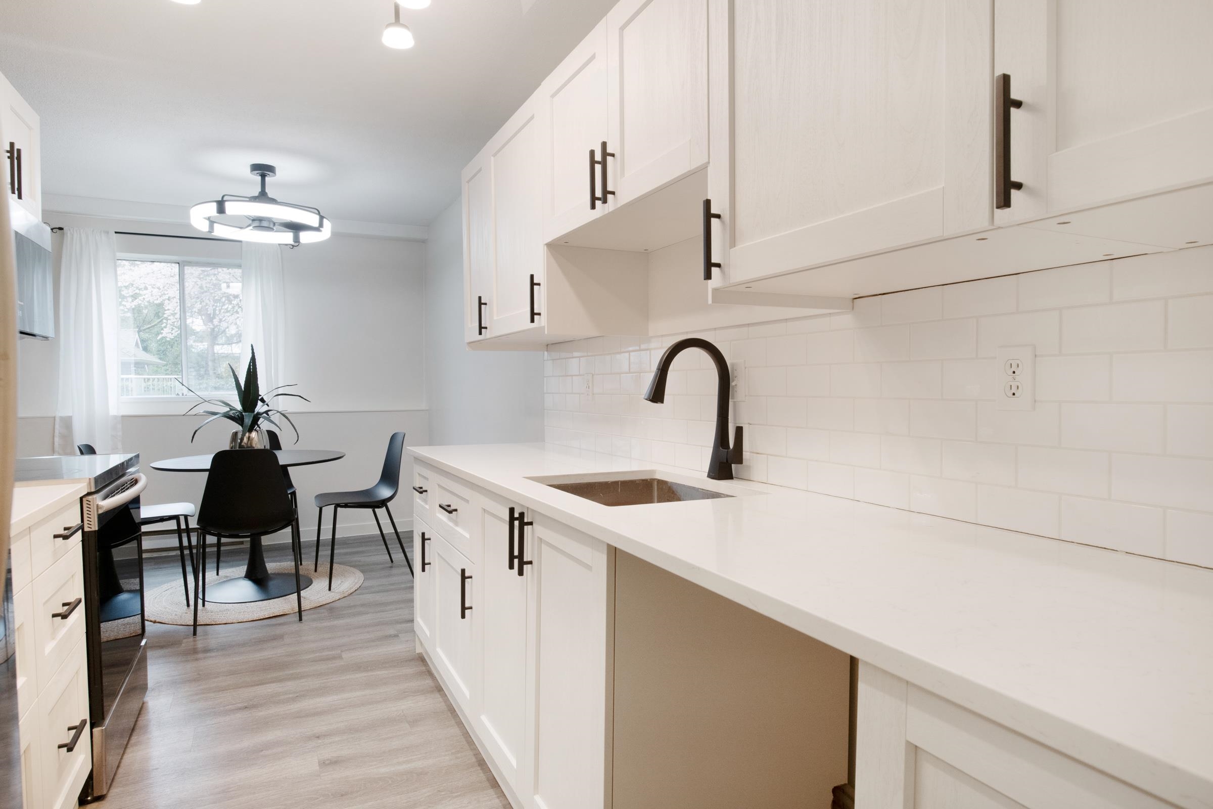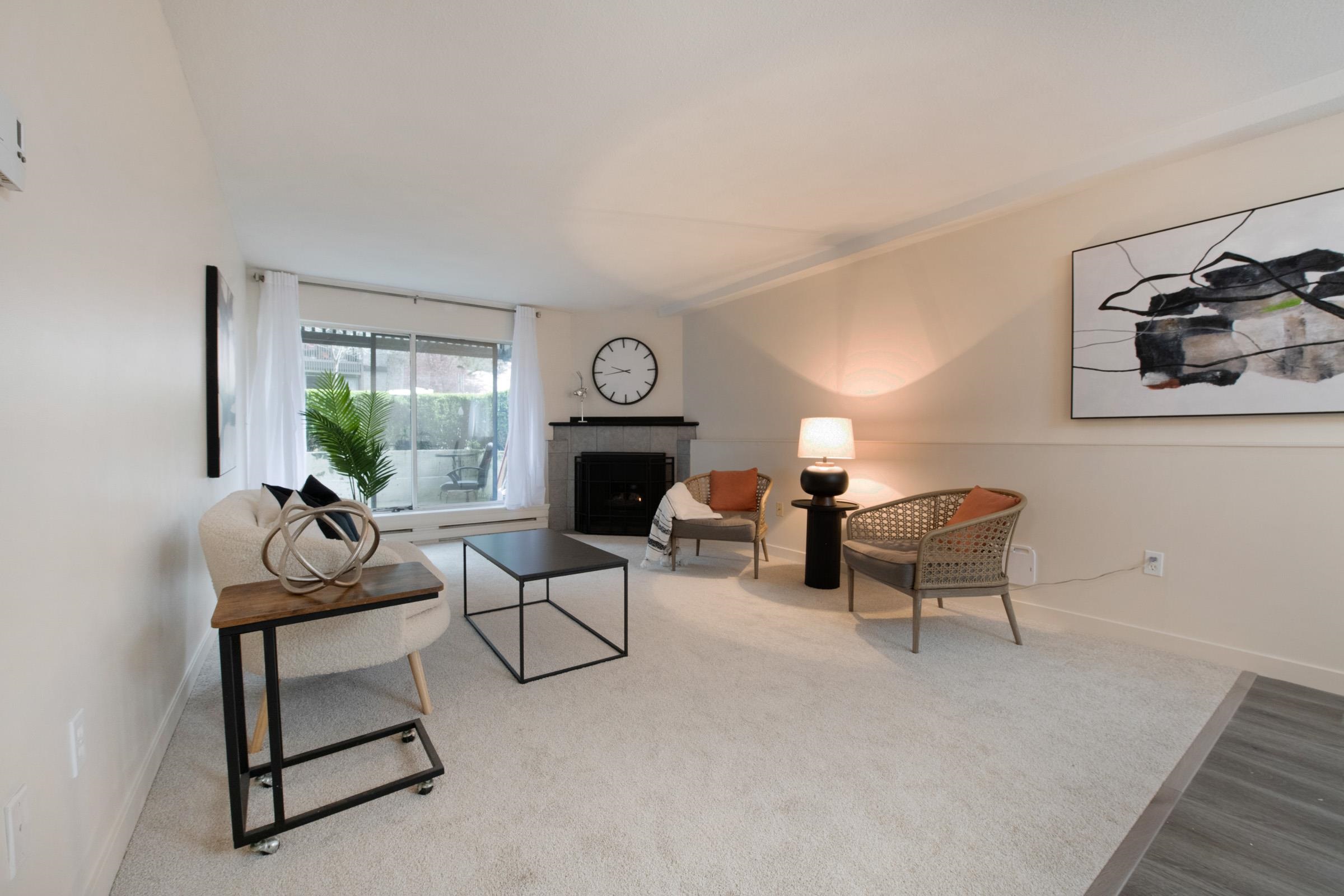 This stunning 2-bedroom end unit apartment has been beautifully and completely renovated from top to bottom, offering a bright and quiet living space that feels better than new. Featuring brand new kitchen cabinets and countertops, new stainless steel appliances, fresh carpet and flooring throughout, new paint, modern light fixtures, and a fully updated bathroom with a sleek new backsplash. Enjoy the cozy gas fireplace and relax on your private covered patio, while the convenience of In-suite Washer and Dry...