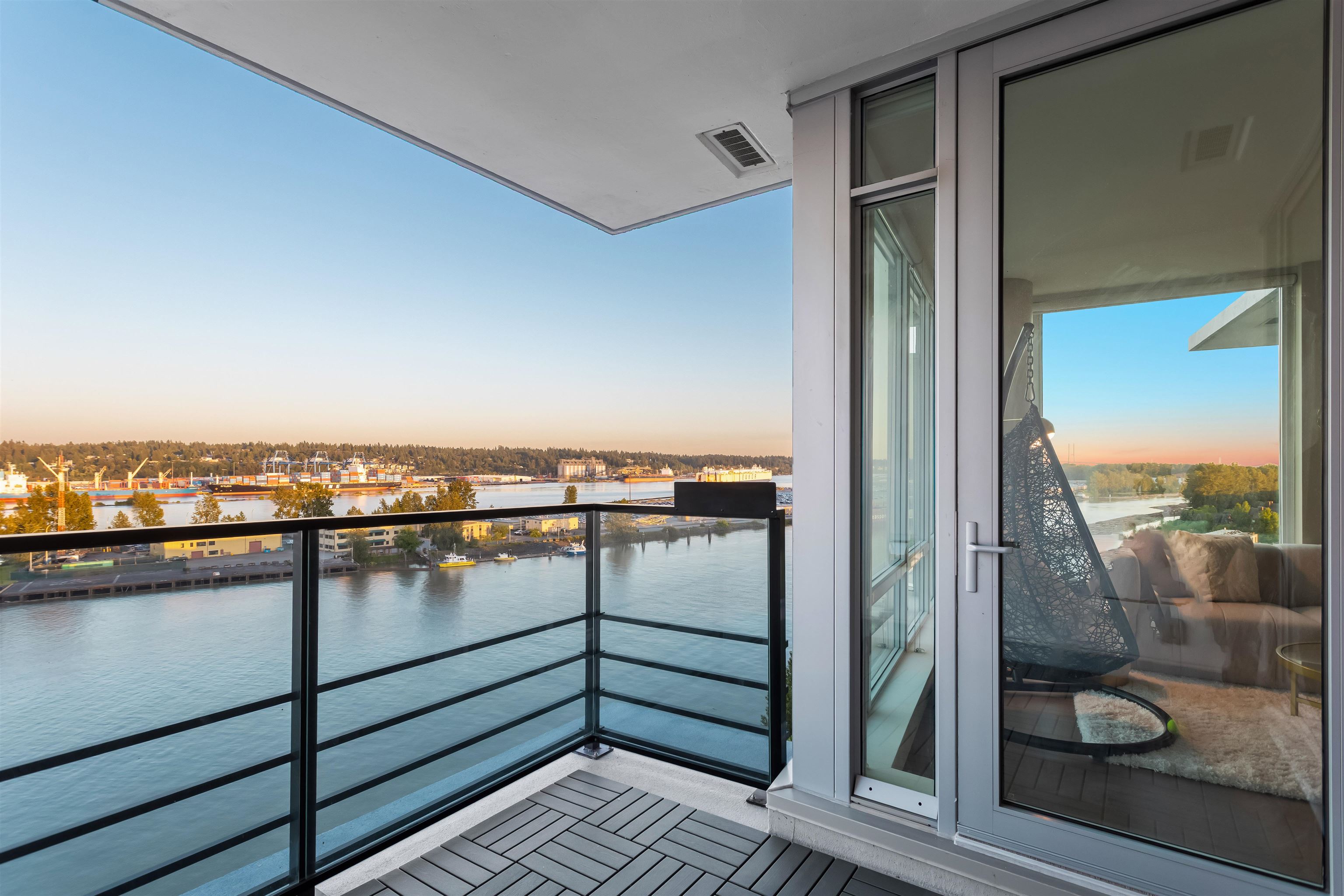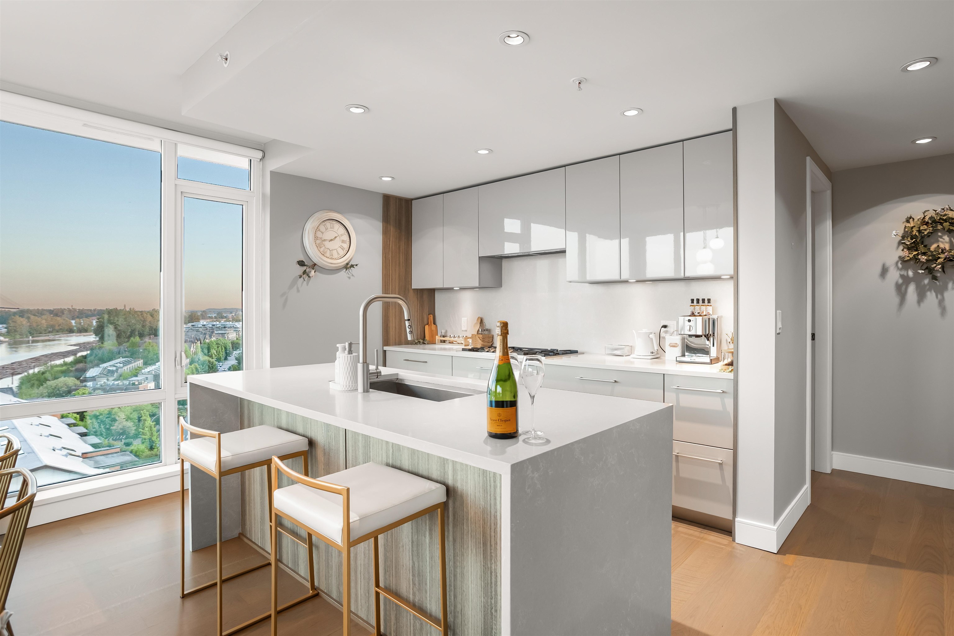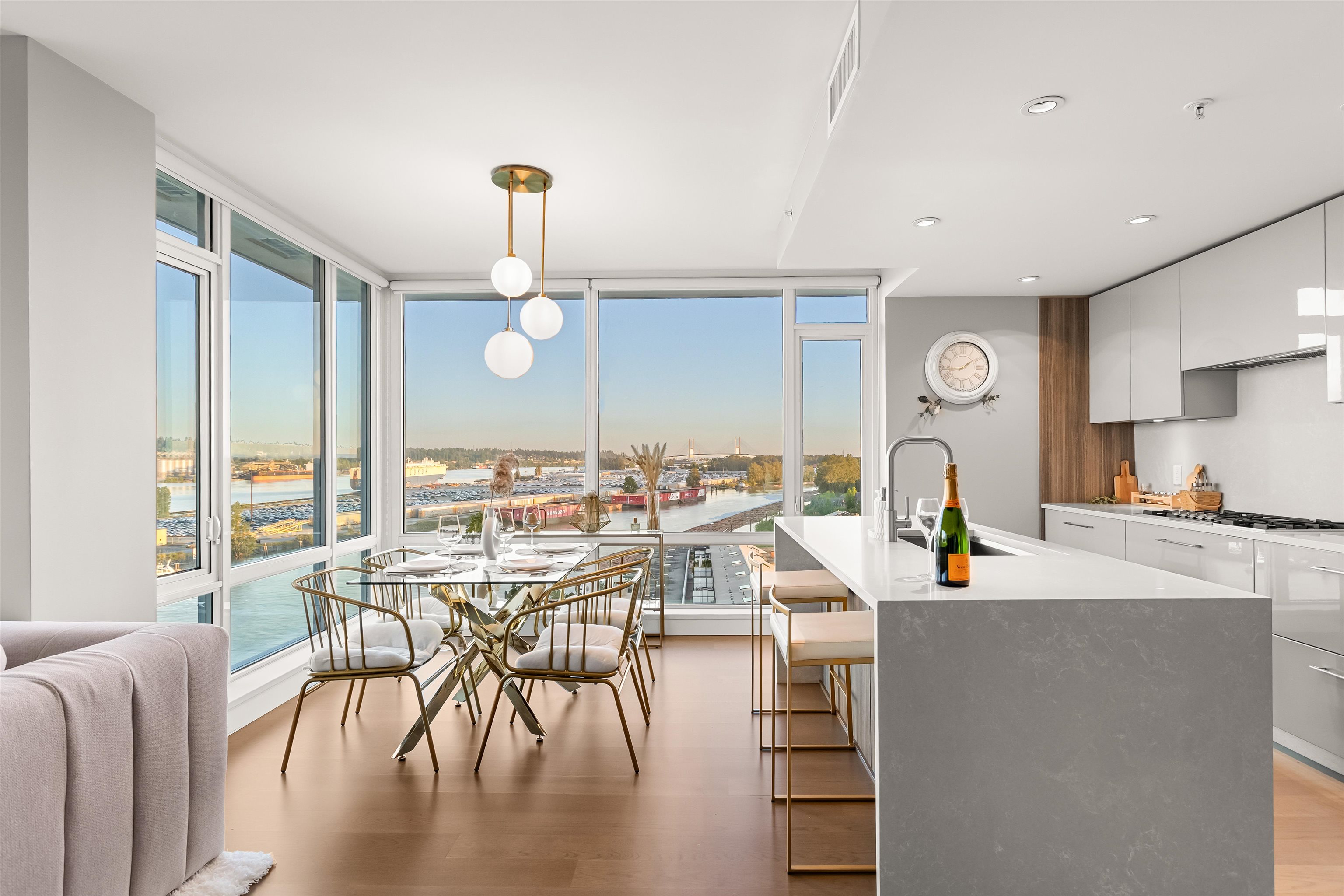 Welcome to The Peninsula, where riverfront living meets everyday luxury. This beautifully maintained CORNER residence is filled w/ natural light + showcases breathtaking SE views of the Fraser River through bright floor-to-ceiling windows. 2 bed 2 bath 1,104 sf + 72 sf balcony, the home features premium Gaggenau appliances, hardwood flooring, 5-piece ensuite + newer laundry appliances. Enjoy 15hr concierge service, fitness centre, theatre room, steam room, entertainment lounge, guest suites + 1 parking incl...