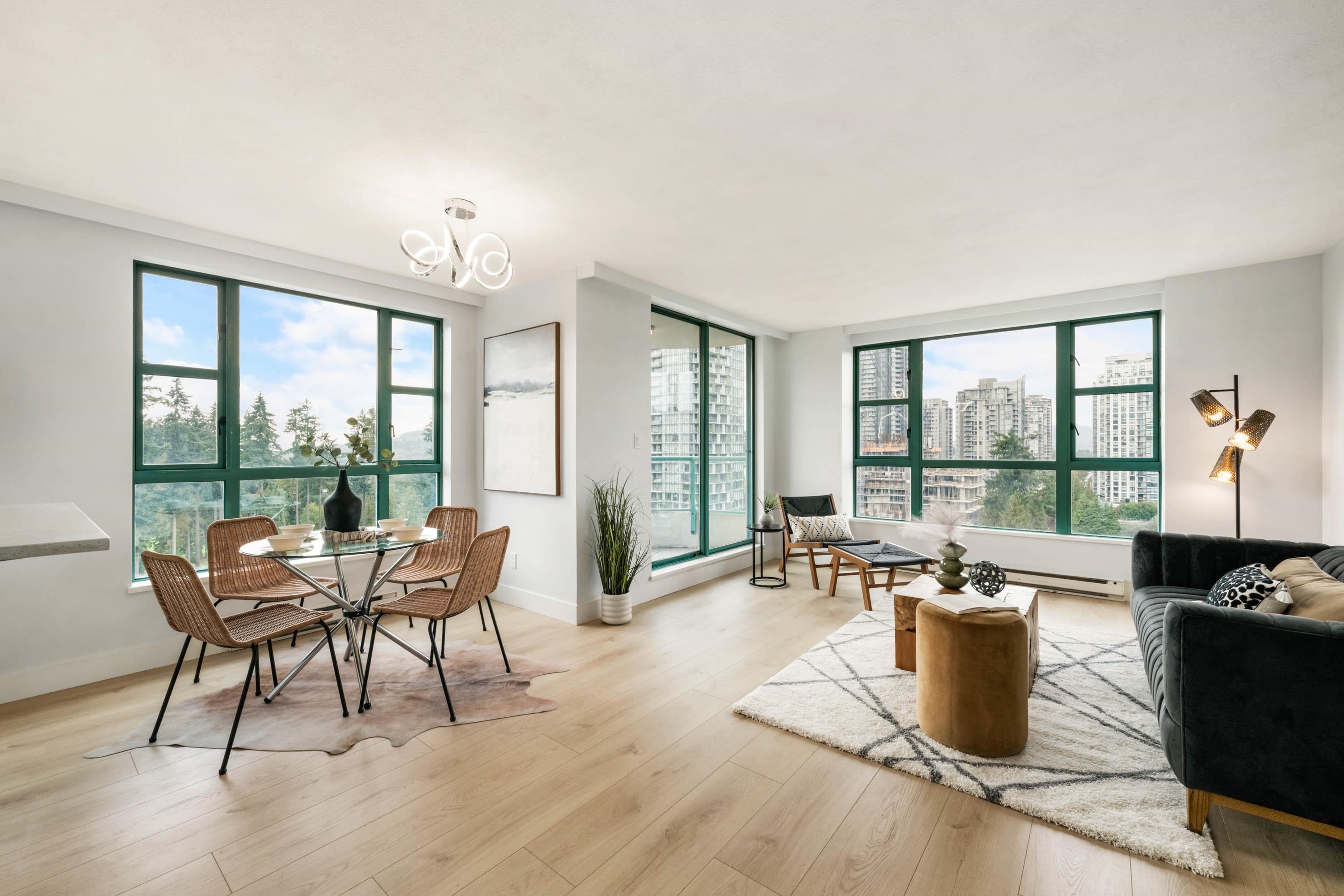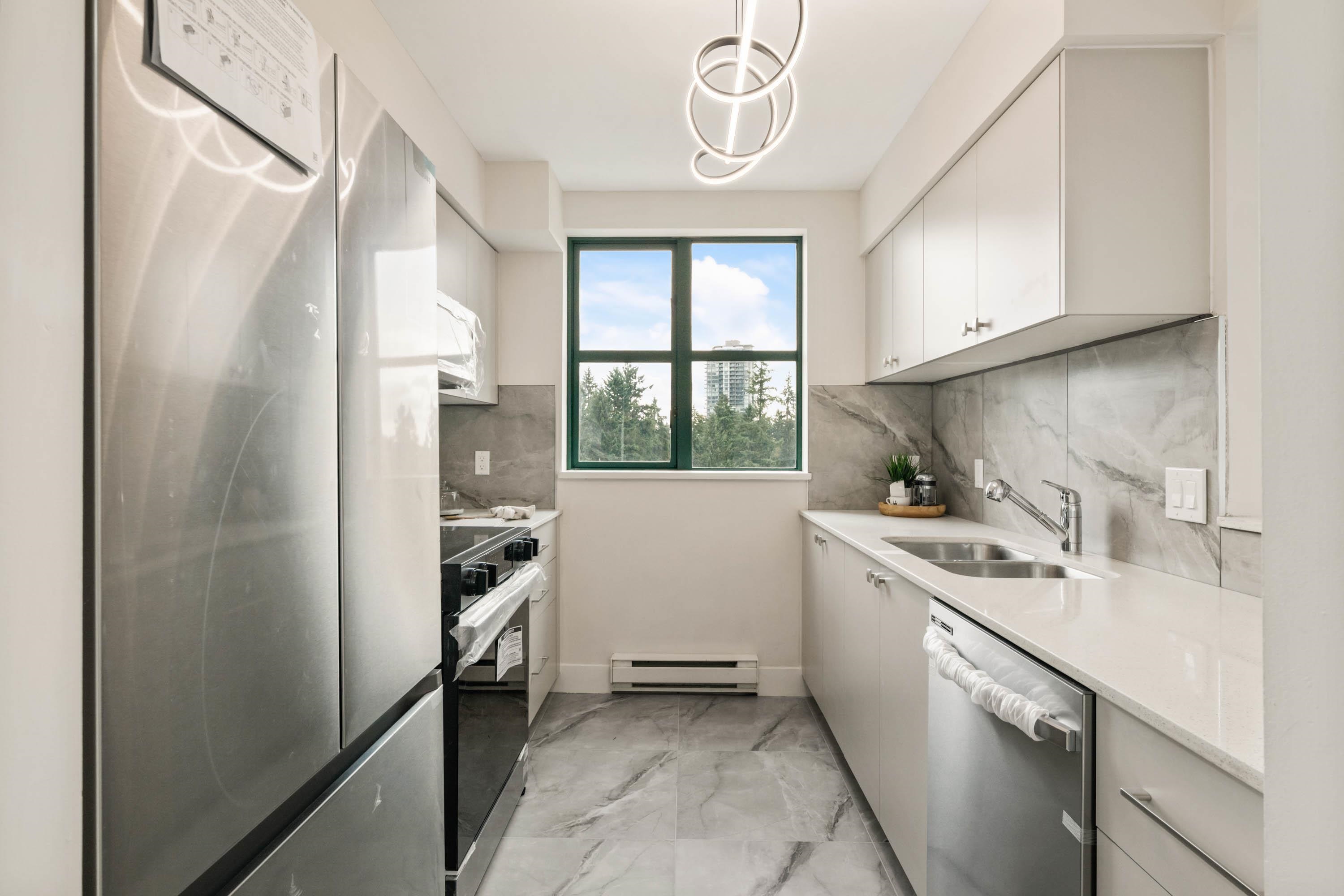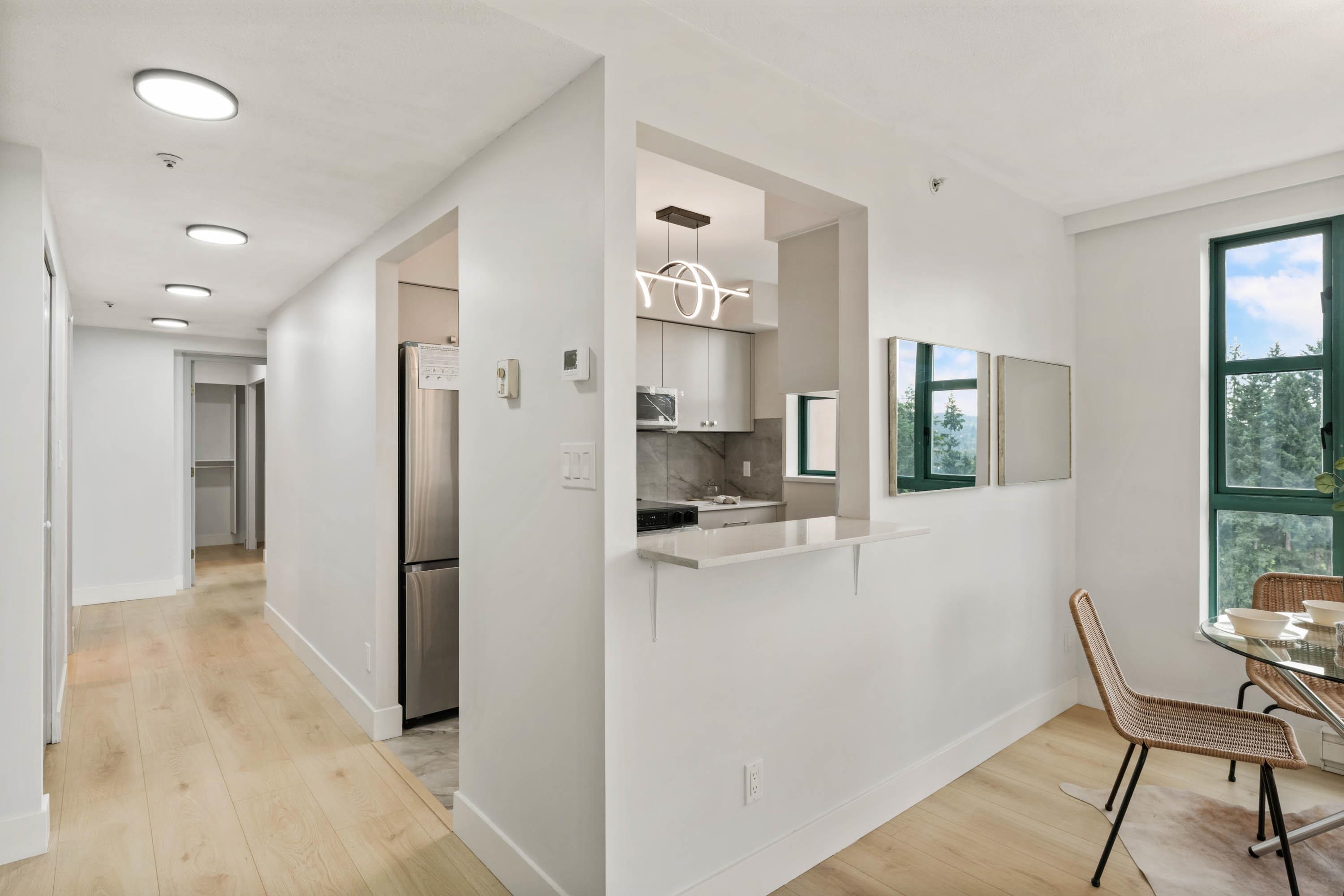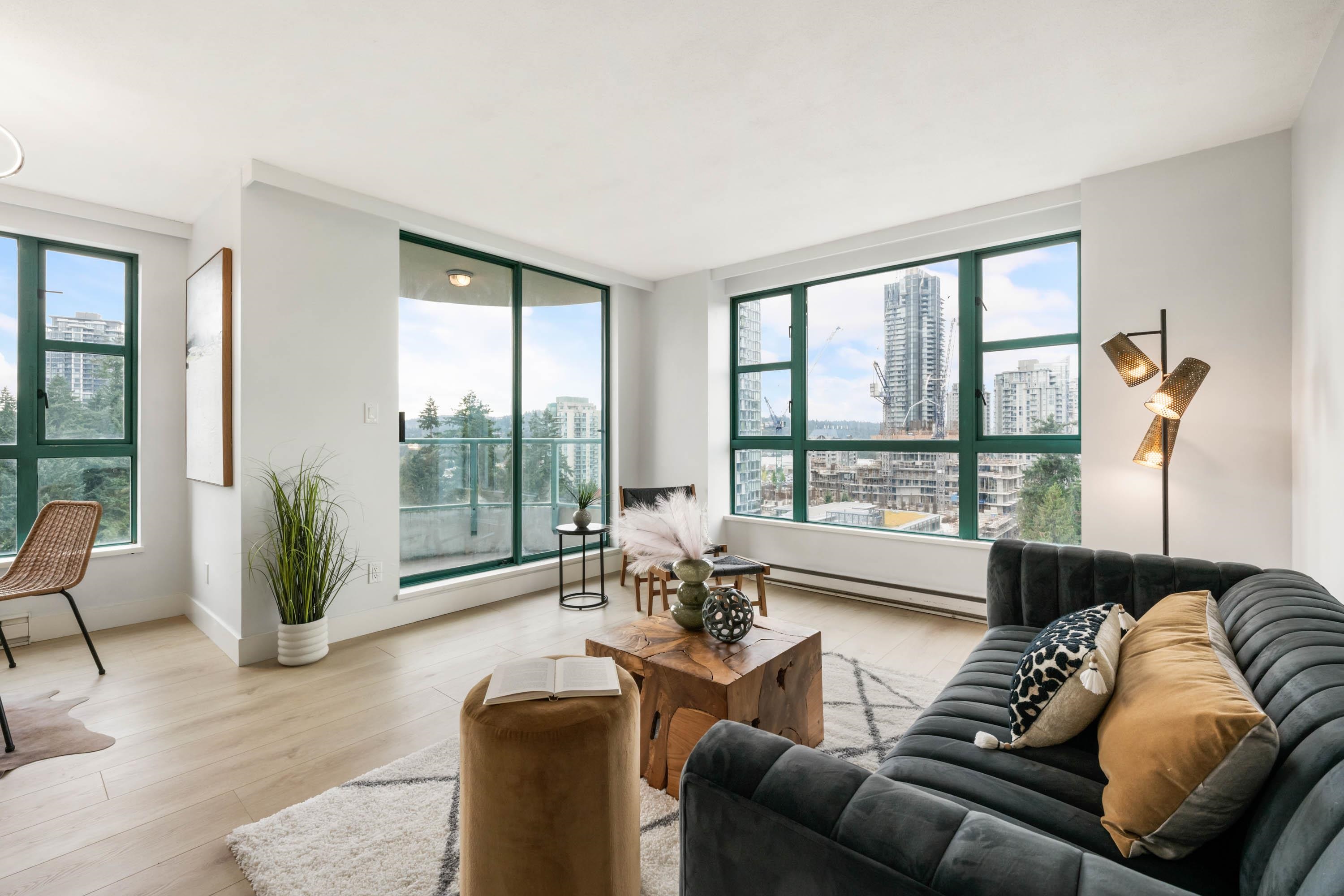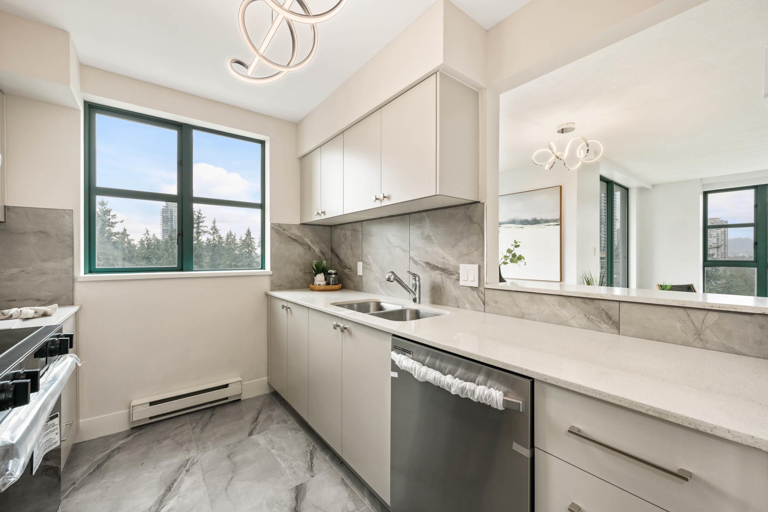 Welcome to Parc Laurent Highrise, located in the heart of Coquitlam! This bright & FULLY RENOVATED 2 bed + 2 bath CORNER UNIT offers over 1,000 sq. ft. of living space with beautiful south-facing views of the park, city & mountains. Renovated from top to bottom, featuring a modern kitchen with new cabinetry & SS appliances, updated baths with new tiles, fans, vanities, mirrors & tub, plus new flooring, lighting & fresh paint throughout. Bedrooms include custom built in closets & added living room storage. B...