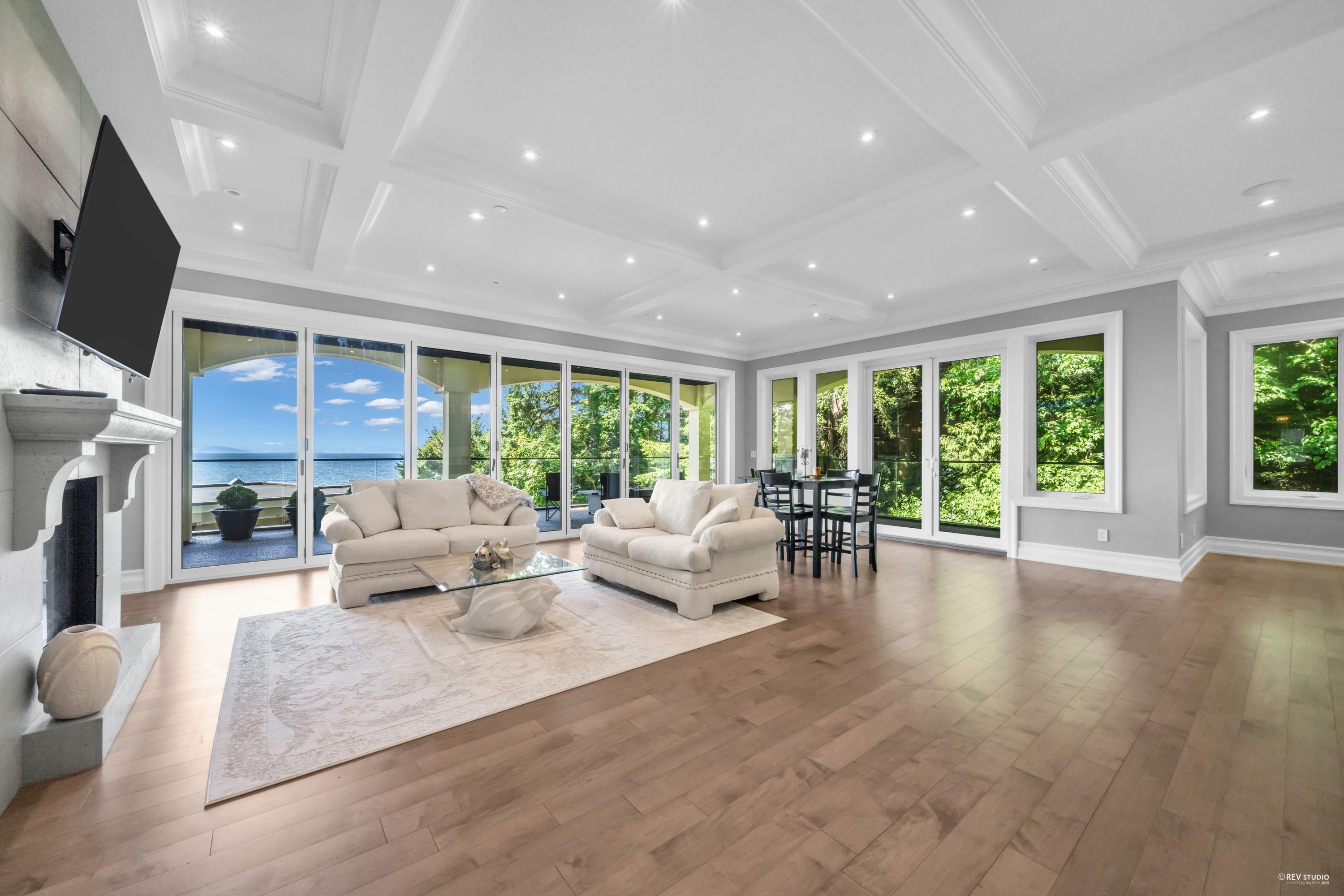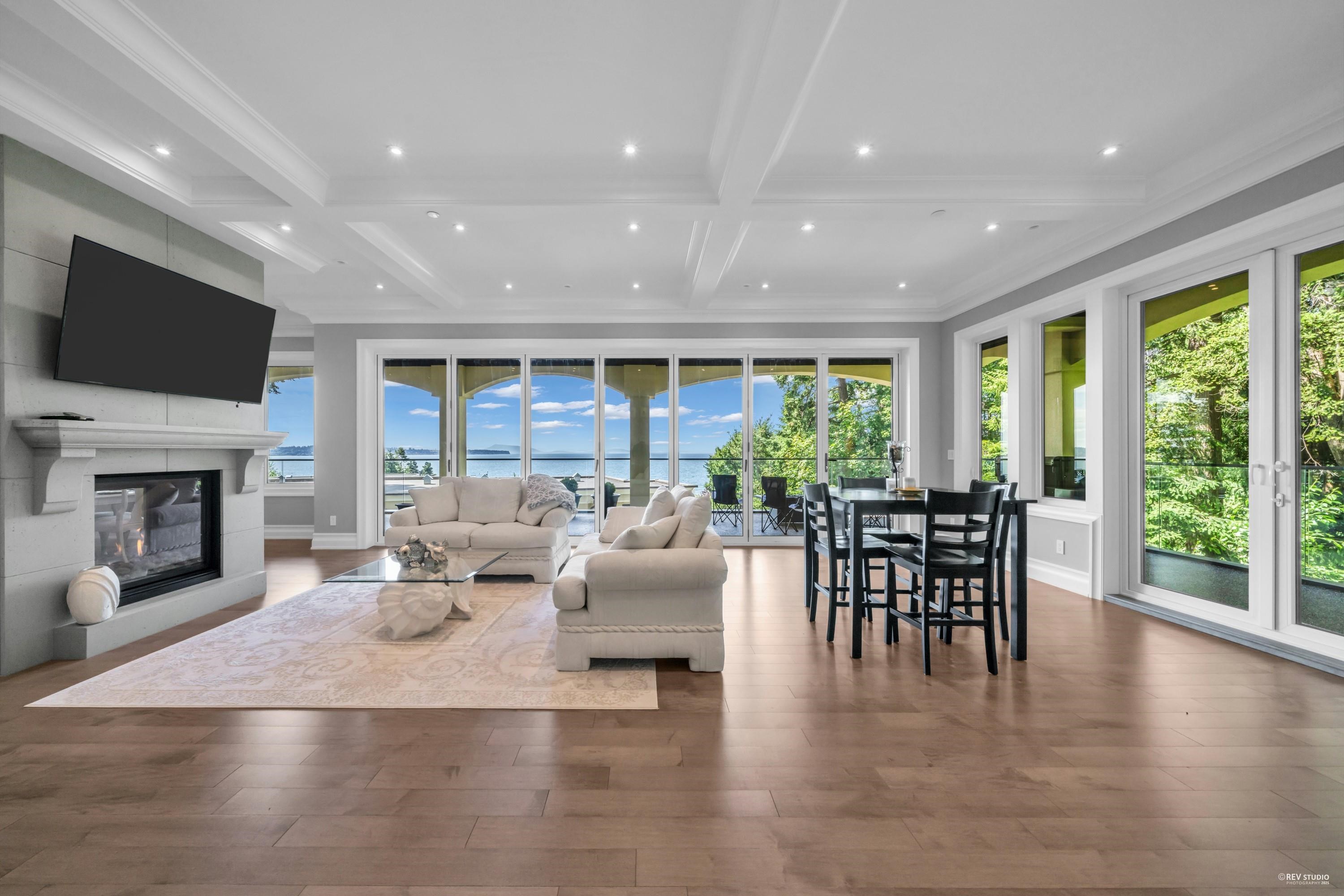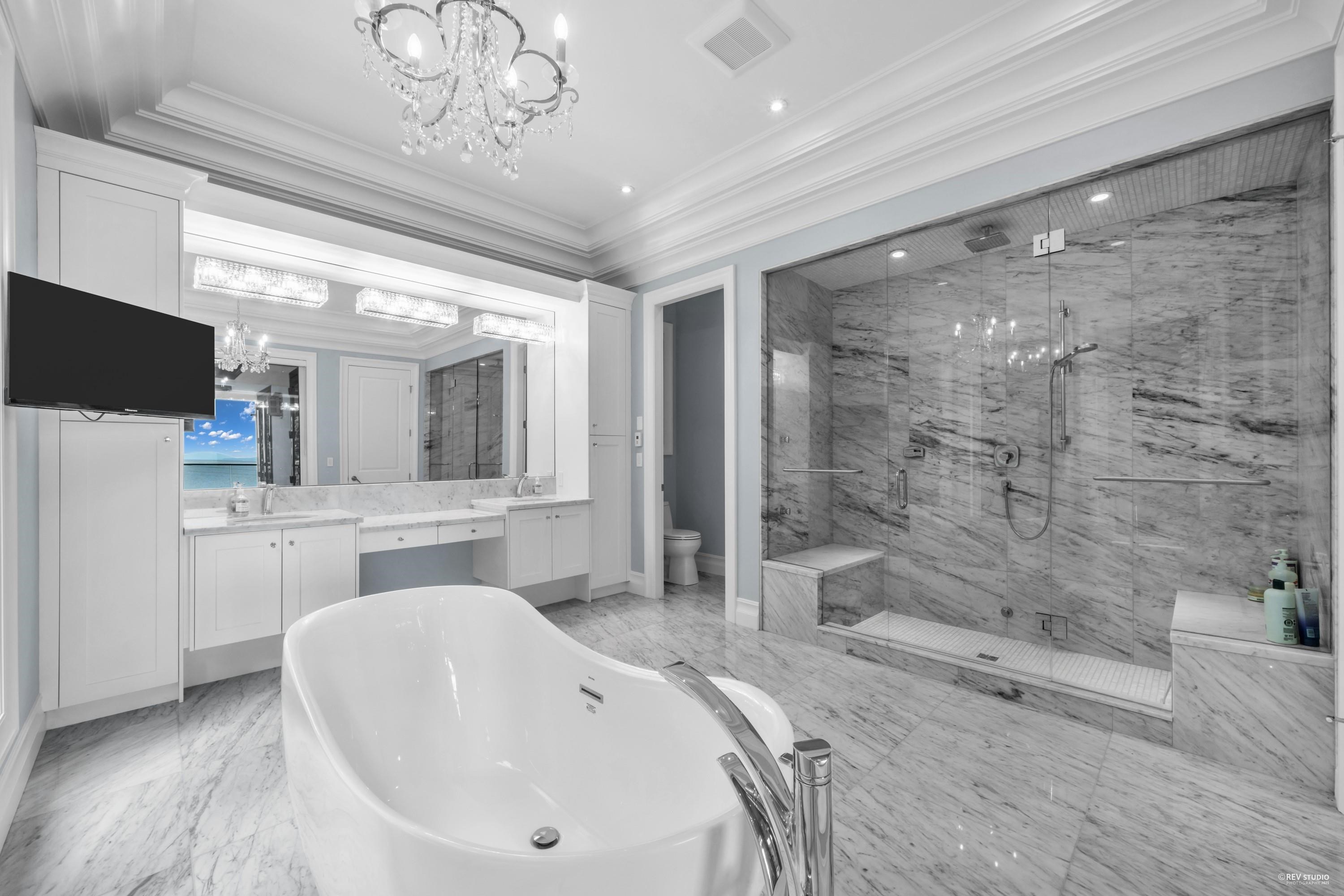 Unobstructed panoramic ocean view. Pristine 5,734 sf executive home by renowned Ronco Construction on a S-facing 9,350 sf lot with 132.4' frontage, surrounded by mature trees and trail to Centennial Park. Main floor features open living/dining, Thermador gourmet kitchen, office/4th ensuite bdrm, and 1,080 sf wrap-around covered balcony plus 200+ sf private patio with built-in trellis—perfect for entertaining. Lower floor offers 4 spacious ensuite bdrms and 978 sf covered balcony. Luxurious primary ensuite w...