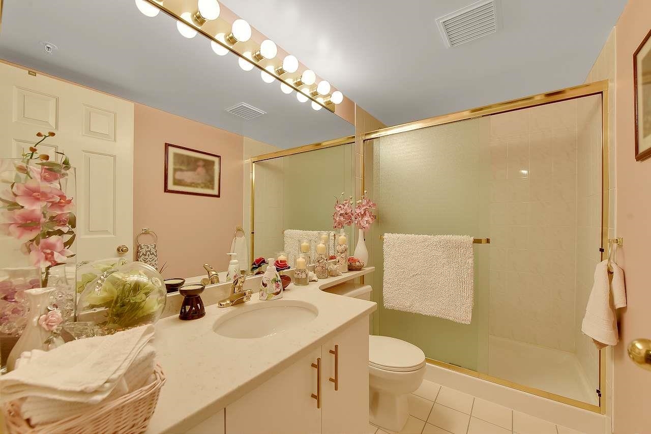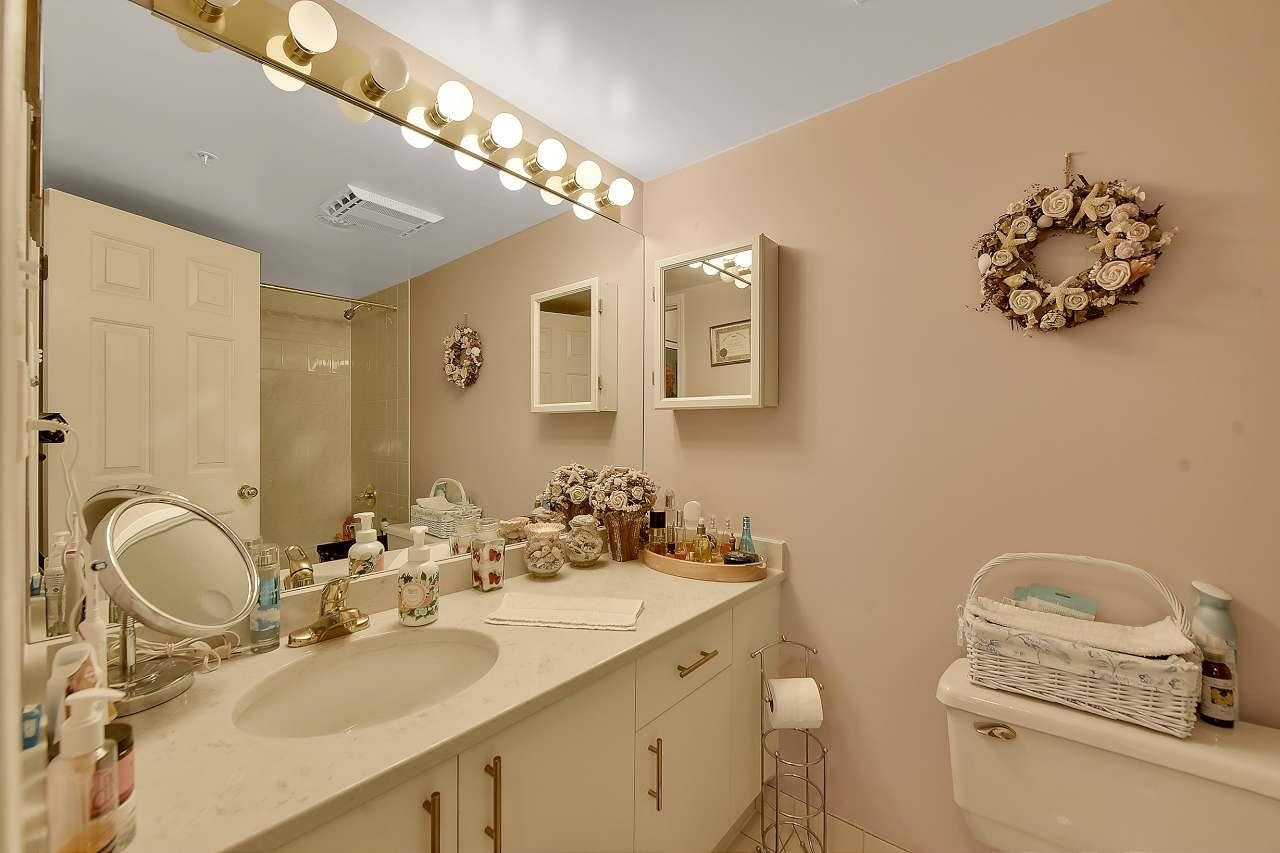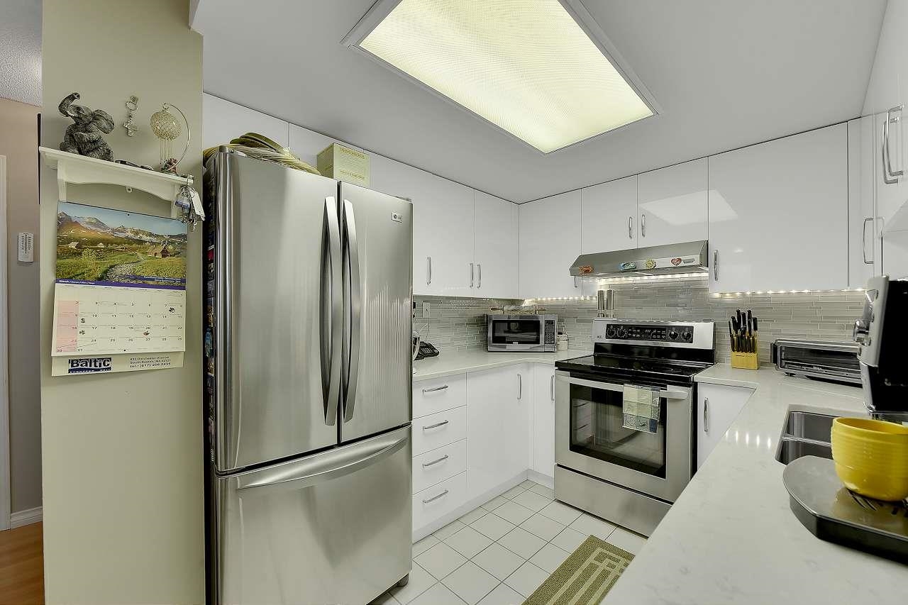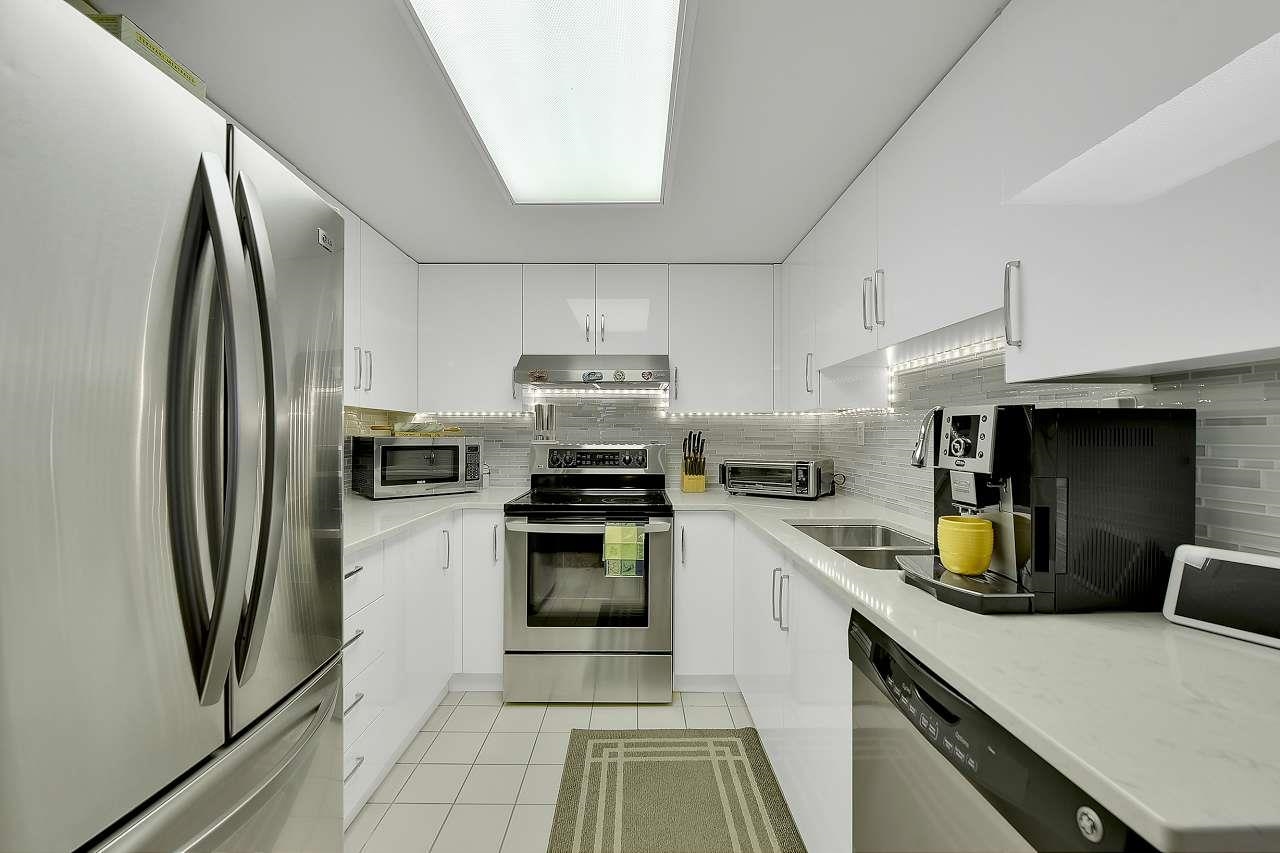 The Stanley-well maintained concrete building close to all amenities including transit. This 919 sf 1 bedroom & den has laminate floors in the entry, living room & den. Kitchen has been renovated with new cupboards, new stainless steel appliances, new quartz countertops & has room for small table & chairs. New designer light fixture in dining room. Beautiful gas fireplace that heats the whole place. Bathrooms have new quartz countertops. Master bedroom has double walk through closets to ensuite. Sliding pat...