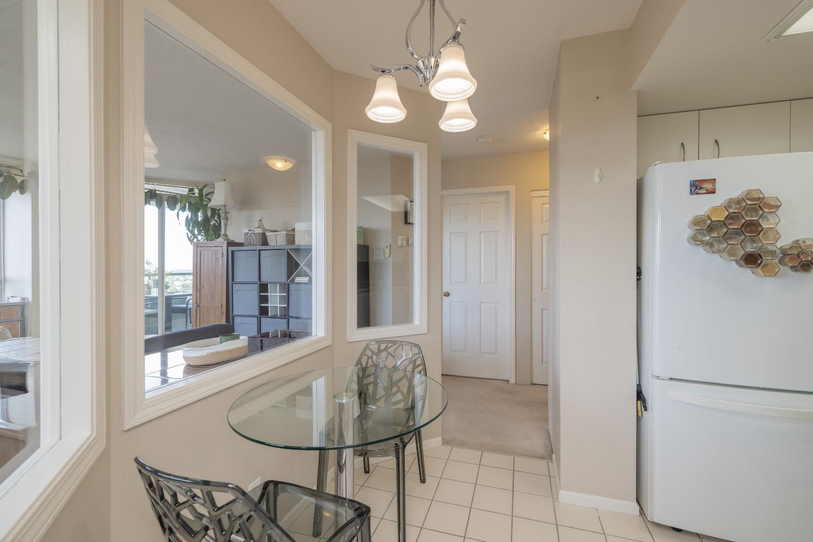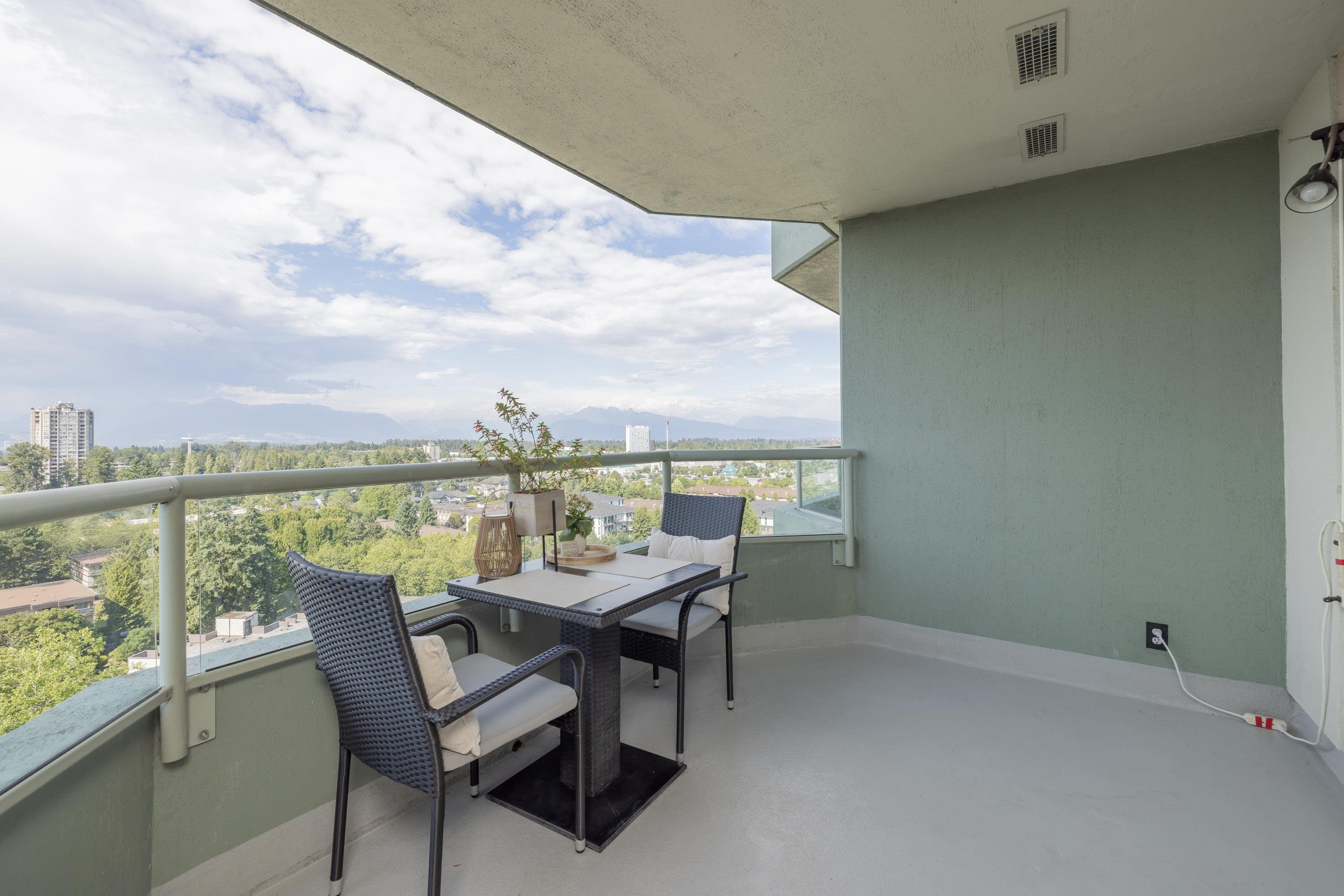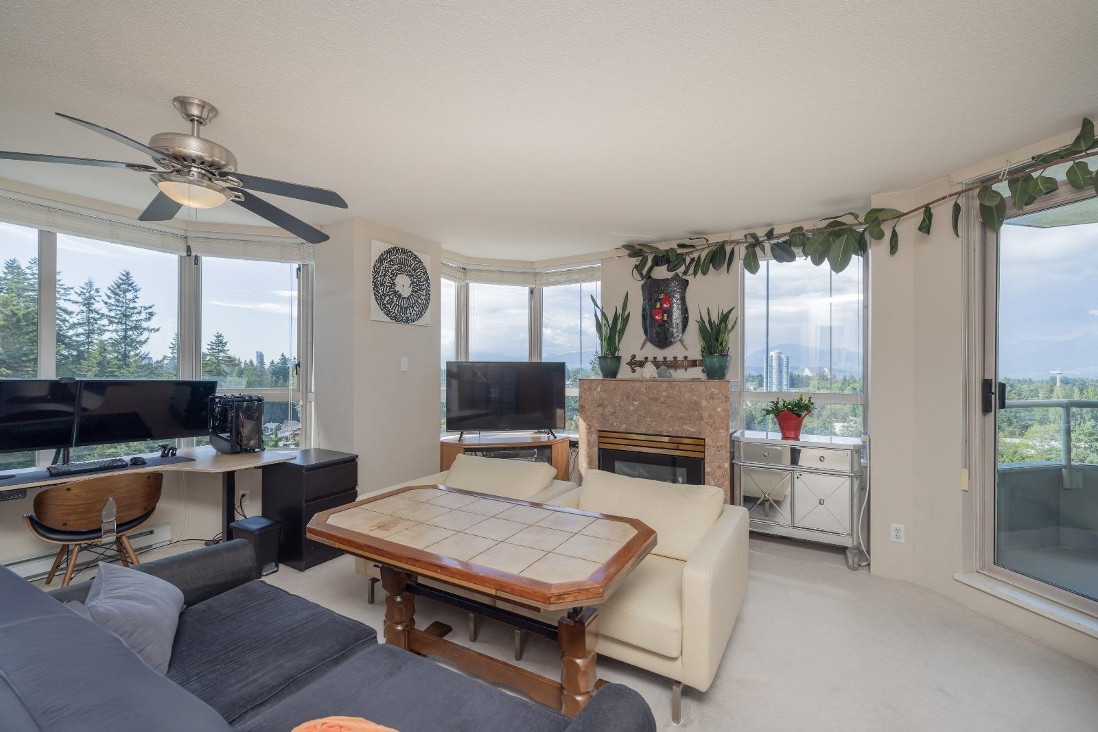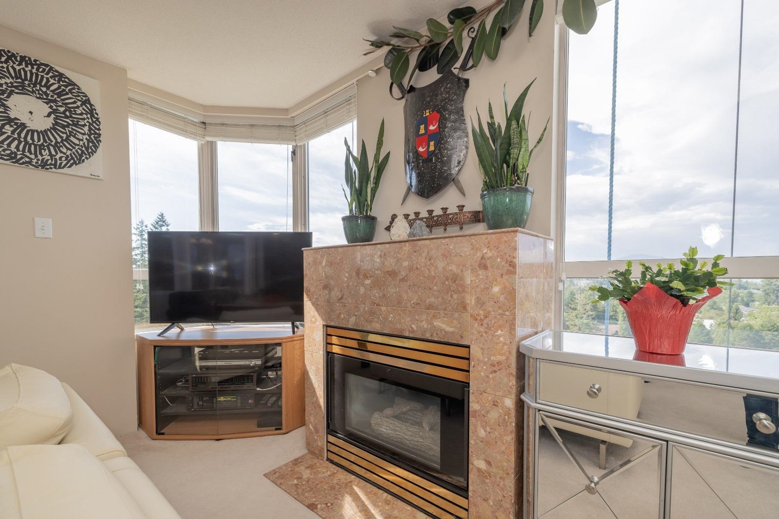 Large 1 bed, 2 bath condo with beautiful views from the 15th floor! Similar size to 2 bed units. Spacious living room with gas fireplace & a walk out deck to a north-west look of city & mountains. Dining room could also be a great place for a desk/study & the kitchen is positioned near the centre of the unit. With strata approval, a small renovation would create a nice open concept. Good size bedroom with ensuite & walk through closet. 2 outdoor pools, saunas, gym, hot tubs, & tennis courts are all great be...