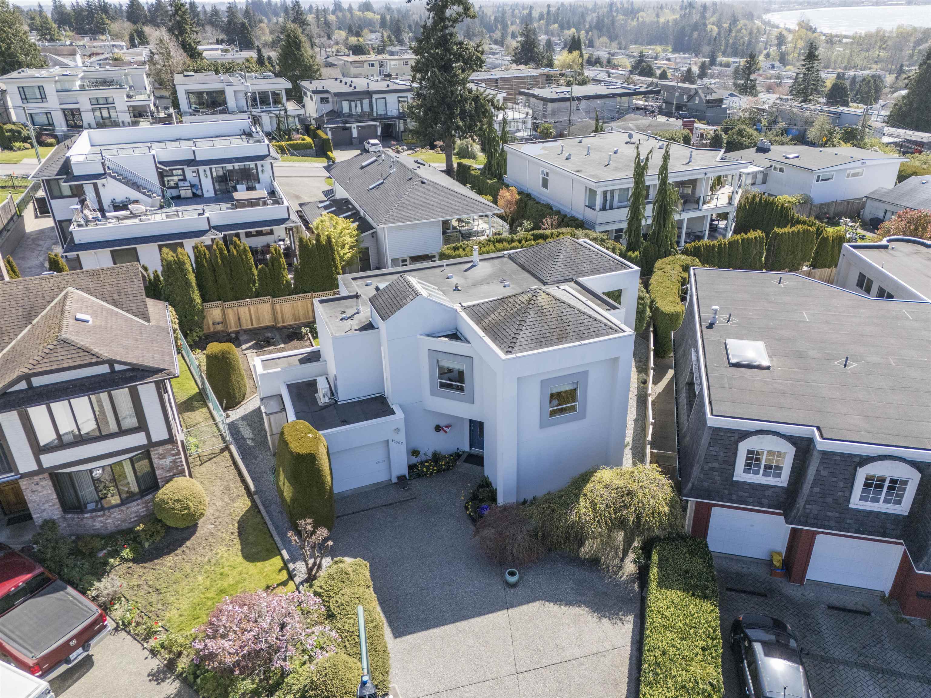 Exclusive White Rock Retreat with Future Potential! One-owner custom-built 2,056 sq ft home on a 5,110 sq ft south-facing lot, tucked into a quiet cul-de-sac with sweeping ocean and Mount Baker views. Designed with professionals in mind, this 3 bedroom, 2 bathroom residence offers bright open-concept living on the upper level, with a spacious kitchen, dining, and living area flowing seamlessly onto a covered sundeck—perfect for year-round entertaining or relaxing. The private east-facing backyard features l...