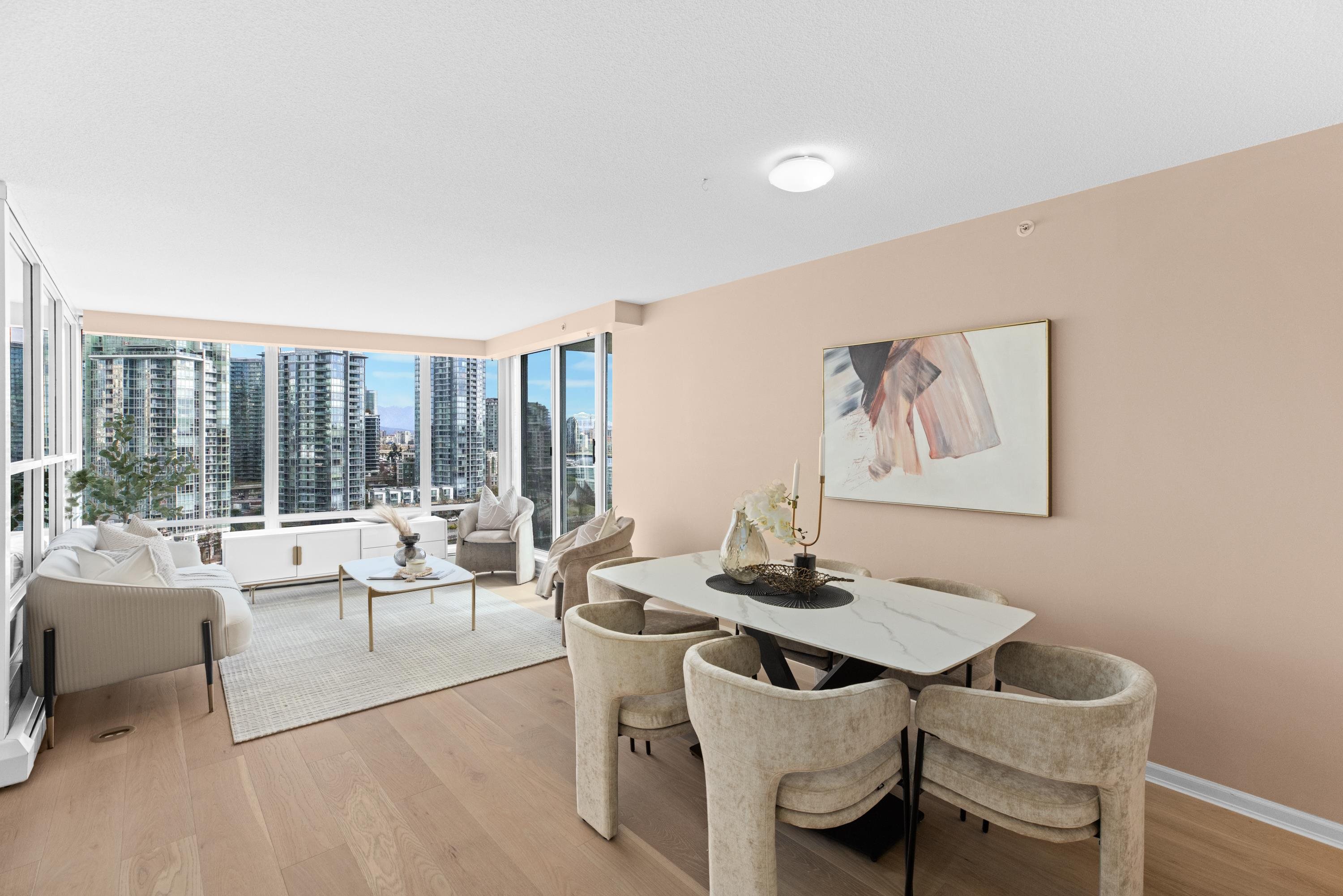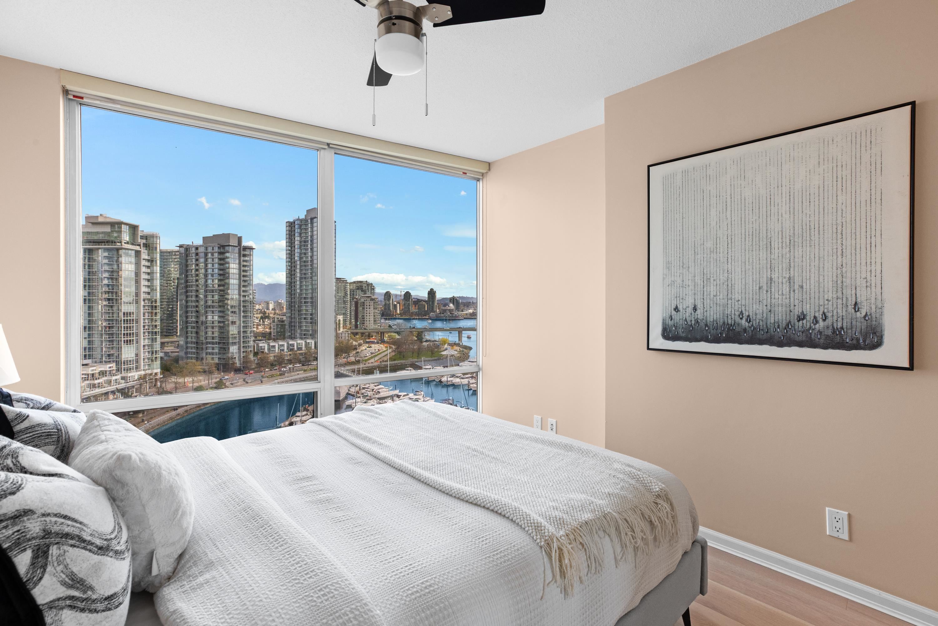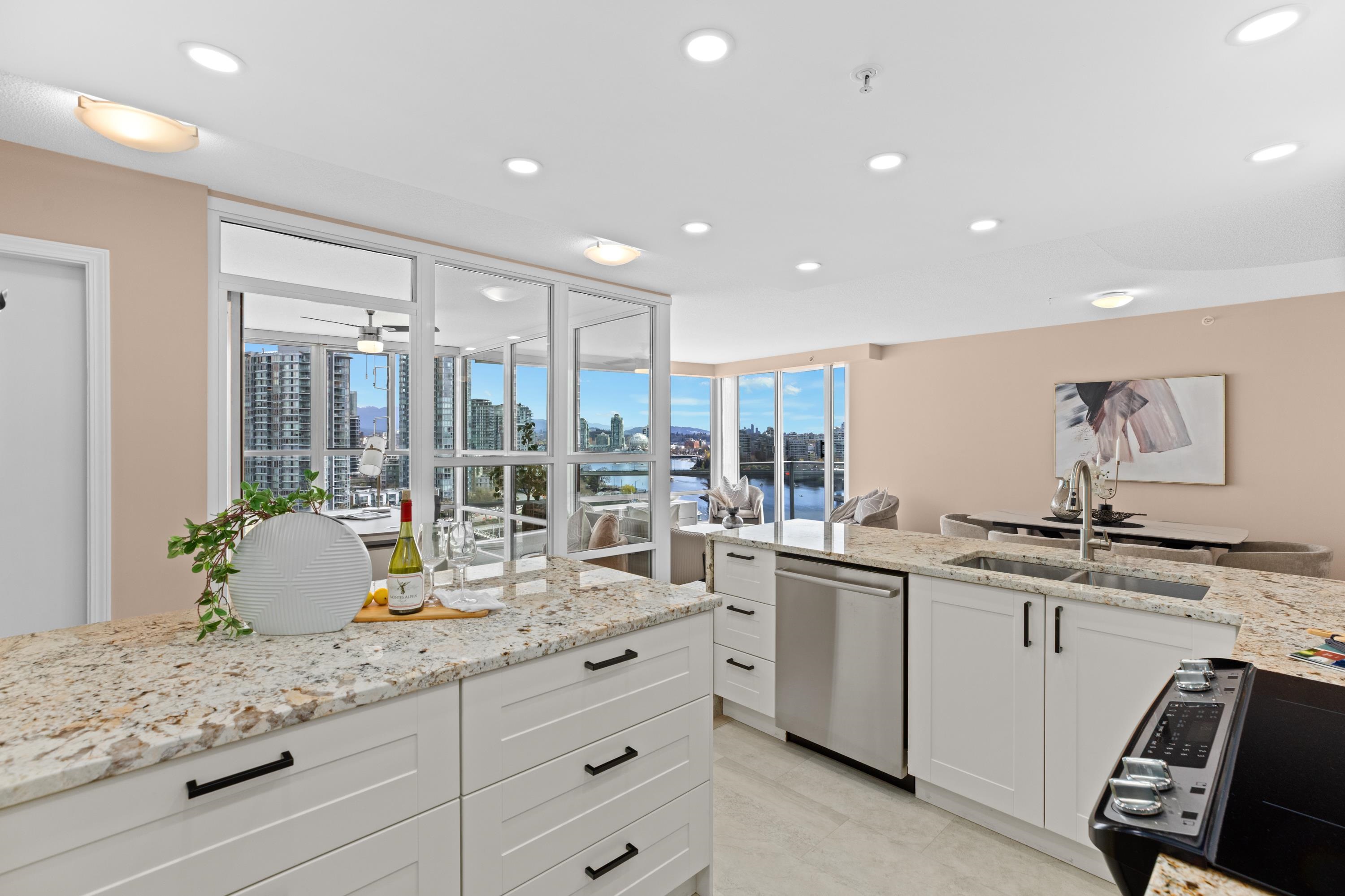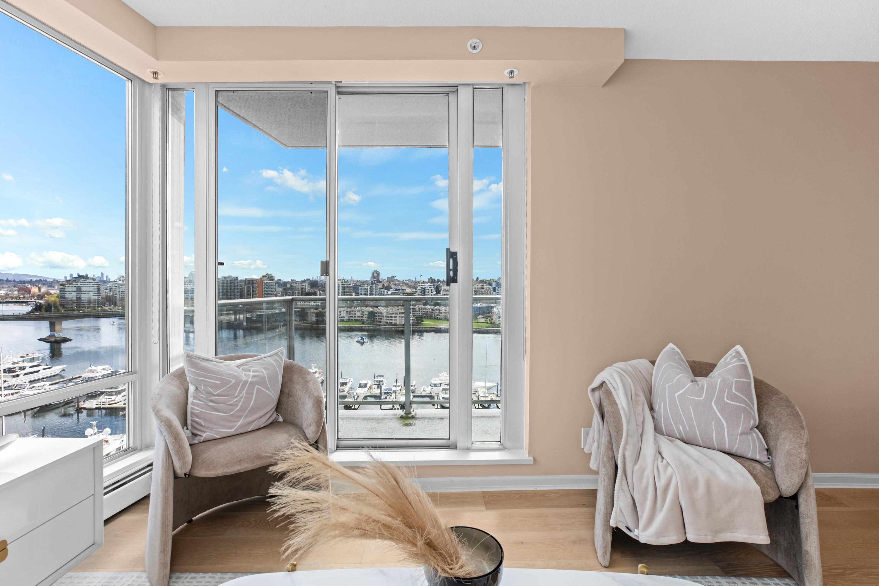 Welcome to 1601, a breathtaking waterfront residence in Yaletown's prestigious Crestmark II. This spacious 2-bedroom, 2-bathroom home features a versatile office/den/3rd bedroom. Imagine waking up to unobstructed panoramic views of False Creek, the beautiful marina, and the sparkling city skyline from your floor-to-ceiling windows. The bright, open-concept living and dining area is flooded with natural light, creating a serene yet vibrant ambiance. The gourmet kitchen has been tastefully renovated with mode...