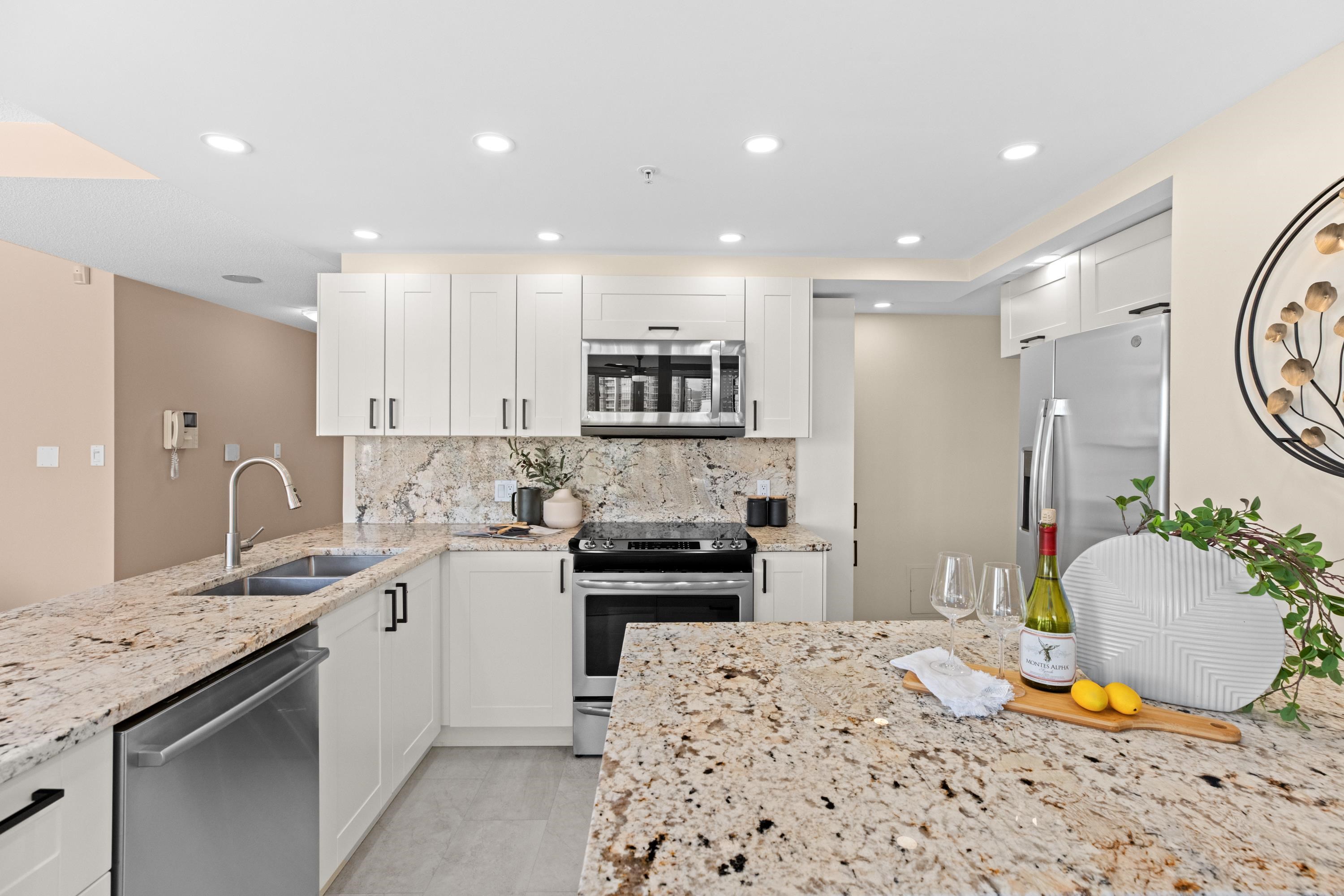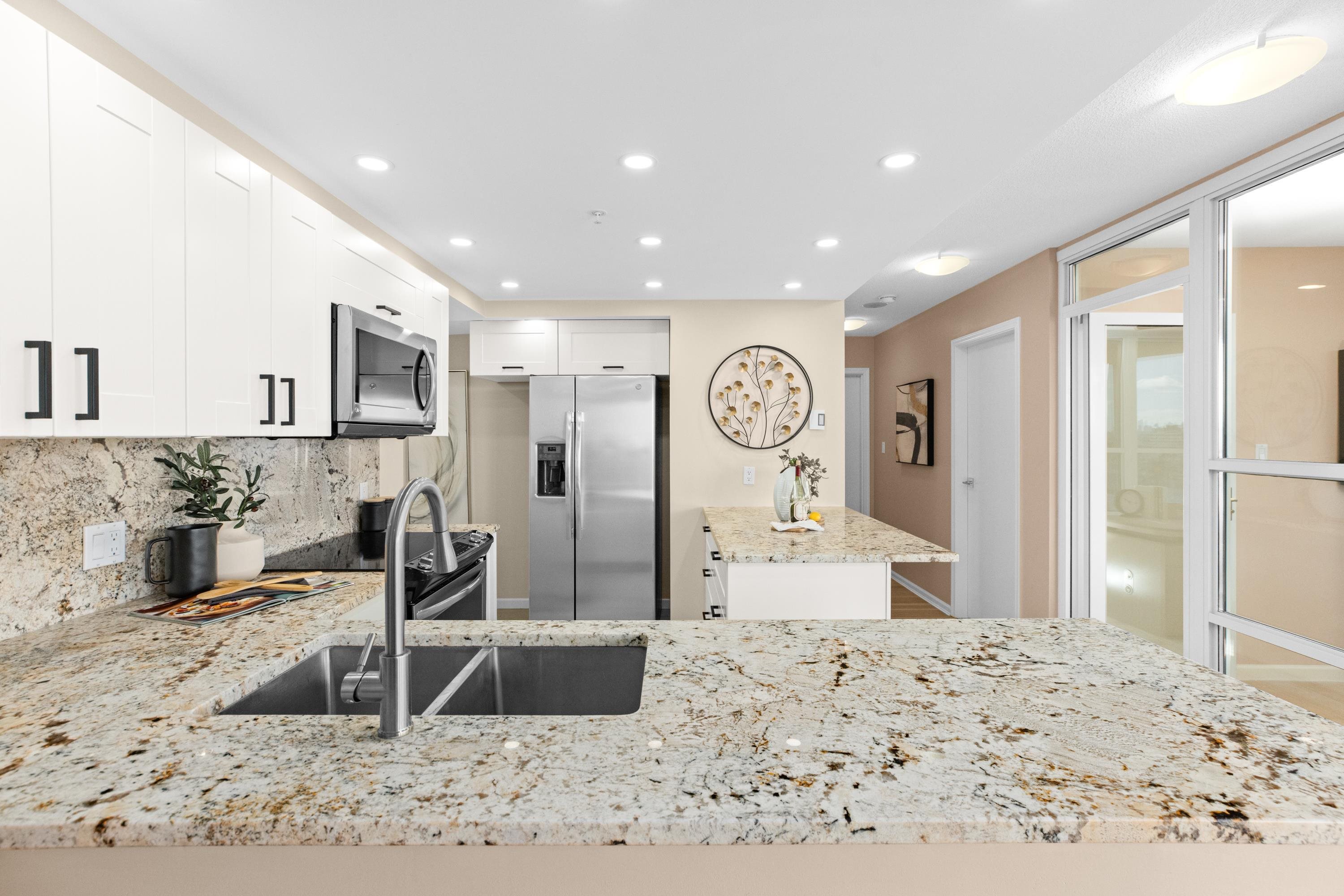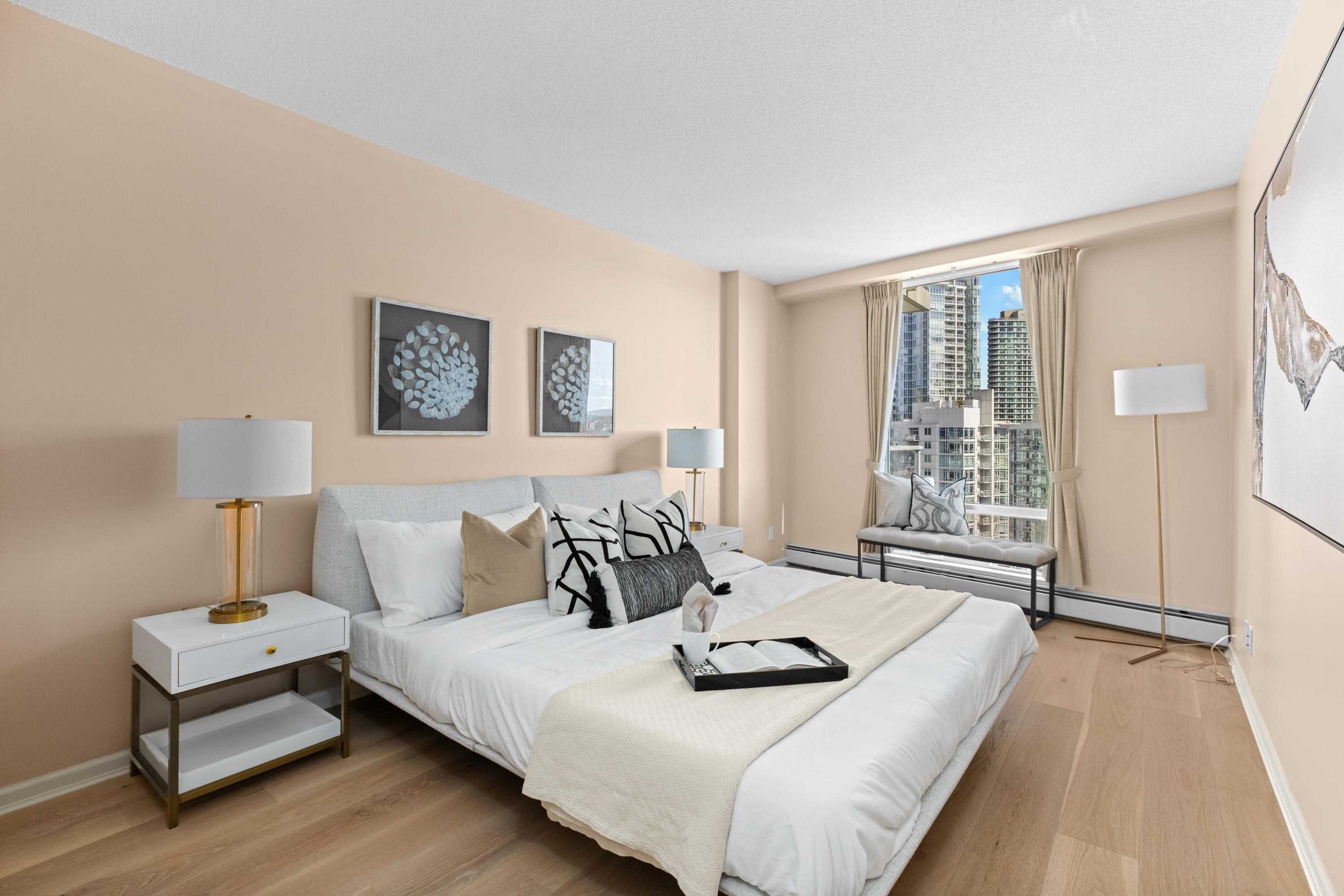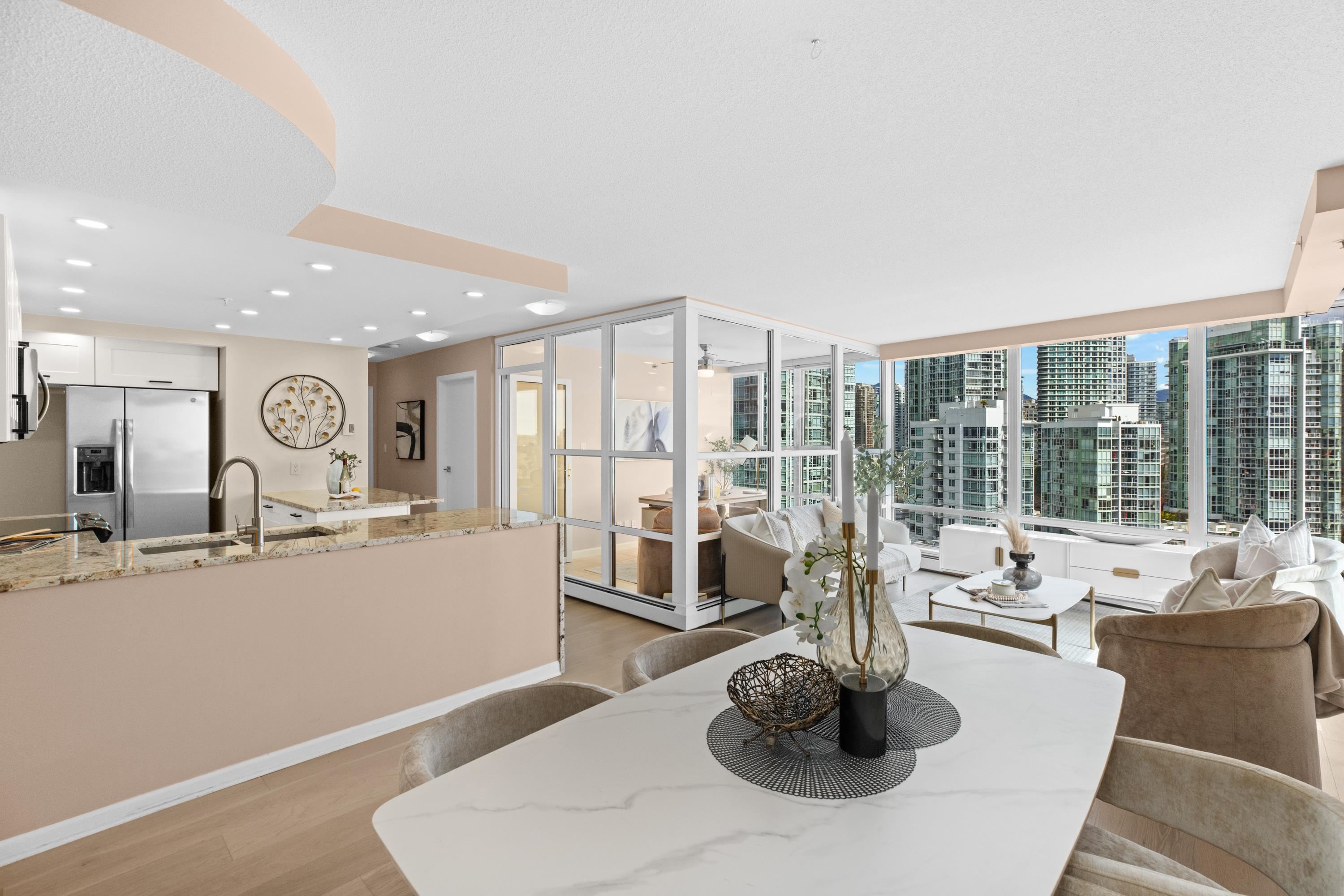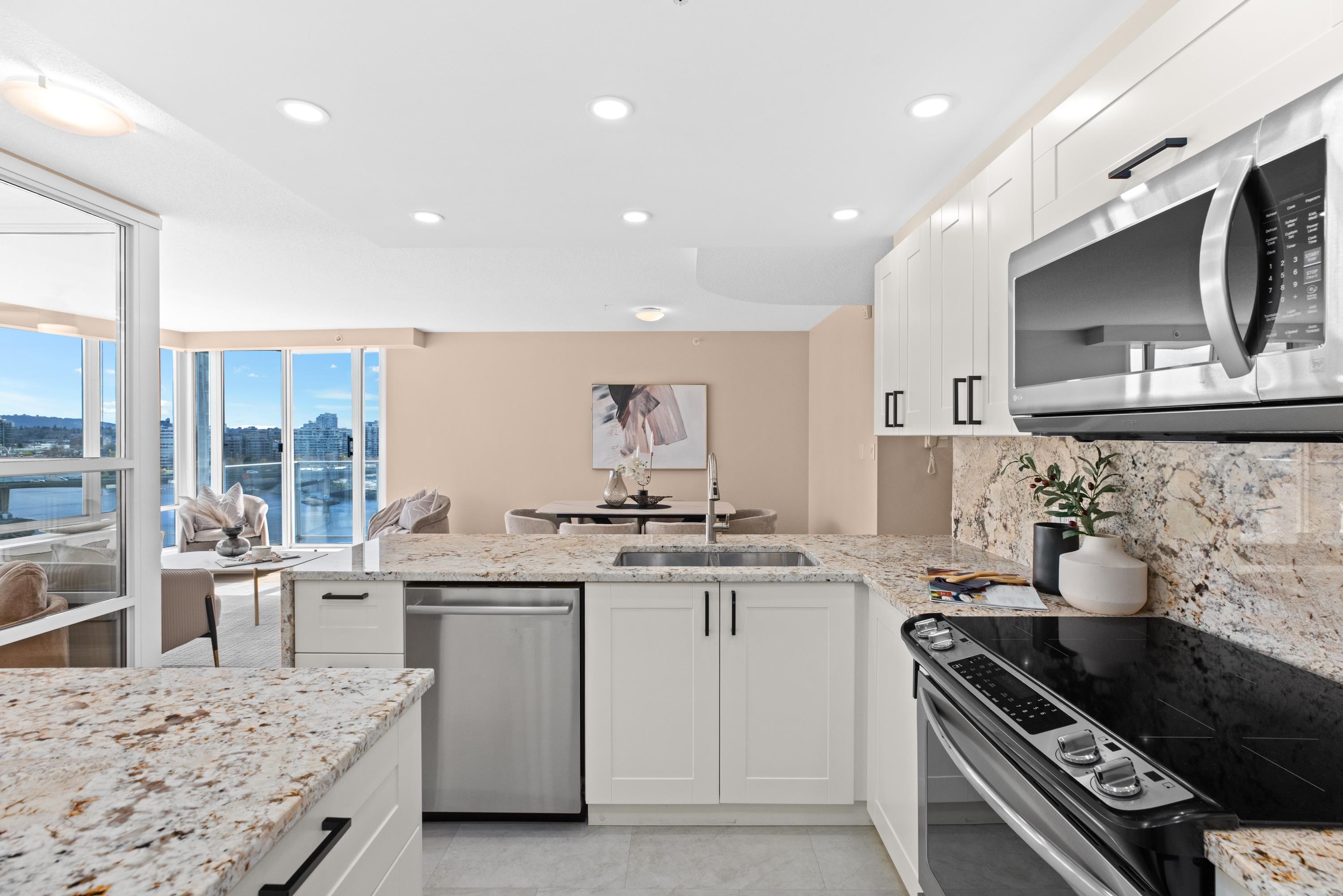 Welcome to 1601, a breathtaking waterfront residence in Yaletown's prestigious Crestmark II. This spacious 2-bedroom, 2-bathroom home features a versatile office/den/3rd bedroom. Imagine waking up to unobstructed panoramic views of False Creek, the beautiful marina, and the sparkling city skyline from your floor-to-ceiling windows. The bright, open-concept living and dining area is flooded with natural light, creating a serene yet vibrant ambiance. The gourmet kitchen has been tastefully renovated with mode...
