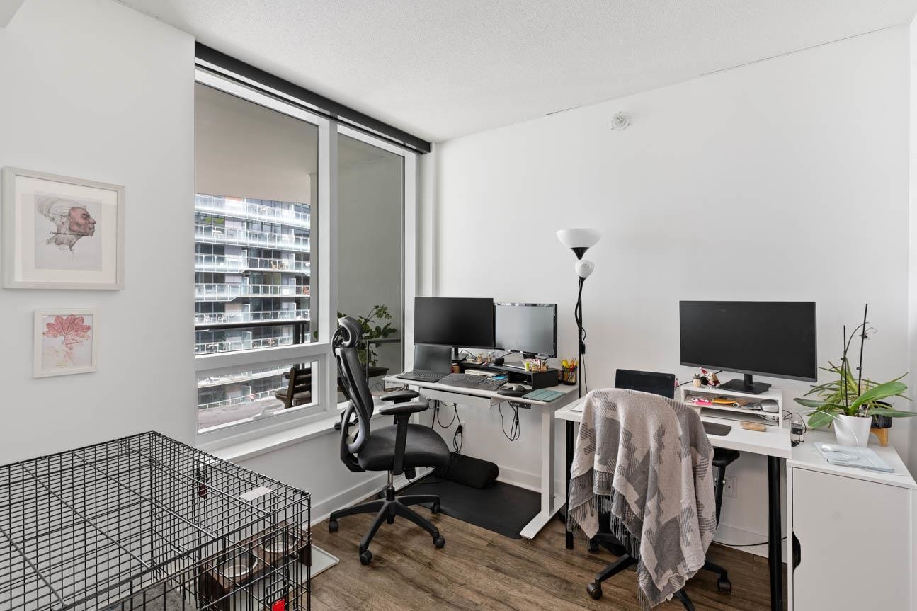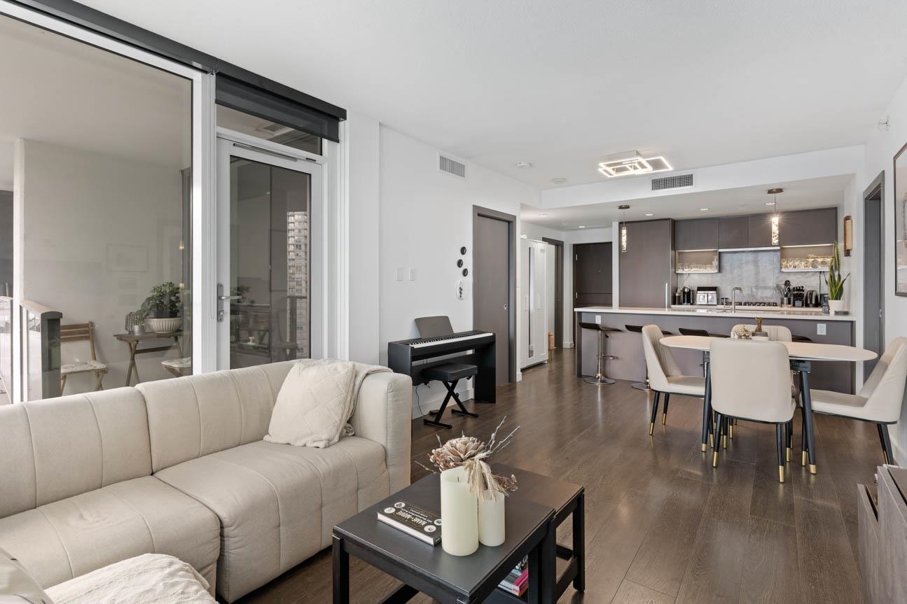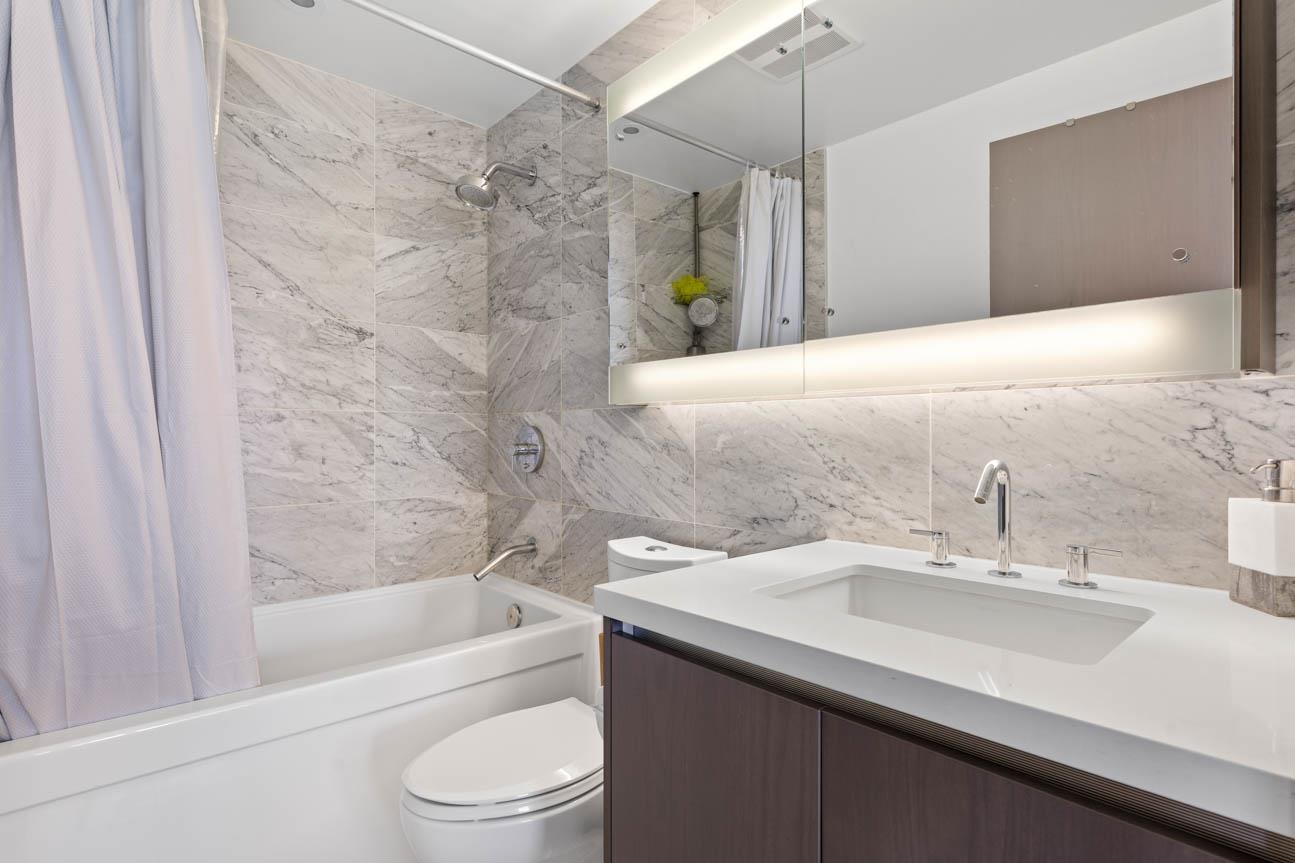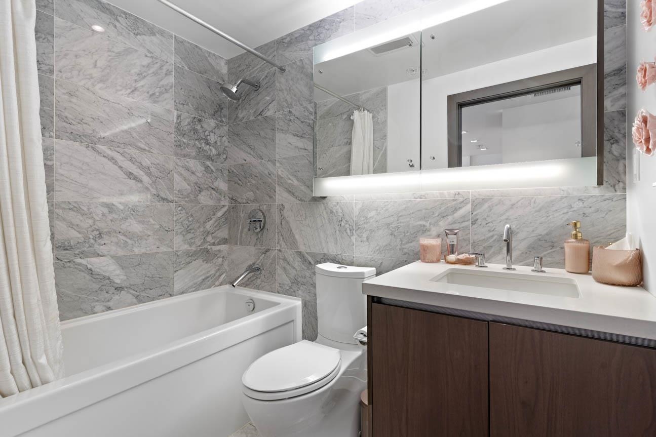 SHOWINGS BY APPT ONLY. Unfurnished 2 Bed, 2 Bath + Flex at One Pacific, 834 sq. ft. on the quiet side of the building with sweeping city and False Creek views framed through The Arc. Thoughtful layout with bdrms on opposite sides of the open living, dining and kitchen area. Features A/C, hardwood floors, gas range, integrated appliances, marble accents, Kohler fixtures and an 8-ft kitchen island . Oversized covered balcony for year-round use. Flex room for office or storage. Amenities include 24-hr concierg...