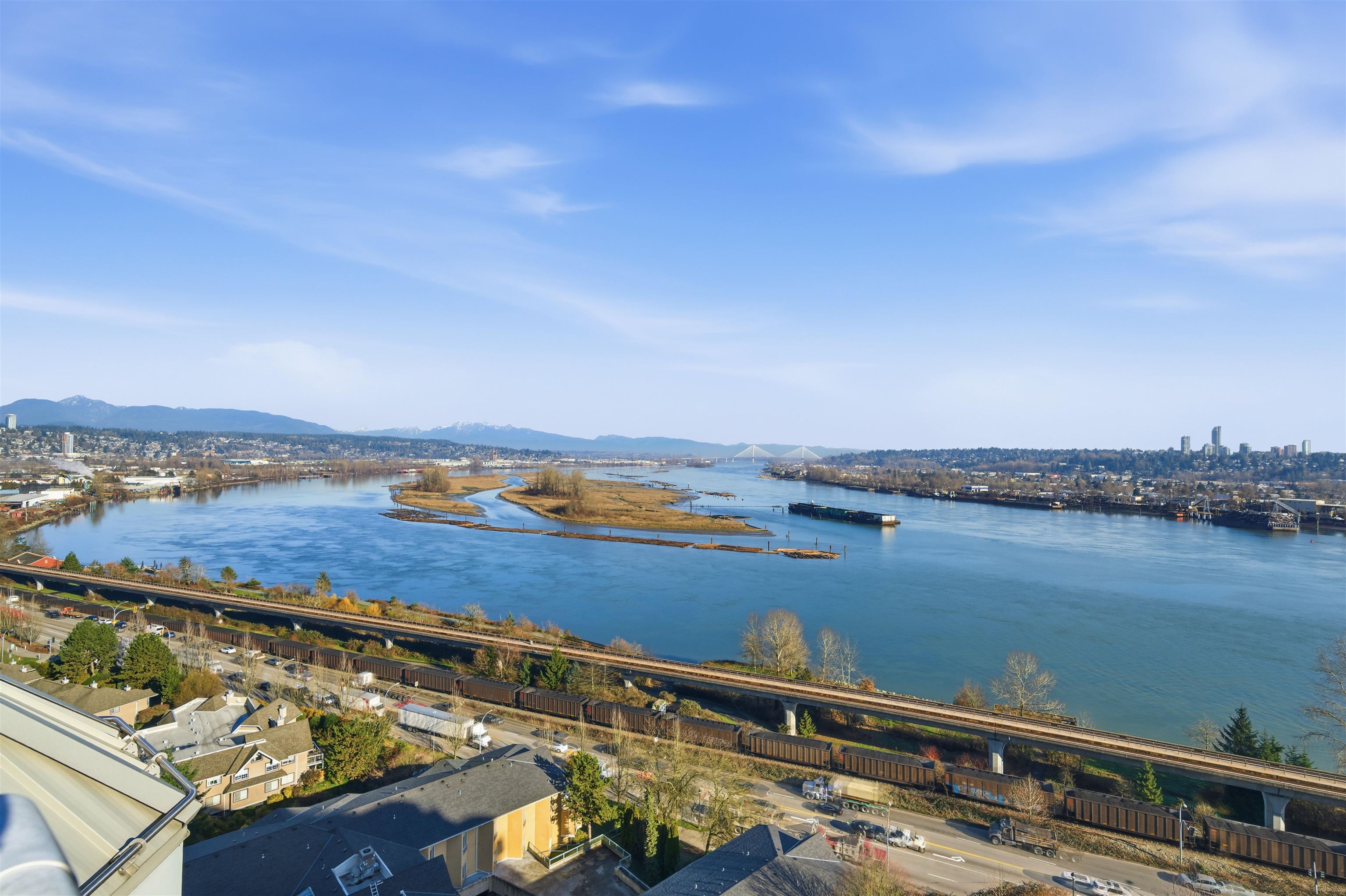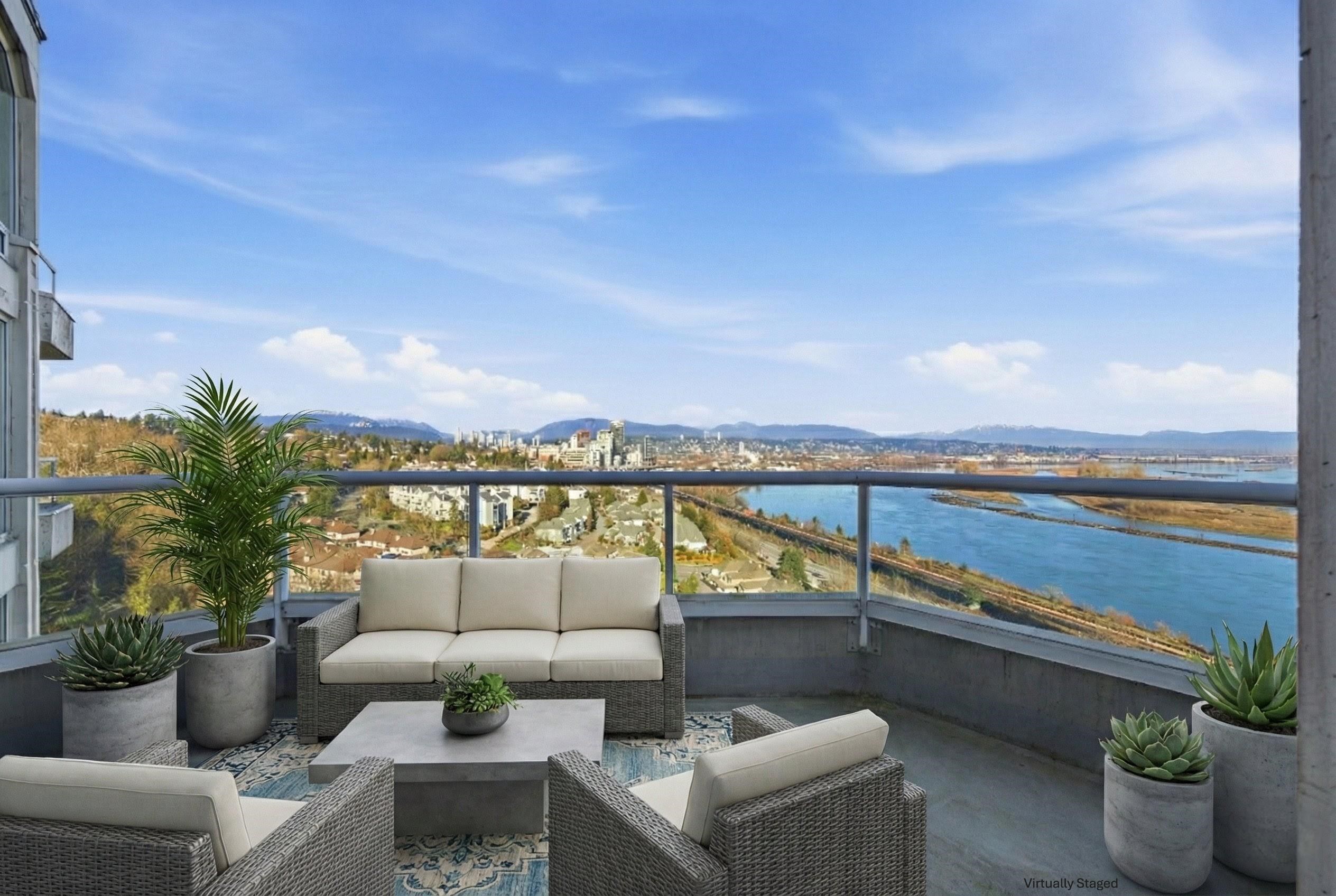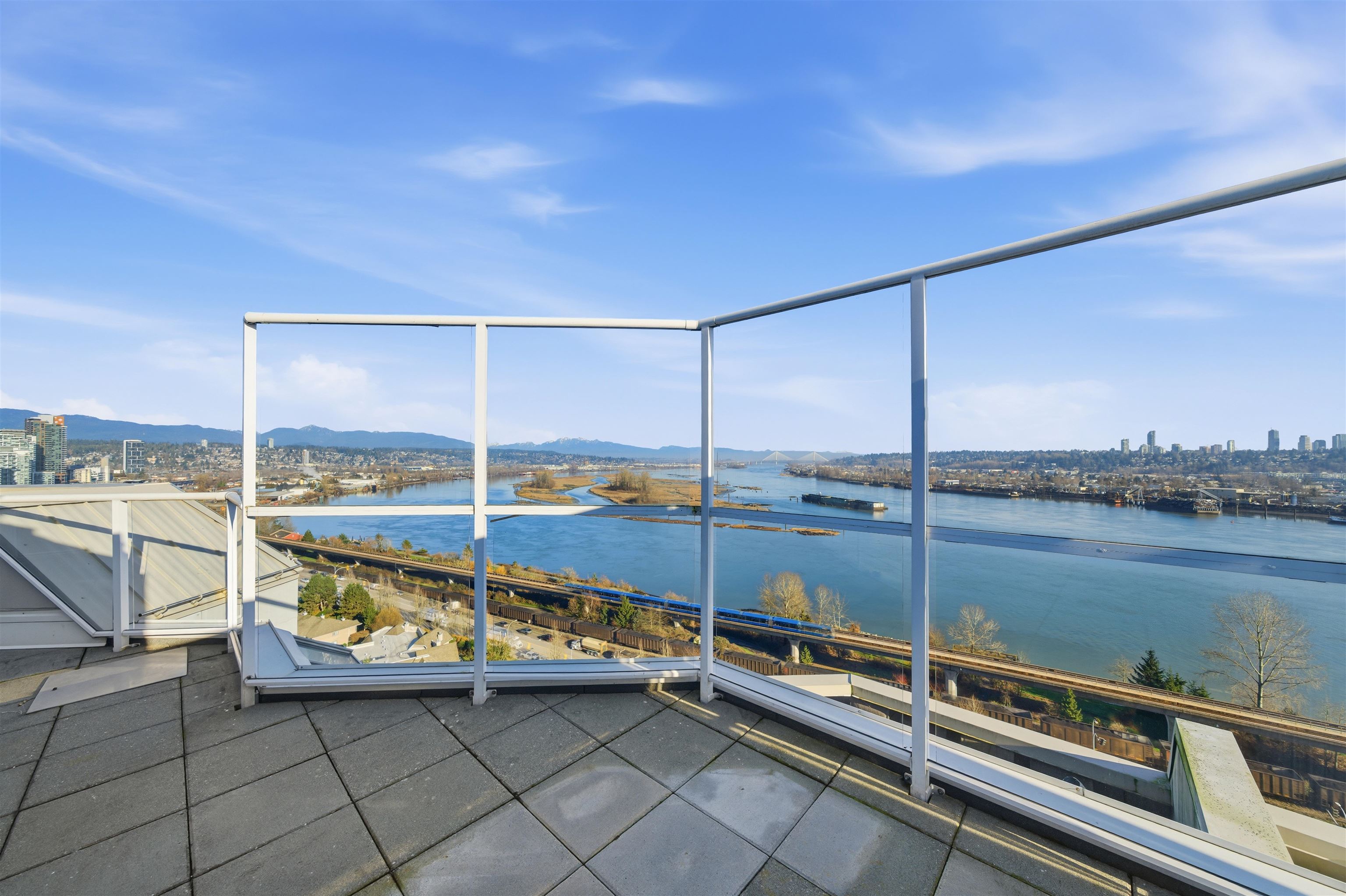 WOW! Rare SUBPENTHOUSE with jaw-dropping Fraser River & Mt Baker views! This Bright, Expansive 2,092 sq ft one-level home beams with natural light & is anchored by a cozy gas fireplace. Entertain in style with open kitchen & living spaces flowing to a massive 436 sq ft rooftop deck PLUS a secondary balcony. Excellent layout offers 3 bedrooms & 2.5 bathrooms, including TWO spacious suites with ensuites - ideal for families, guests or shared living. Pet & rental friendly in a quality concrete building with a ...