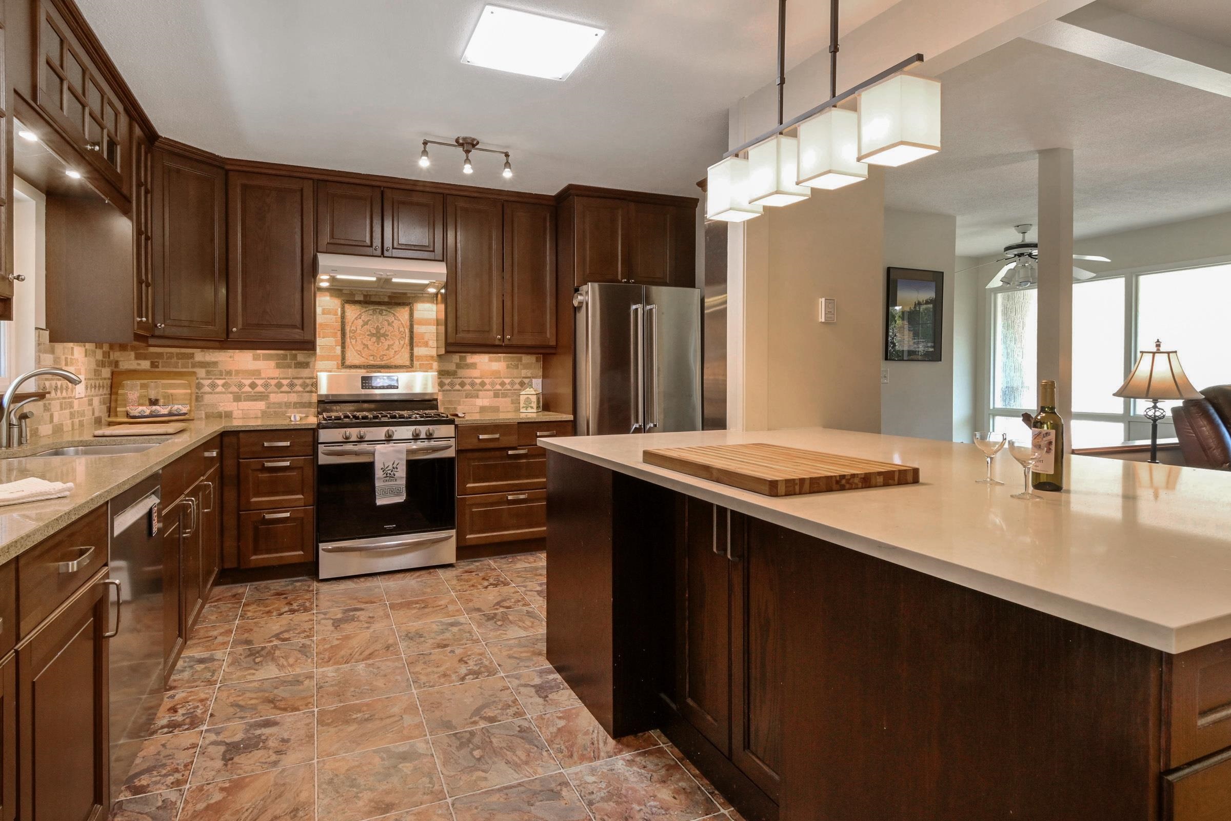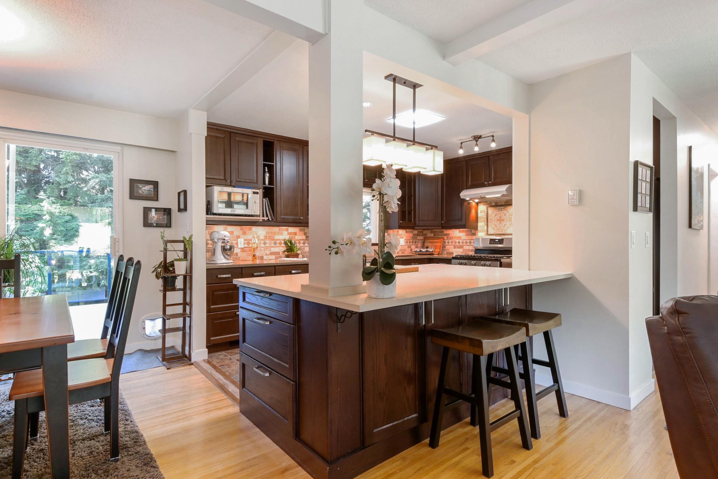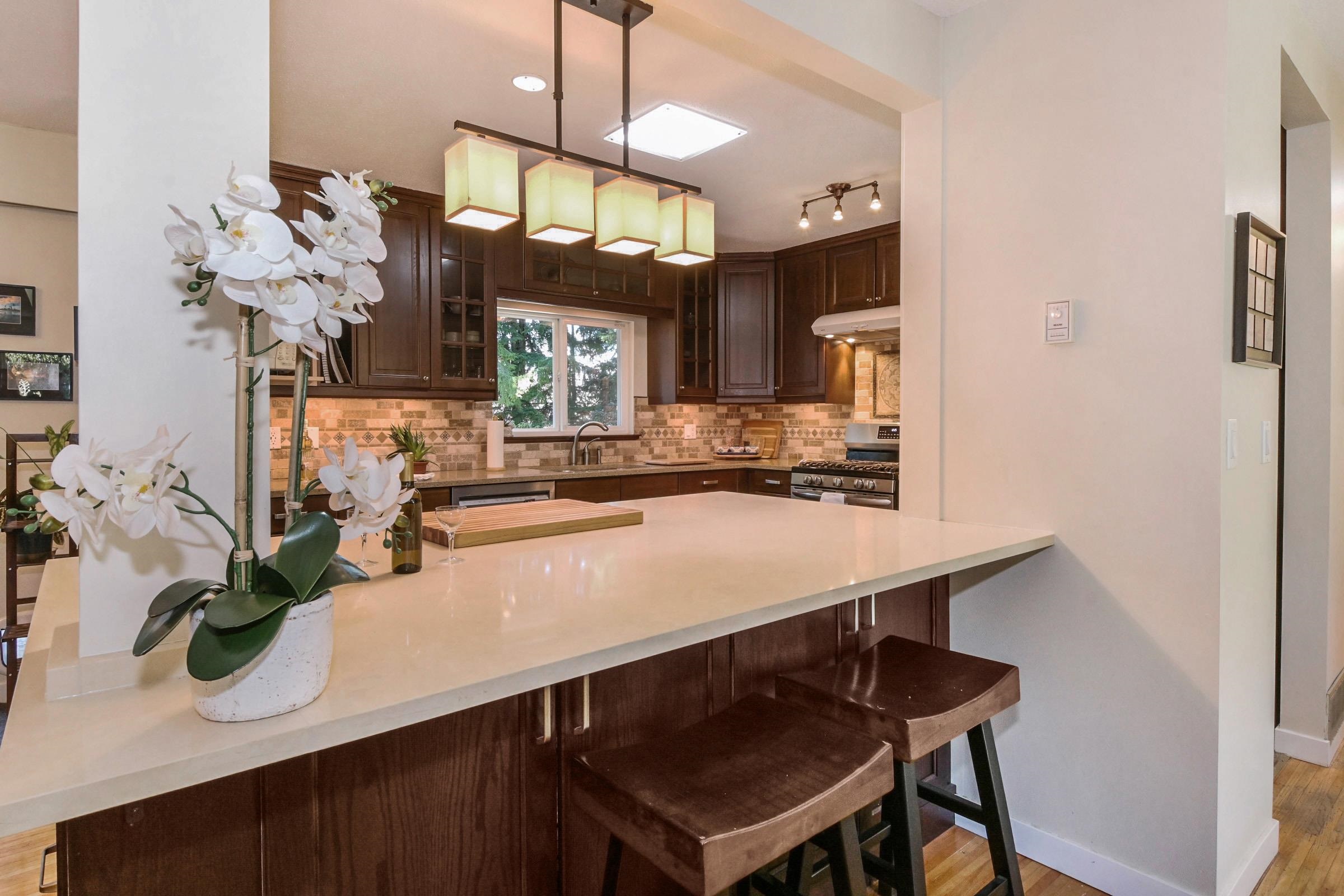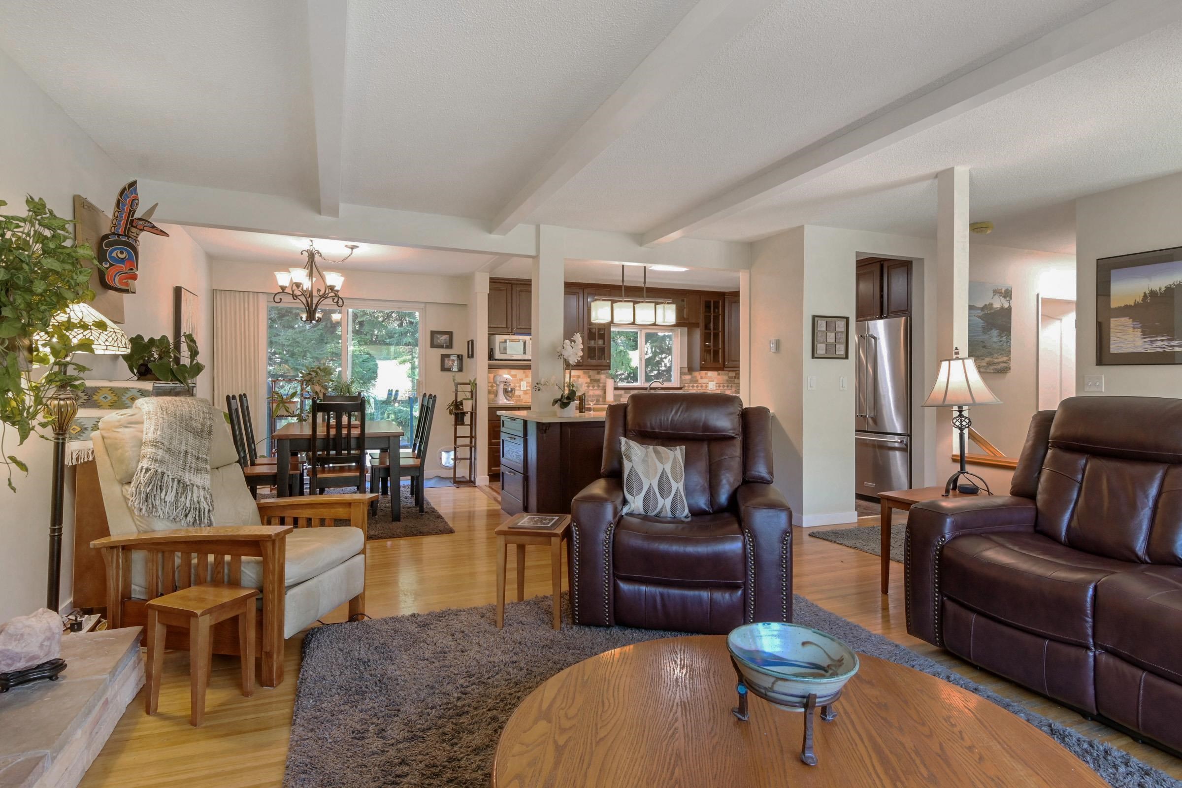 Meticulously maintained, exquisitely renovated Ocean Park charmer! Entertainer's will love this open plan w/picture windows, gas FP, parquet & hdwd flrs. Kitchen reno w/custom cabinetry, Sile Stone Quartz C/T's. Kitch Island w/bar seats 2016. Master bdrm addition w/walk-in closet & ensuite w/radiant heat, Rain shower, & Quartz counters. All baths fully reno'd 2016, Solatube lighting & laundry up added 2018. Huge 2 bdrm & den garden suite w/separate level entry. New windows 2006, Rheem High Eff furnace 2023....