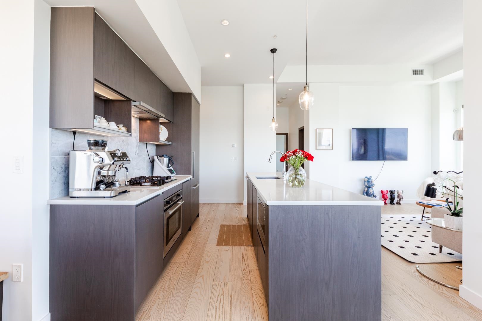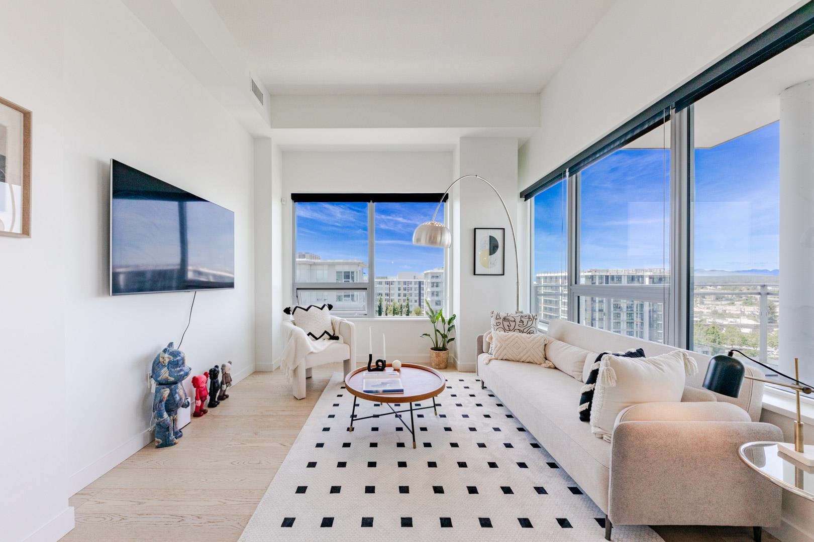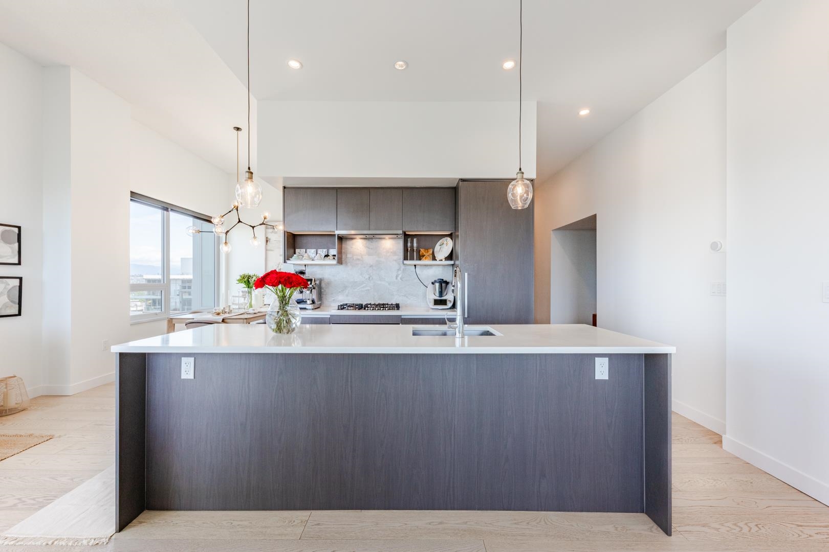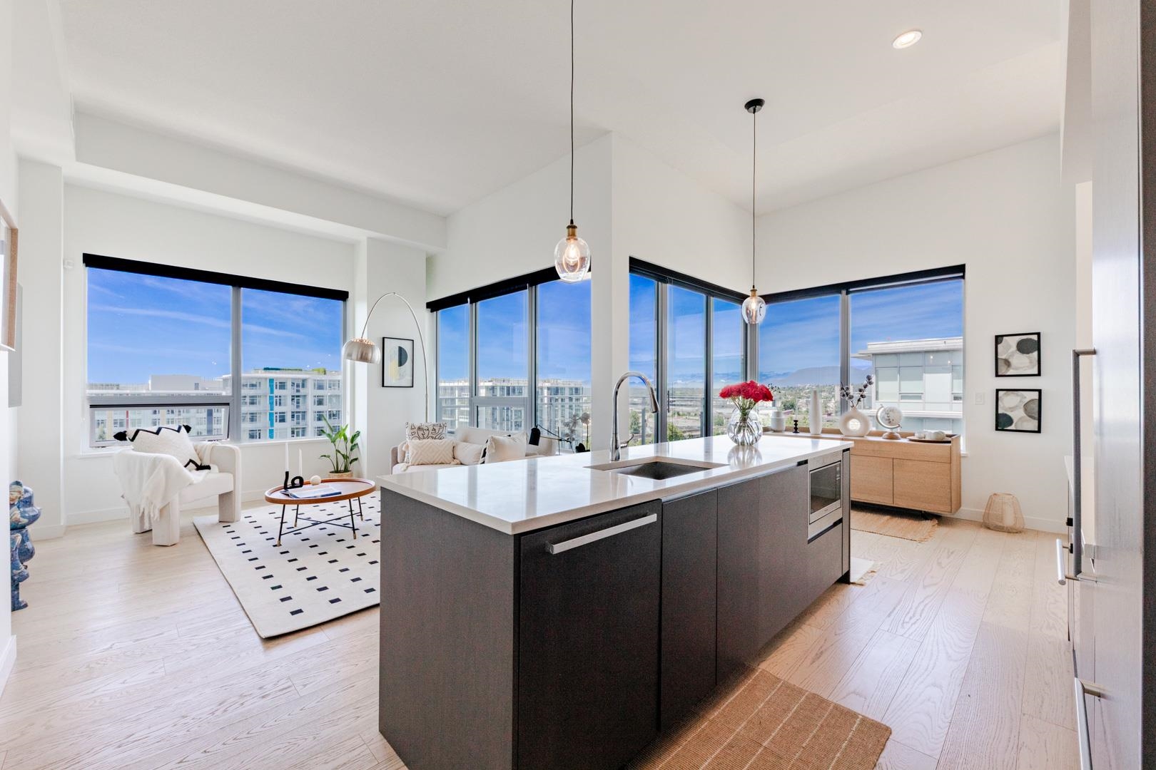 Welcome to Concord Gardens Central Estates Penthouse. Rare NW-facing 3-bedroom + den corner penthouse with dual ensuite layout and soaring 11'4" ceilings. Bright and spacious with panoramic city and mountain views. Features include central A/C and heating, quartz countertops, engineered hardwood floors, integrated stainless steel appliances, and 2 parking stalls with EV chargers. The primary bedroom connects to a private balcony with stunning views. Walking distance to Capstan SkyTrain Station and Yachan Ce...