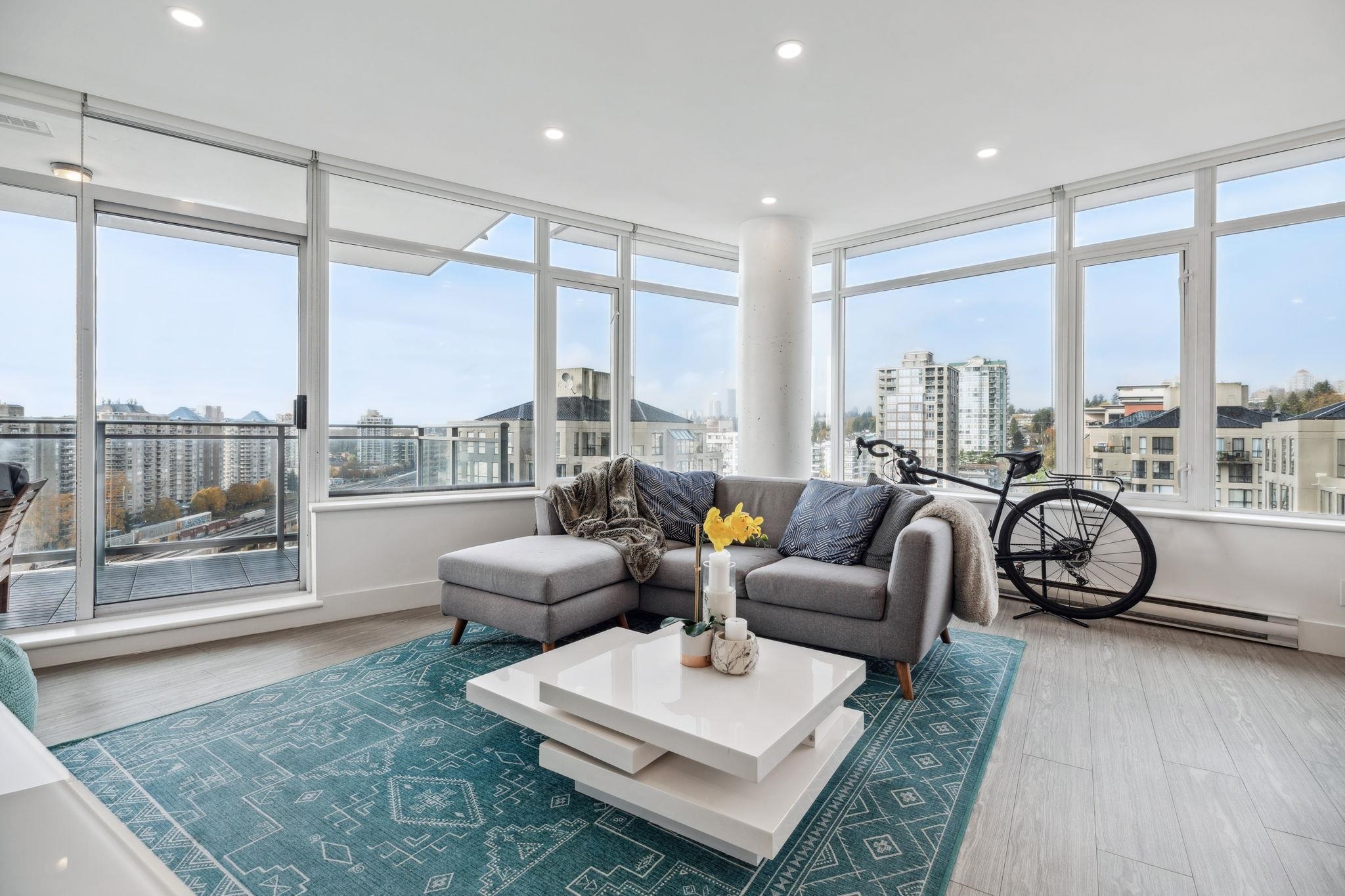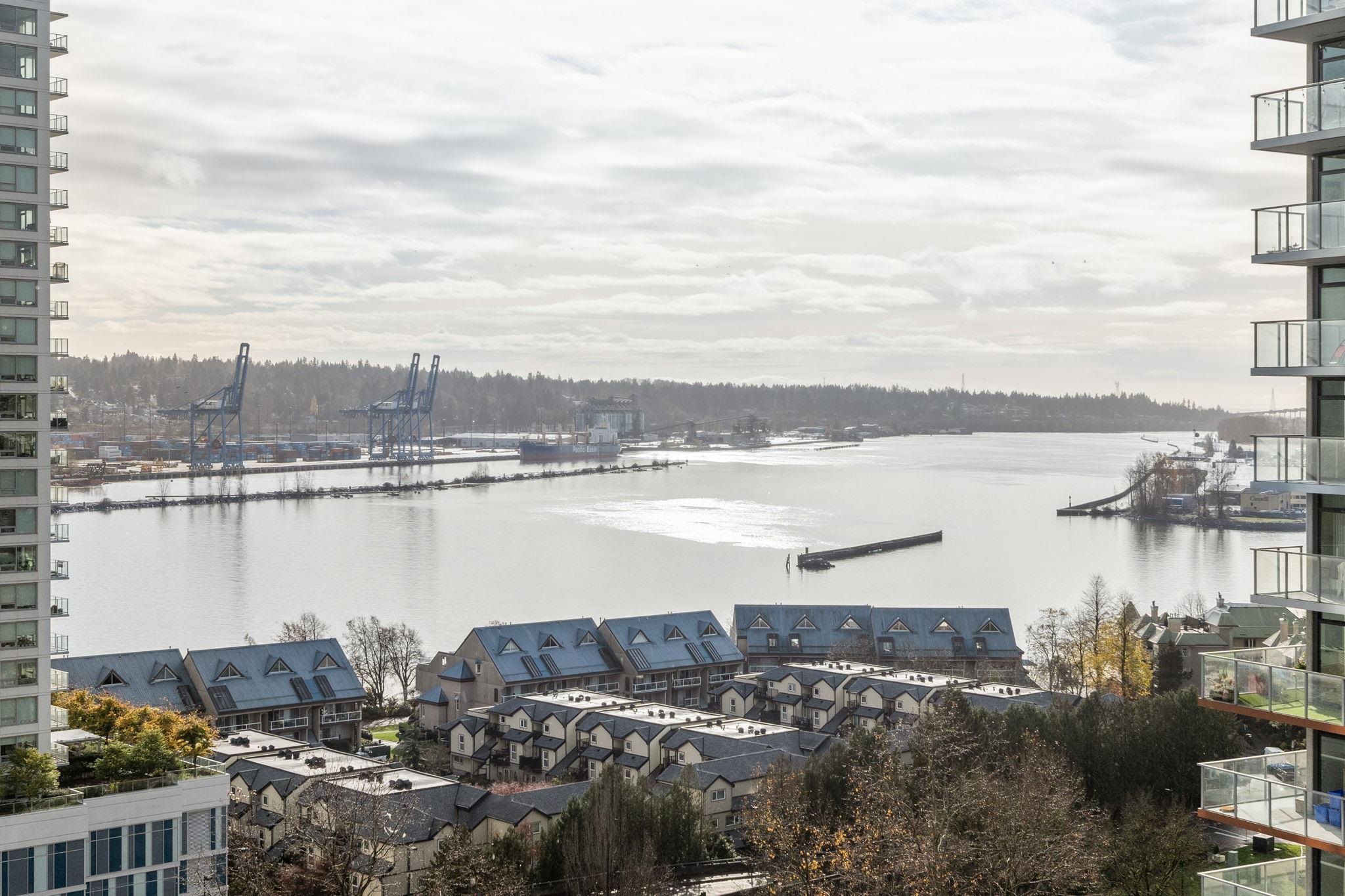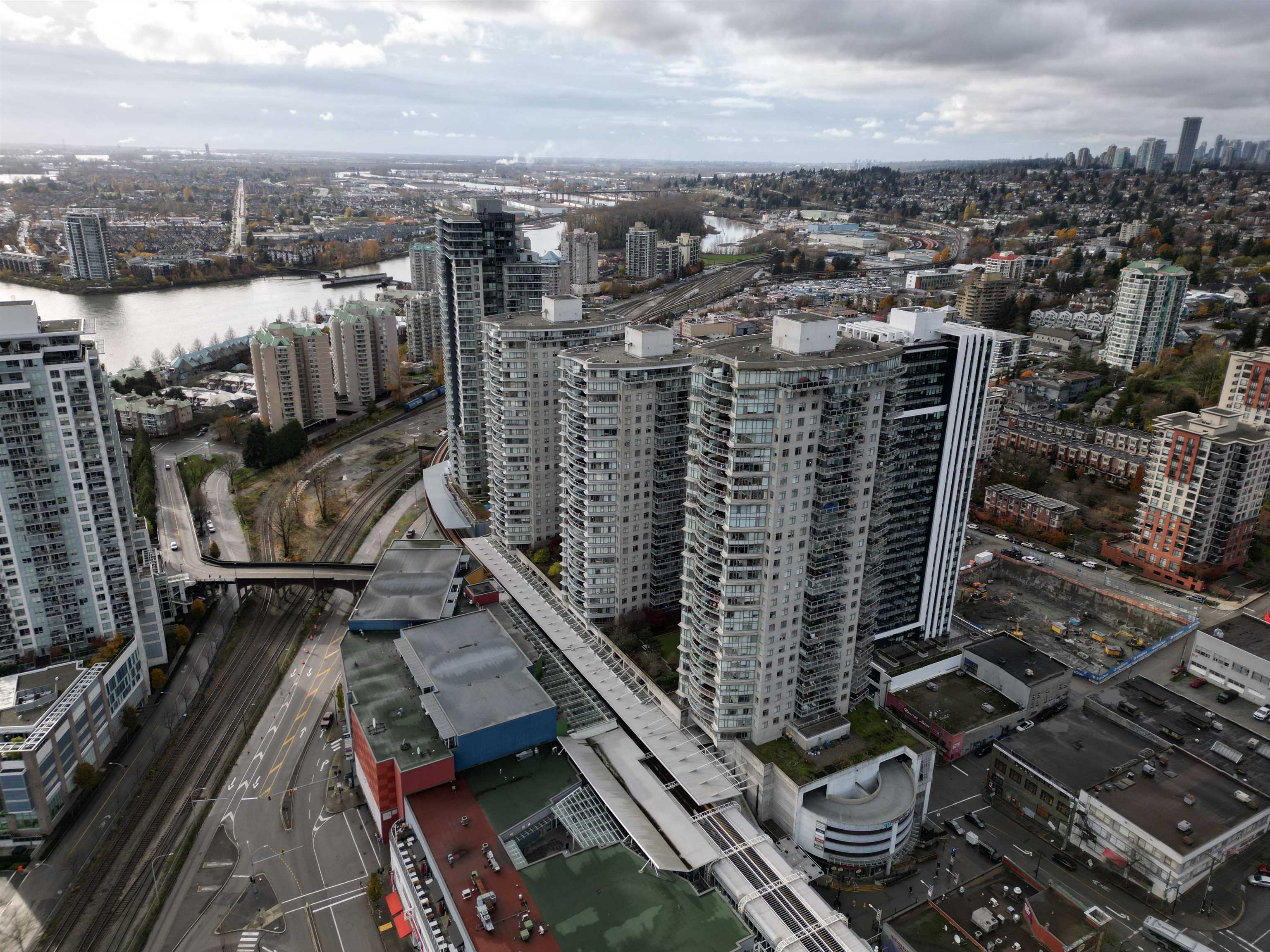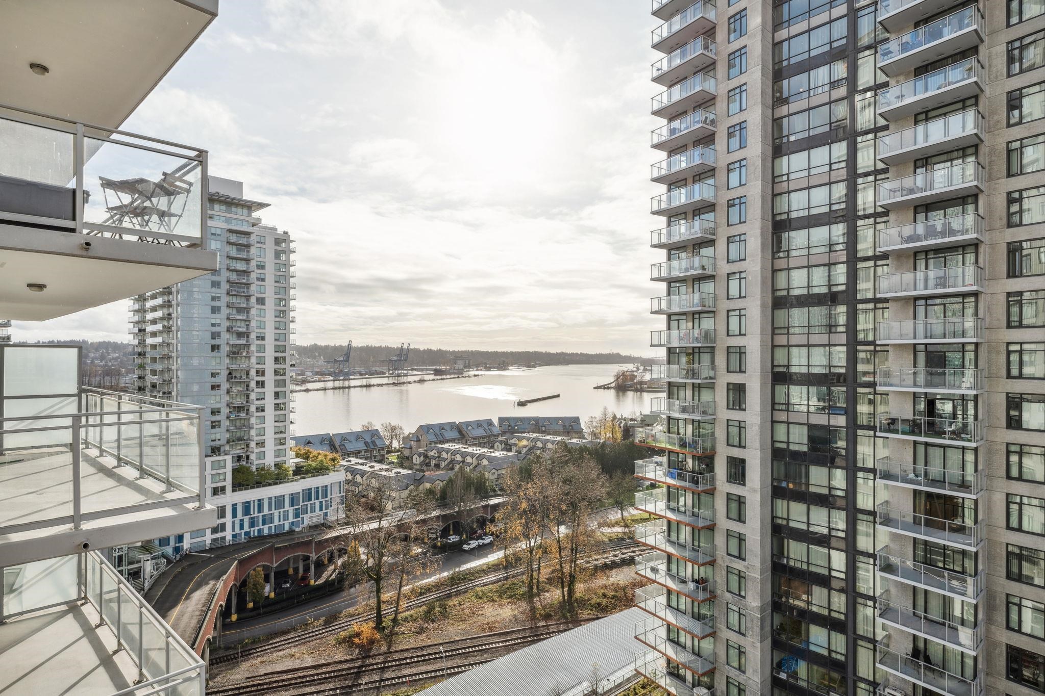 Custom floor-plan + high-end reno. Located directly above (facing away & on quiet side!) New West SkyTrain, this stunning corner suite has been fully redesigned w/ high-end reno by the current owner. No detail was missed- dropped ceilings w/ flush-mount lighting, a reimagined kitchen (rebuilt from studs), premium flooring, top-tier appliances, modern fixtures & stylish window treatments. Expansive windows flood the open-concept space w/ natural light, showcasing breathtaking river/city views. Features 2 ful...