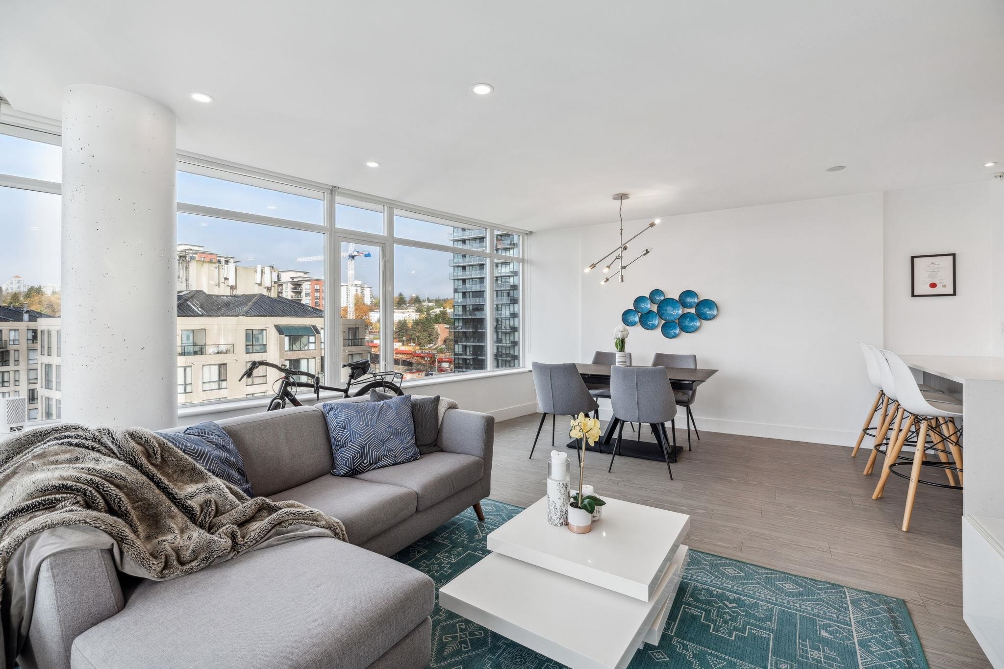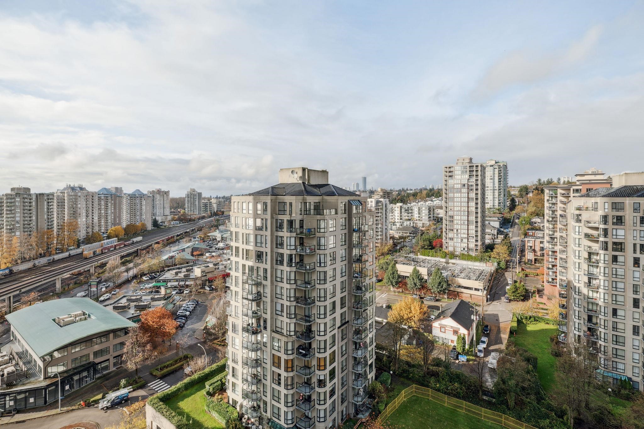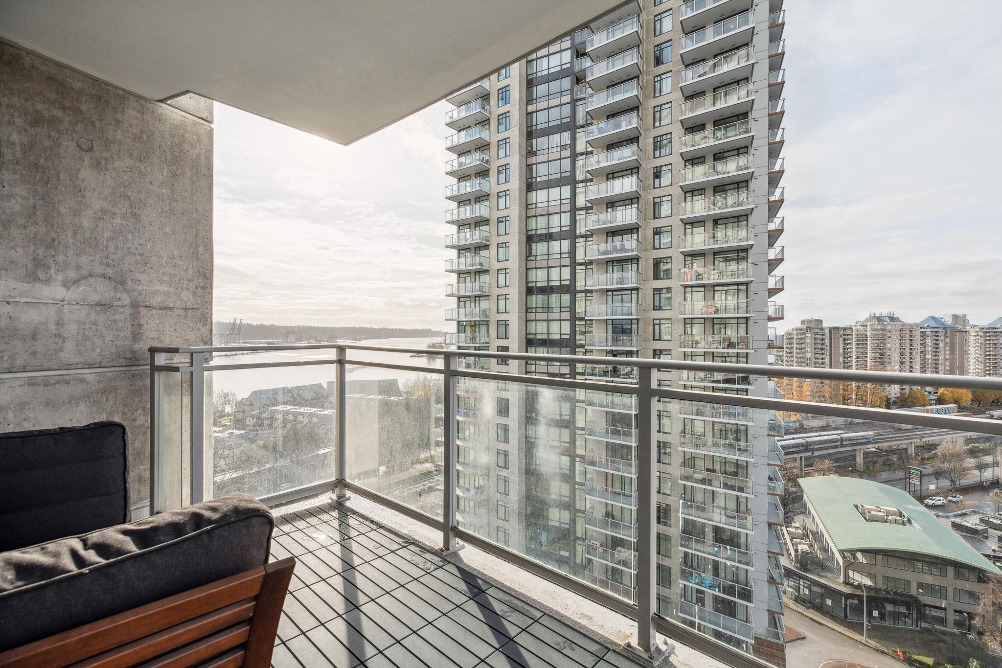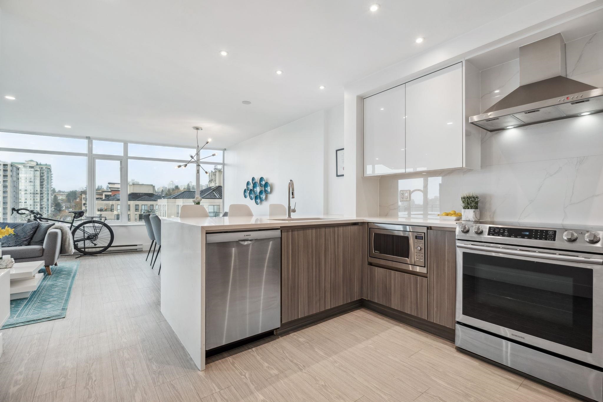 Custom floor-plan + high-end reno. Located directly above (facing away & on quiet side!) New West SkyTrain, this stunning corner suite has been fully redesigned w/ high-end reno by the current owner. No detail was missed- dropped ceilings w/ flush-mount lighting, a reimagined kitchen (rebuilt from studs), premium flooring, top-tier appliances, modern fixtures & stylish window treatments. Expansive windows flood the open-concept space w/ natural light, showcasing breathtaking river/city views. Features 2 ful...