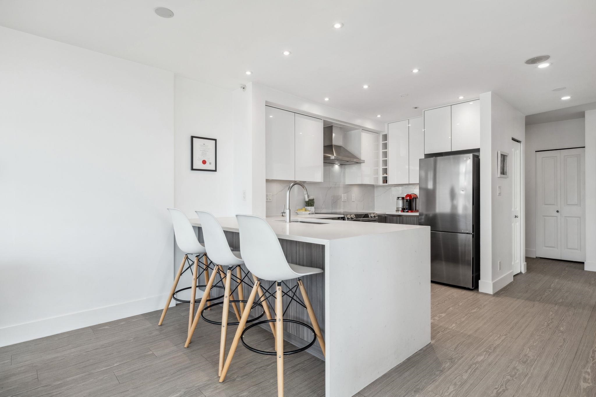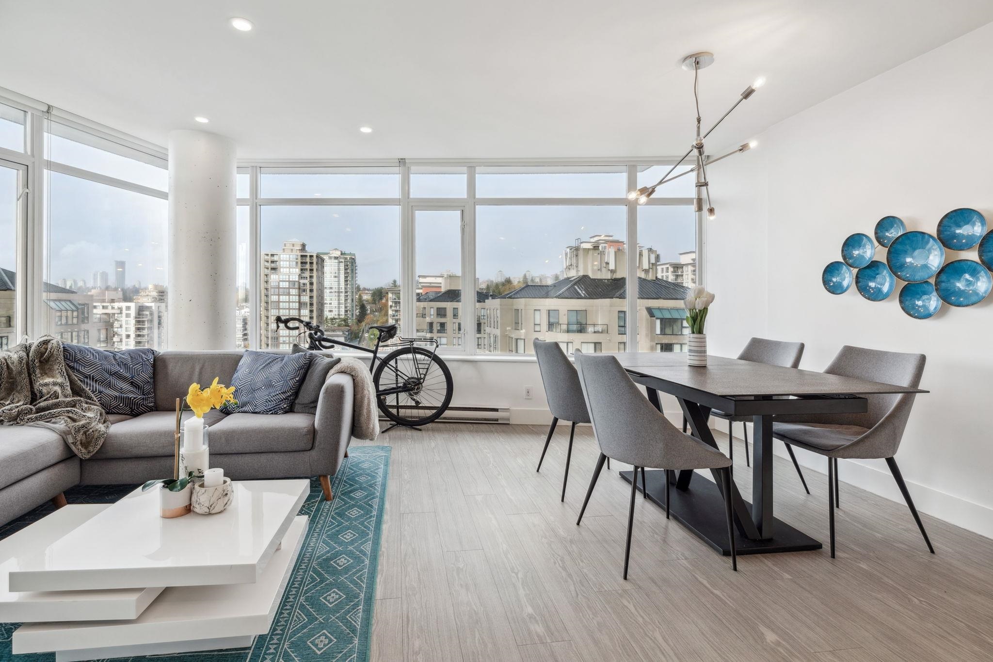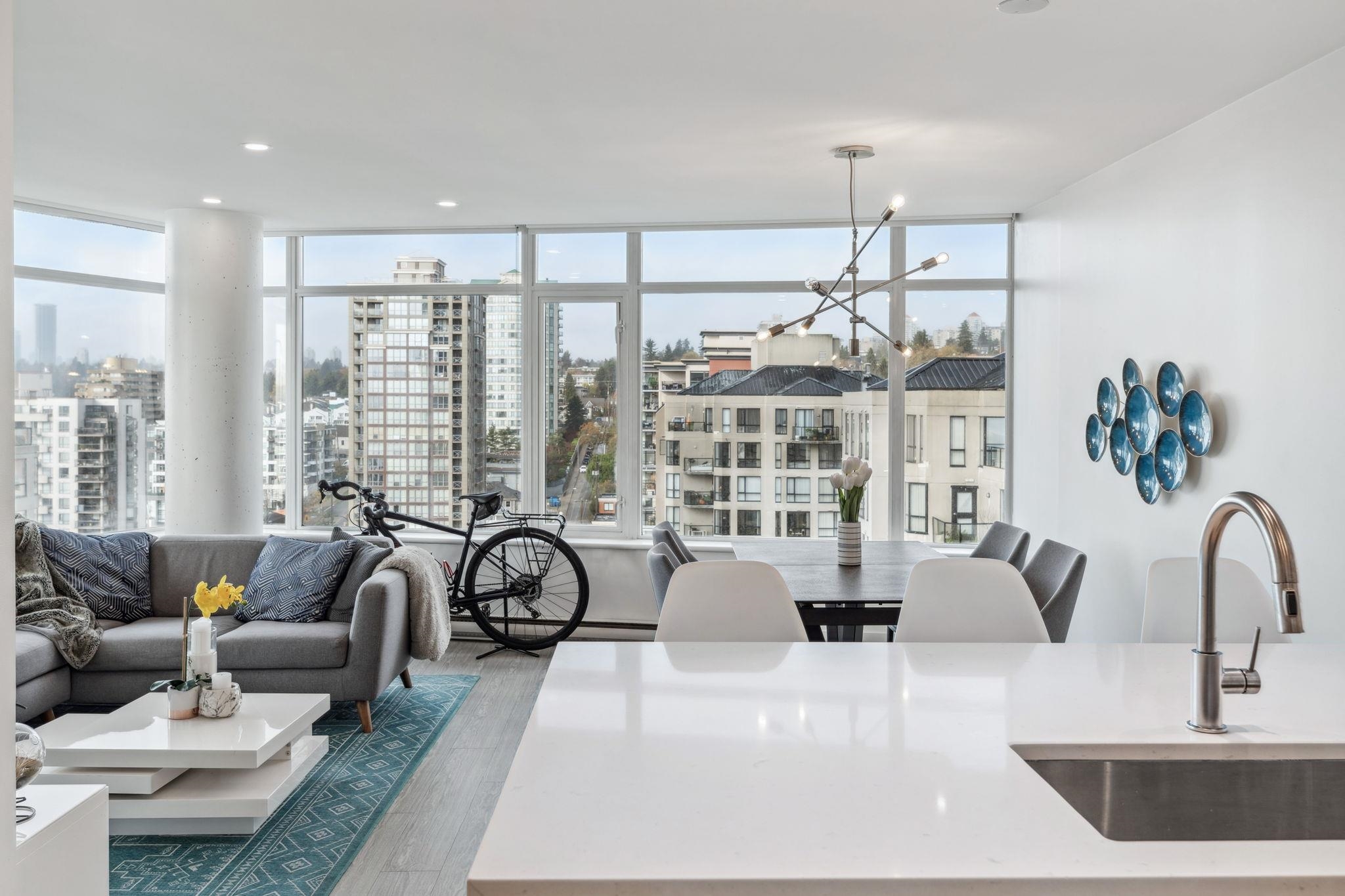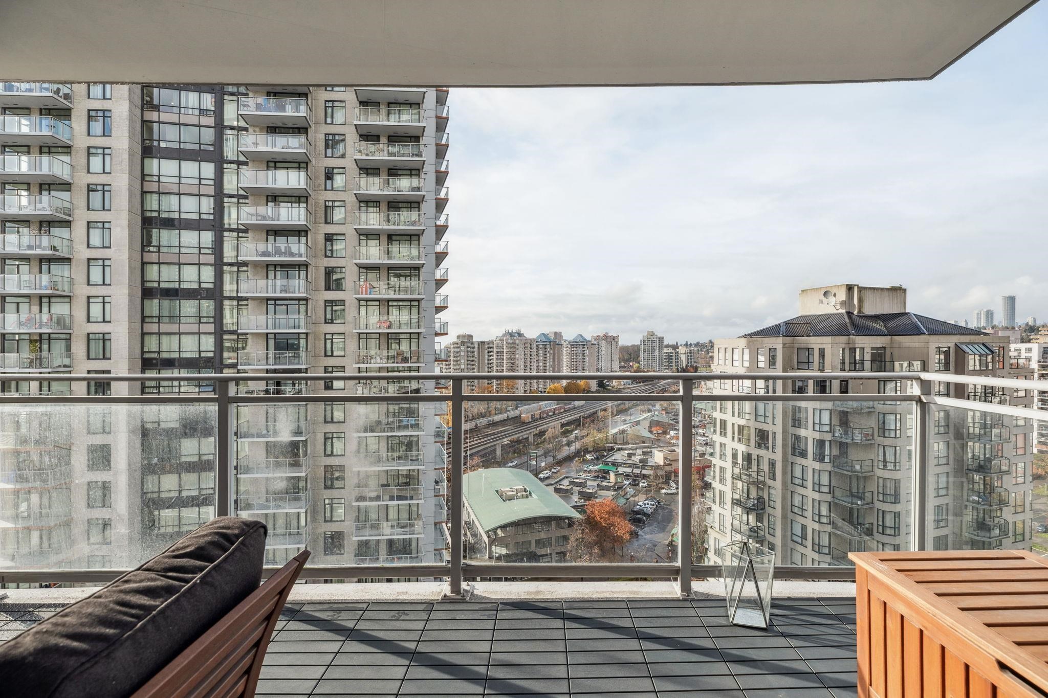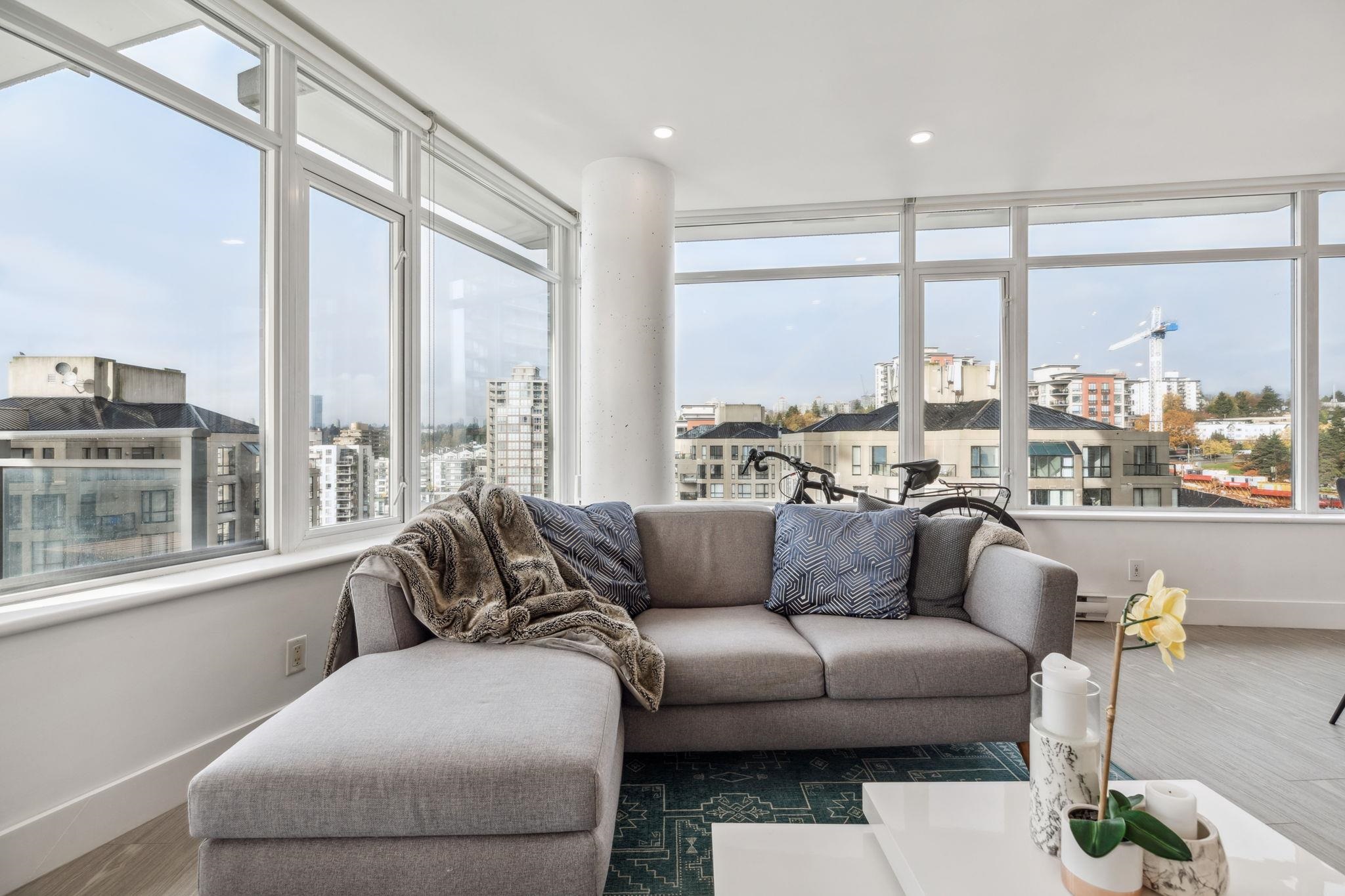 Custom floor-plan + high-end reno. Located directly above (facing away & on quiet side!) New West SkyTrain, this stunning corner suite has been fully redesigned w/ high-end reno by the current owner. No detail was missed- dropped ceilings w/ flush-mount lighting, a reimagined kitchen (rebuilt from studs), premium flooring, top-tier appliances, modern fixtures & stylish window treatments. Expansive windows flood the open-concept space w/ natural light, showcasing breathtaking river/city views. Features 2 ful...