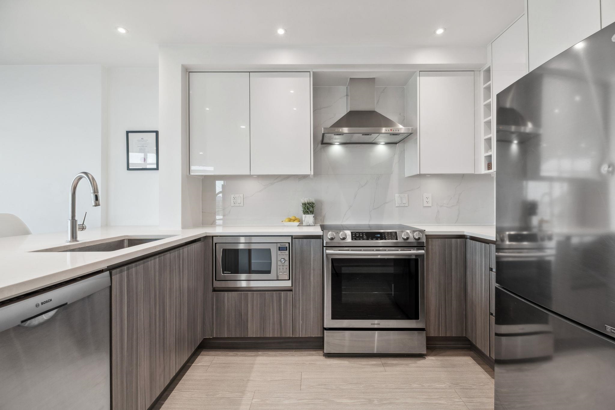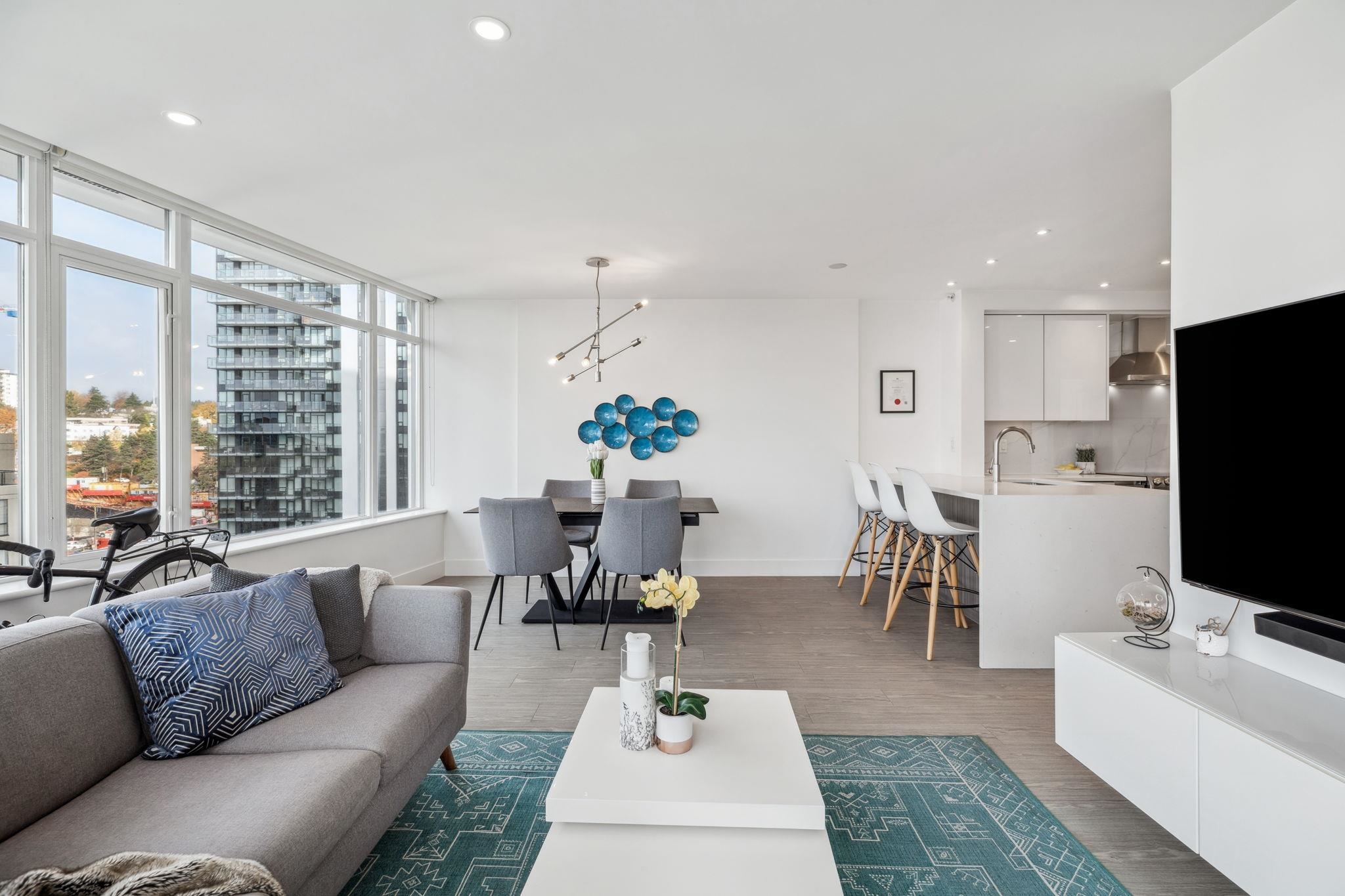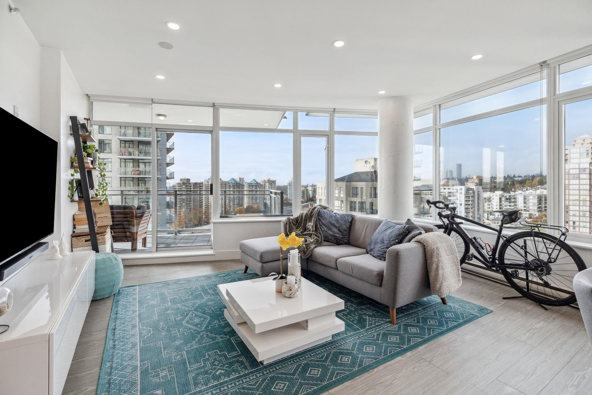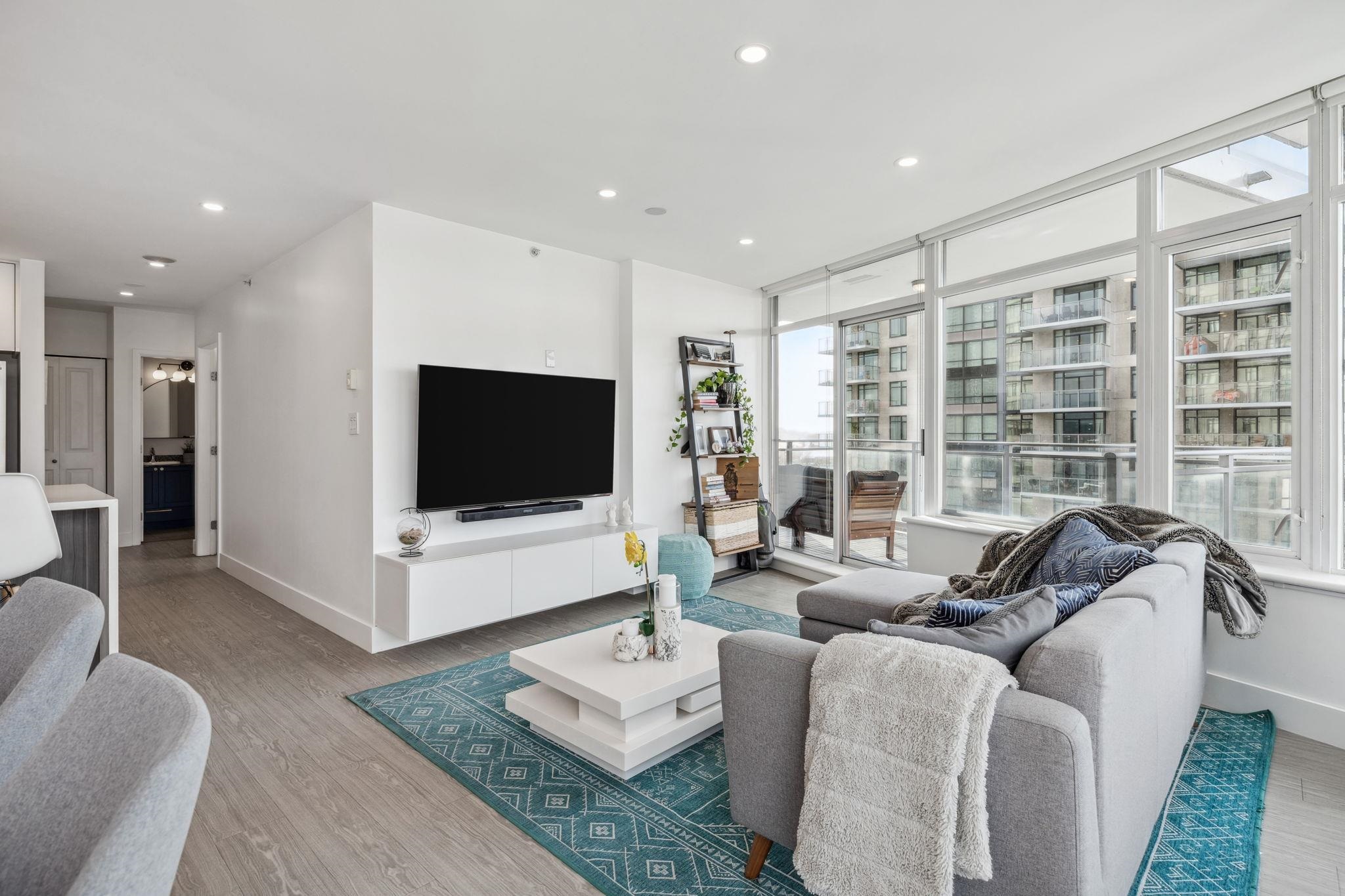 Custom floor-plan + high-end reno. Located directly above (facing away & on quiet side!) New West SkyTrain, this stunning corner suite has been fully redesigned w/ high-end reno by the current owner. No detail was missed- dropped ceilings w/ flush-mount lighting, a reimagined kitchen (rebuilt from studs), premium flooring, top-tier appliances, modern fixtures & stylish window treatments. Expansive windows flood the open-concept space w/ natural light, showcasing breathtaking river/city views. Features 2 ful...
