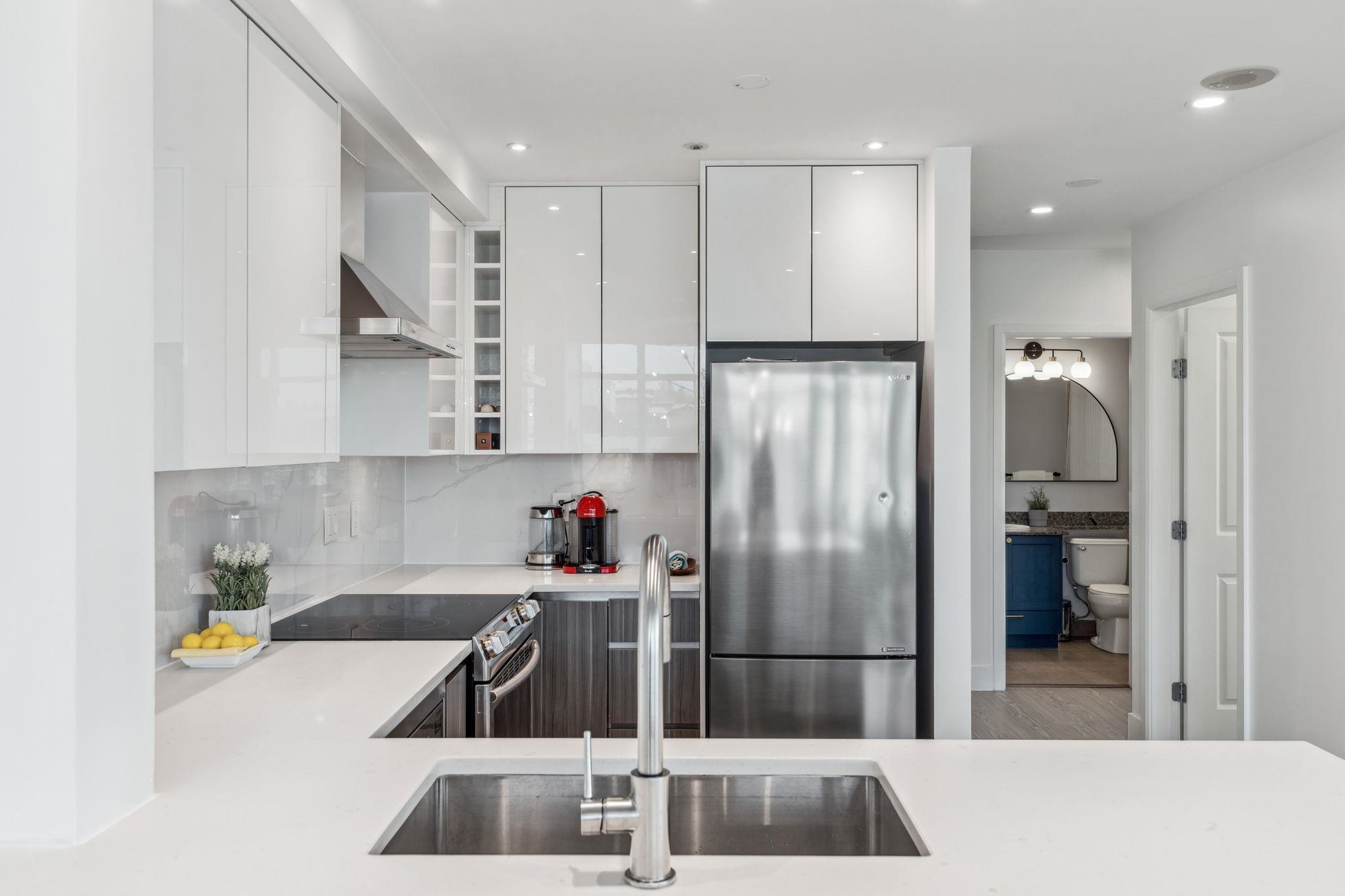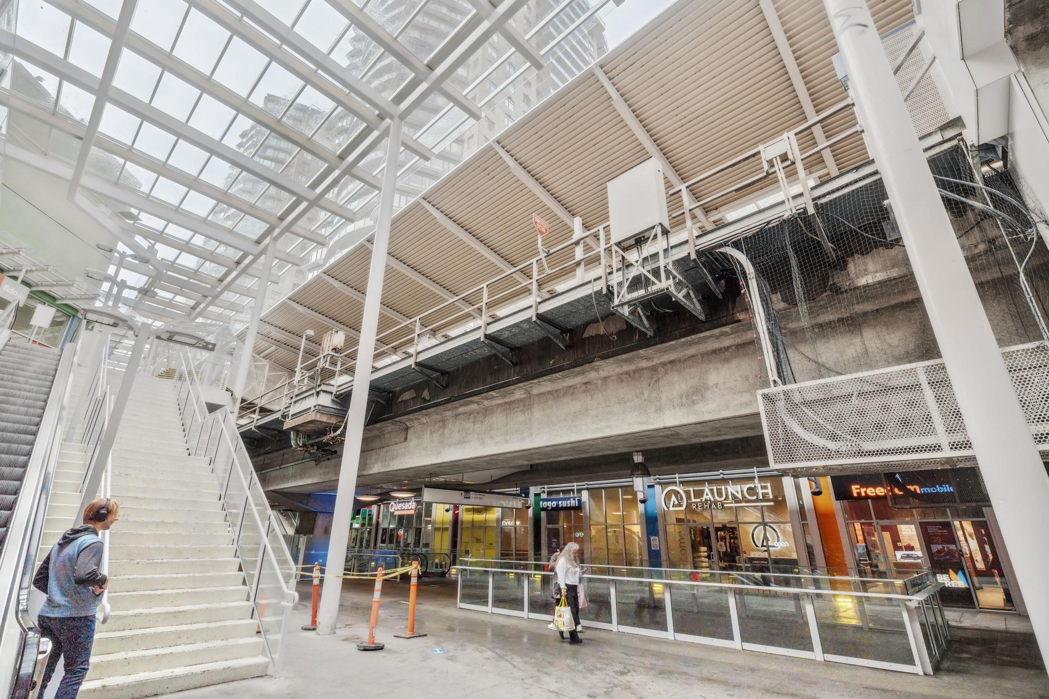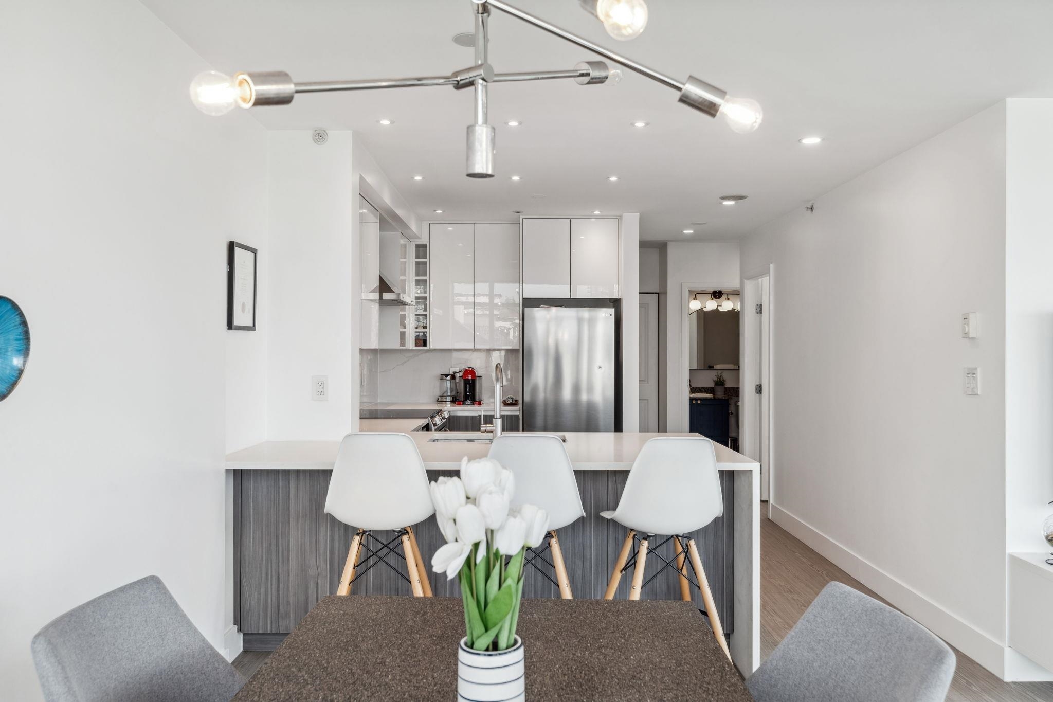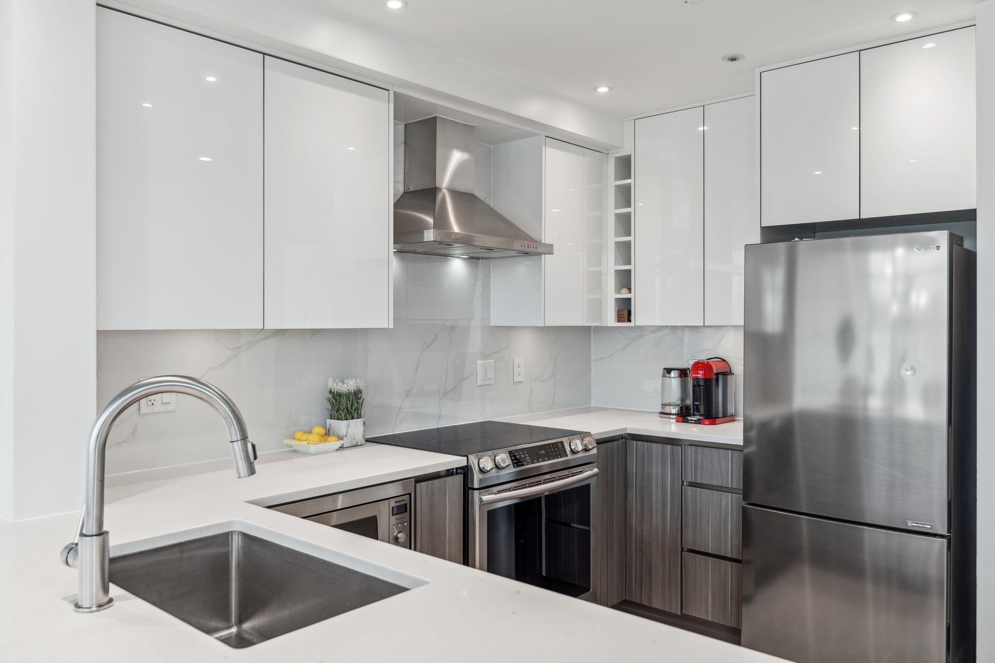 Custom floor-plan + high-end reno. Located directly above (facing away & on quiet side!) New West SkyTrain, this stunning corner suite has been fully redesigned w/ high-end reno by the current owner. No detail was missed- dropped ceilings w/ flush-mount lighting, a reimagined kitchen (rebuilt from studs), premium flooring, top-tier appliances, modern fixtures & stylish window treatments. Expansive windows flood the open-concept space w/ natural light, showcasing breathtaking river/city views. Features 2 ful...