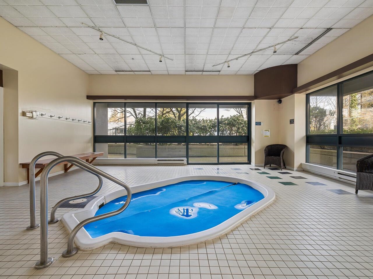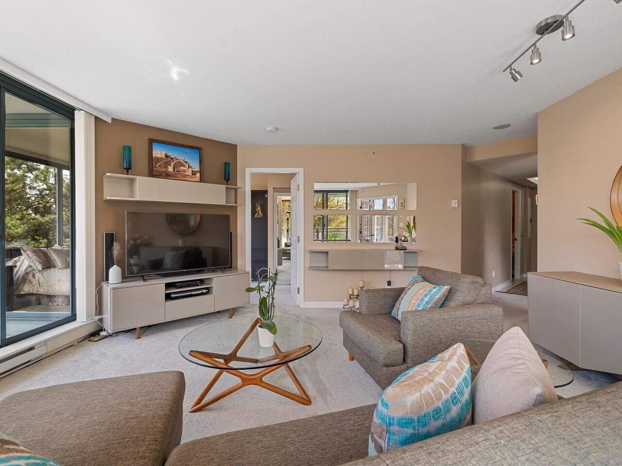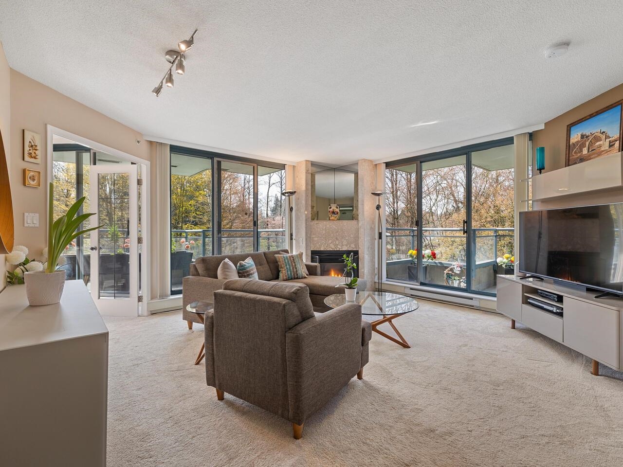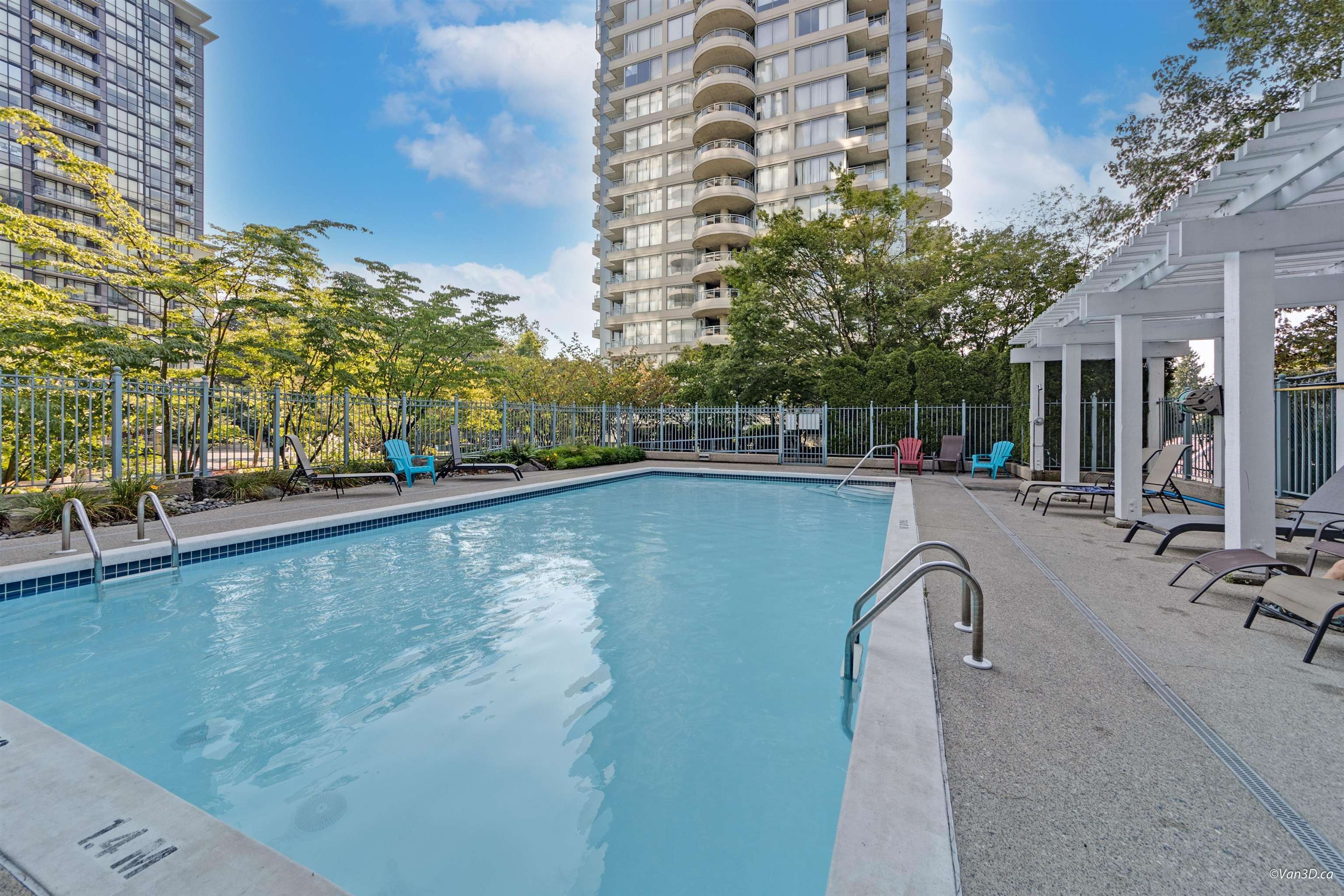 Very bright and exceptionally well-kept 1-bed + den (or 2nd bedroom) corner unit offers a generous layout with gas fireplace. Soak in natural light from 2 oversized balconies and floor-to-ceiling windows with SW exposure. Positioned on quiet side of the building, you'll enjoy privacy and peaceful living. Includes 2 side-by-side secured parking spots. Top-tier amenities include gym, pool, hot tub, sauna, party lounge, BBQ area, and resident caretaker. Centrally located across from Gateway SkyTrain with quick...