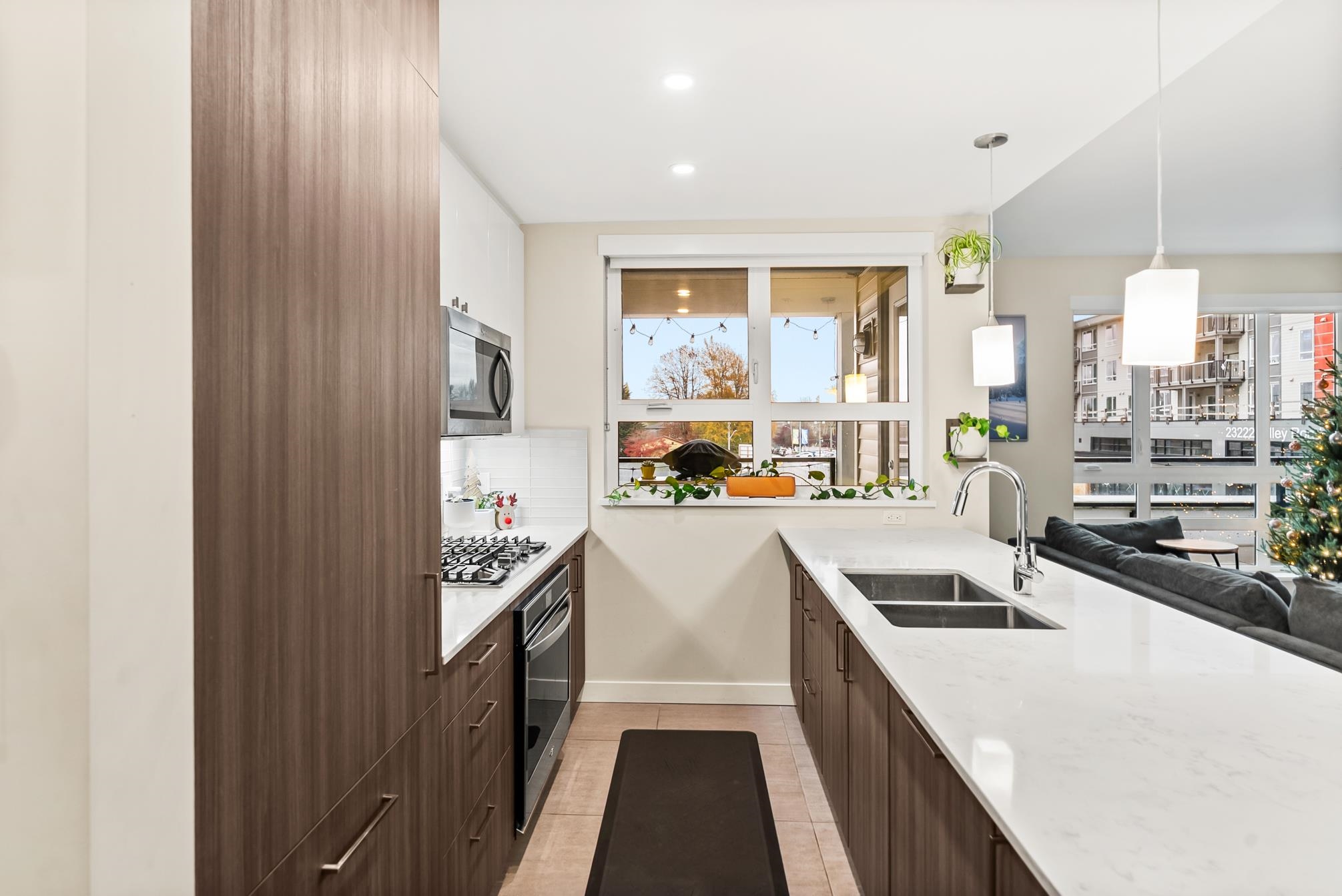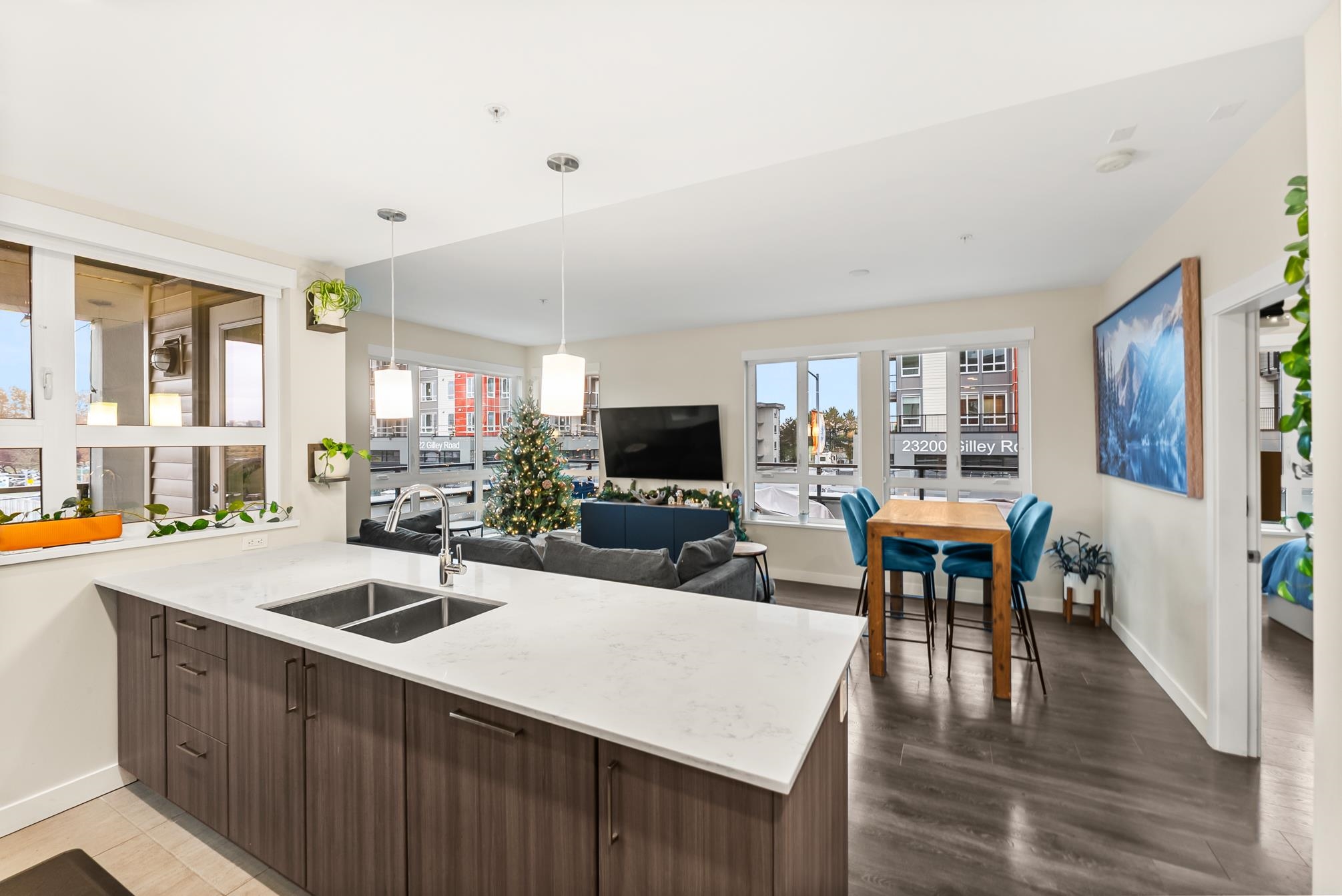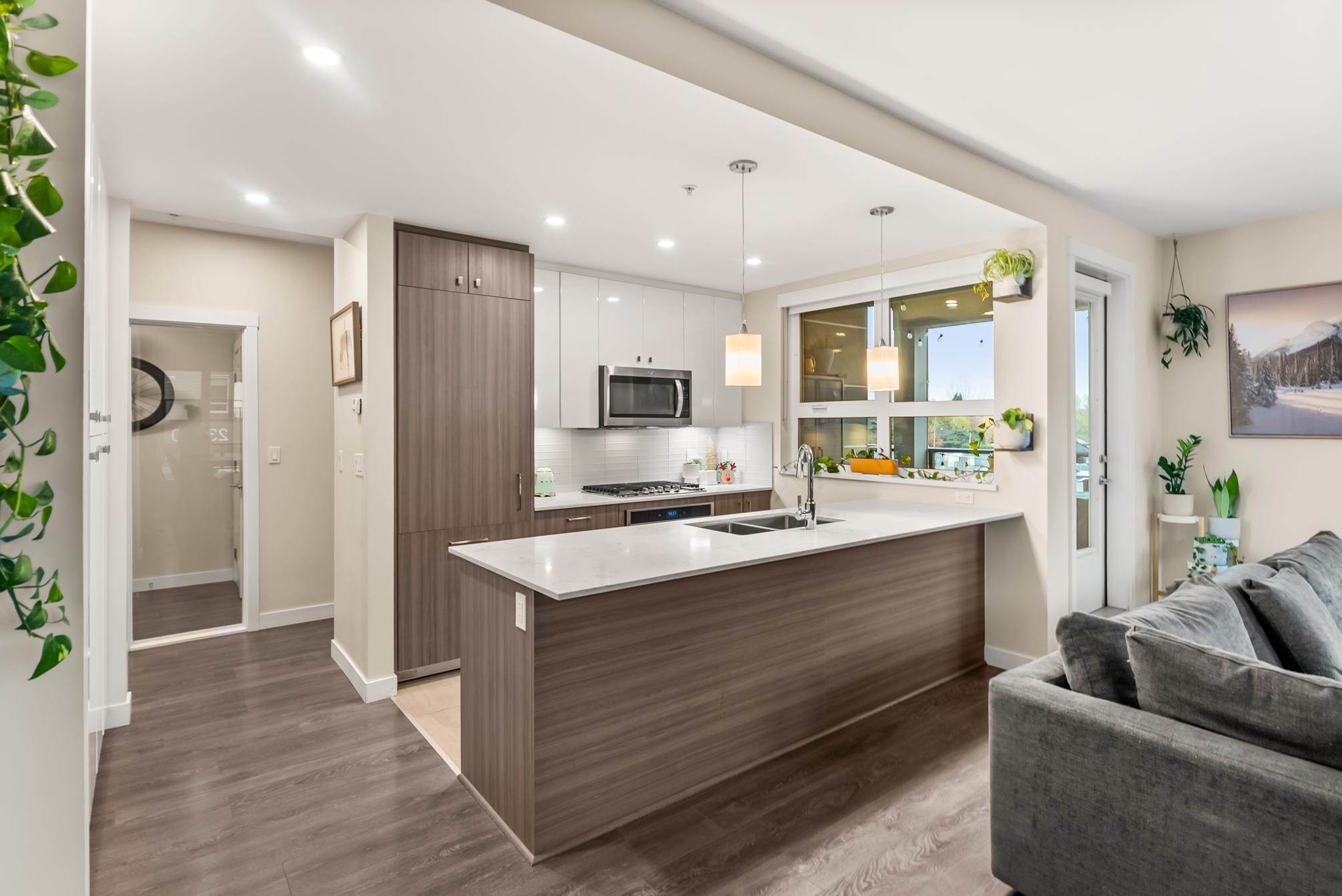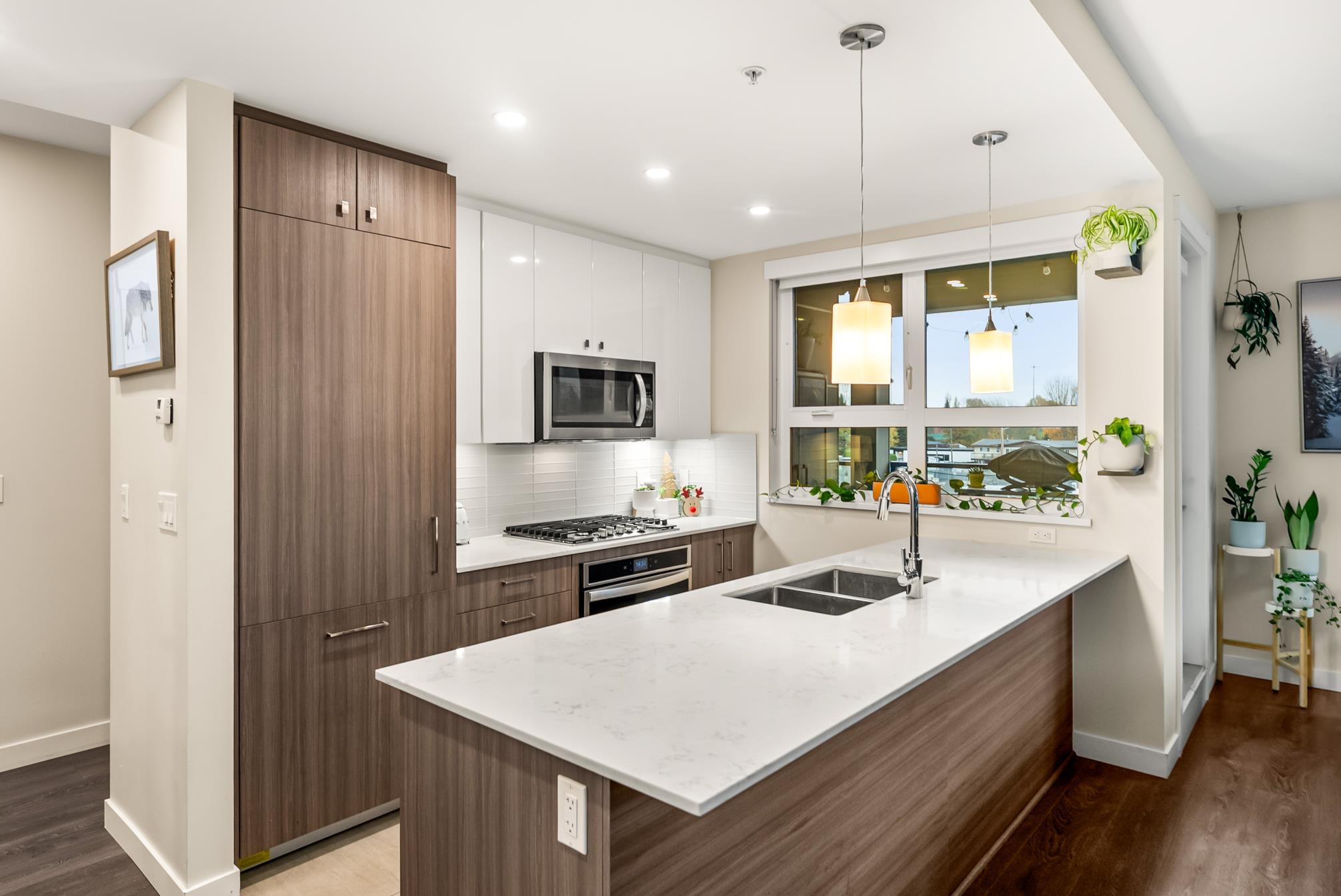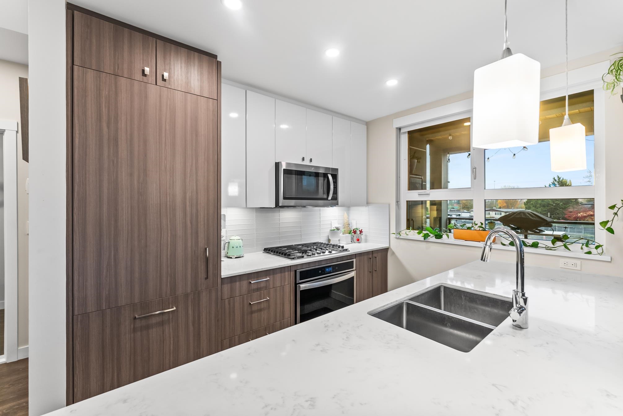 HAMILTON VILLAGE by ORIS! This bright and spacious corner home features 2 bedrooms, a den, & 2 bathrooms. Enjoy modern living with integrated appliances, quartz countertops, a gas cooktop & expansive windows. The massive 432 sq. ft. sunny balcony extends your living space year-round. The den easily converts to a 3rd bedroom or home office. Located in the first phase of a rapidly growing master-planned community, this home is steps from shopping, schools, parks, and transit. Easy access to Hwy 91, the SkyTra...