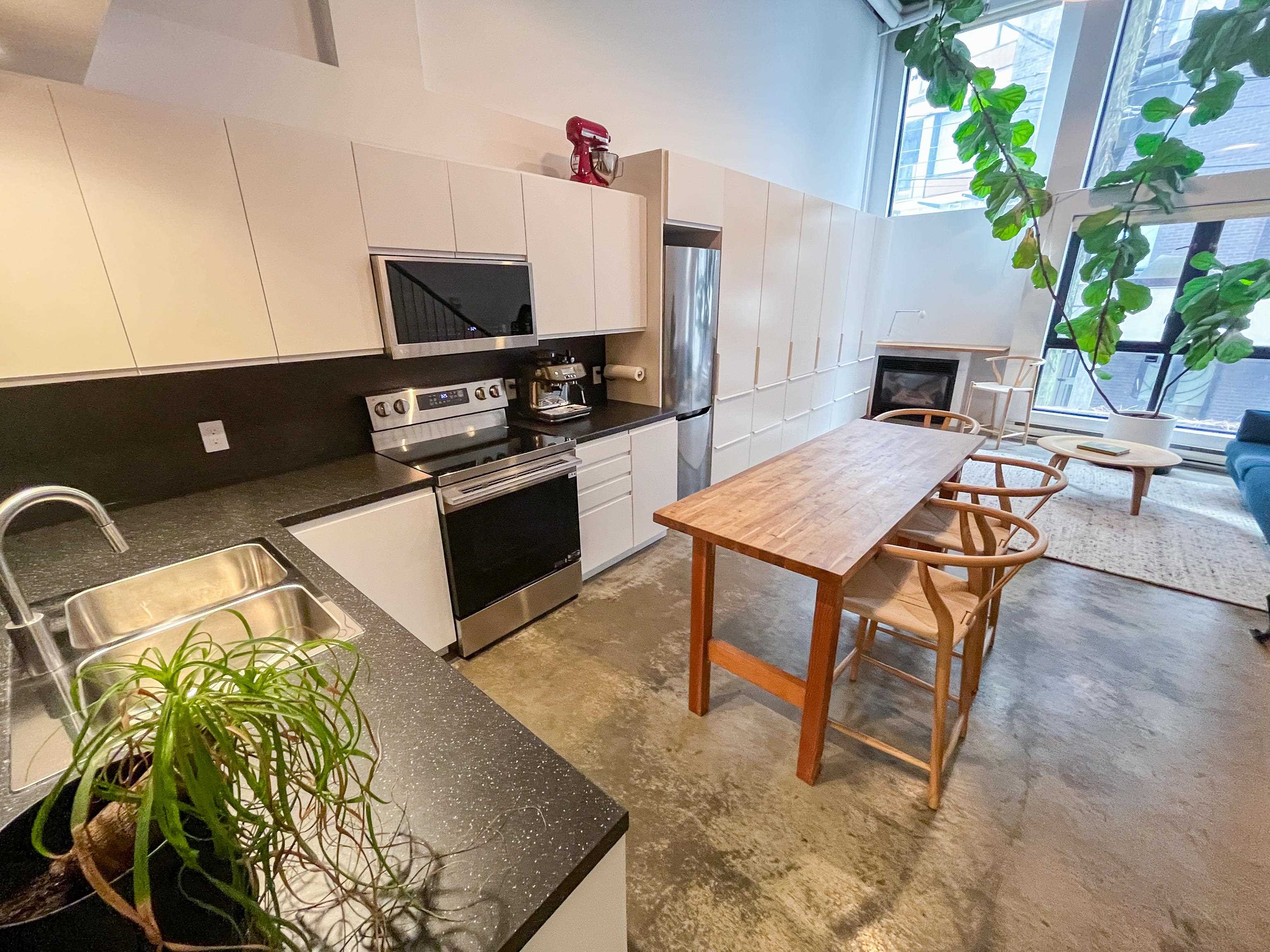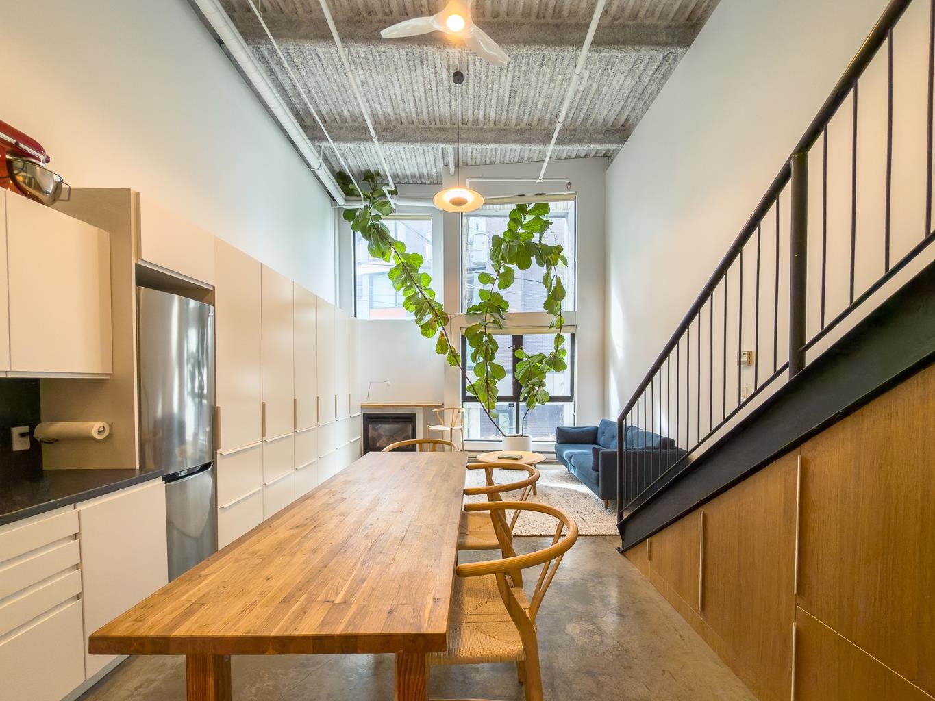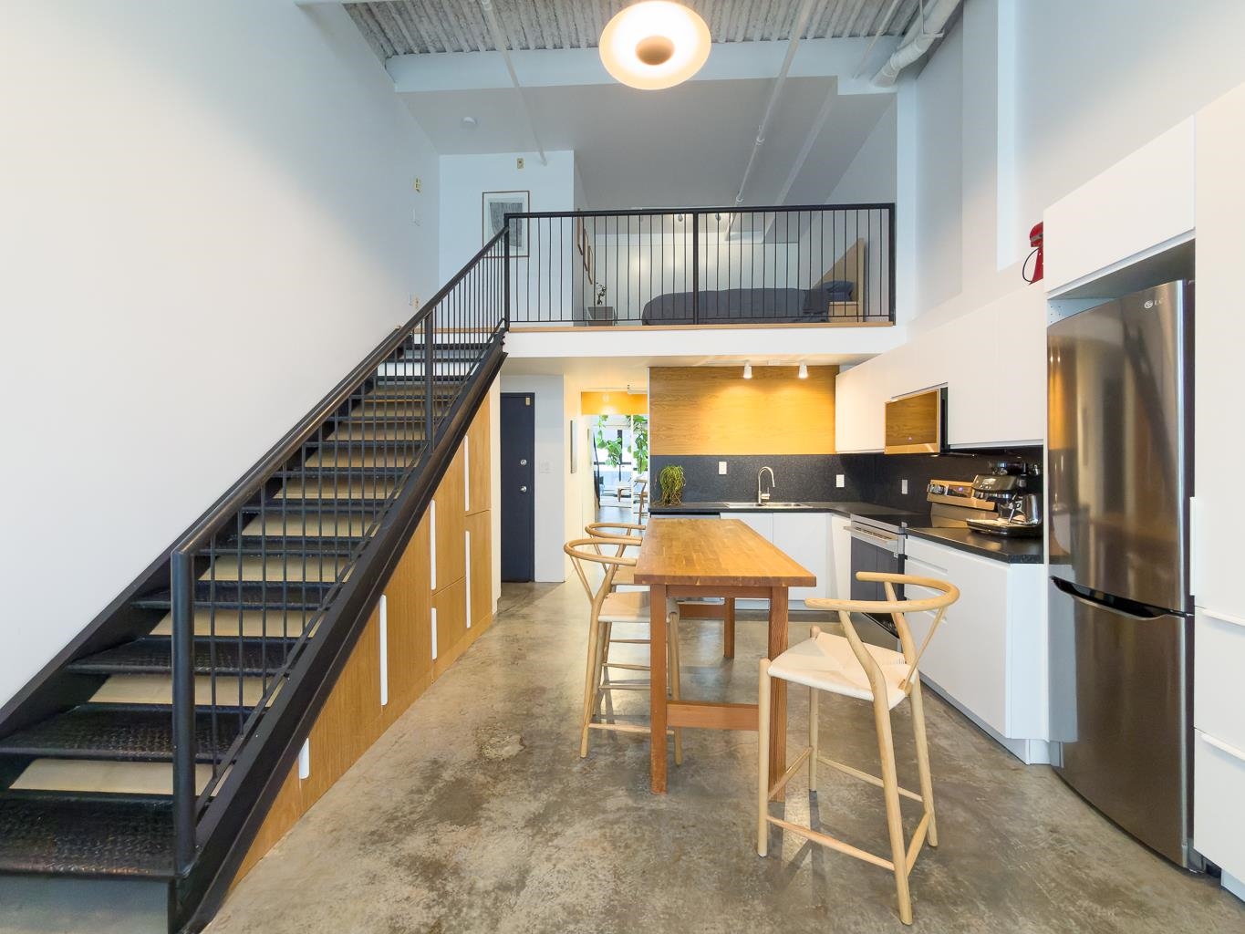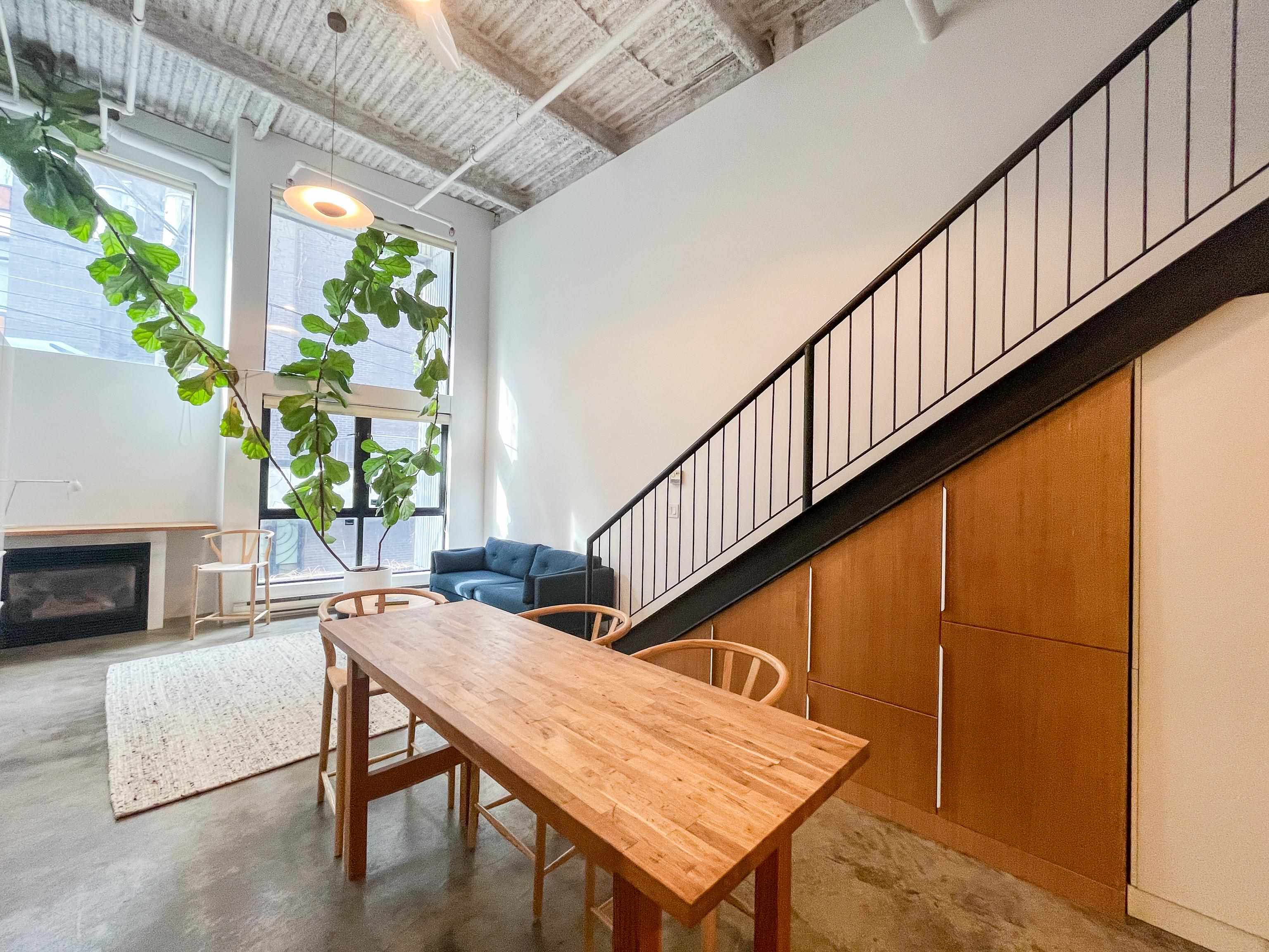Incredible one-bedroom Main Street loft. Fully renovated and in show-home condition, this bright industrial-style home features a full-height mezzanine bedroom with wall and wall-to-wall closets overlooking a dramatic double-height living space. Massive west-facing windows with opening panels and full blinds bring in natural light and indoor-outdoor feel. The open kitchen is ideal for entertaining with new stainless steel appliances, white cabinetry, and great counter space. Industrial metal stairs, concret...