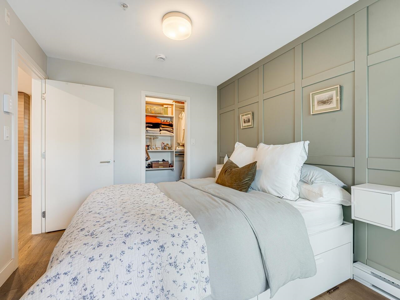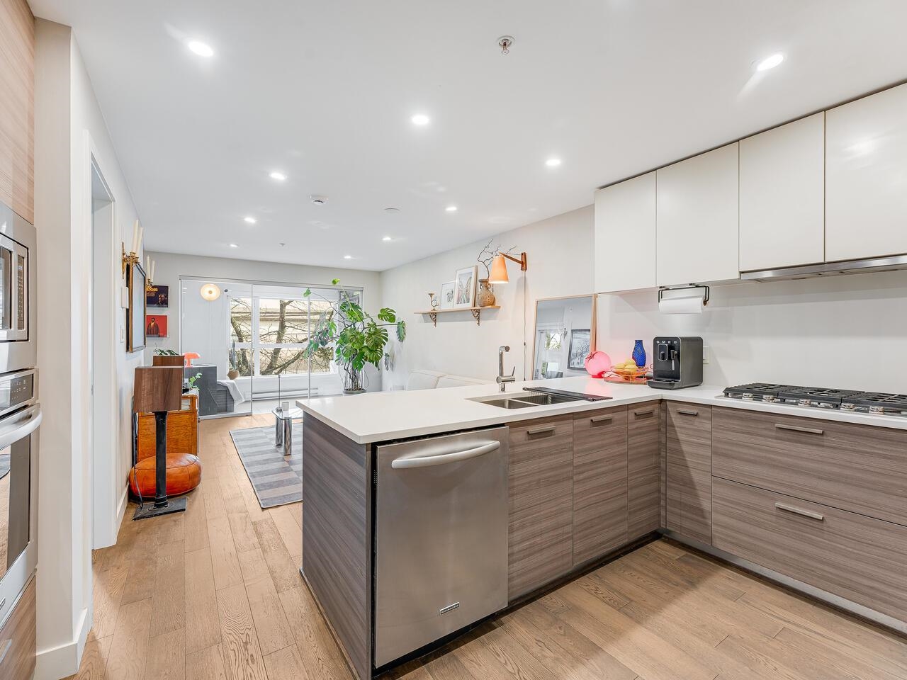 Welcome to THE MERCER by Cressey- this 1 bed + solarium + office truly checks all the boxes! Famous 'Cressey kitchen' w/ quartz countertops, breakfast bar, SS appliances incl. gas range, built-in wall oven & tons of storage. Open concept layout maximizes its 653 sqft w/ a bright solarium and efficient office/flex space. Tasteful engineered HW, heated bathroom floor, walk-in closet, and full-size washer/dryer add everyday comfort. Feats. include custom built-ins in entryway and office, designer paint, bedroo...