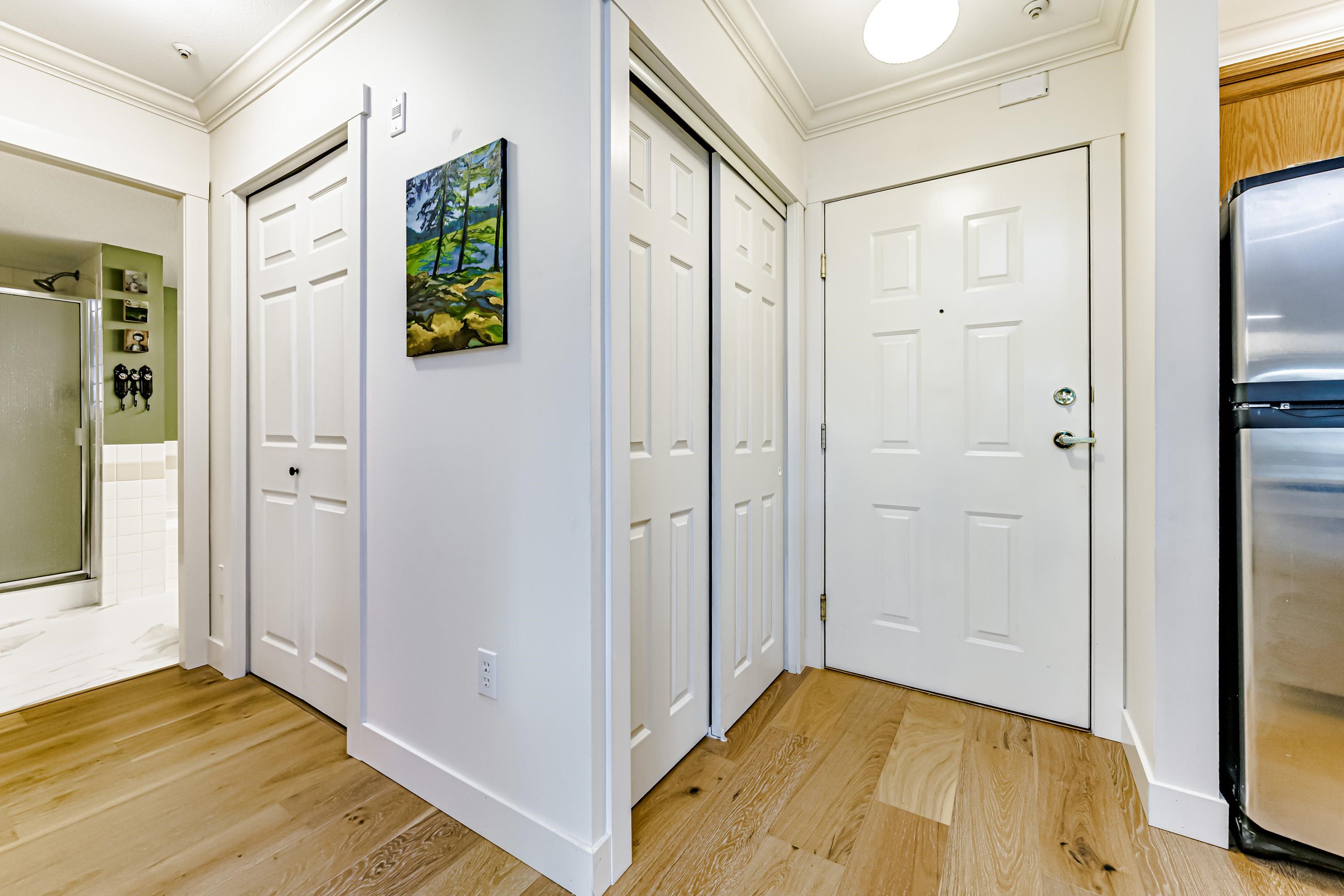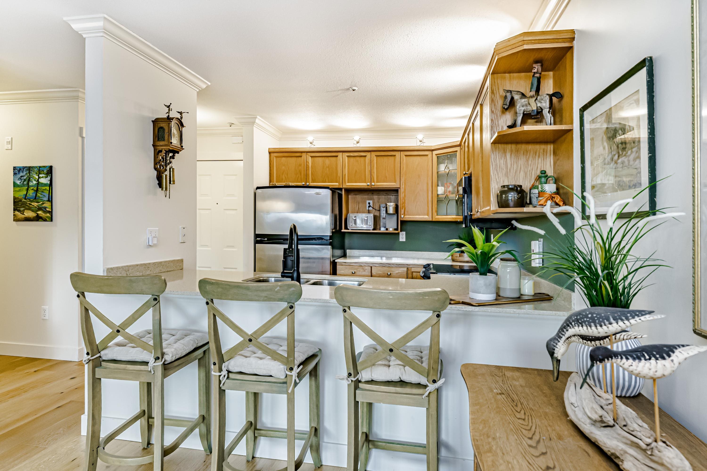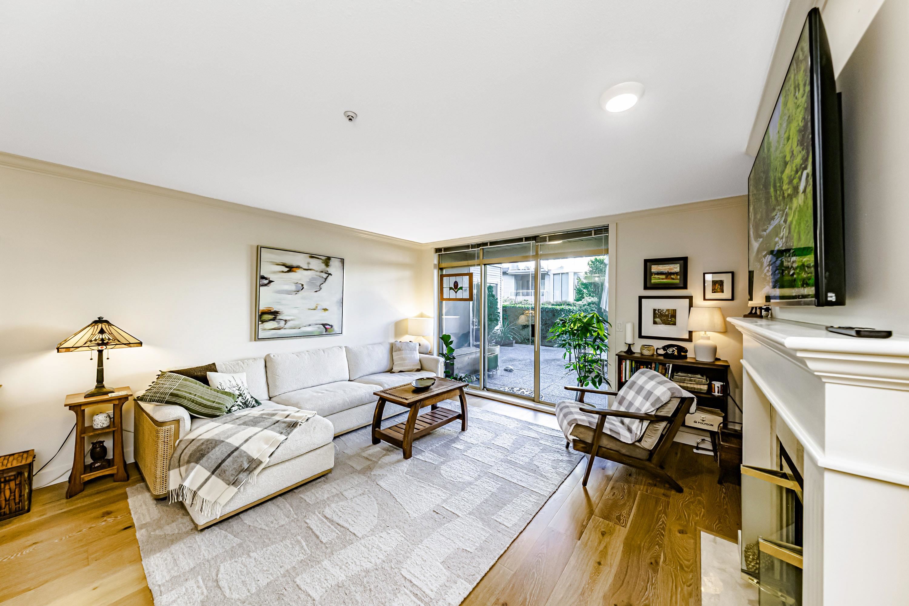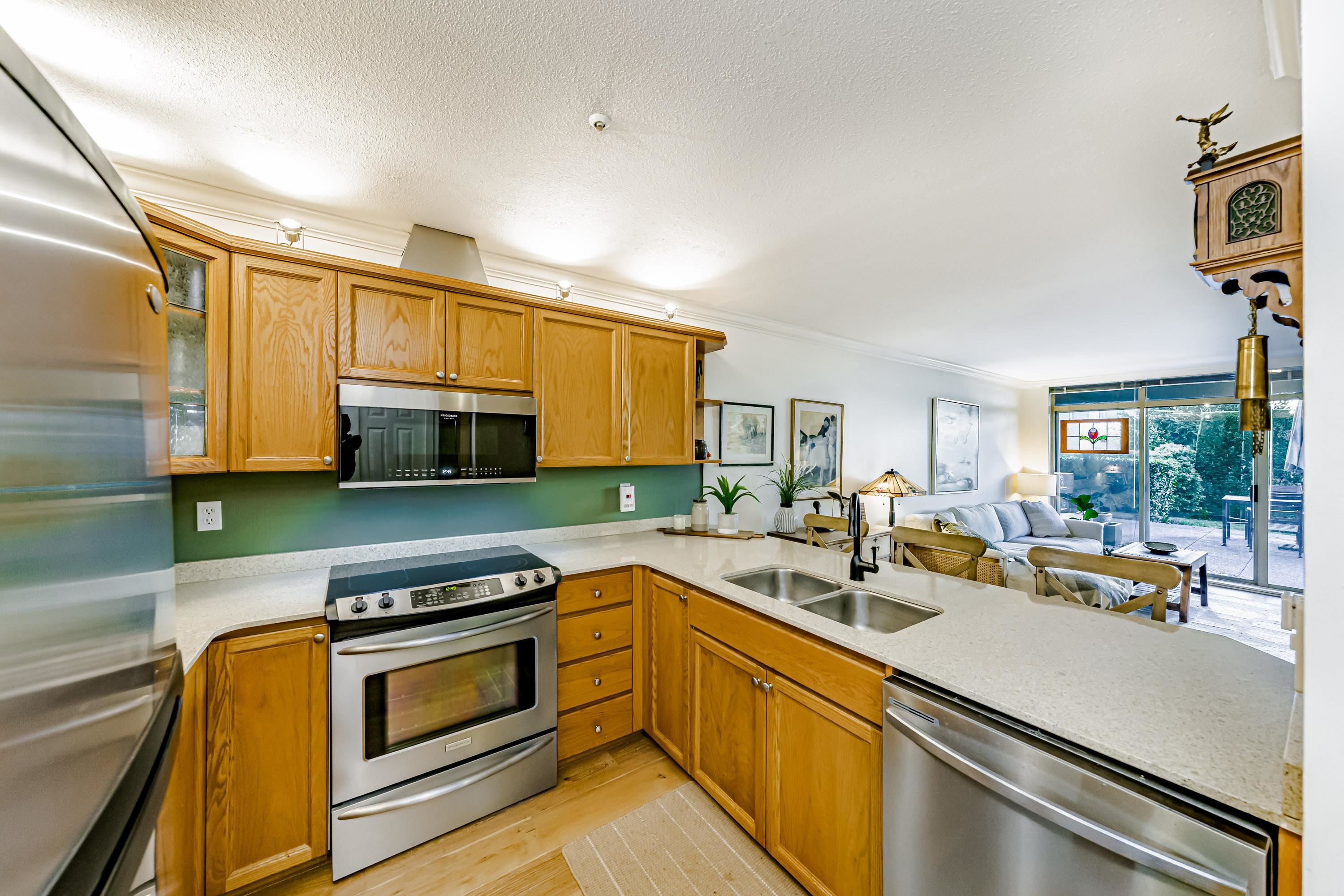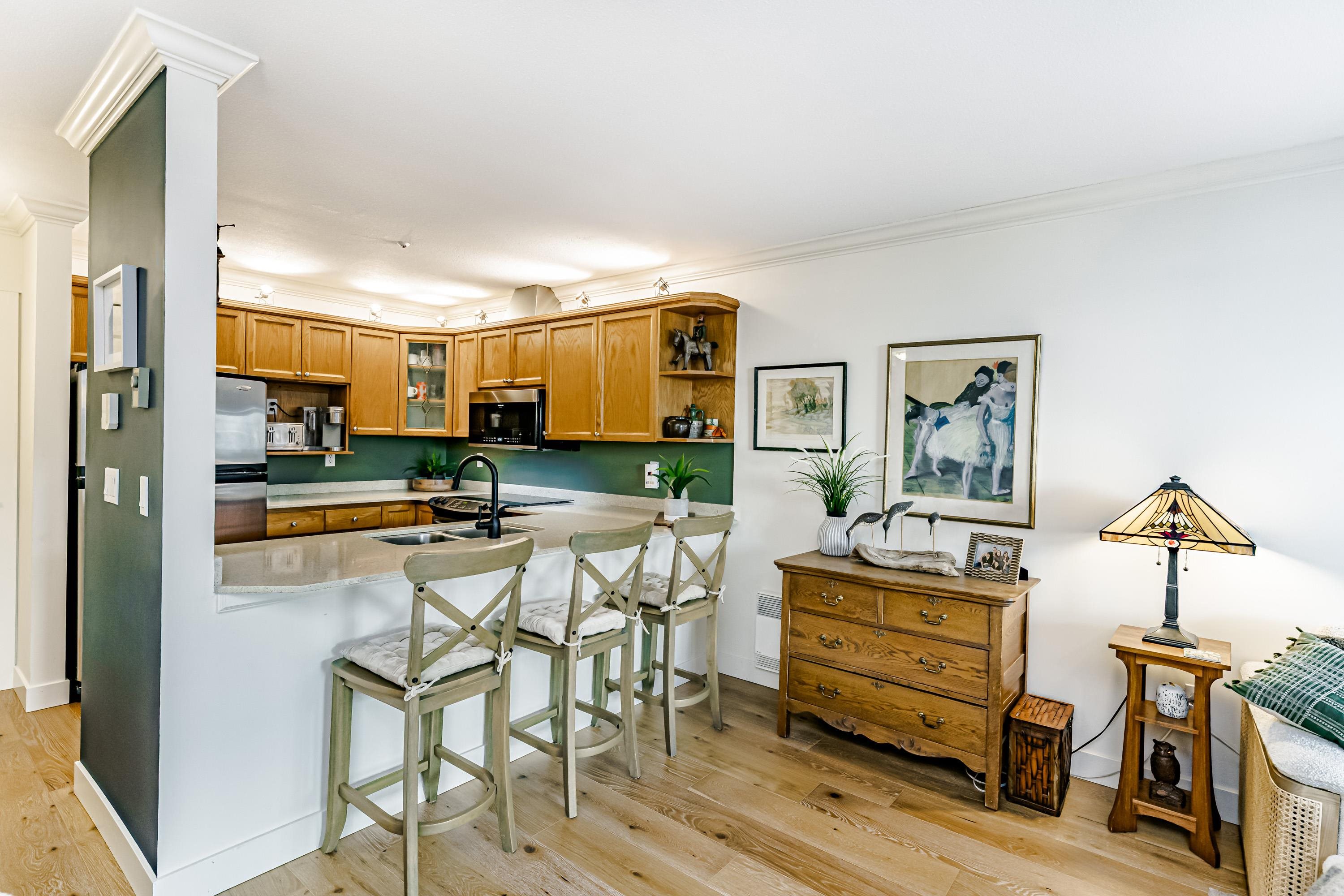 Spacious & rarely available GARDEN LEVEL suite with LARGEST PATIO in the complex overlooking lovely landscaping with peak-a-boo river, castle & mountain views! Recently updated 1 Bed & Den (currently being used as a bedroom) & 1 Bath, 880 sf "move in ready" suite with updated SS appliances, Silestone counters in kitchen & bath, HARDWOOD flooring throughout, updated lighting, new paint & more. Huge 400 sq ft sunny garden patio perfect for entertaining, BBQ or pets. Extremely proactive strata with recent majo...