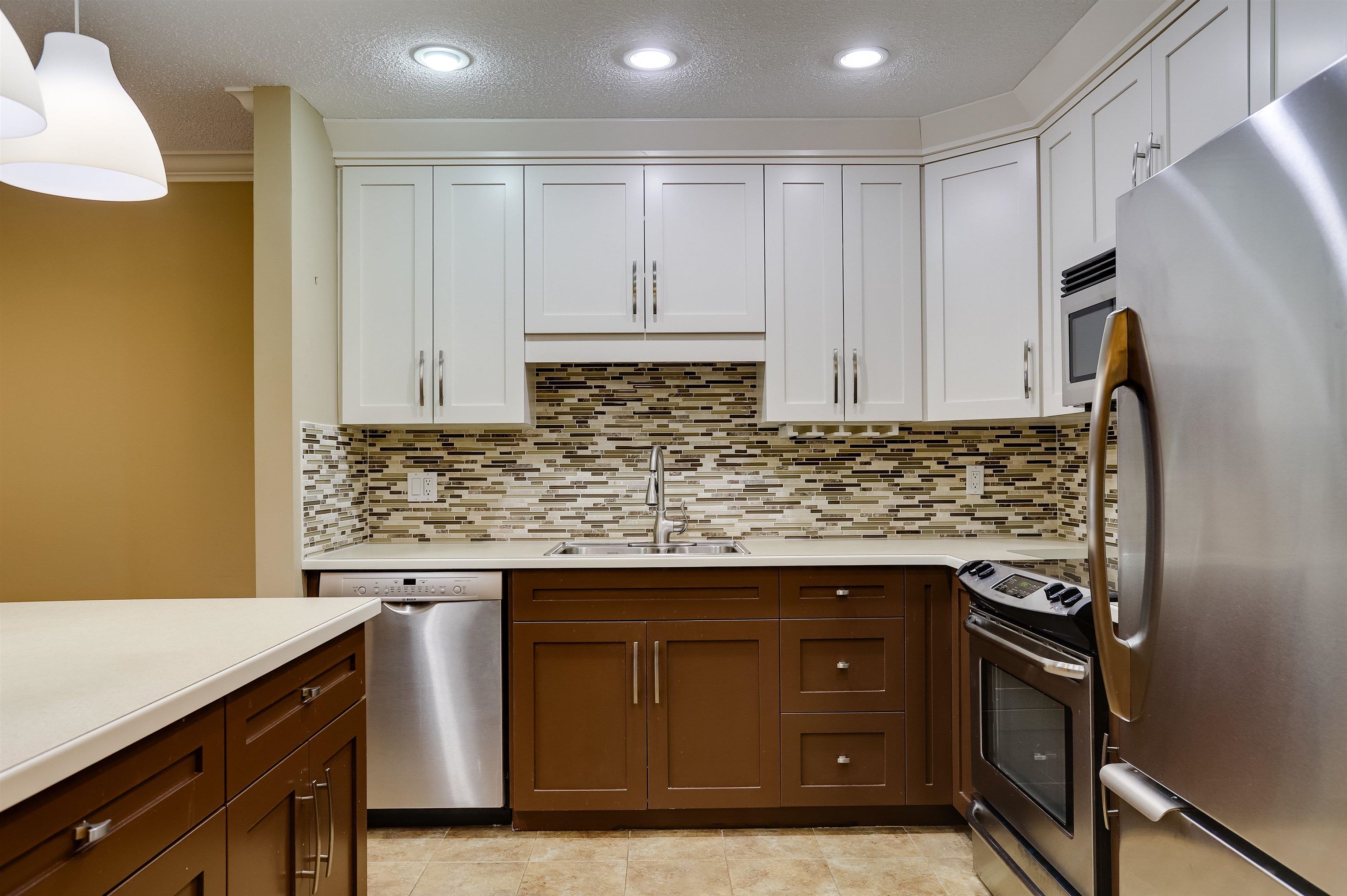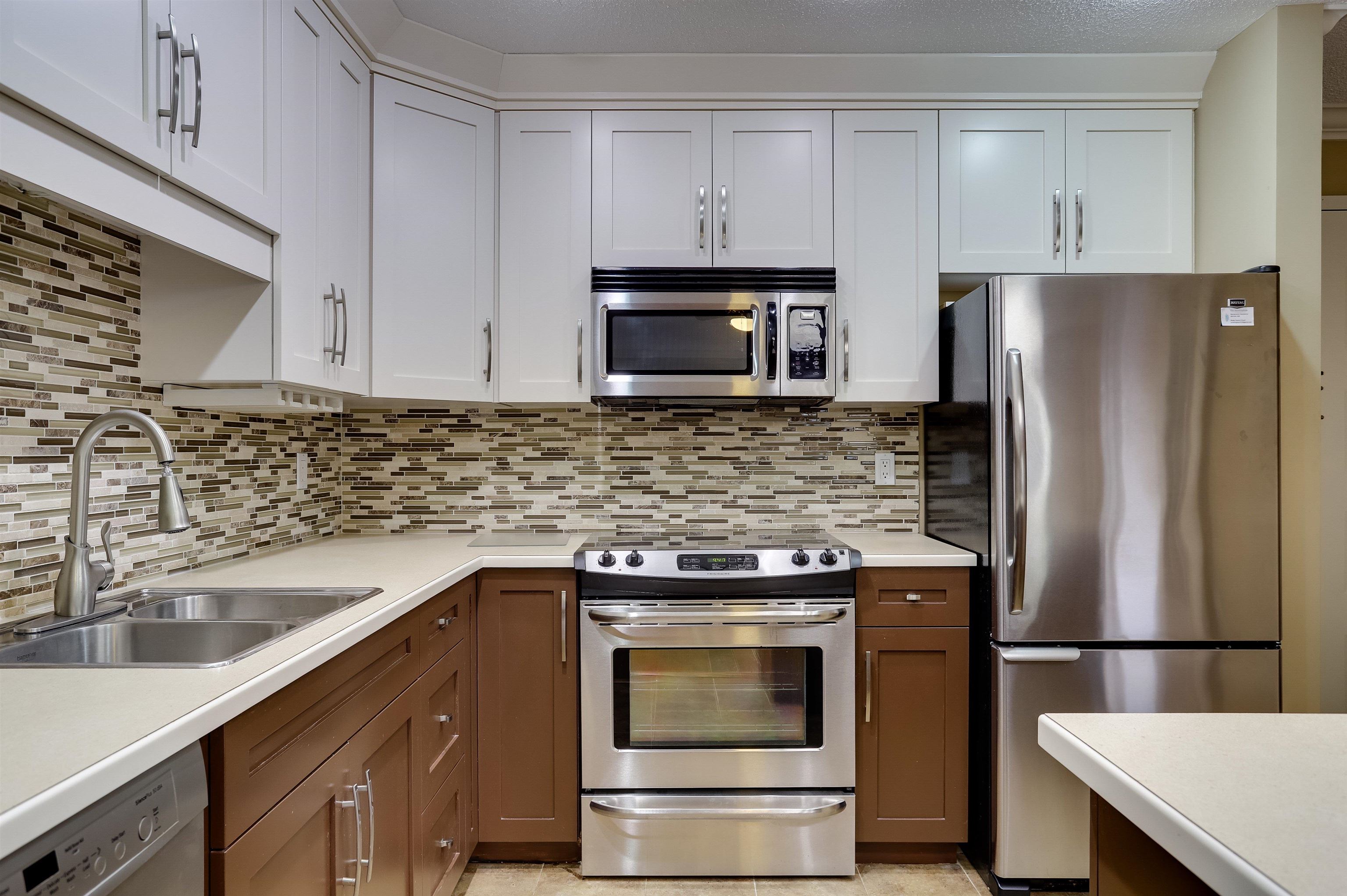 Like New! This spacious, well maintained 1 Bed & Den, 2 bath home has been completely re-done. Open kitchen with island, all new s/s appliances, up to date bathrooms, wood flooring, paint, and laundry! You'll love the bright spacious feel of this home in a quiet, convenient 55+ building. Huge 95 sqft West facing deck looks out to beautiful gardens. You won't find anything else like this in White rock at this price!