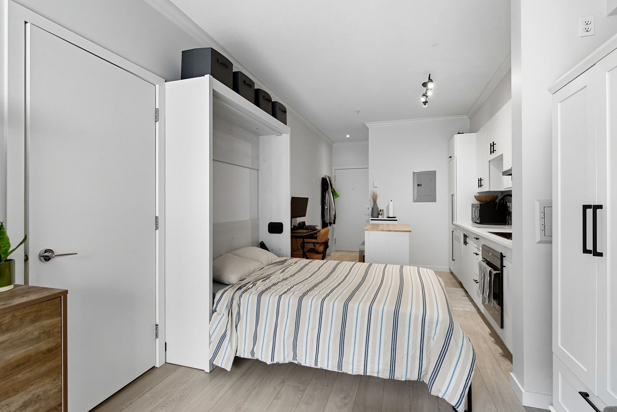 Flawlessly laid out Studio with Parking at Balance ! A great opportunity to get into the market with this Modern studio near SFU & Surrey Memorial Hospital – Parking + Storage Included ! Discover urban living at its finest in this efficiently designed layout featuring sleek modern finishes & an open concept home that maximizes every square foot. The large covered patio adds to your living space ! Enjoy the convenience of in-suite laundry, plus the rare bonus of 1 secured parking stall & a private storage lo...