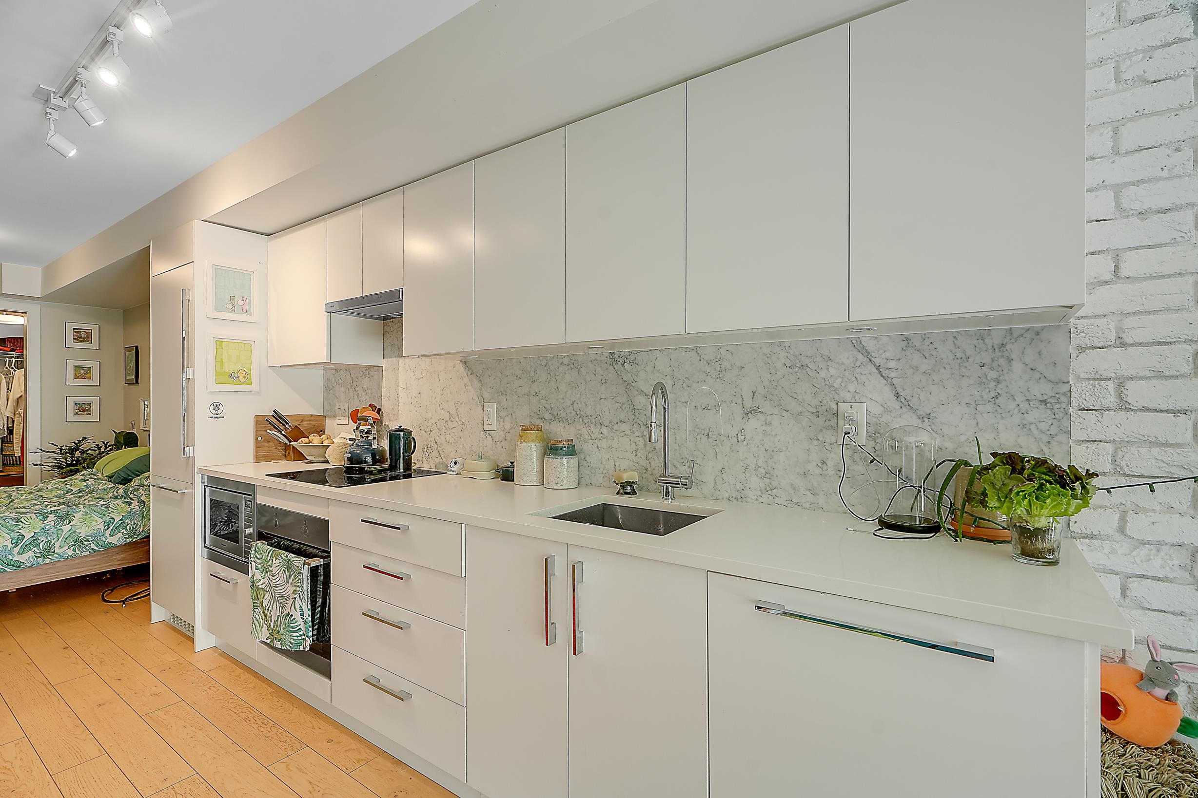 Welcome to Midtown Central by the Peterson Group/PortLiving (Studio Living). This boutique 33-unit building is perfectly located along the Broadway Corridor & Fraser Street. Situated on the quiet side of the complex features a spacious 208 sq ft patio, unobstructed. Enjoy high-end finishes throughout, including oak engineered hardwood floors, integrated appliances with induction cooktop, Carrera marble backsplash, and a luxurious bathroom with in-floor heated herringbone tile and a rain shower. The large wa...