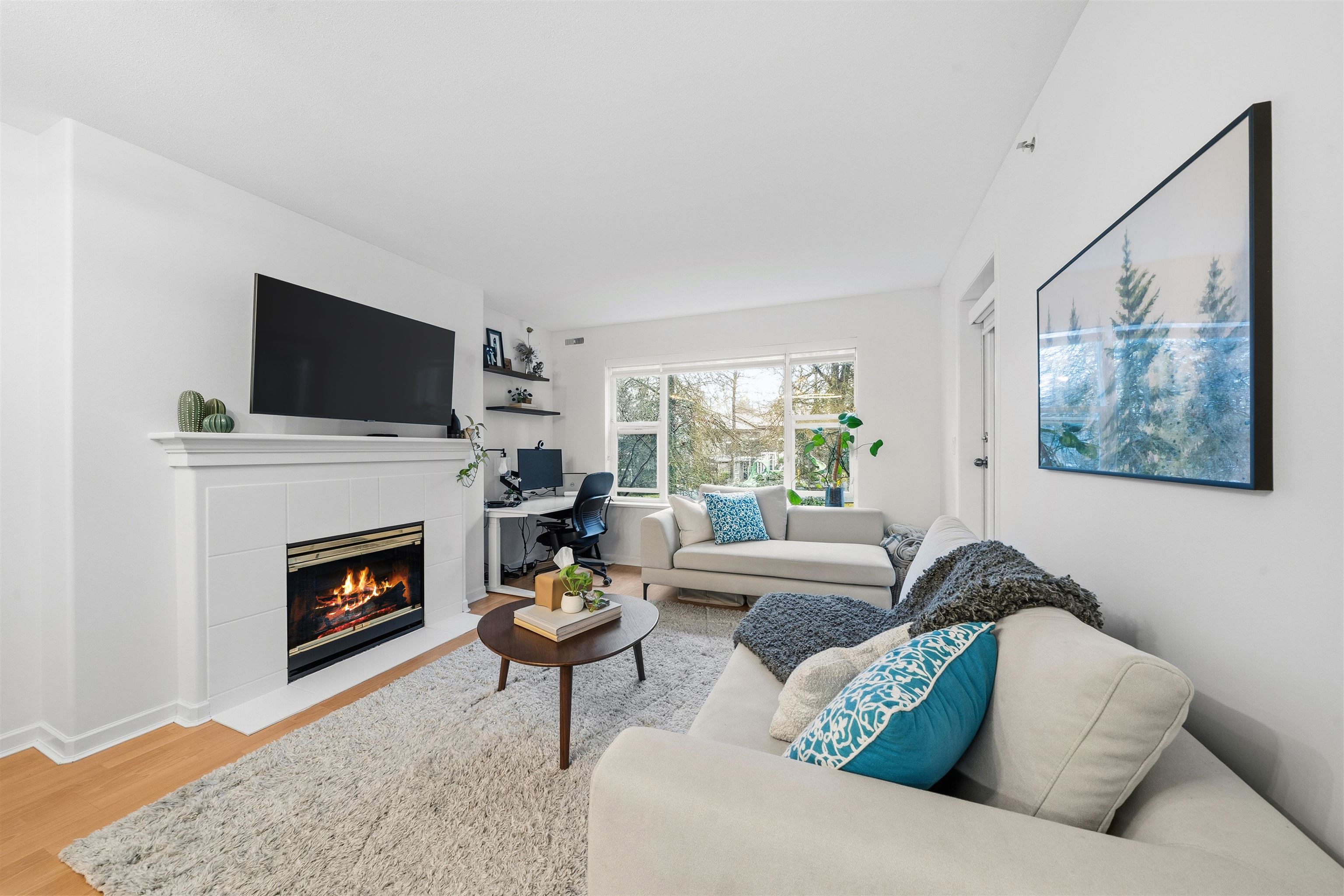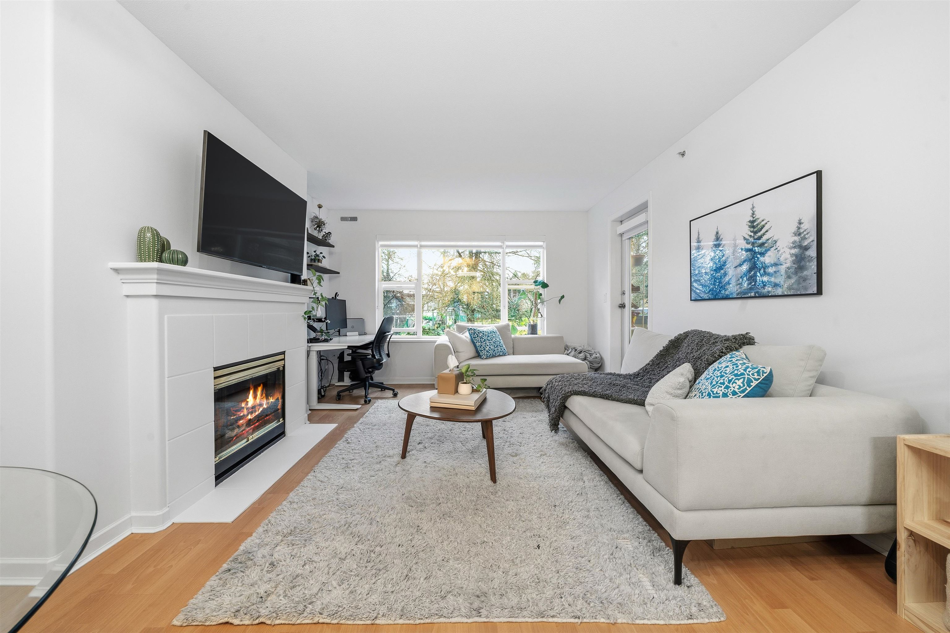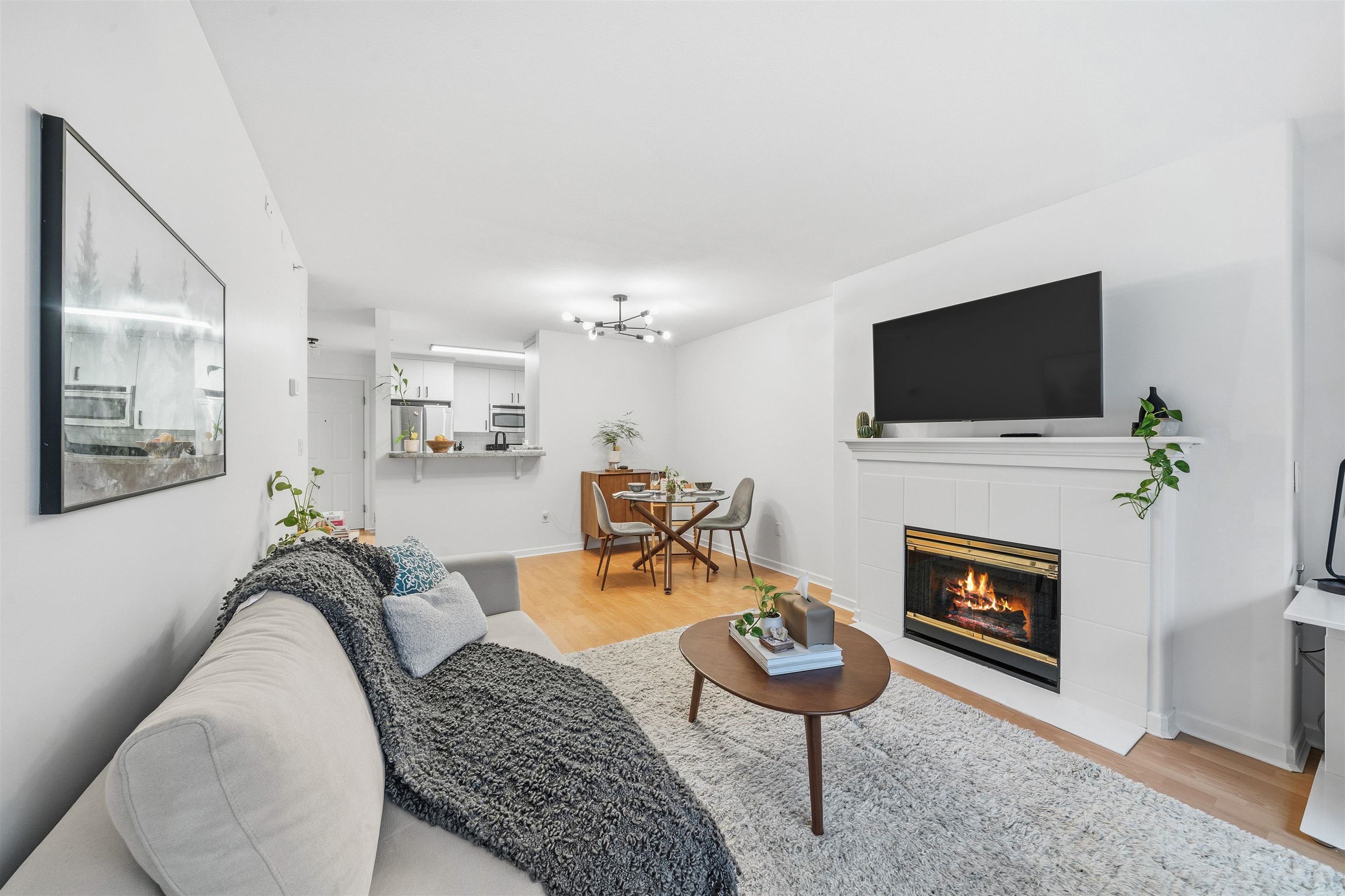 Welcome to The Legends, this bright and thoughtfully laid-out 1-bedroom home offering comfort, style, and outstanding location. The modern kitchen features stone countertops, updated cabinetry, and stainless steel appliances, flowing seamlessly into a spacious living and dining area filled with natural light. A cozy gas fireplace creates the perfect setting for relaxing evenings or entertaining guests, while in-floor radiant heating adds quiet, efficient warmth throughout the home. The generous bedroom prov...