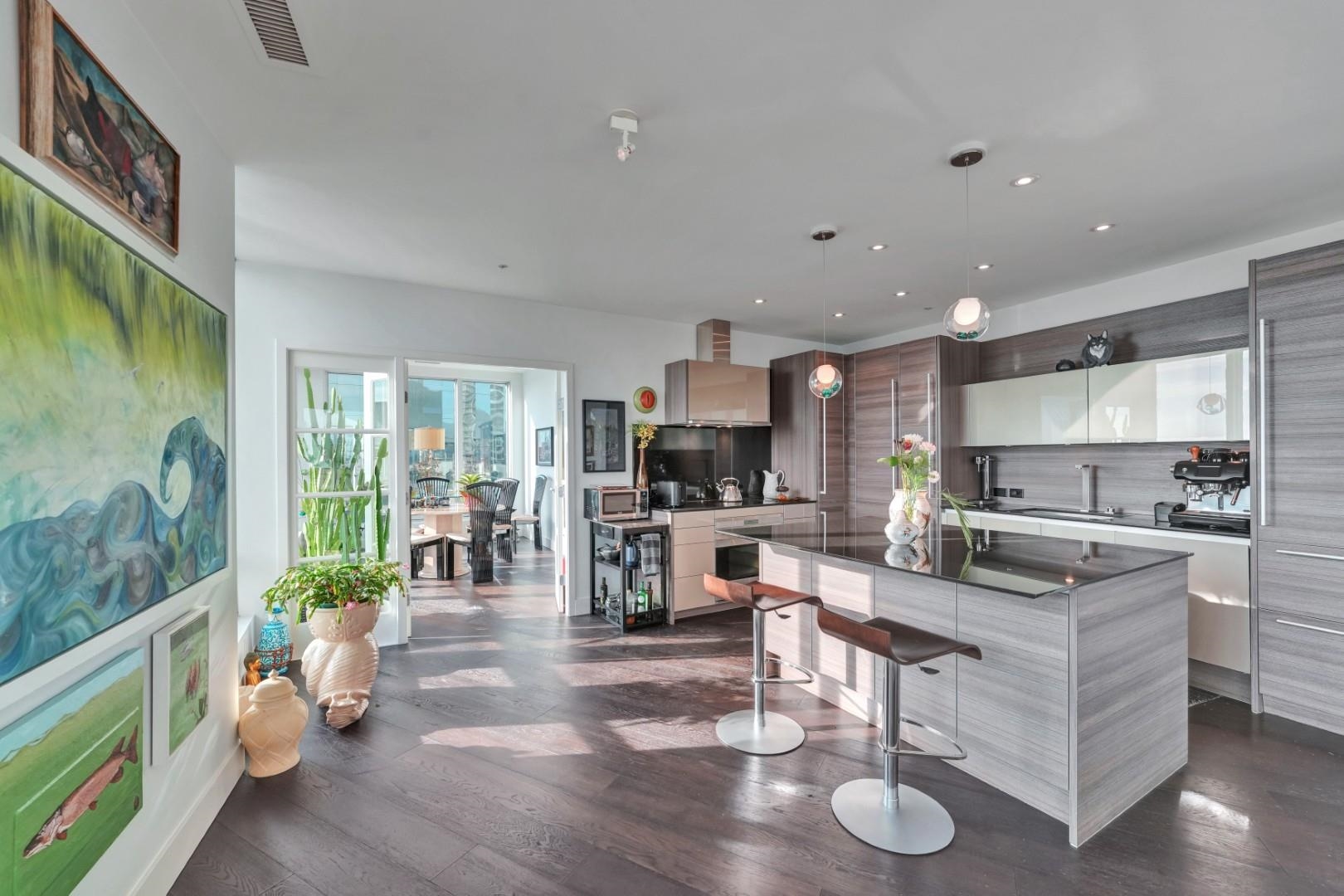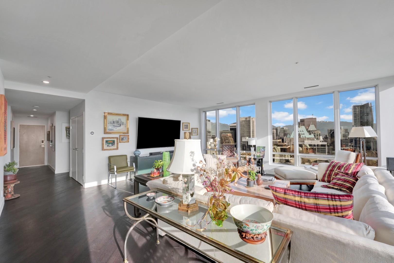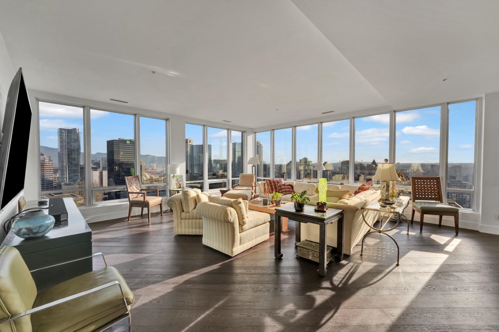 A rare legacy 3 bed + 2 bath + office/solarium/4th bed Penthouse of 1,804 SF with sweeping 270° exposures and forever-protected views of the North Shore Mountains and distant Mount Baker. Wake up to morning light, enjoy coffee above the city, and unwind as the skyline glows at night. This is elevated downtown living. Thoughtfully re-imagined with a strong design sensibility, the home offers Poggenpohl kitchen with Sub-Zero, Wolf & Miele appliances, Bocci hand-blown glass lighting, engineered hardwood floori...
