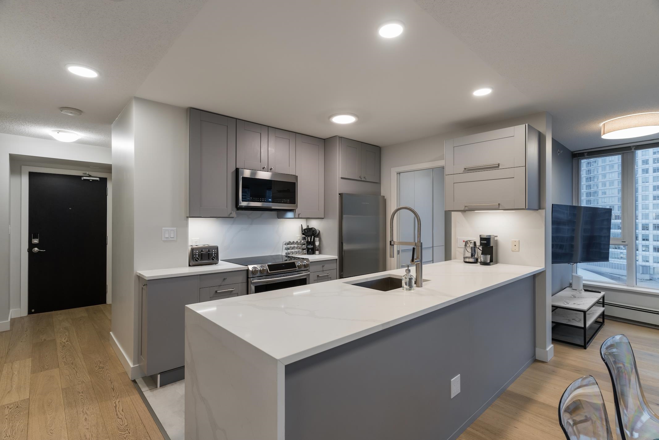 AIRBNB-FRIENDLY ESPANA TOWER — Beautifully renovated modern home featuring 2 bed, 2 bath + den/flex with an efficient layout ideal for a home office. Updated kitchen, stainless steel appliances, hardwood floors, LED lighting, custom closets, and renovated bathrooms. Generate income while you’re away with permitted short-term rentals. Pet-friendly. 1 parking included. Full amenities with 24/7 concierge. Steps to SkyTrain, T&T, Costco, Cineplex & Crosstown Elementary.