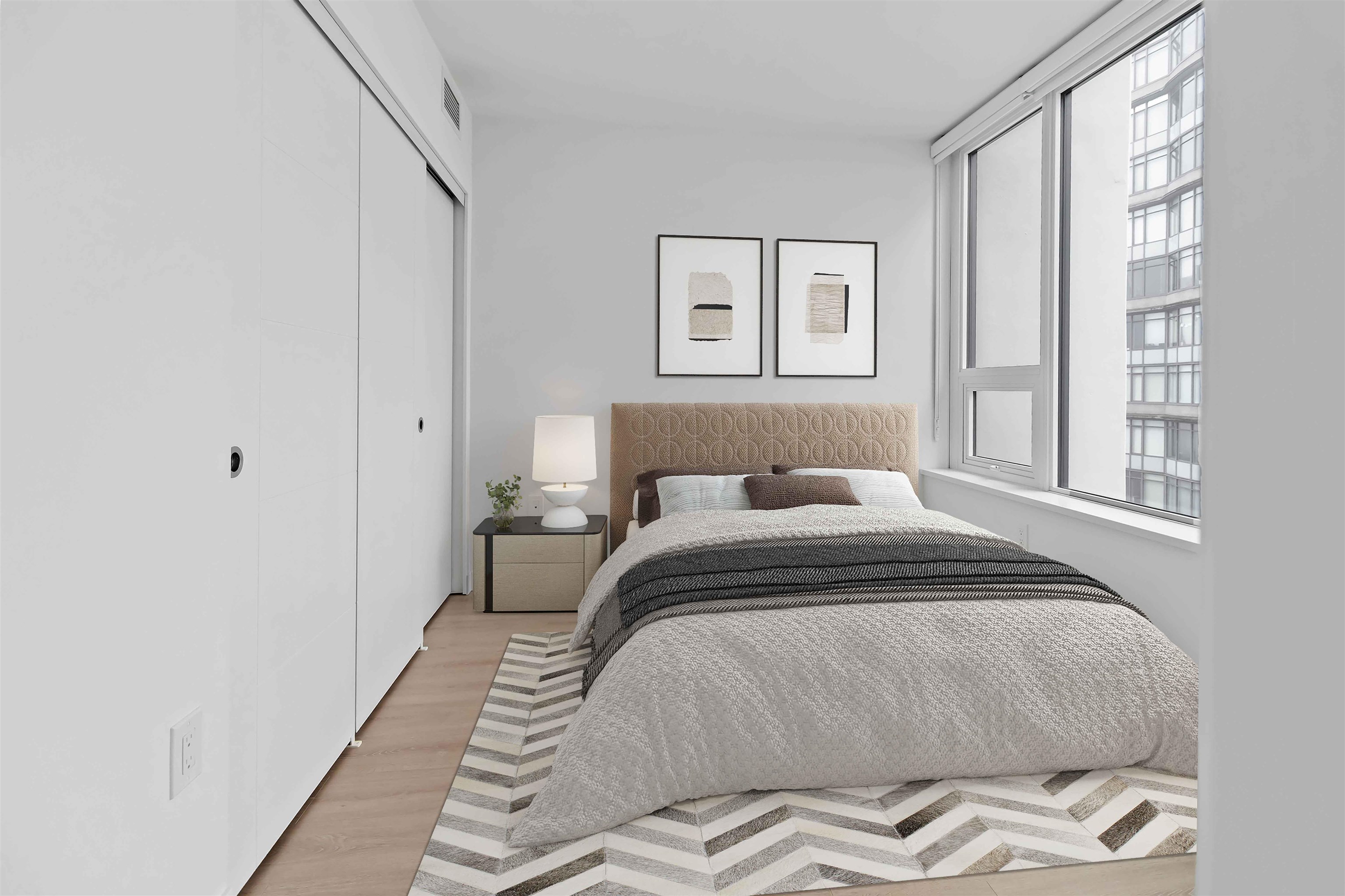 Enjoy refined city living in this well appointed 1BR/1BA residence offering 485 sq.ft. of thoughtfully designed space. The home includes one EV-ready parking stall and one storage locker. With a southeast facing orientation, the unit is filled with natural light and showcases floor-to-ceiling windows, wide-plank laminate flooring, and the convenience of in-suite laundry. The contemporary kitchen features quartz countertops,a porcelain tile backsplash,and high-end Bosch appliances, complete with a gas cookto...