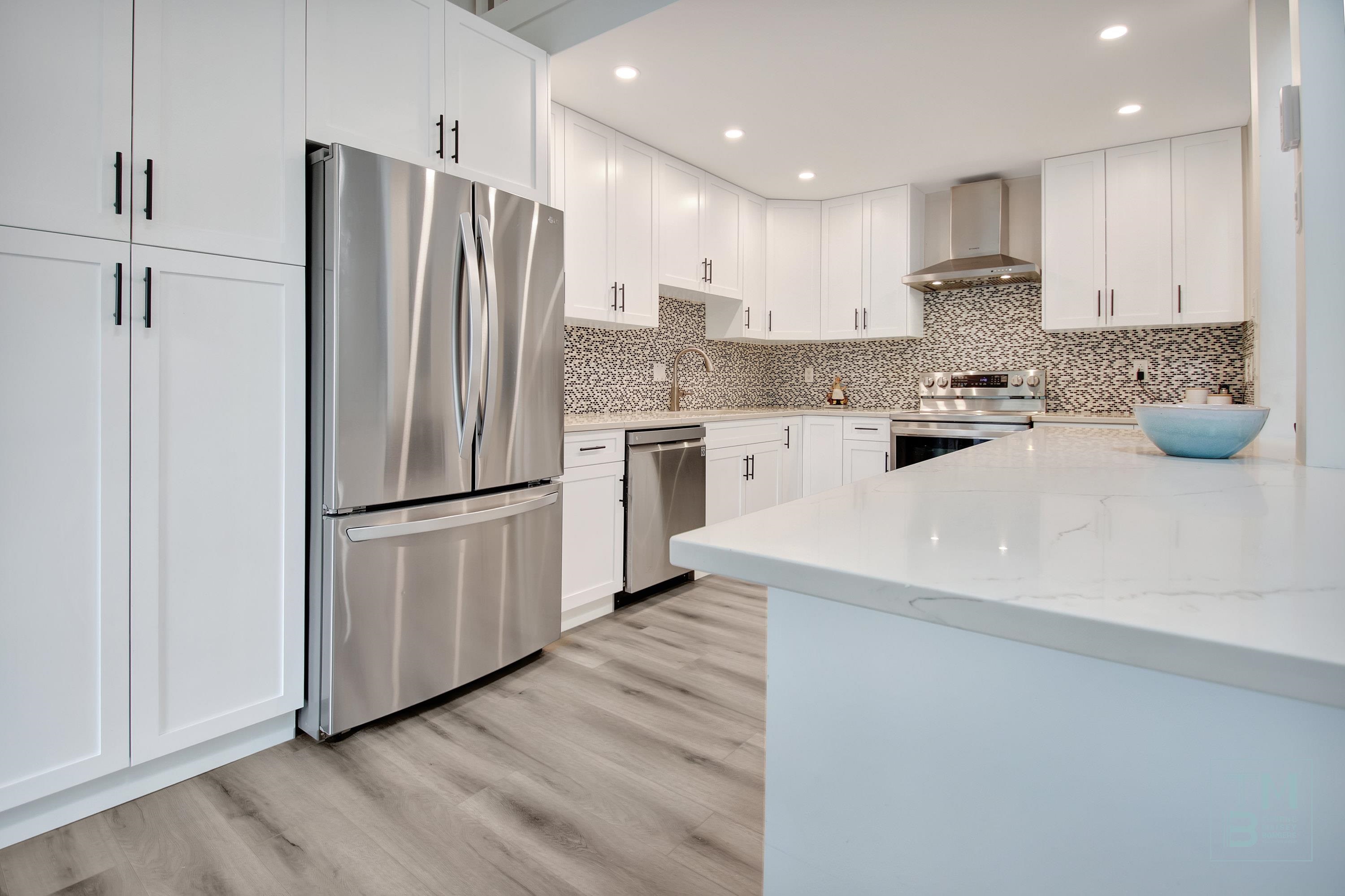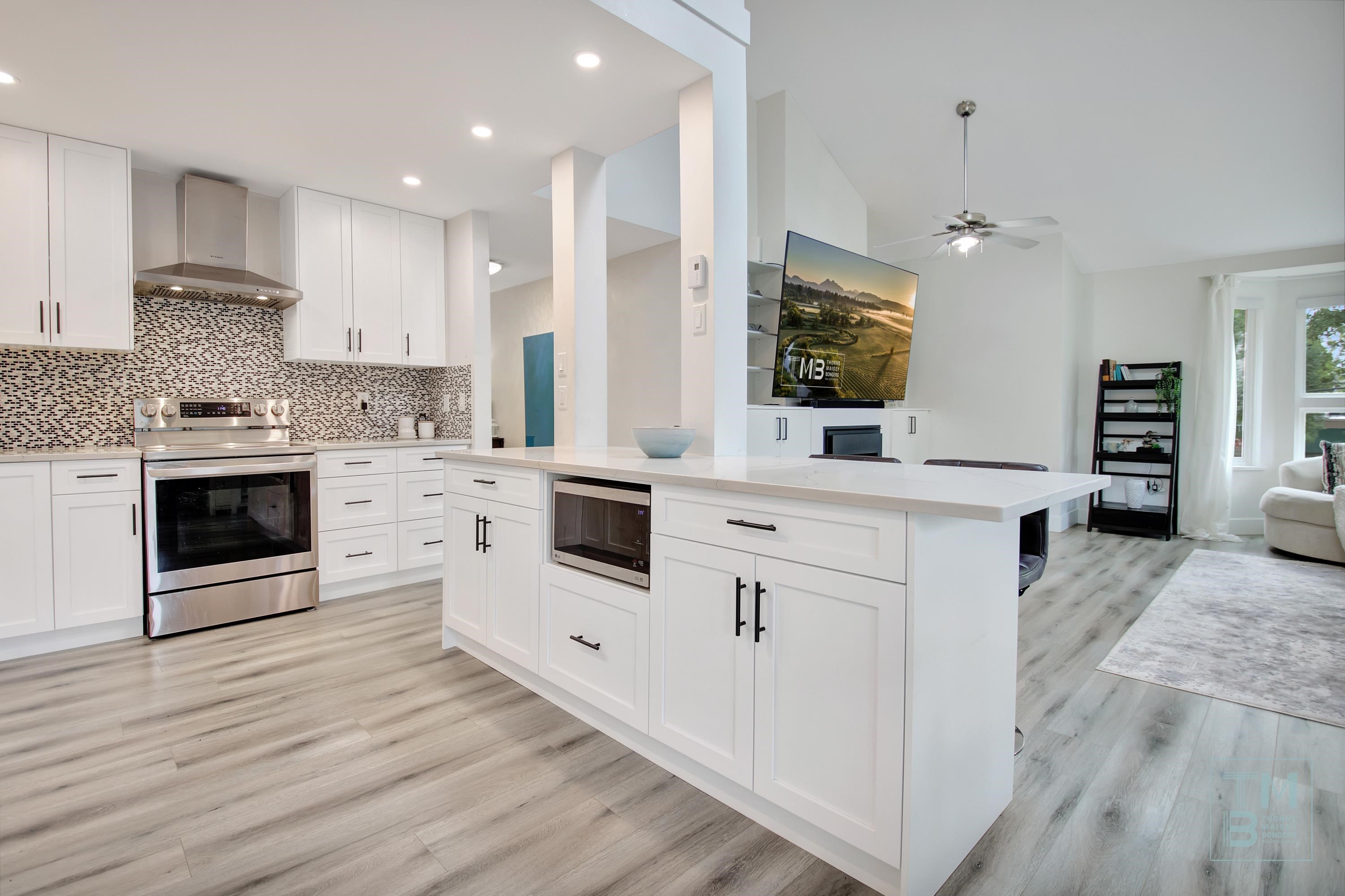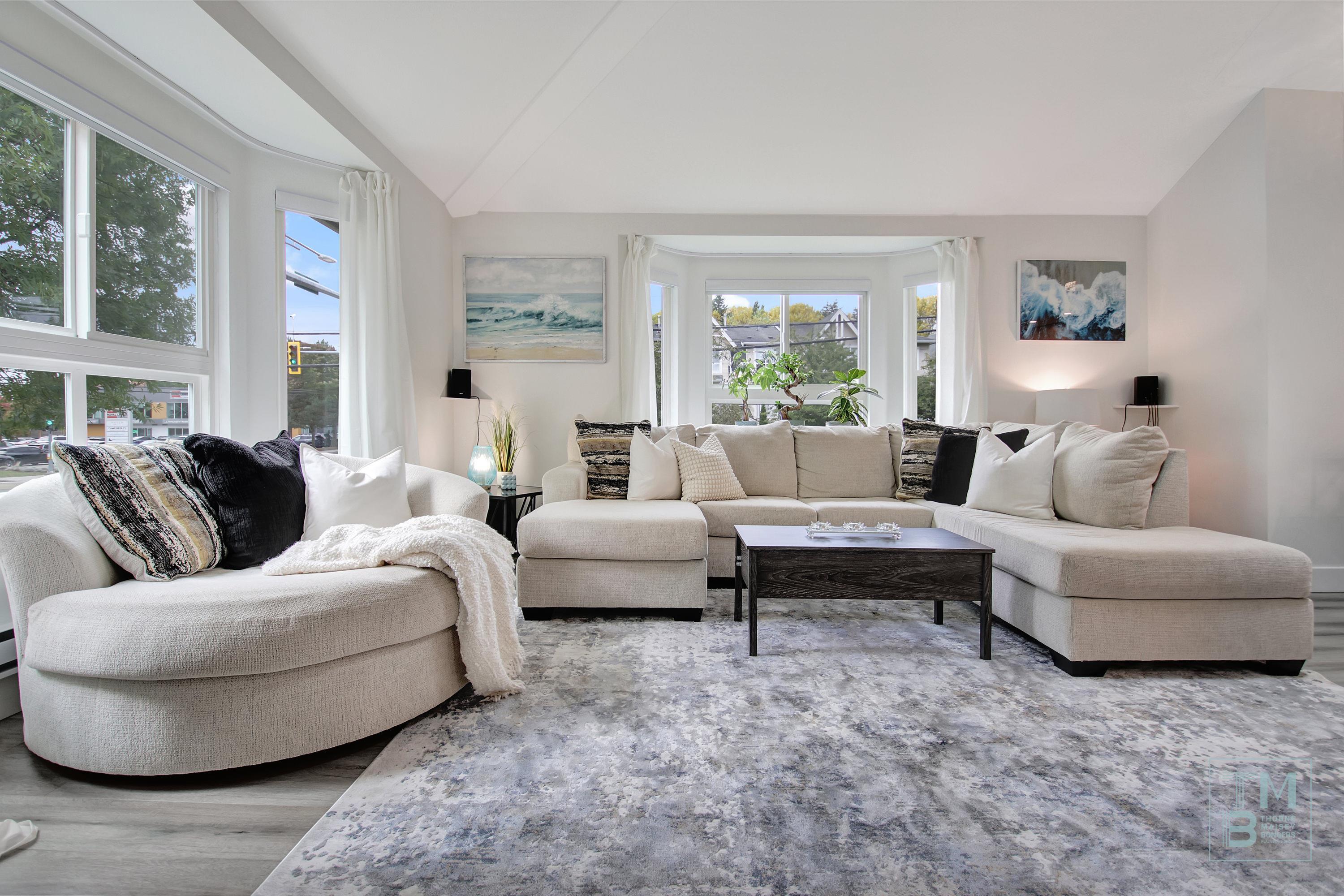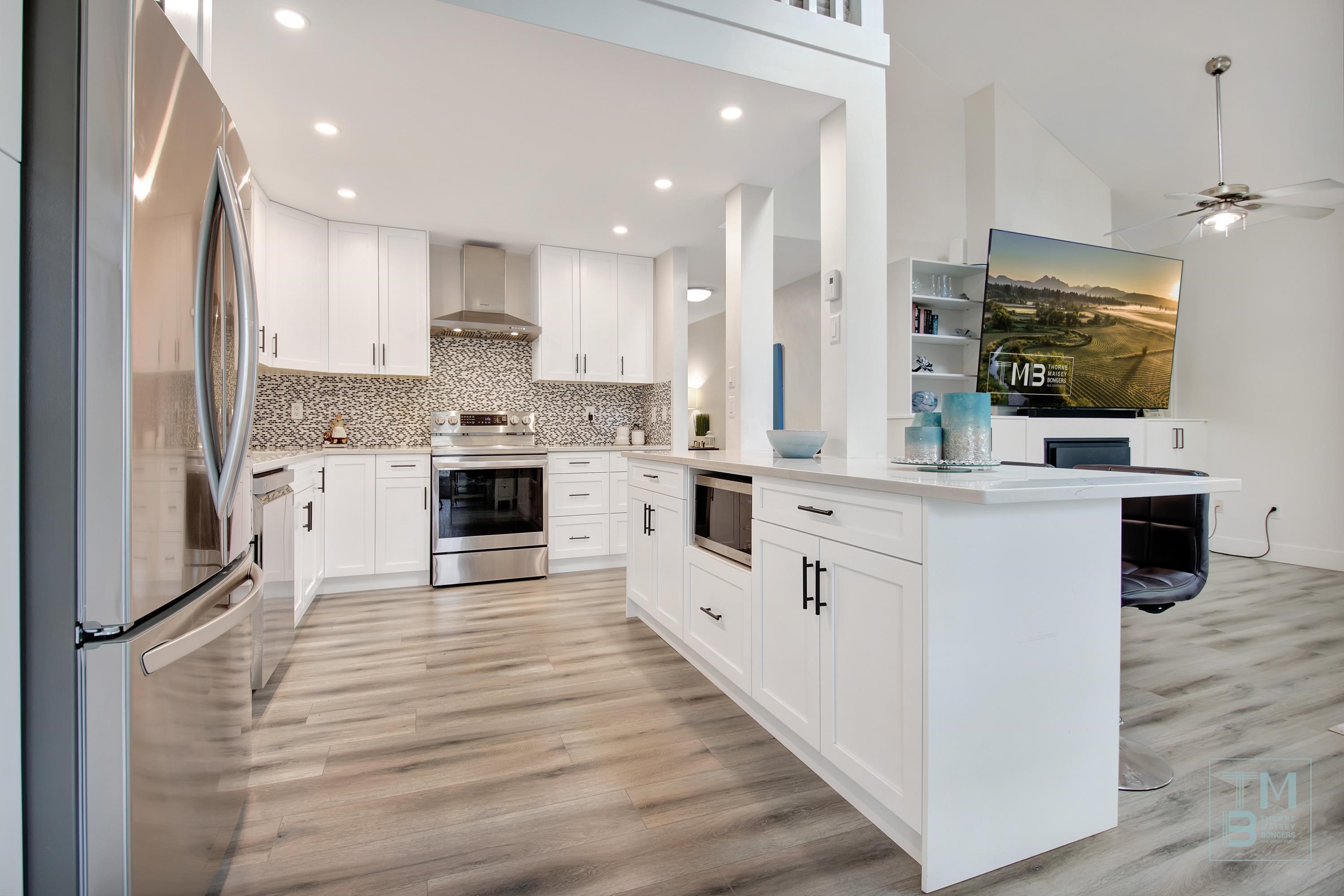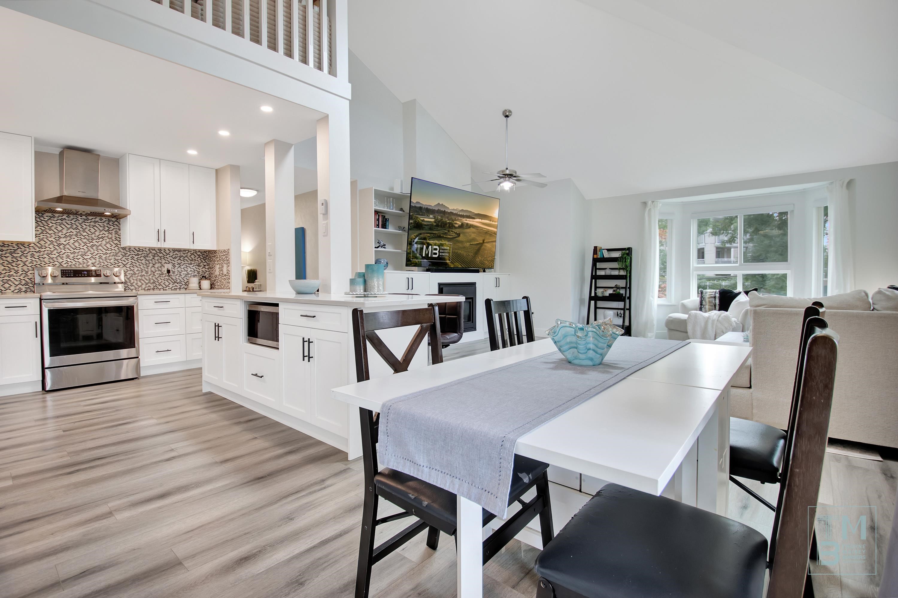 WESTSIDE ESTATES | A rare find—this stunning 2Storey TOP FLOOR CORNER UNIT is the largest in the building, offering 3BDRMS, 2BATHRMS, 2PARKING, 3DECKS + LOFT! South/West facing, filled w/ natural light, it features VAULTED ceilings & an OPEN CONCEPT layout that feels like a home w/out the upkeep. Beautifully updated throughout, enjoy a LRG bright kitchen w/ peninsula, quartz counters, SS appliances, dining & deck access perfect for BBQs. GRAND livingrm showcases 2 BAY windows, GAS fireplace & custom built-i...