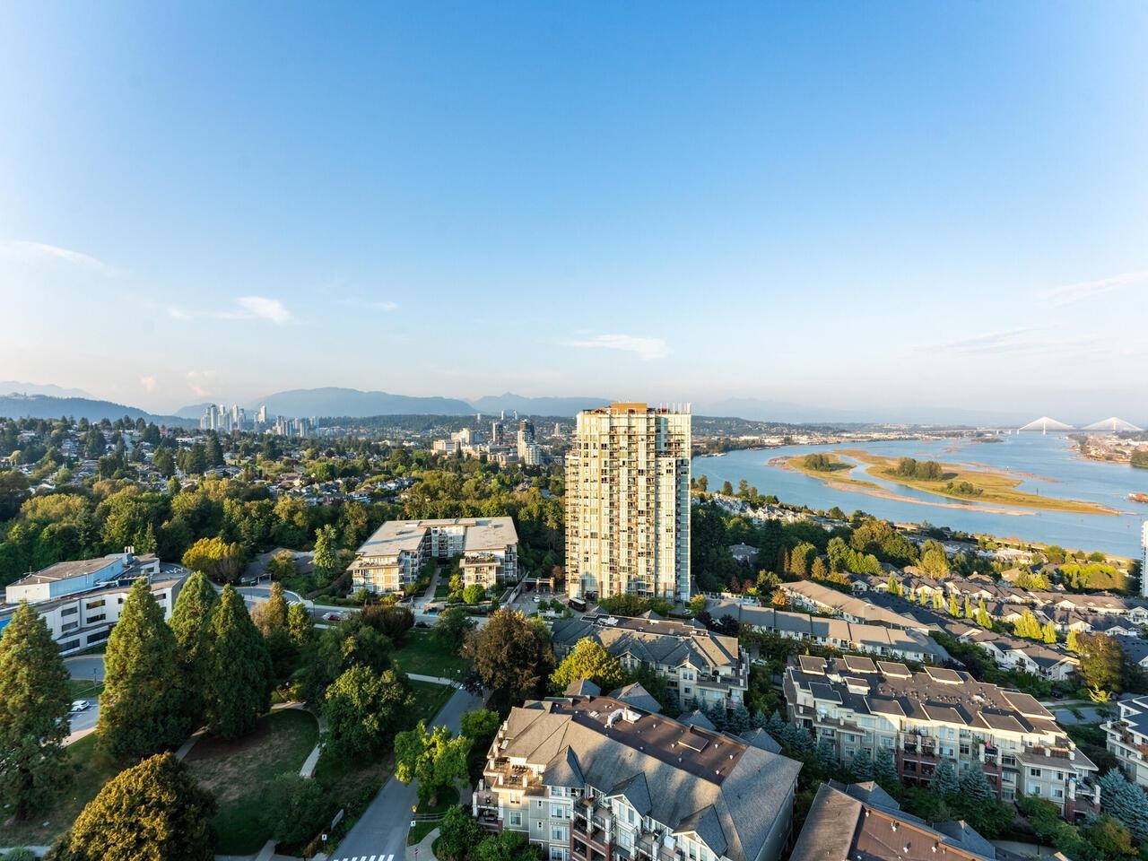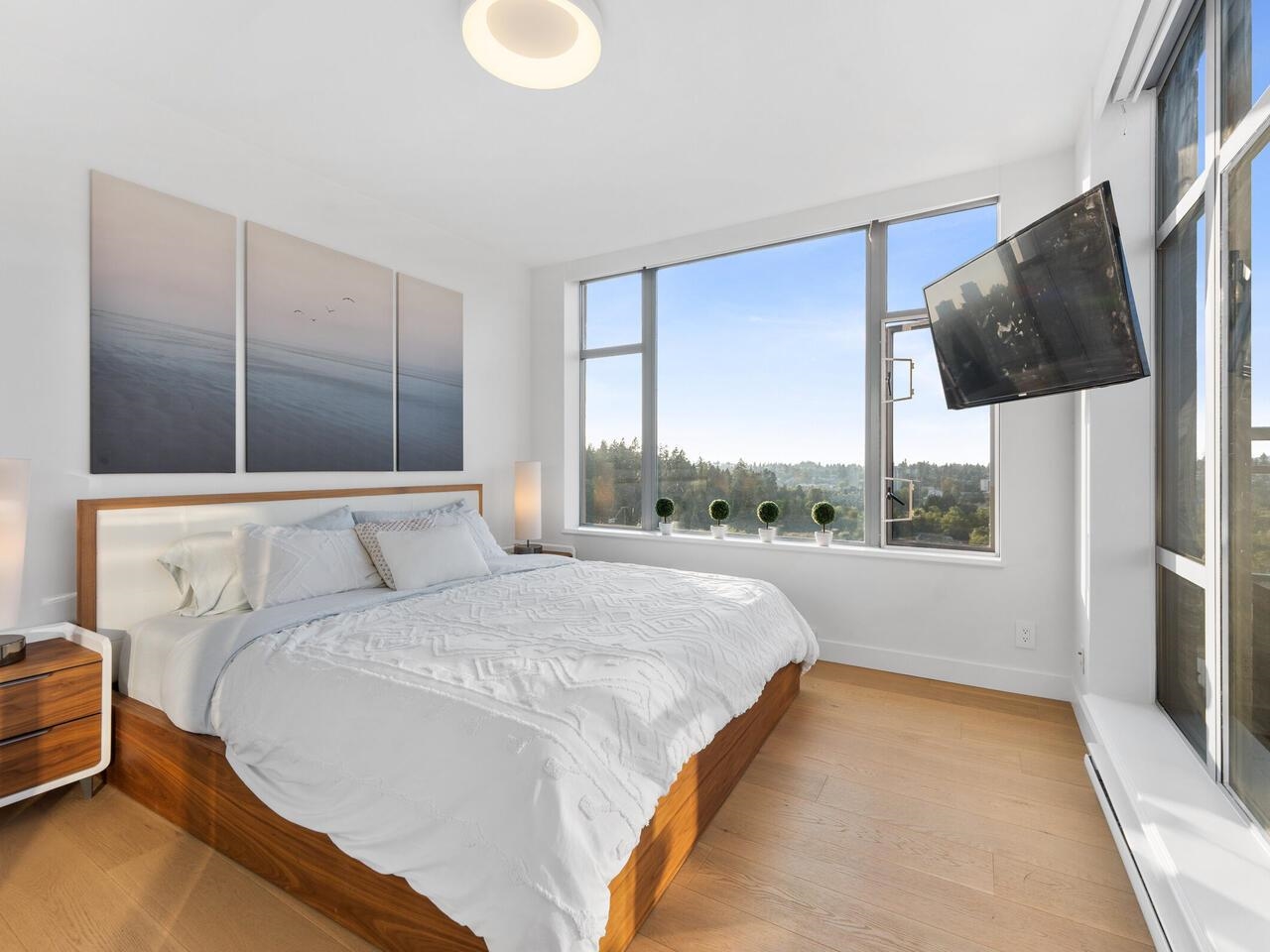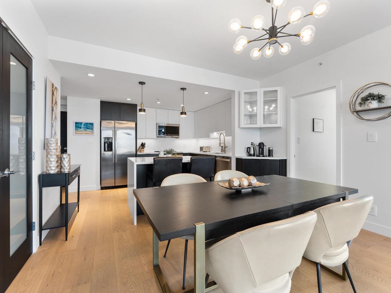 Enjoy Permanent Daylight Savings in a concrete sub-penthouse already optimized for every extra minute of sun. From your expansive balcony, take in an unencumbered panorama stretching from Mount Baker to Horseshoe Bay, with extensive green space below. Sunrise over the Fraser River gives way to glowing sunsets across the city skyline. A $250,000 renovation has transformed this residence into a calm, modern retreat, featuring marble-clad bathrooms with heated floors and a jetted soaker tub, a built-in firepla...