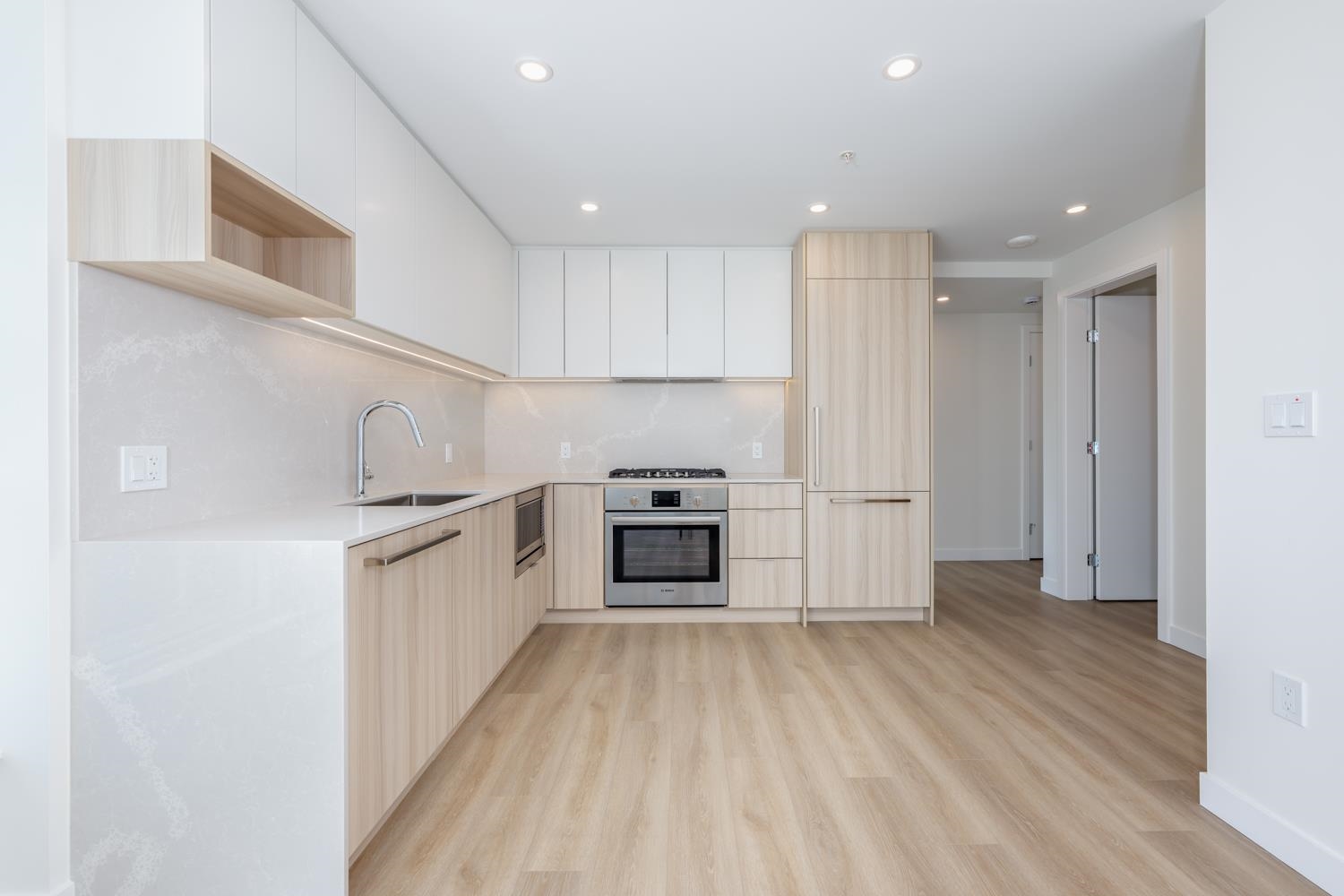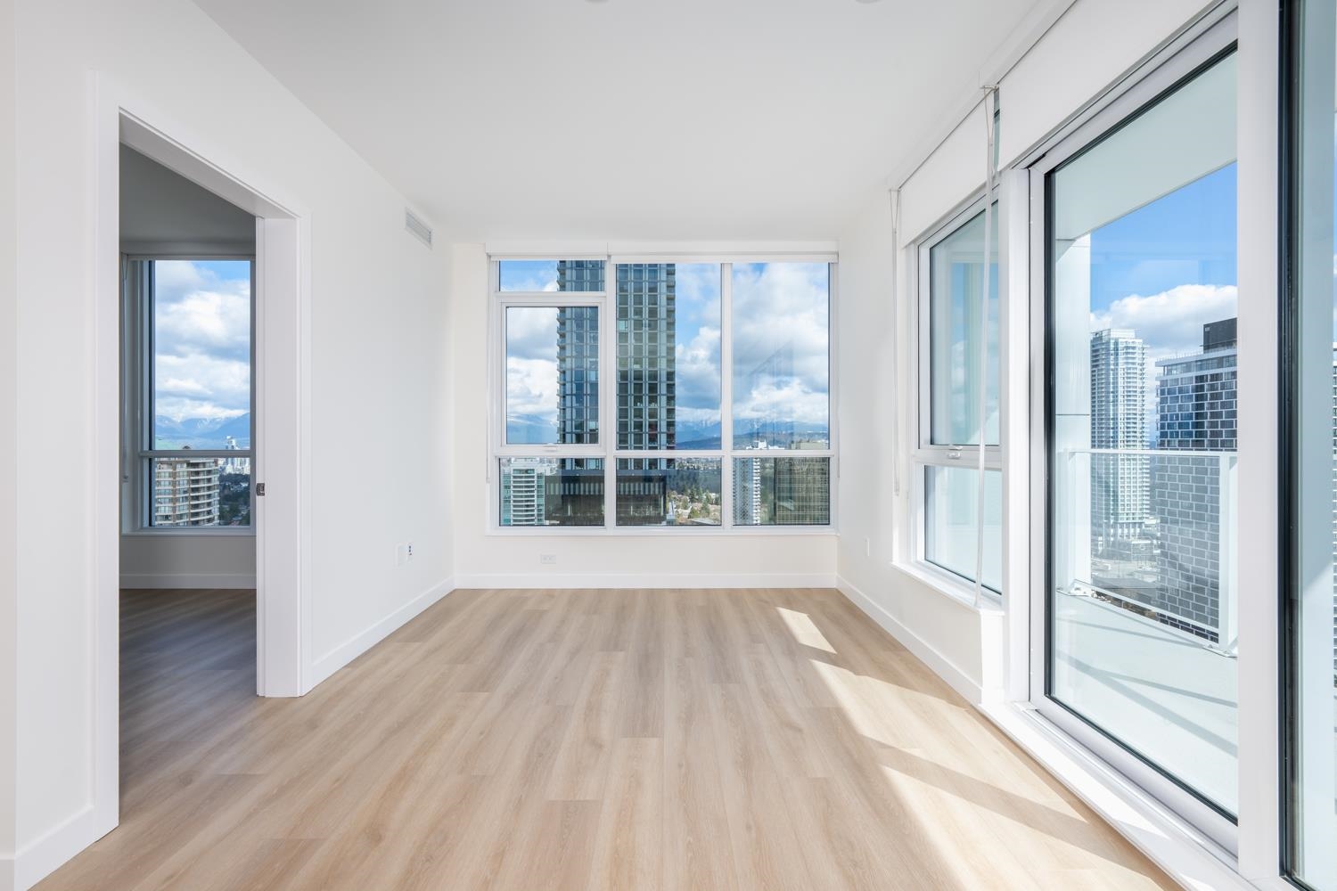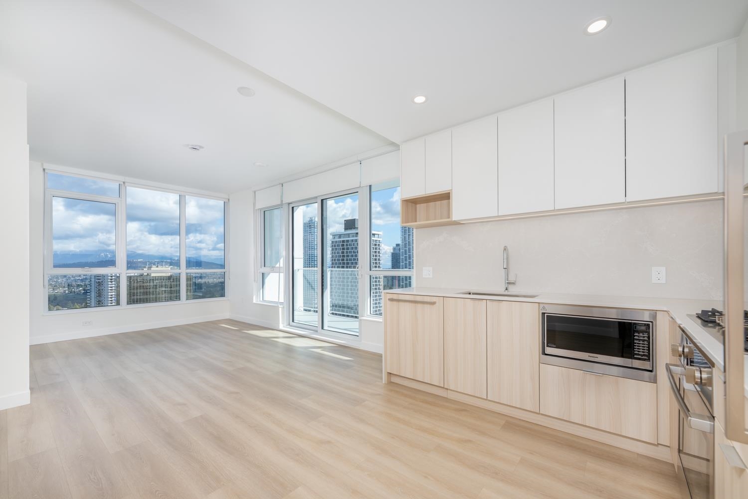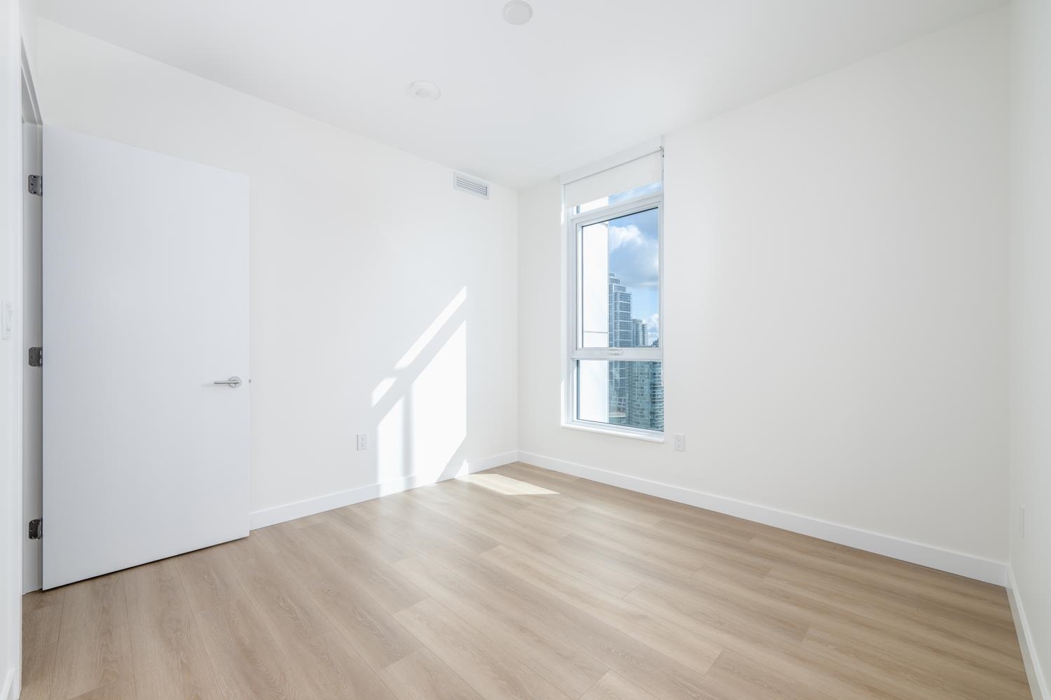Welcome to Nuvo by Anthem. This Brand-New home features a functional floor plan with 2 full bath and 2 bedrooms on each side PLUS a DEN. NE corner unit Located steps from Central Park and Patterson SkyTrain Station. Offers spacious 9' high ceilings; Wide-plank laminate wood flooring throughout; Comfortable air quality and temperature control with energy-efficient heating and cooling; Roller shade blinds on all exterior windows; 2 tone kitchen cabinet w Bosch appliances, gas cooktop, wall oven, and sleek cab...