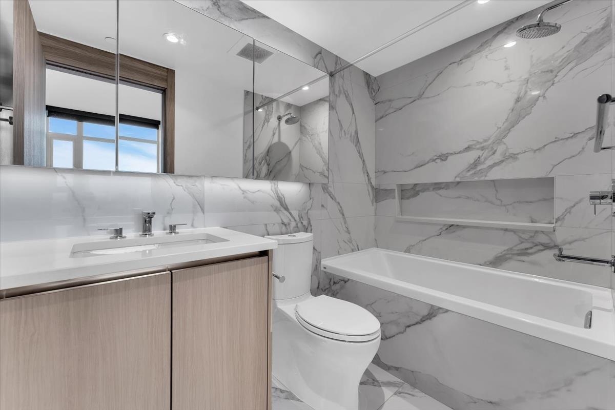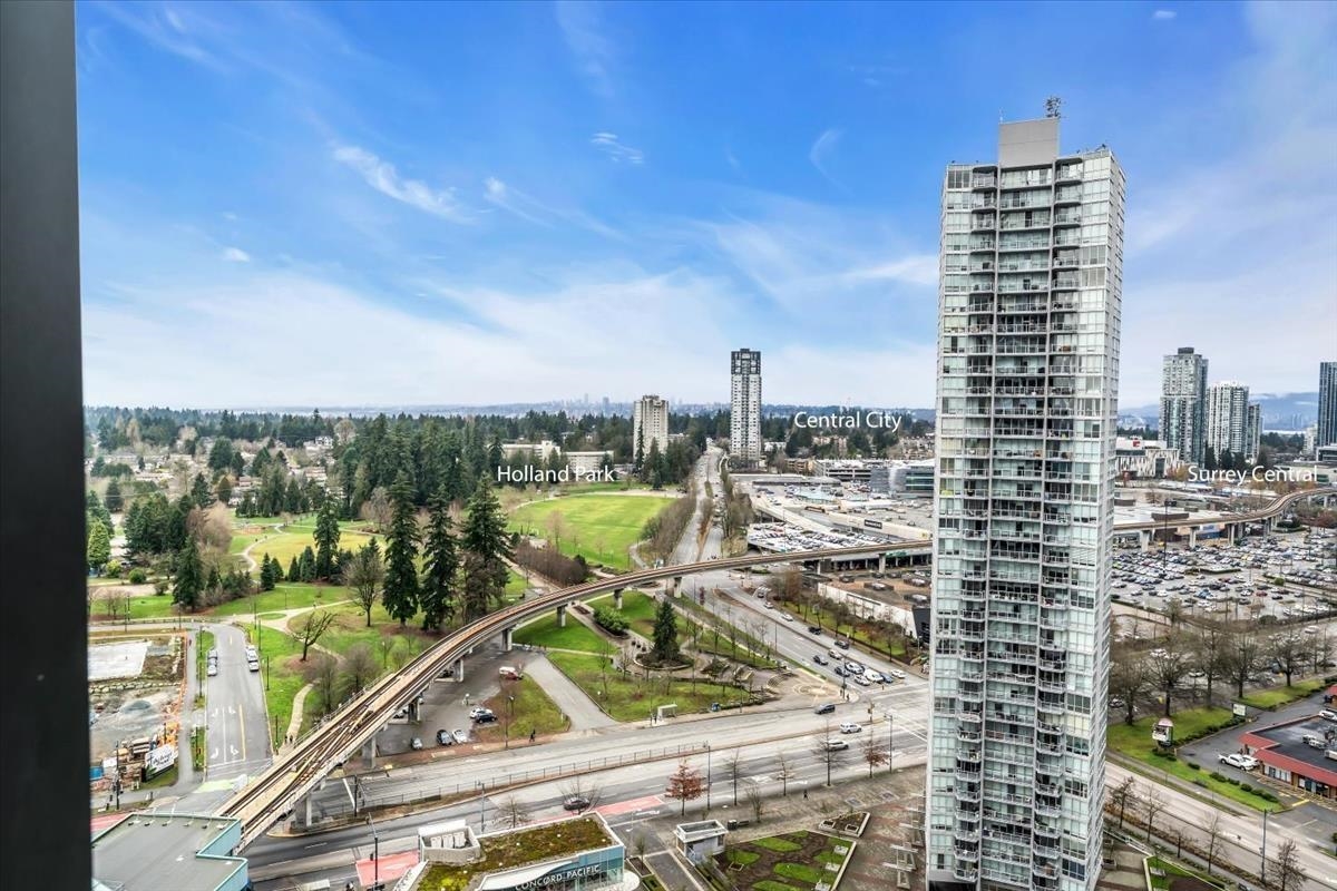 Experience elevated city living at Park Boulevard by Concord Pacific in the heart of Surrey Central. This bright corner home offers stylish comfort with soaring ceilings, central A/C, & an open layout designed for both relaxing & entertaining. The modern kitchen is a standout, featuring quartz countertops, custom cabinetry, Bosch built-in appliances, & gas cooktop . Perched high above the city, unwind with breathtaking northwest views of glowing sunsets, mountains, & sparkling city lights-your own daily esc...