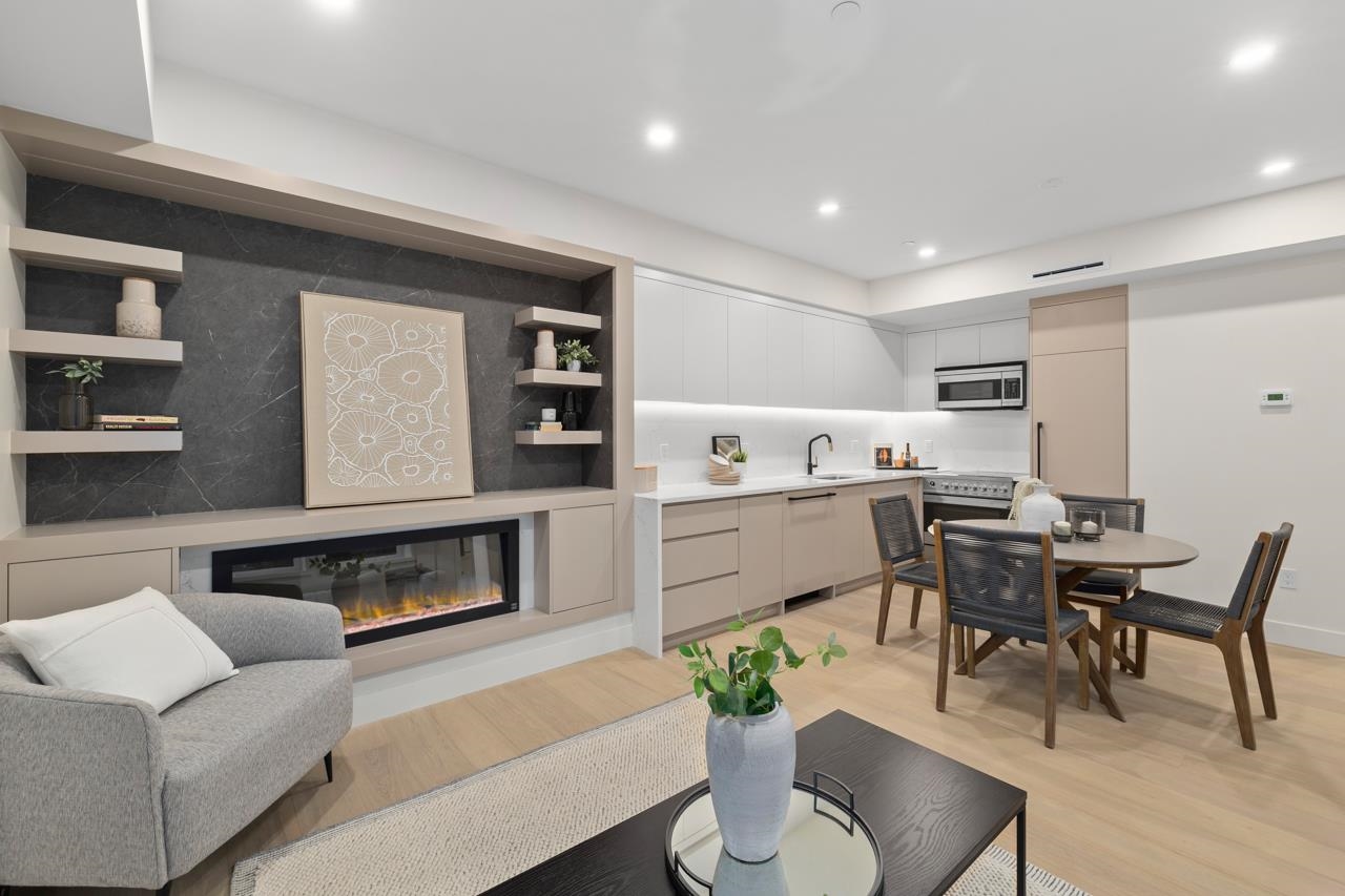 Welcome to 5West built by Asanti homes, a collection of 1, 3 , 3 + Den and 4 bedroom homes offering functionality, and style in every detail! This 1 bed, 1 bath residence spans 1 thoughtfully designed level. Boasting a spacious living room with fireplace and french doors leading to the large covered patio, dining area and gourmet kitchen, featuring custom BCG cabinetry and integrated Fisher Paykel appliances. Enjoy the spacious patio and storage locker for the bikes. Open House Jan 10th/11th 2-4pm