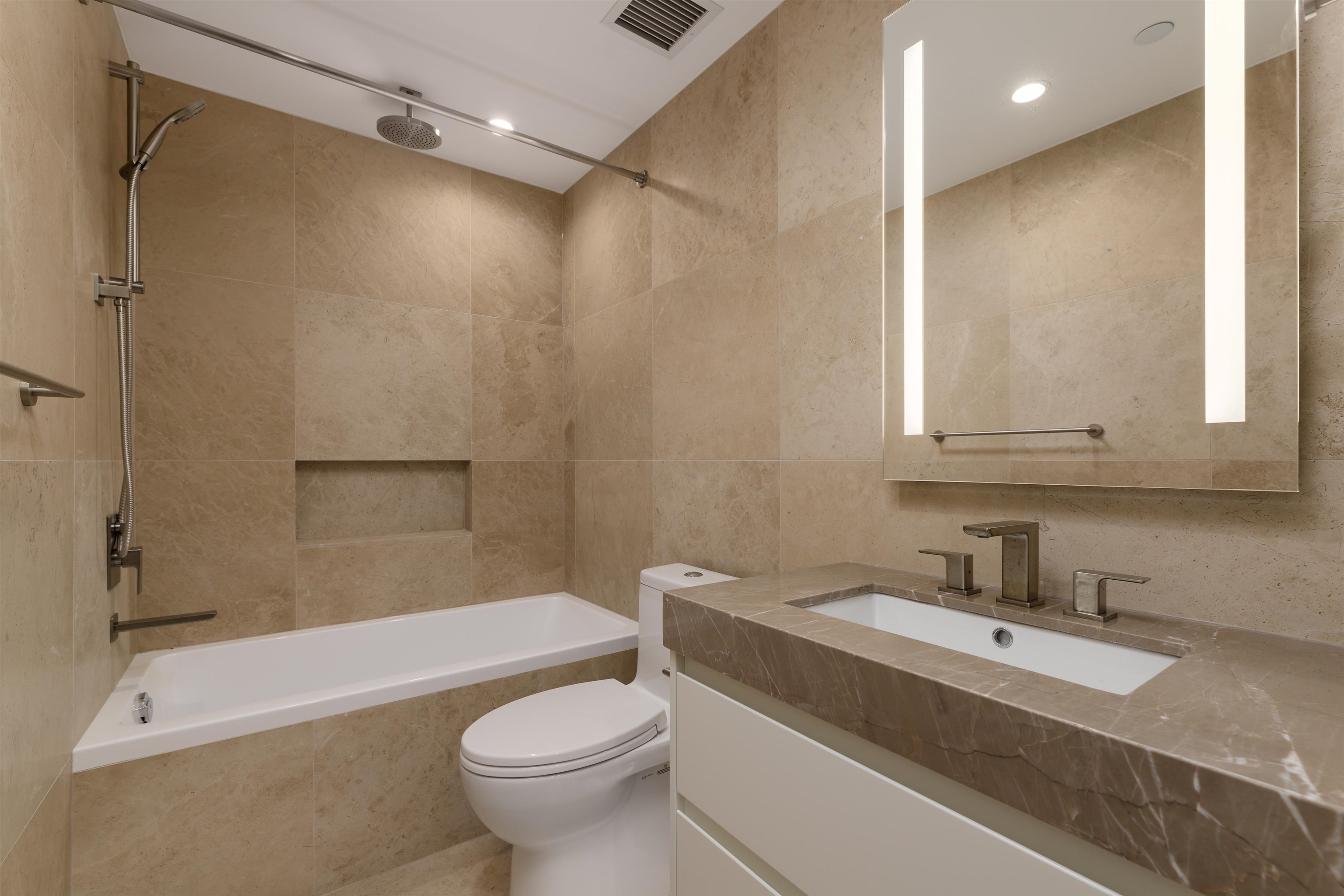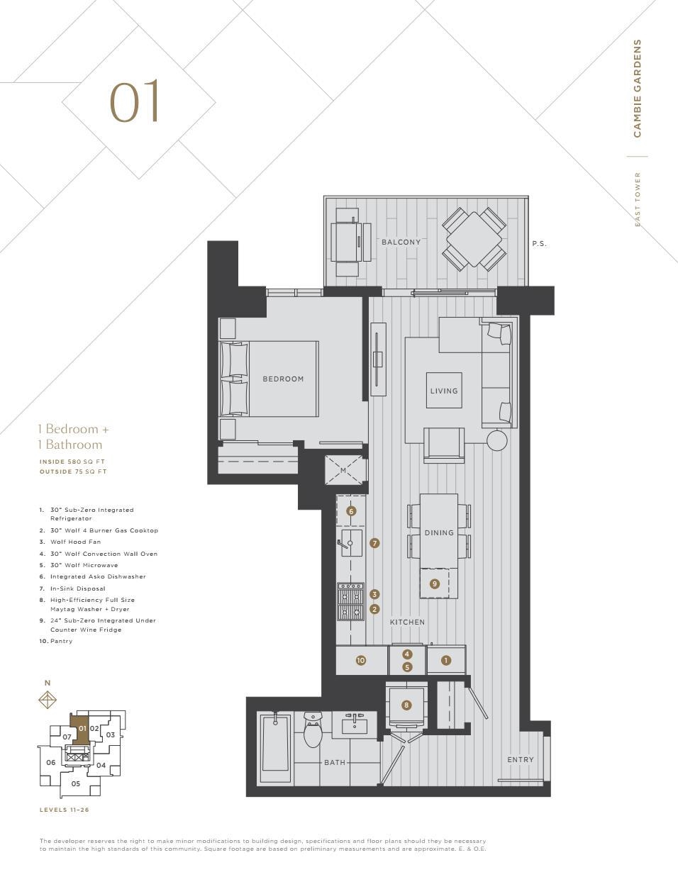 This 580 SF spacious one-bedroom home is located at Cambie Gardens, Onni Group's masterplanned community on Vancouver's westside. Lavishly finished w/ engineered HW flooring, heating & cooling system, automated lighting & sleek roller shades. A gourmet kitchen includes natural stone countertops and a 30" Sub Zero + Wolf appliance package w/ integrated refrigerator and undercounter wine fridge. A spa-inspired bathroom boasts marble countertops, Nuheat flooring & oversized mirror w/ LED lighting. Parking incl...